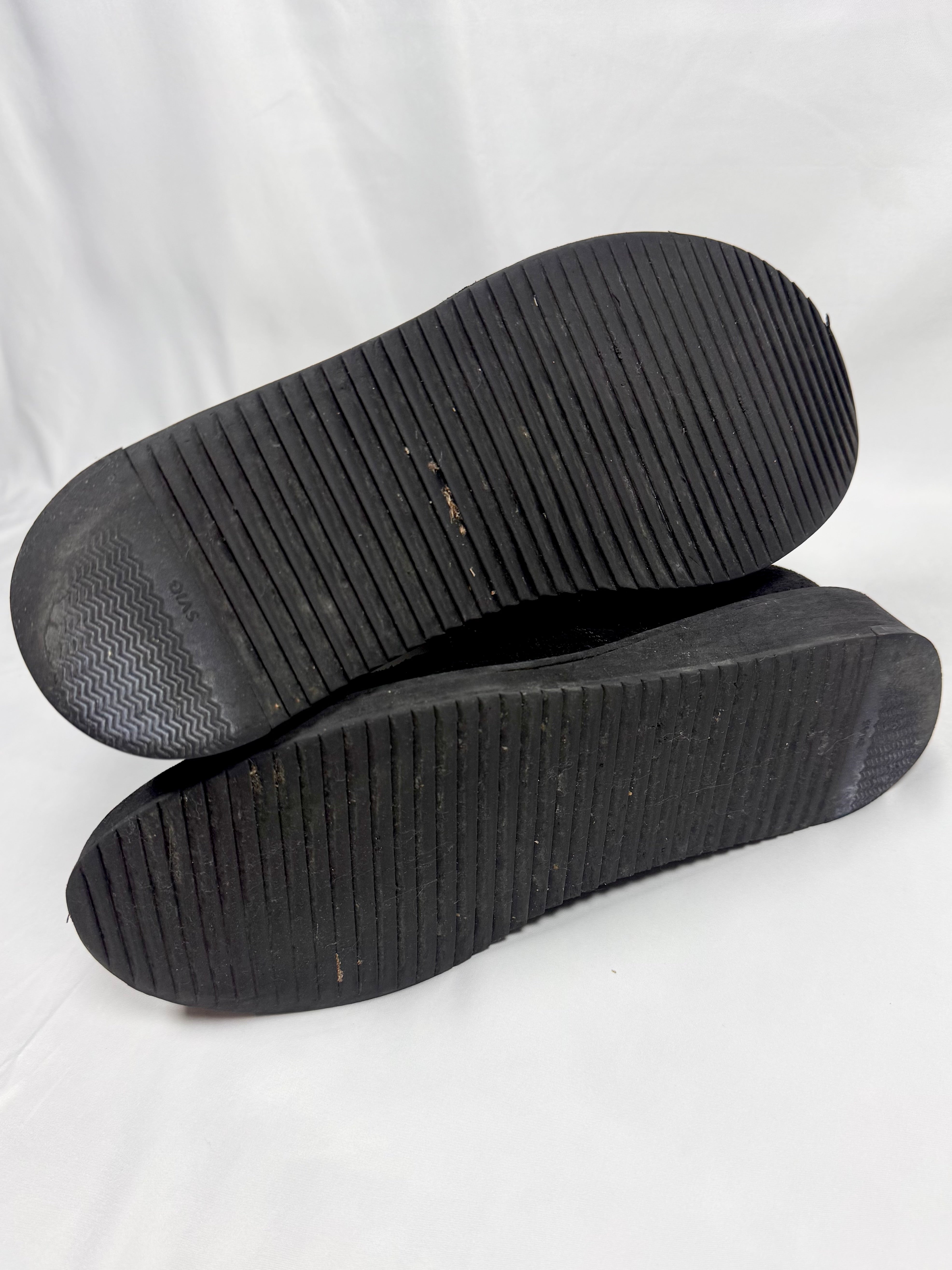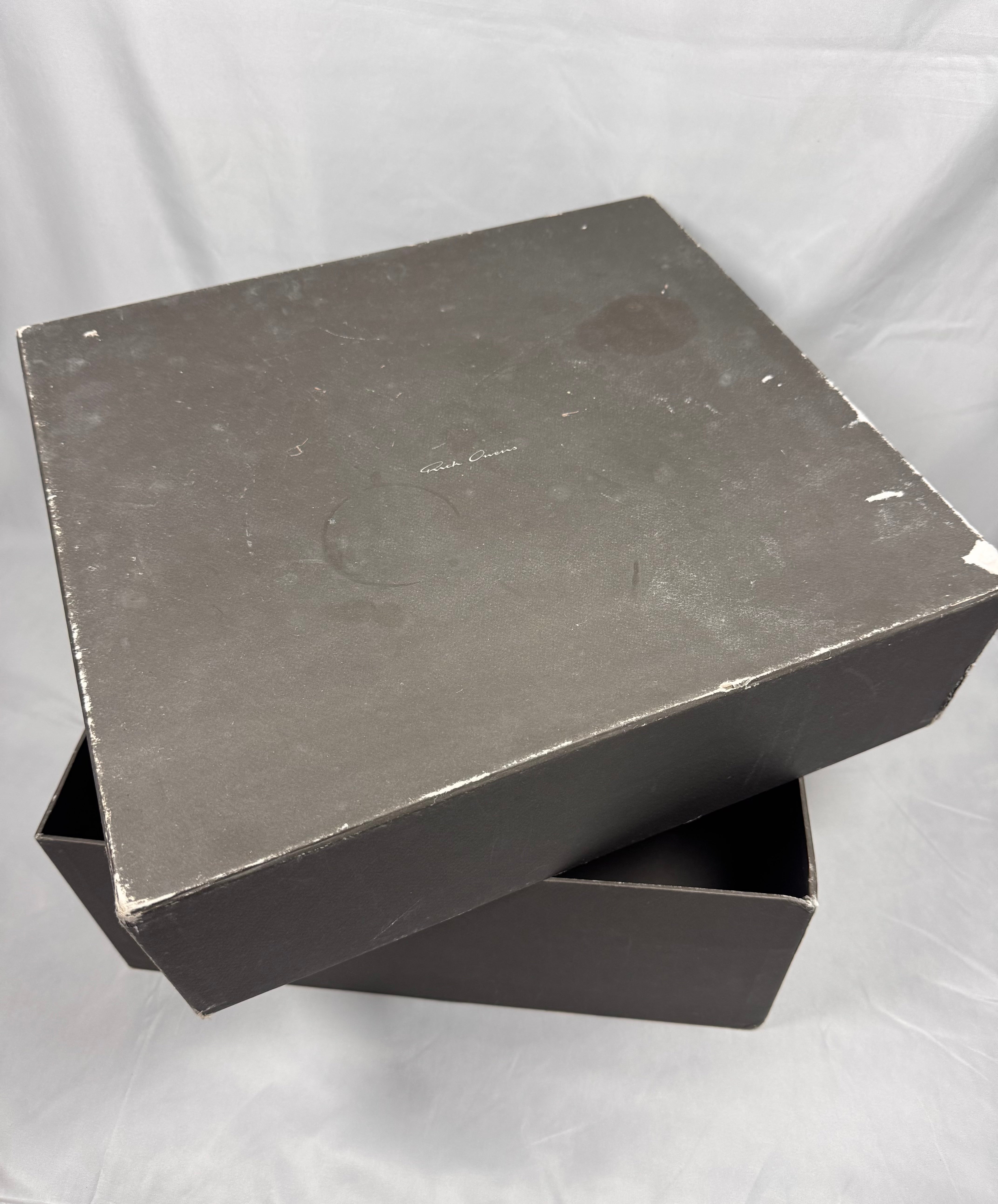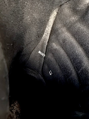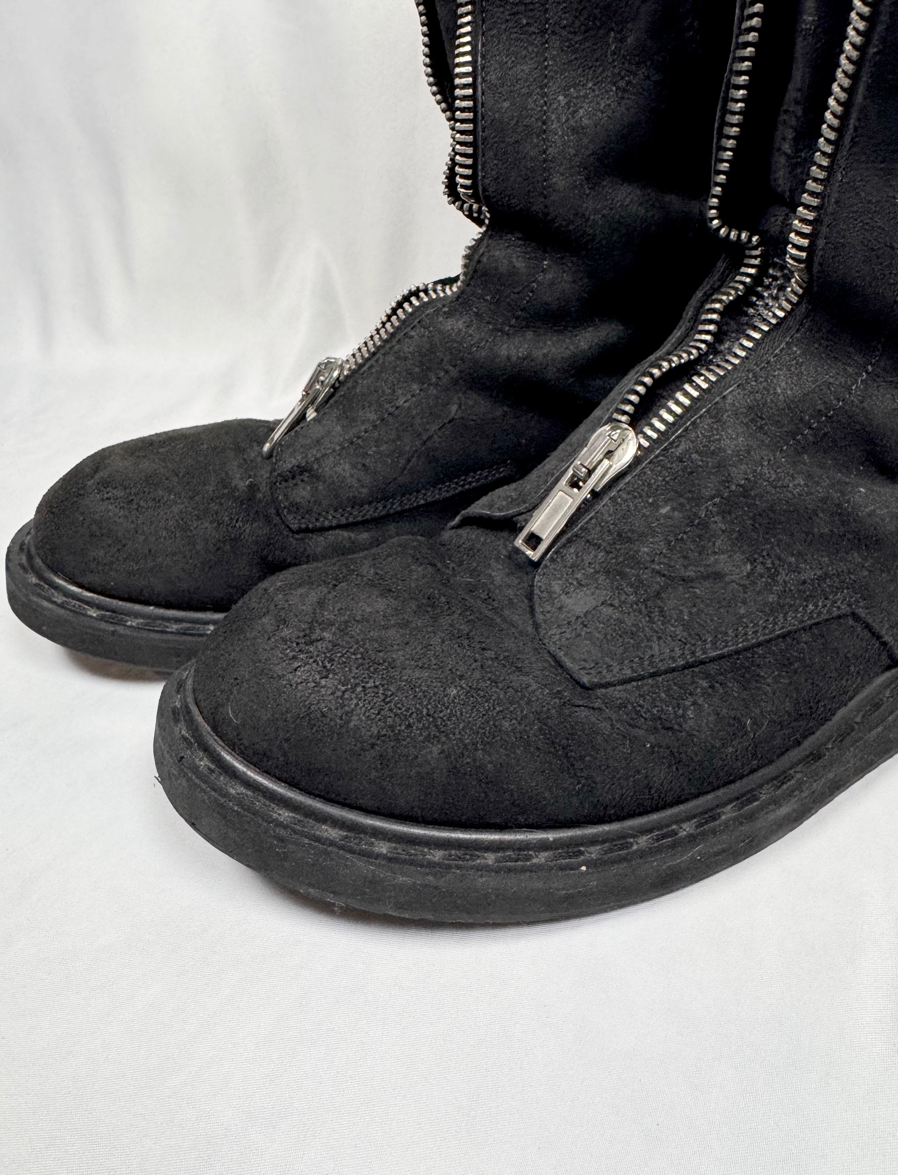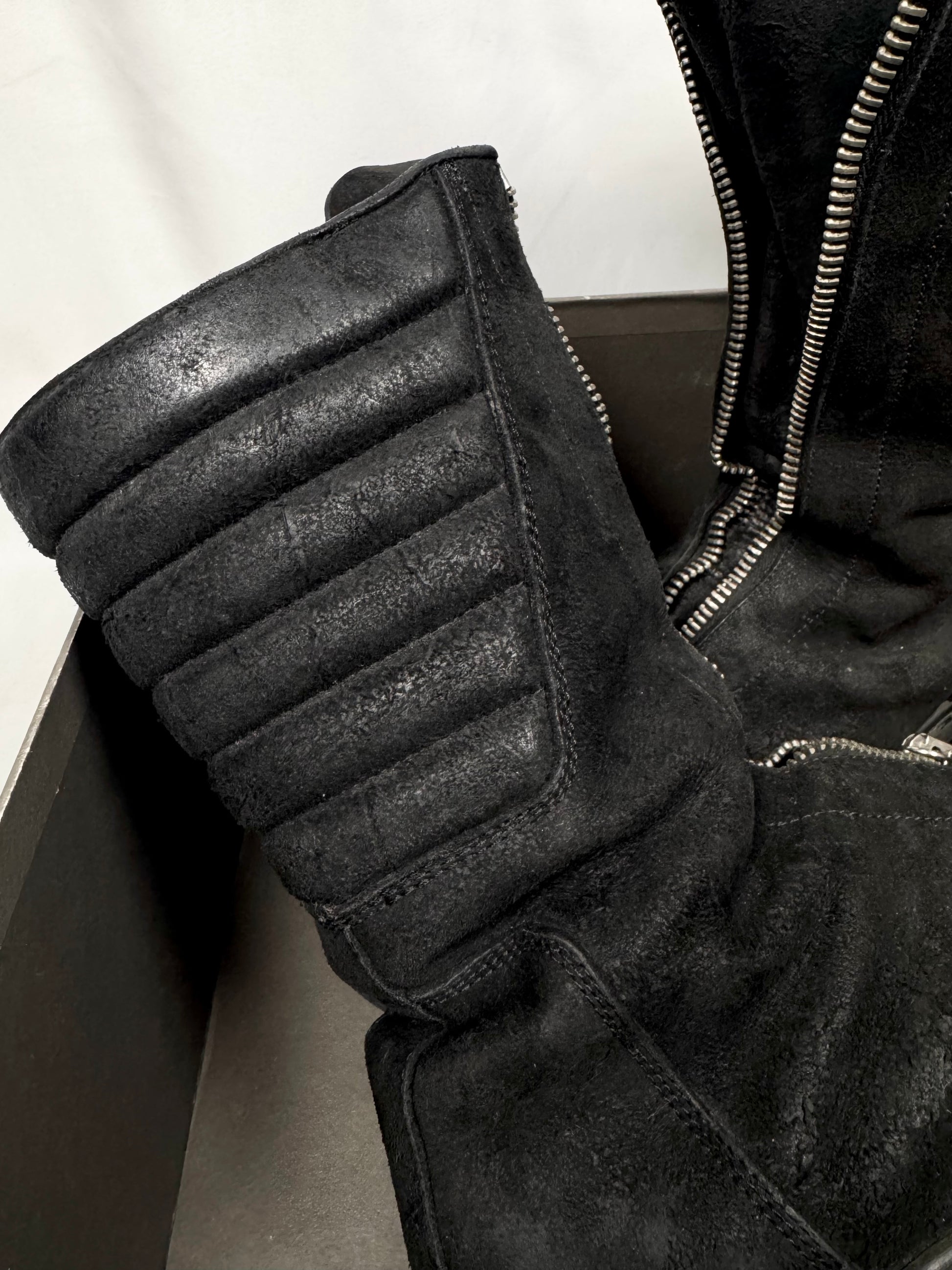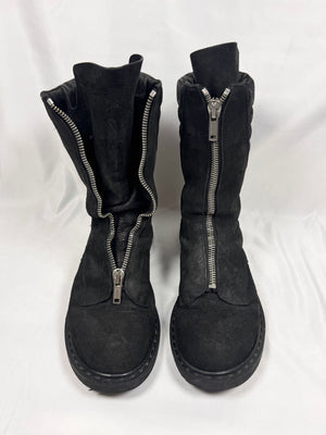 From Rick Owens’ Autumn/Winter 2011 “LIMO” collection defined by severe proportions and dystopian elegance. These stunning ‘Mohawk’ Creeper boots embody this vision, fusing punk-era creeper foundations with militaristic combat boot construction. This pair is crafted in blistered leather with a high-gloss, almost lacquered finish. Featuring a front zip closure, exaggerated leather tongues designed to be worn splayed or zipped, quilted interior padding, and a heavy stacked sole. Comes with the original box from purchase. In exceptional condition with no major flaws or damages ( heel portion of the sole professionally re-soled)