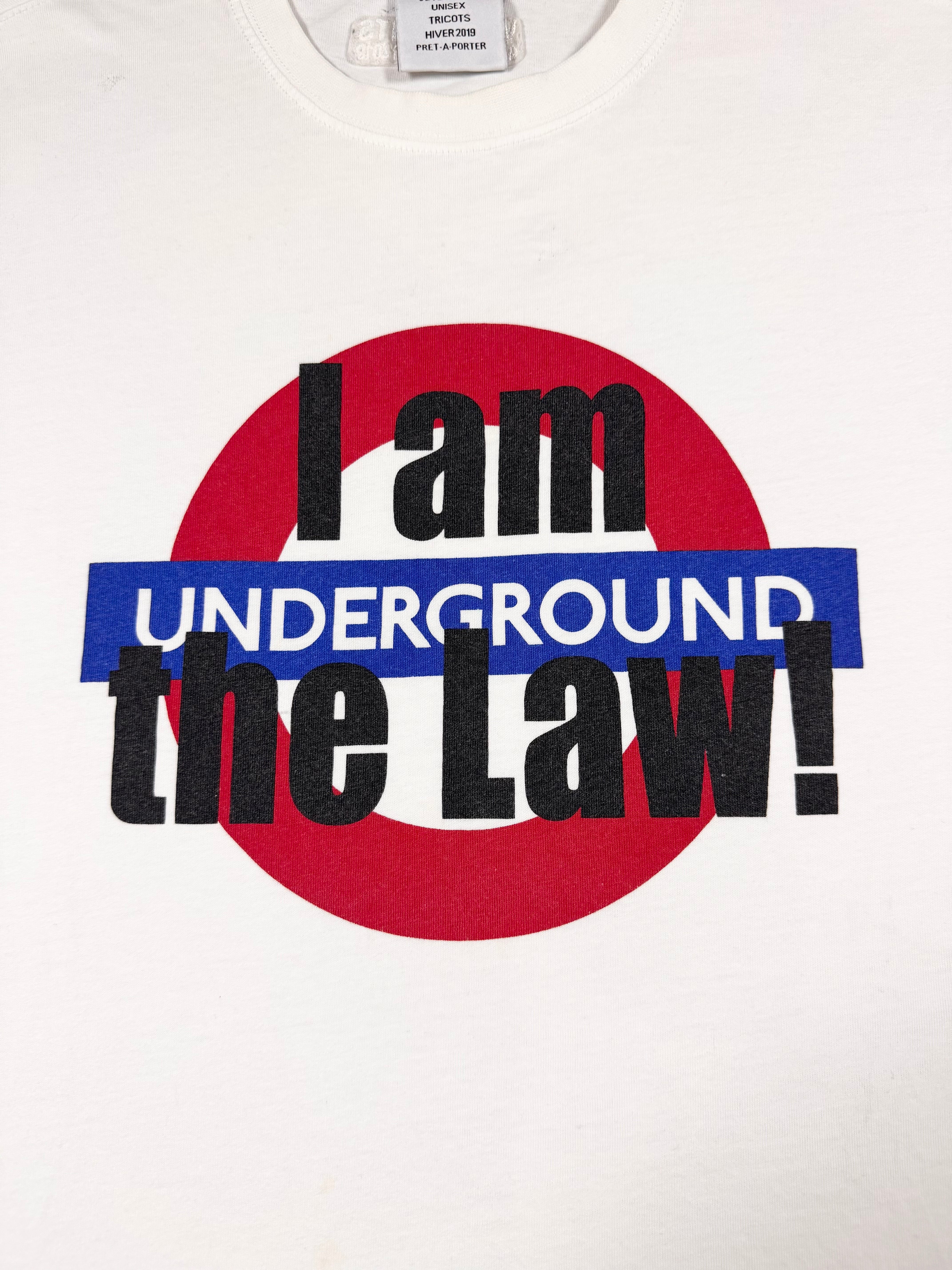 This t shirt is from the Autumn/Winter 2019 collection. Inspired by the design of the London underground roundel, the front graphic features the phrase “I Am The Law!” over the tube logo. In solid condition with some wear, no major flaws