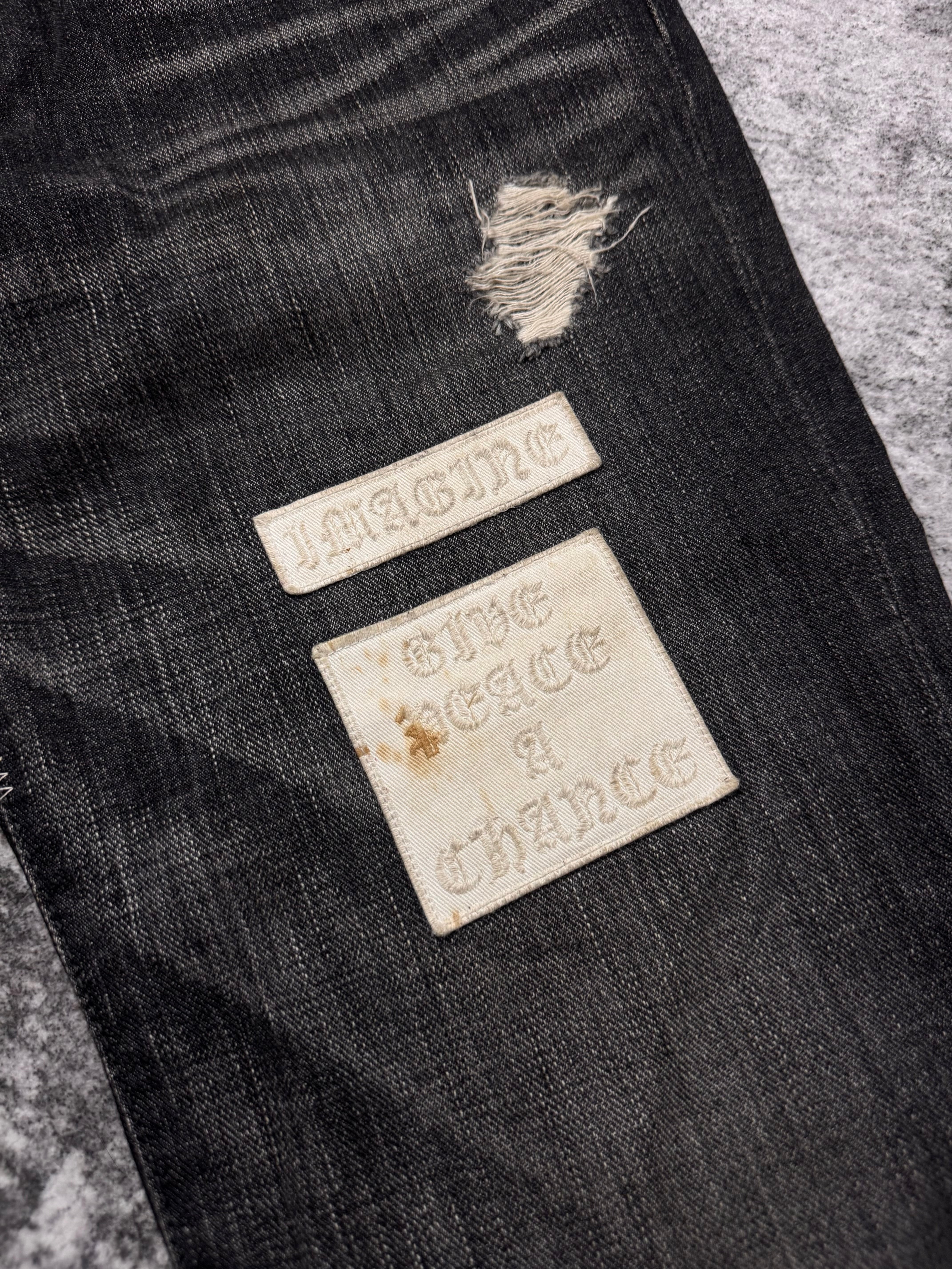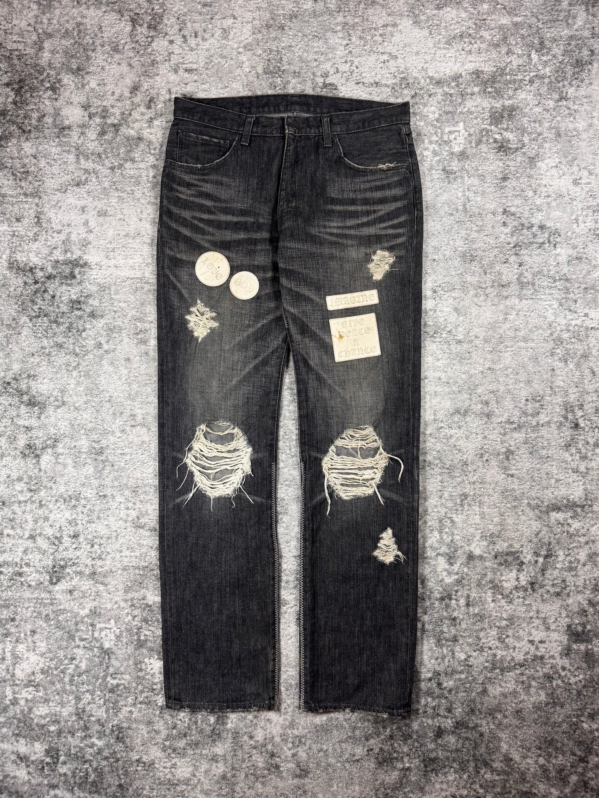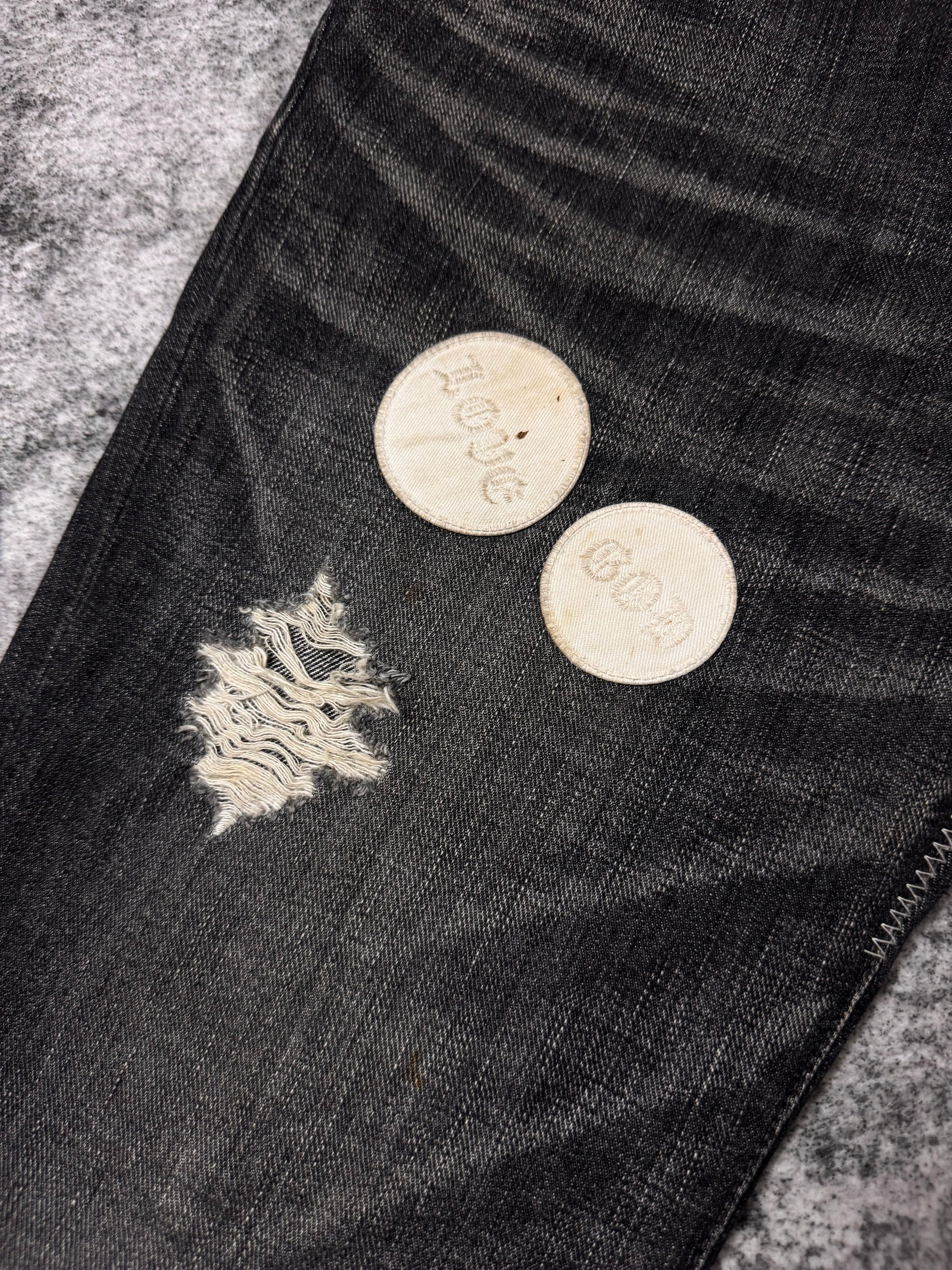From the Autumn/Winter 2004 "Give Peace A Chance", this iconic pair of 'pain' denim features different patchwork throughout, featuring phrases that reflect the season's theme, where Miyashita centered the collection around an ‘Anti-War' message.These patchwork jeans were released in different variations; this particular pair having blowouts on the knee and thigh area, coming in a faded black wash. Features the iconic crying heart leather patch on the rear. In gold condition with some minor stains on the front patches (can be removed) no orher flaws or damages