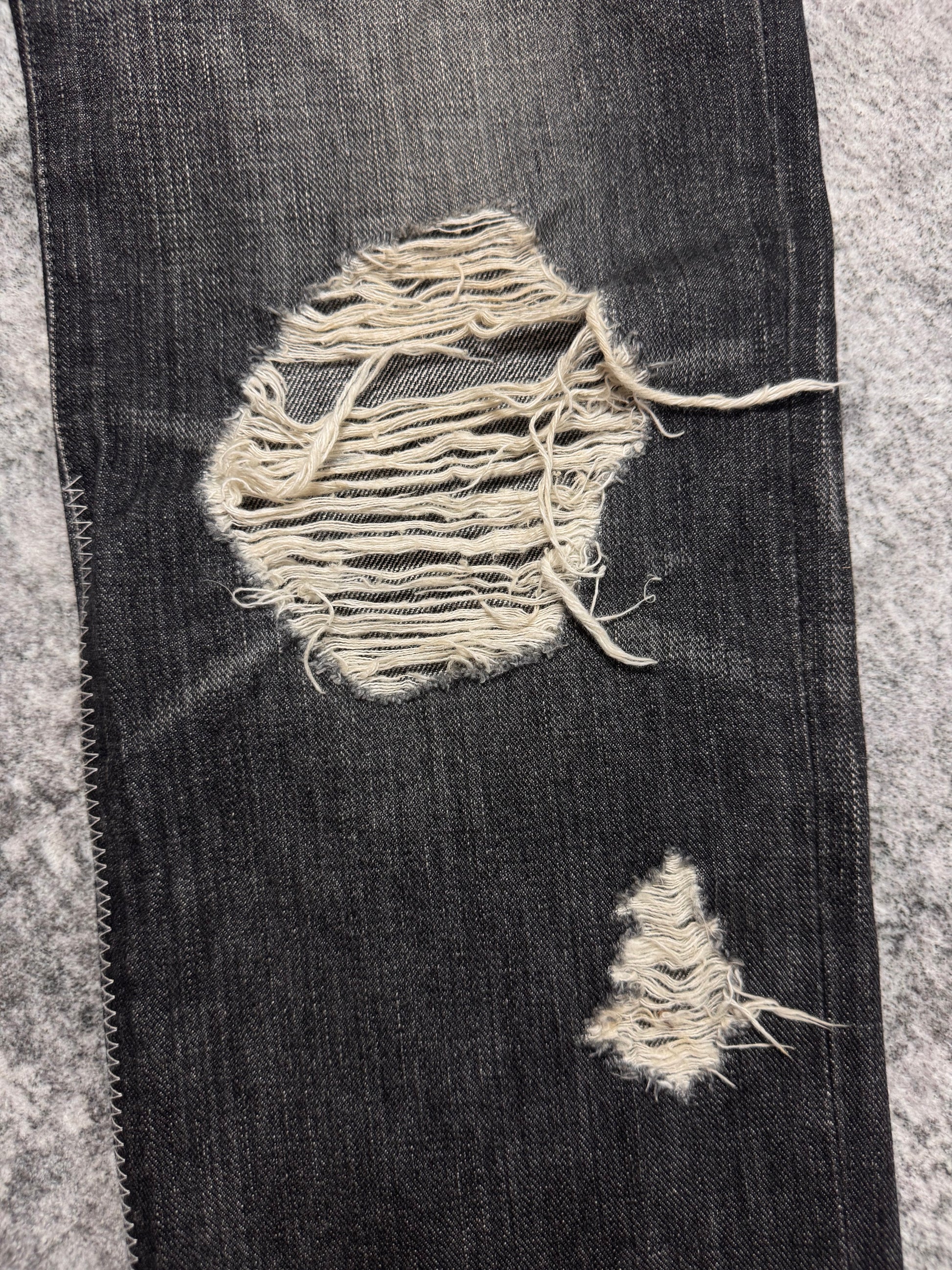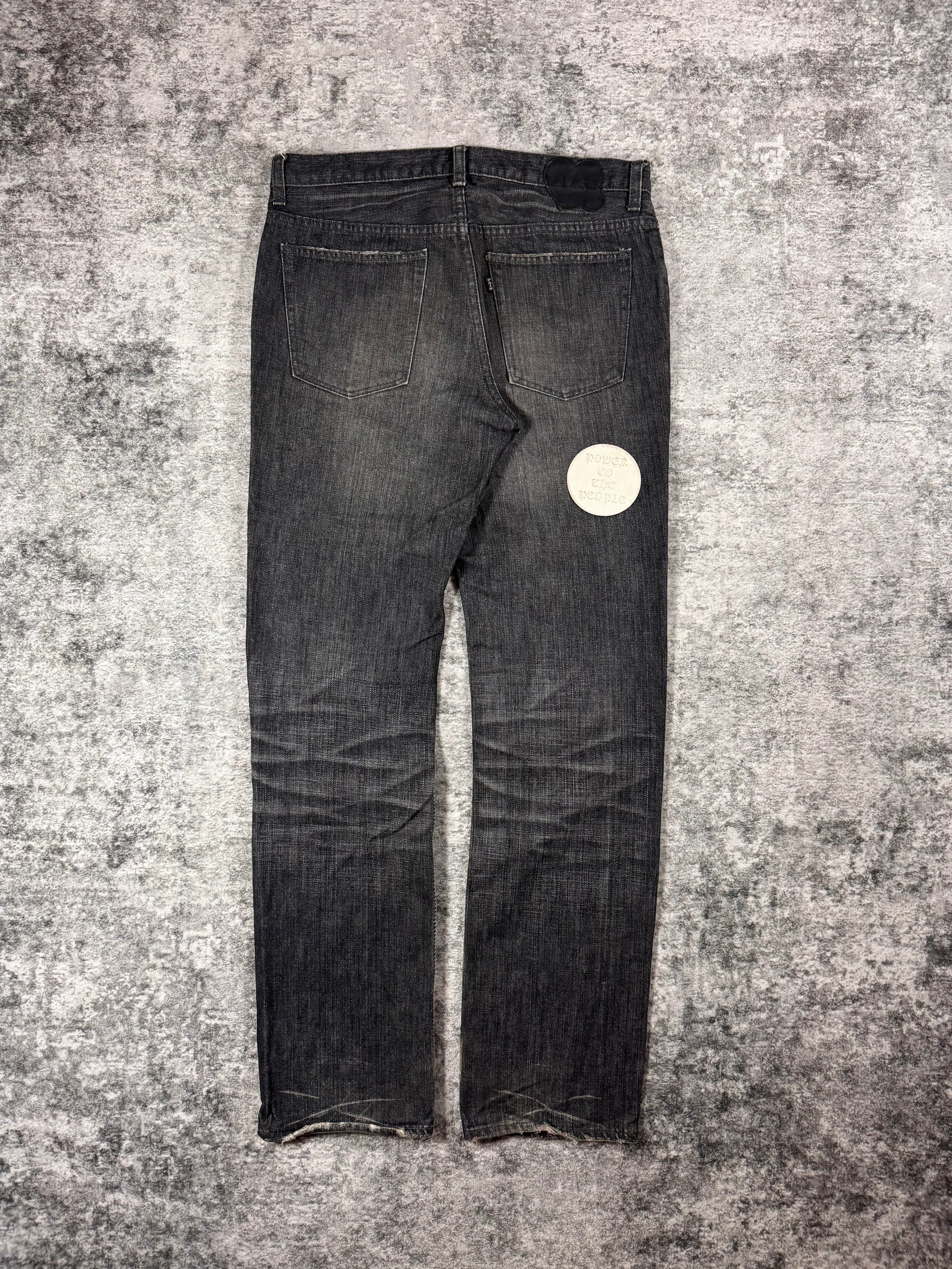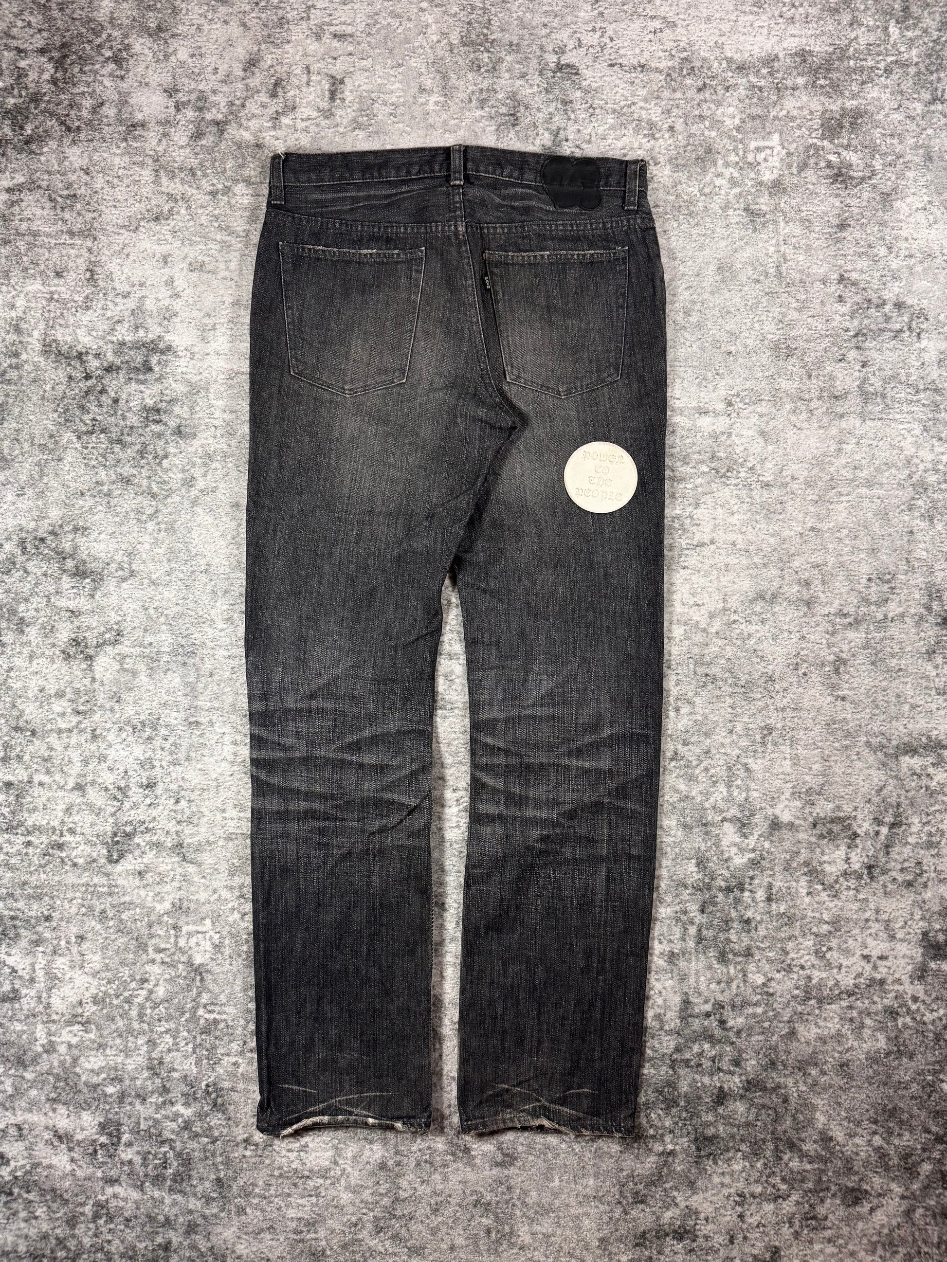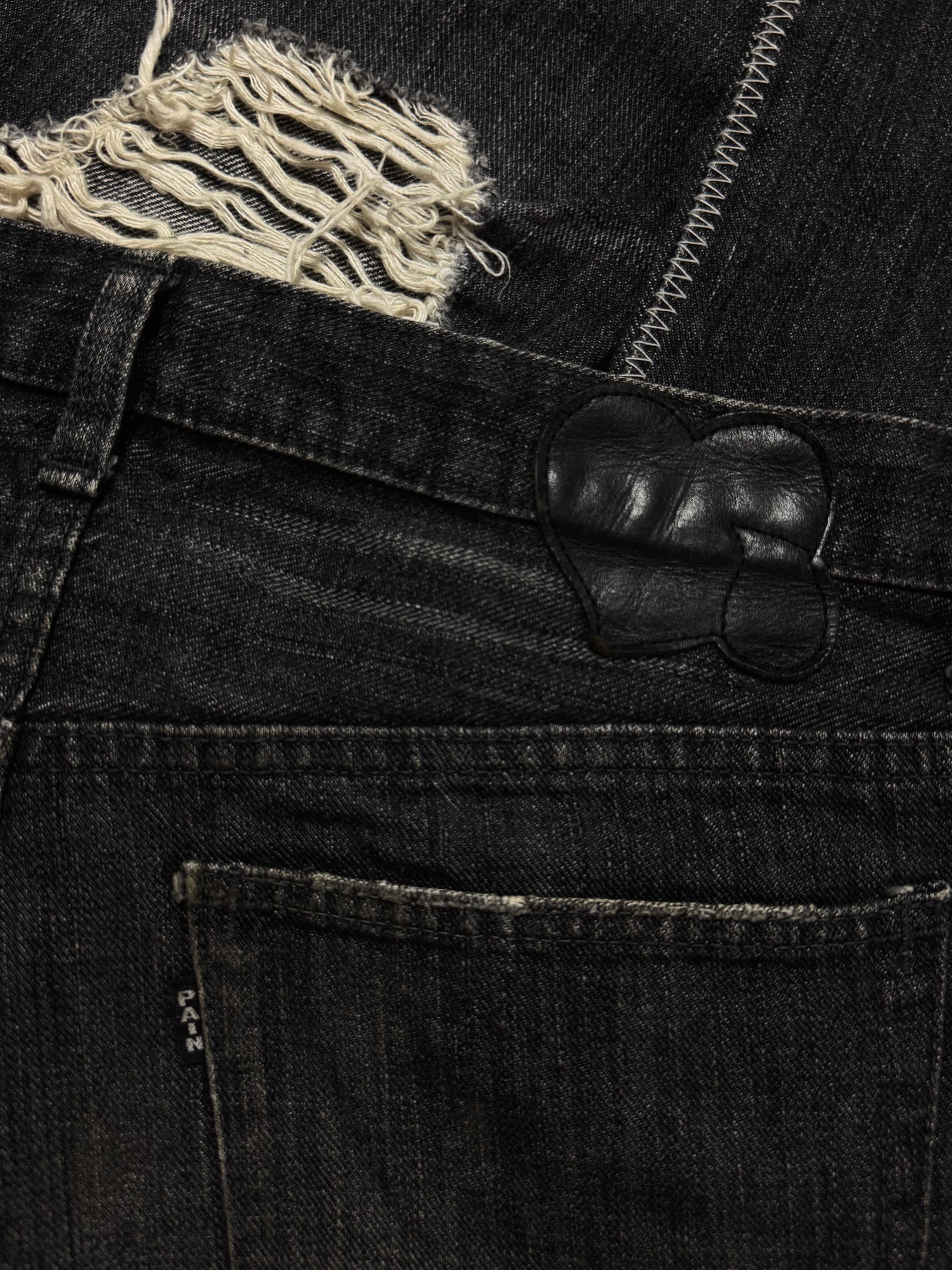 From the Autumn/Winter 2004 "Give Peace A Chance", this iconic pair of 'pain' denim features different patchwork throughout, featuring phrases that reflect the season's theme, where Miyashita centered the collection around an ‘Anti-War' message.These patchwork jeans were released in different variations; this particular pair having blowouts on the knee and thigh area, coming in a faded black wash. Features the iconic crying heart leather patch on the rear. In gold condition with some minor stains on the front patches (can be removed) no orher flaws or damages