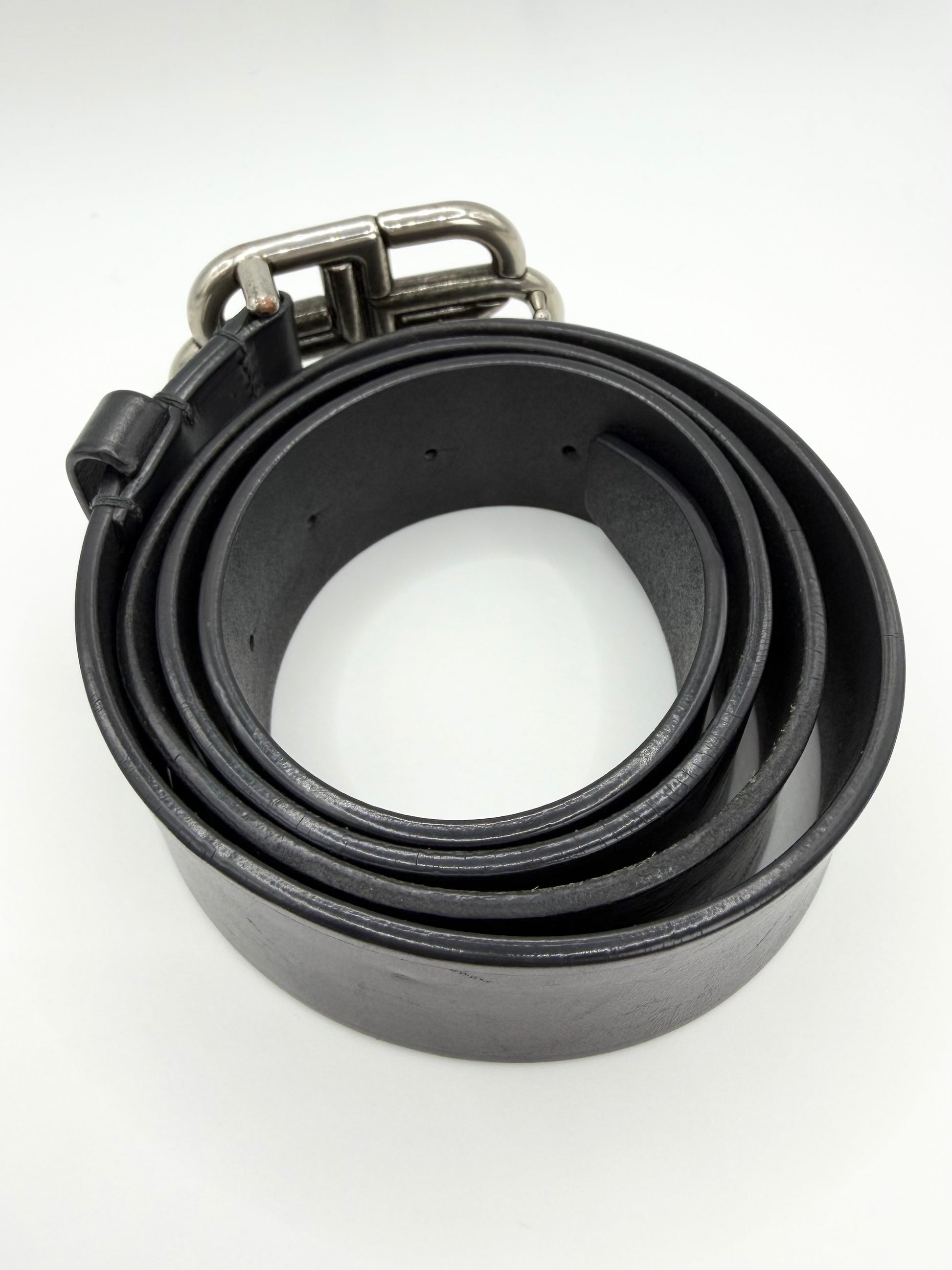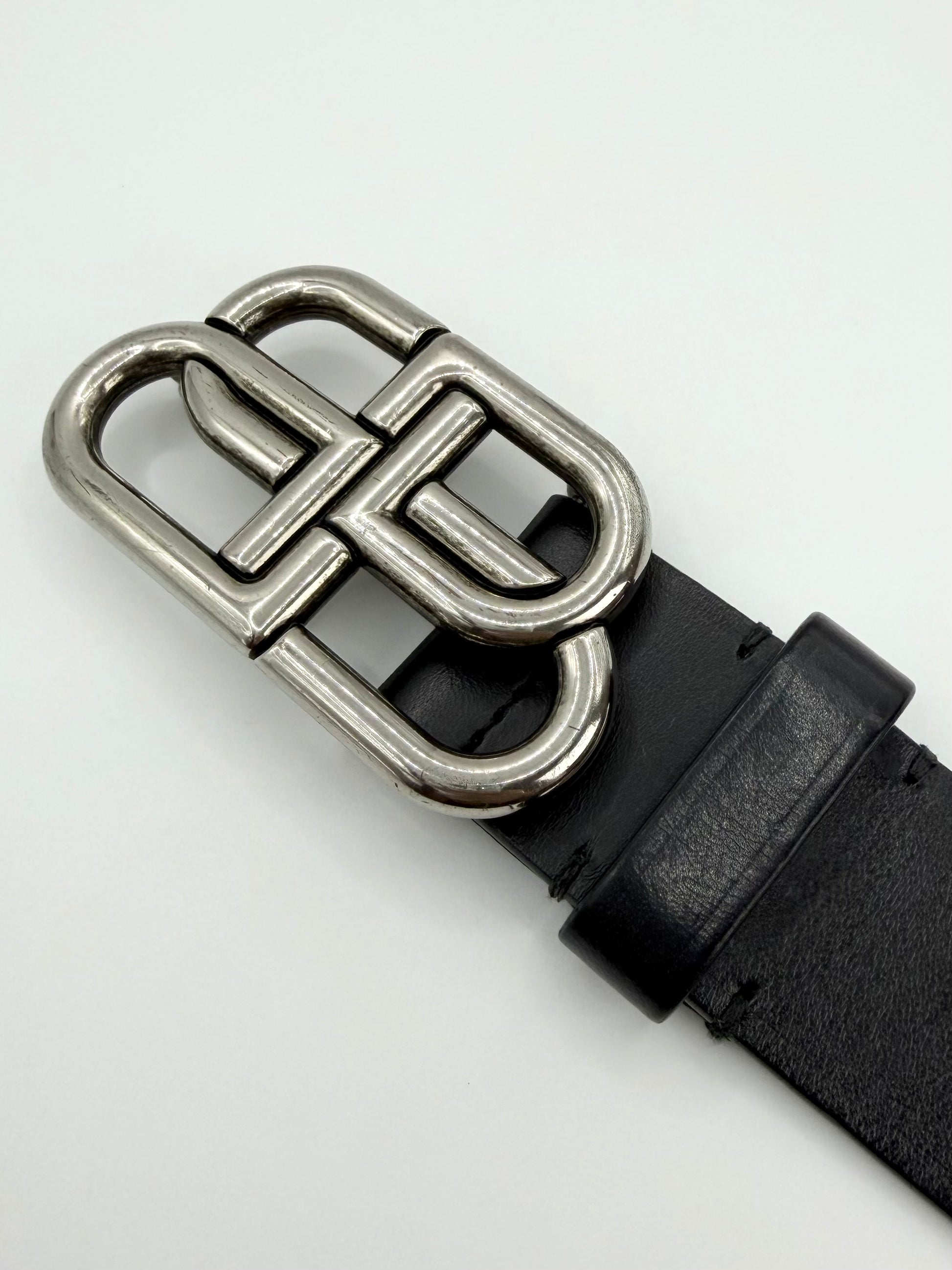 Statement Balenciaga leather belt featuring a bold interlocking BB monogram buckle in polished silver-tone hardware. The structured black leather strap contrasts with the industrial, sculptural buckle design, creating a strong visual centerpiece. Subtle branding and clean construction reflect Balenciaga’s modern luxury direction. In good condition with no flaws or damages.