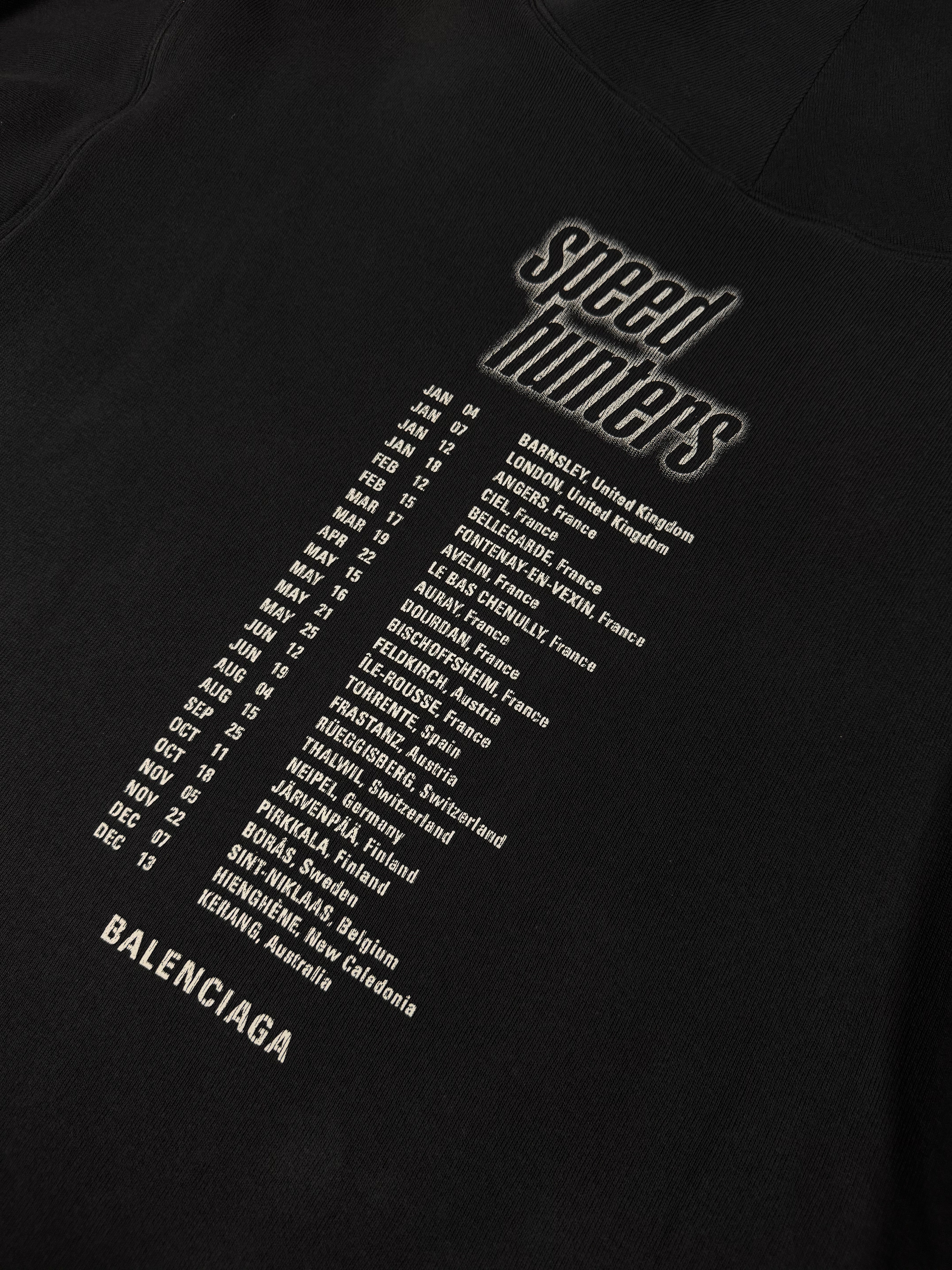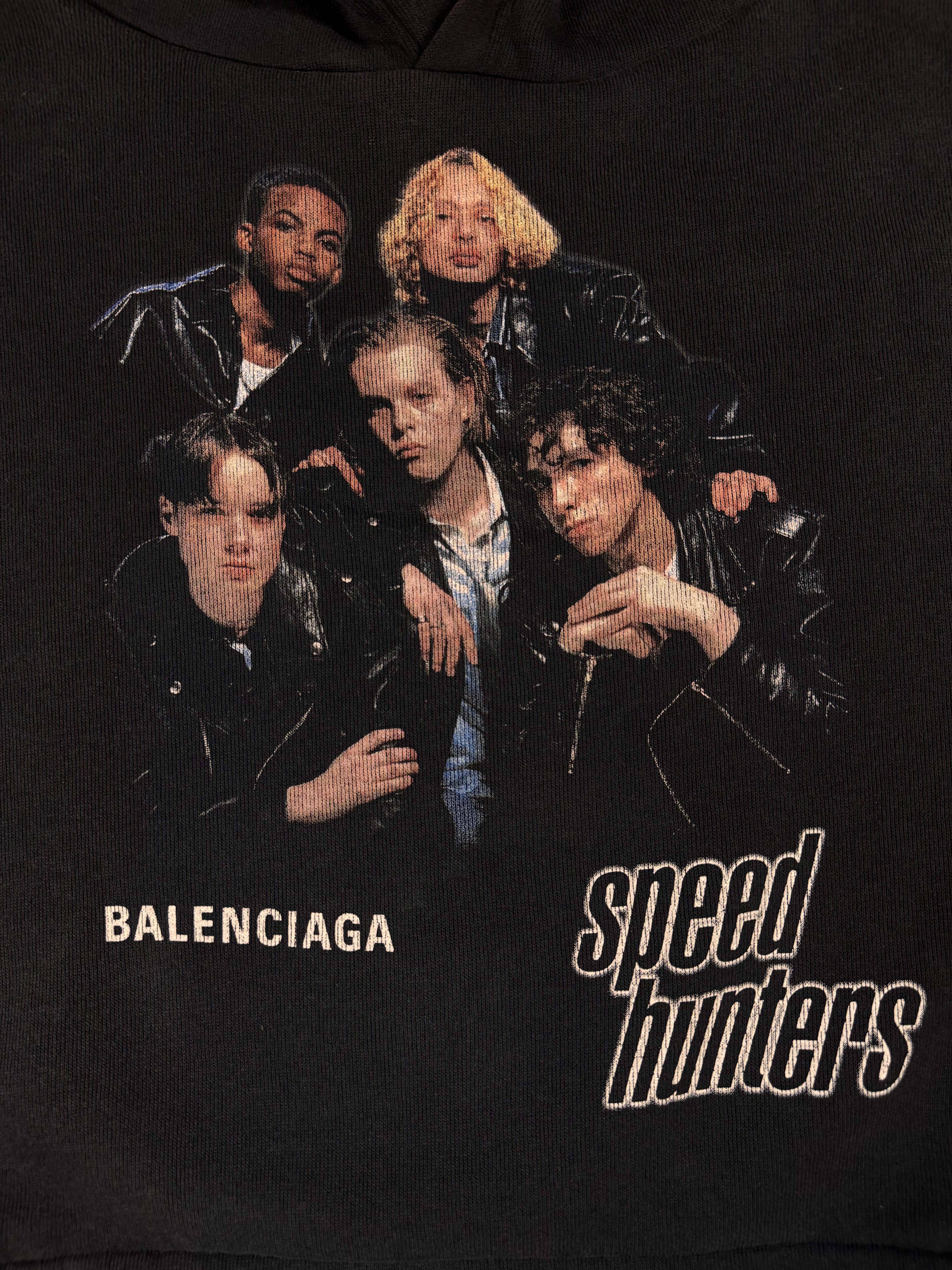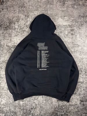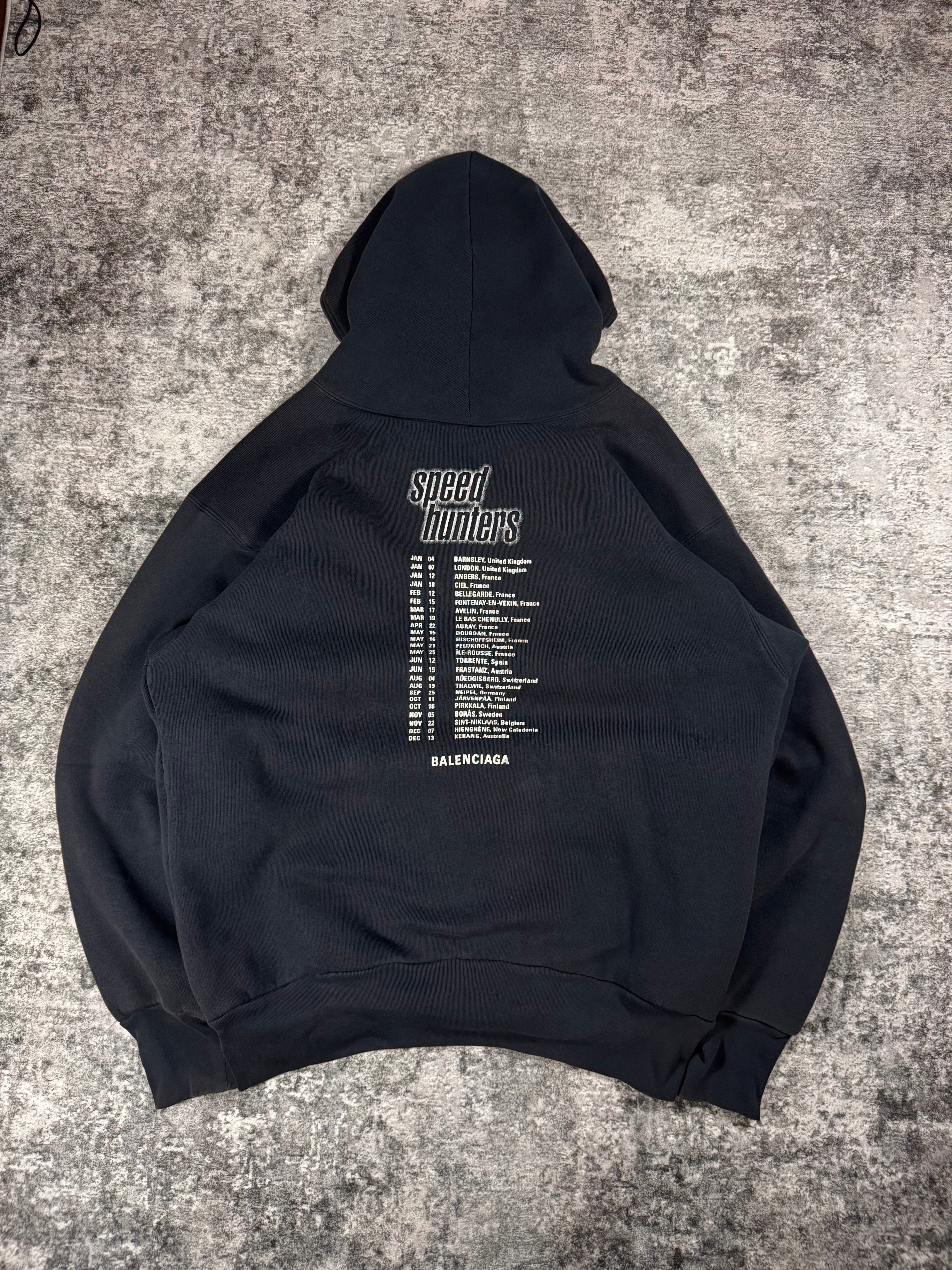 This classic Balenciaga hoodie was featured in the Spring/Summer 2018 runway. Features the “Speed Hunters” which is Demna's fictional boyband, and this hoodie was produced as “concert merch” with the tour dates on the back, which is across Europe. This piece draws inspiration from a quintet of young men in matching leather jackets, whose band logo echoed the iconic font of ’90s superstars Backstreet Boys. In good condition with no major flaws or damages