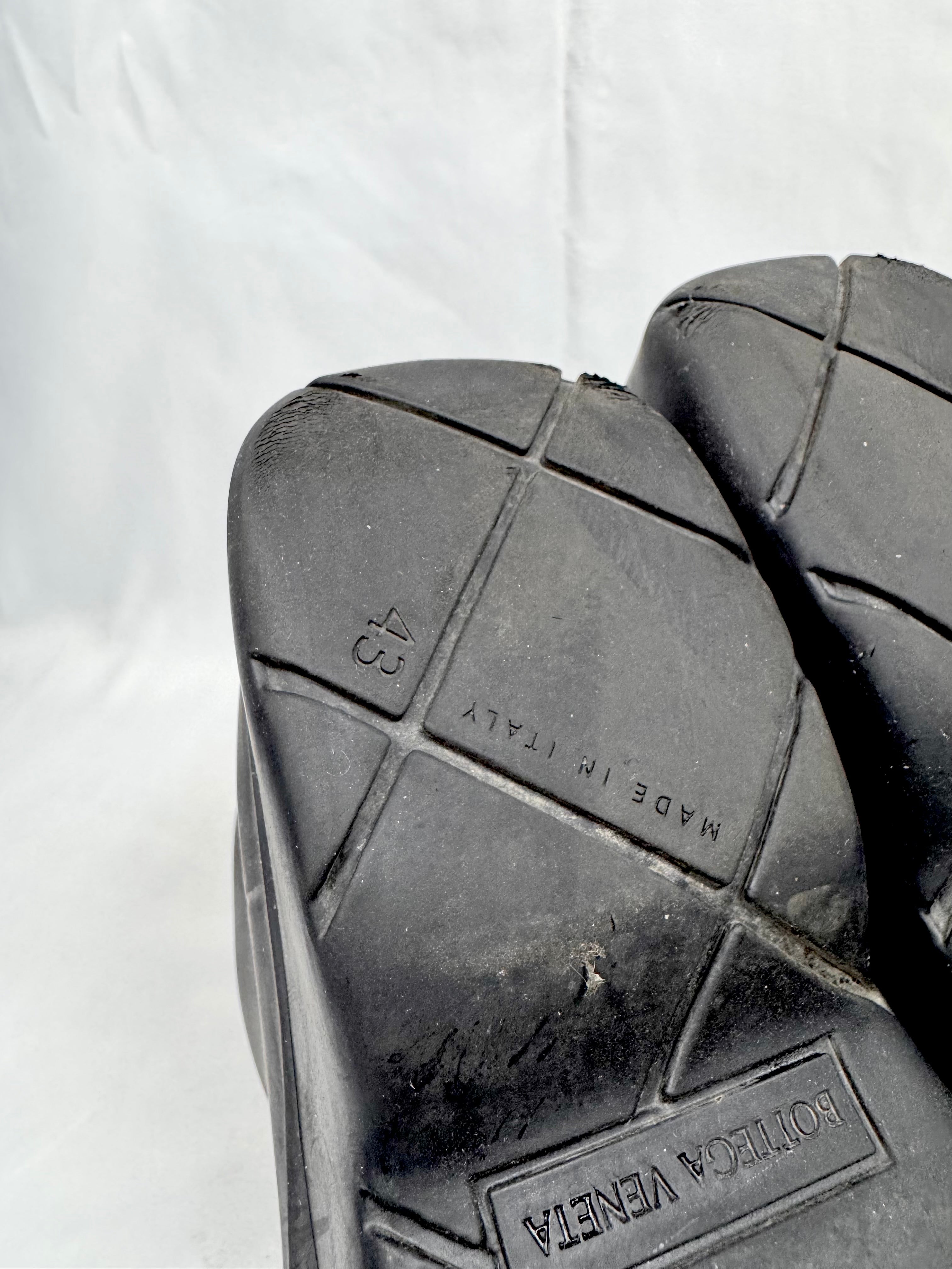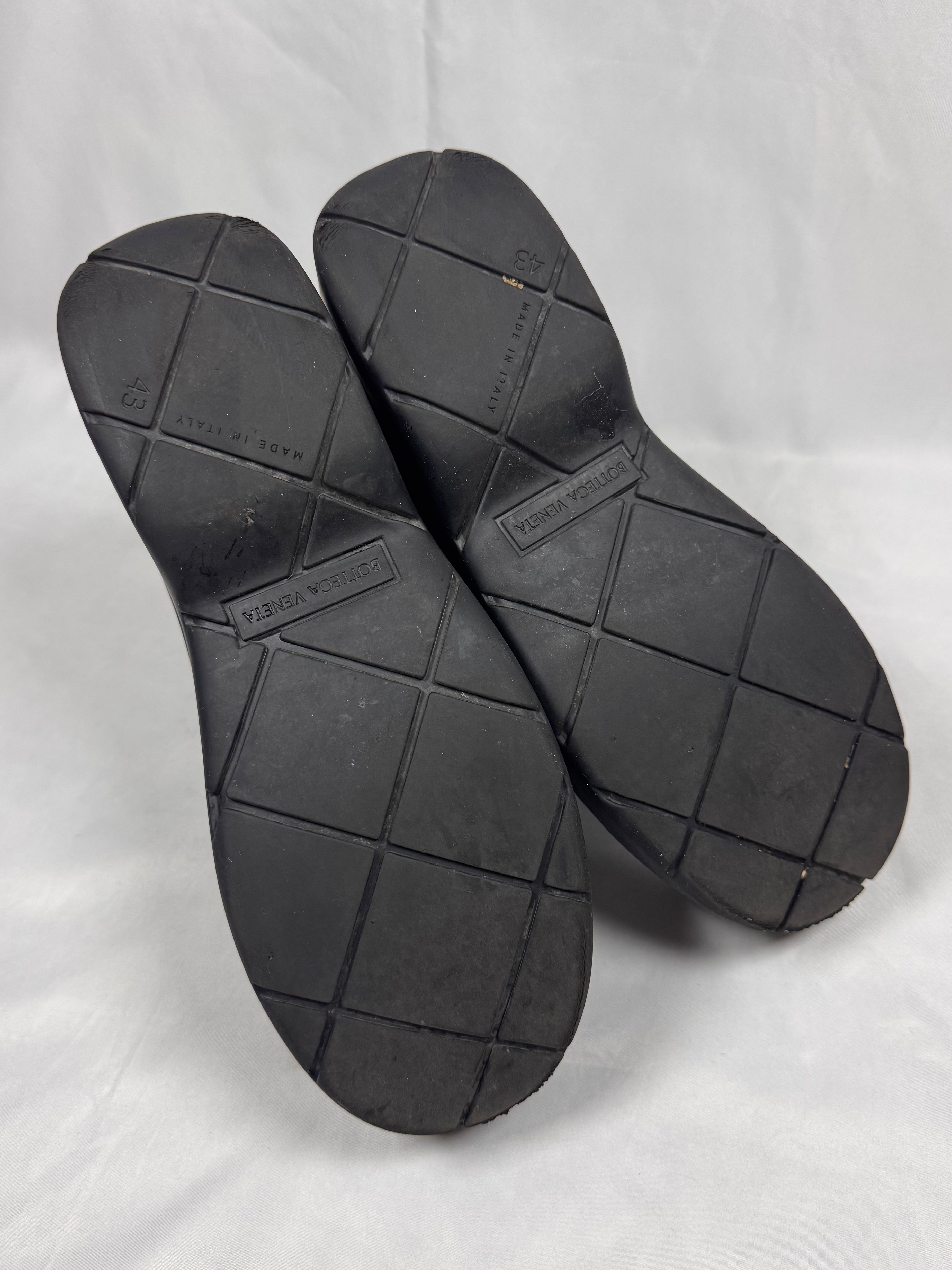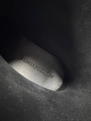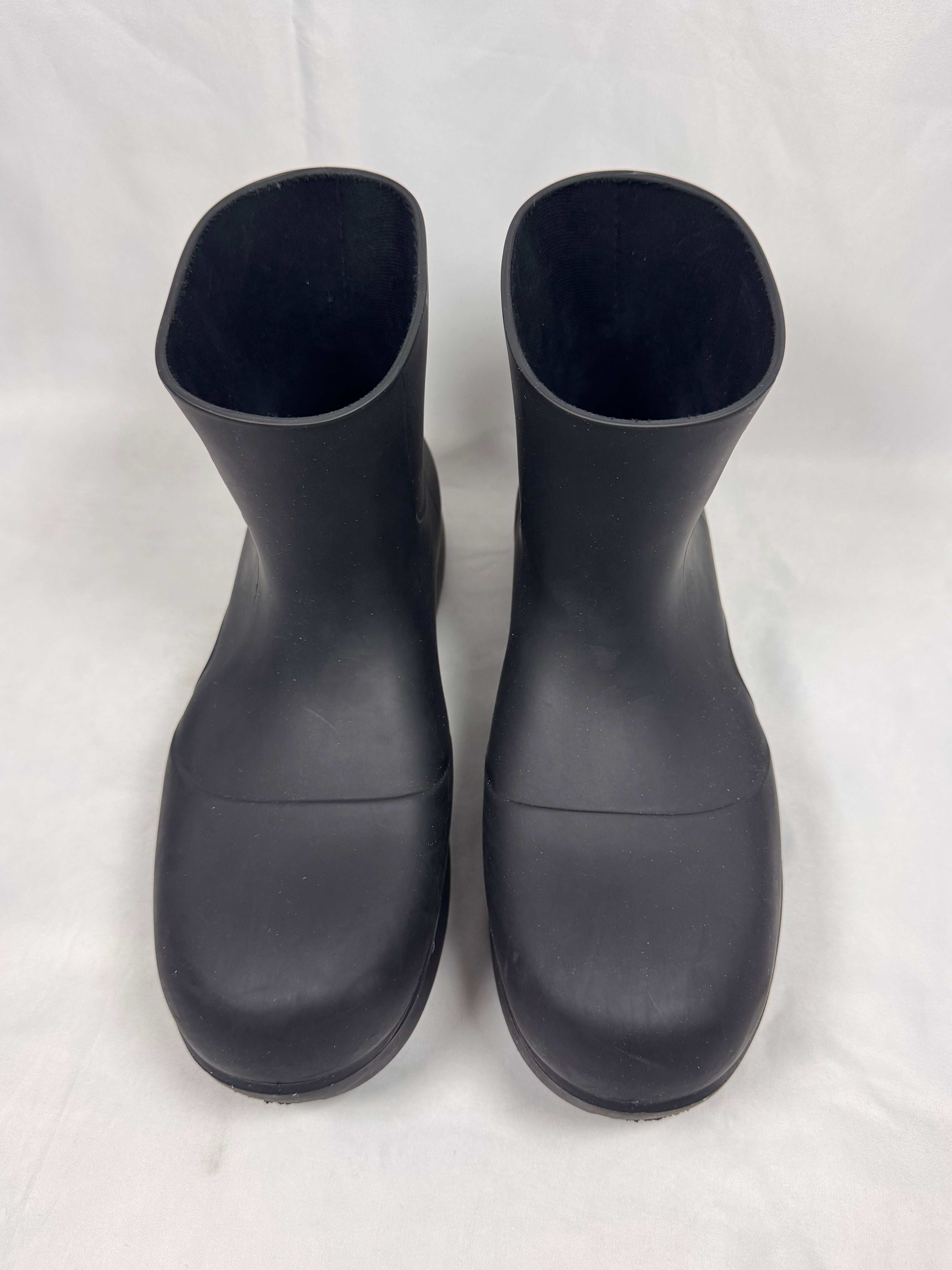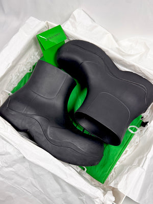 Sculpted in a matte black rubber, these Bottega Veneta Puddle boots feature the brand’s signature exaggerated rounded toe and fluid, one-piece molded construction. The silhouette merges utilitarian rain-boot function with Daniel Lee’s modernist, almost futuristic proportions, creating a bold yet minimal statement. Fully waterproof with a chunky sole and pull-on Chelsea shape. In solid condtion with general wear, no major damages. Comes with the original box, receipt, shoe covers from purchase
