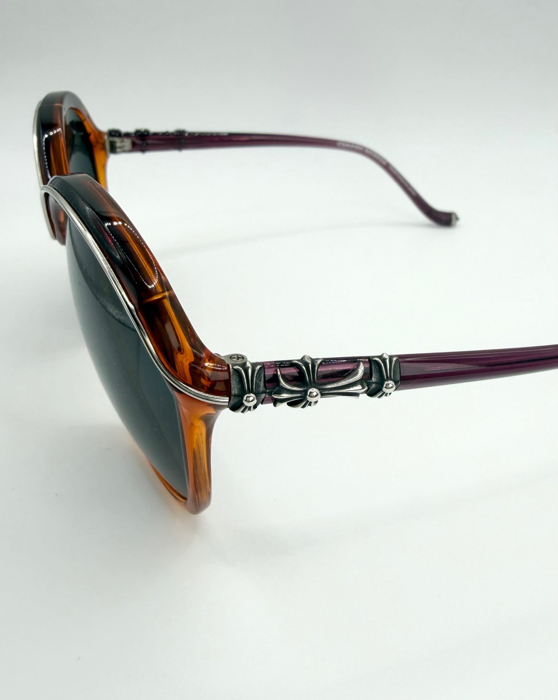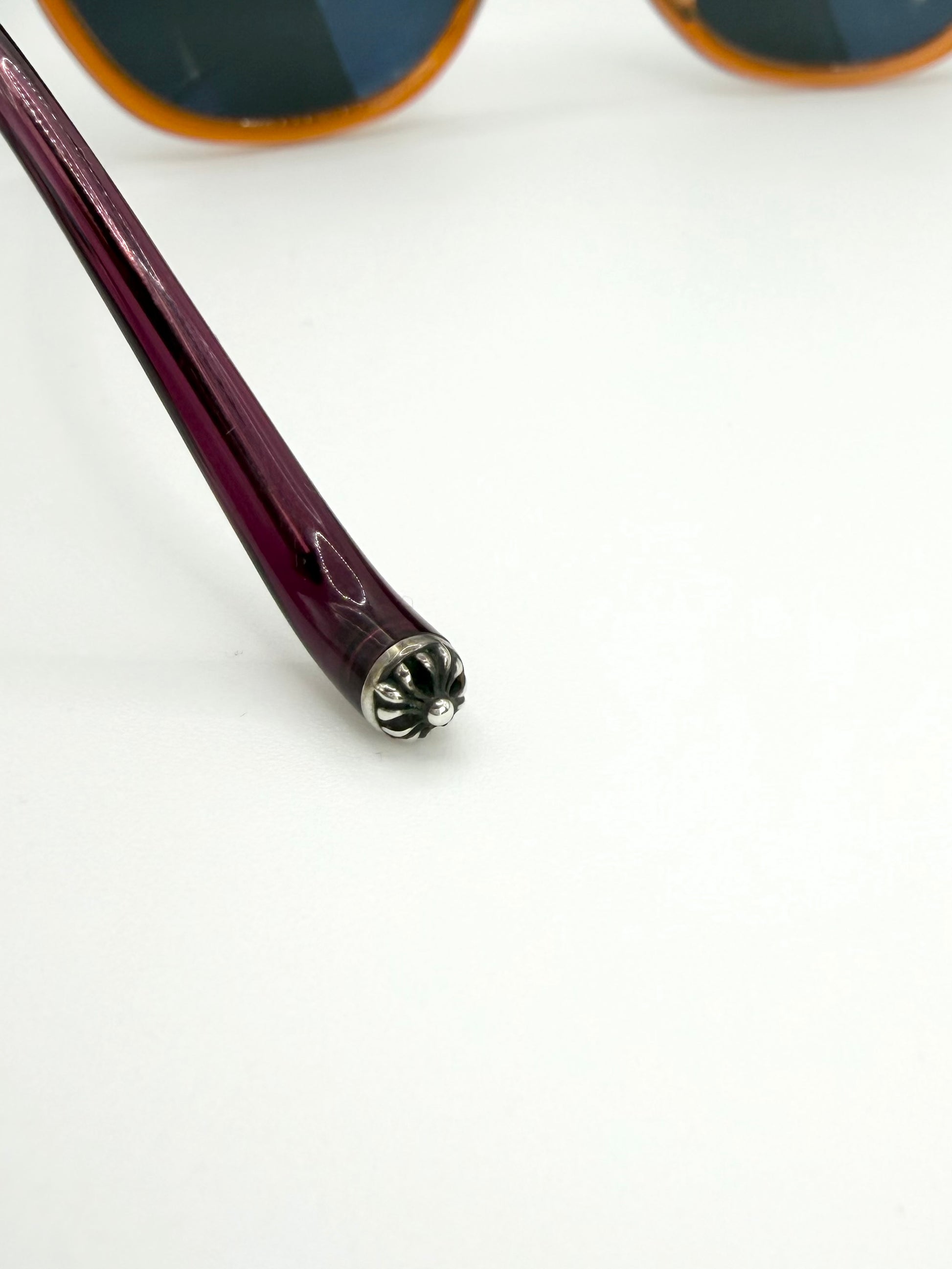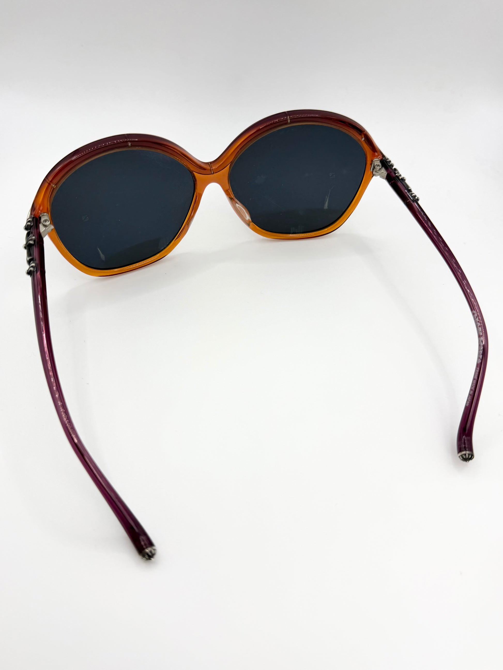 A early 2000s distinctive Chrome Hearts eyewear piece featuring a warm amber acetate front paired with deep purple temples, anchored by the brand’s signature sterling silver cross motifs. The “Cock A Roach” model embodies early Chrome Hearts optical design language, blending bold sculptural framing with intricate gothic hardware. Dark tinted lenses complement the oversized oval silhouette. Good vintage condition with light signs of wear throughout. Minor surface scratches on lenses and faint wear to acetate/temples consistent with age.