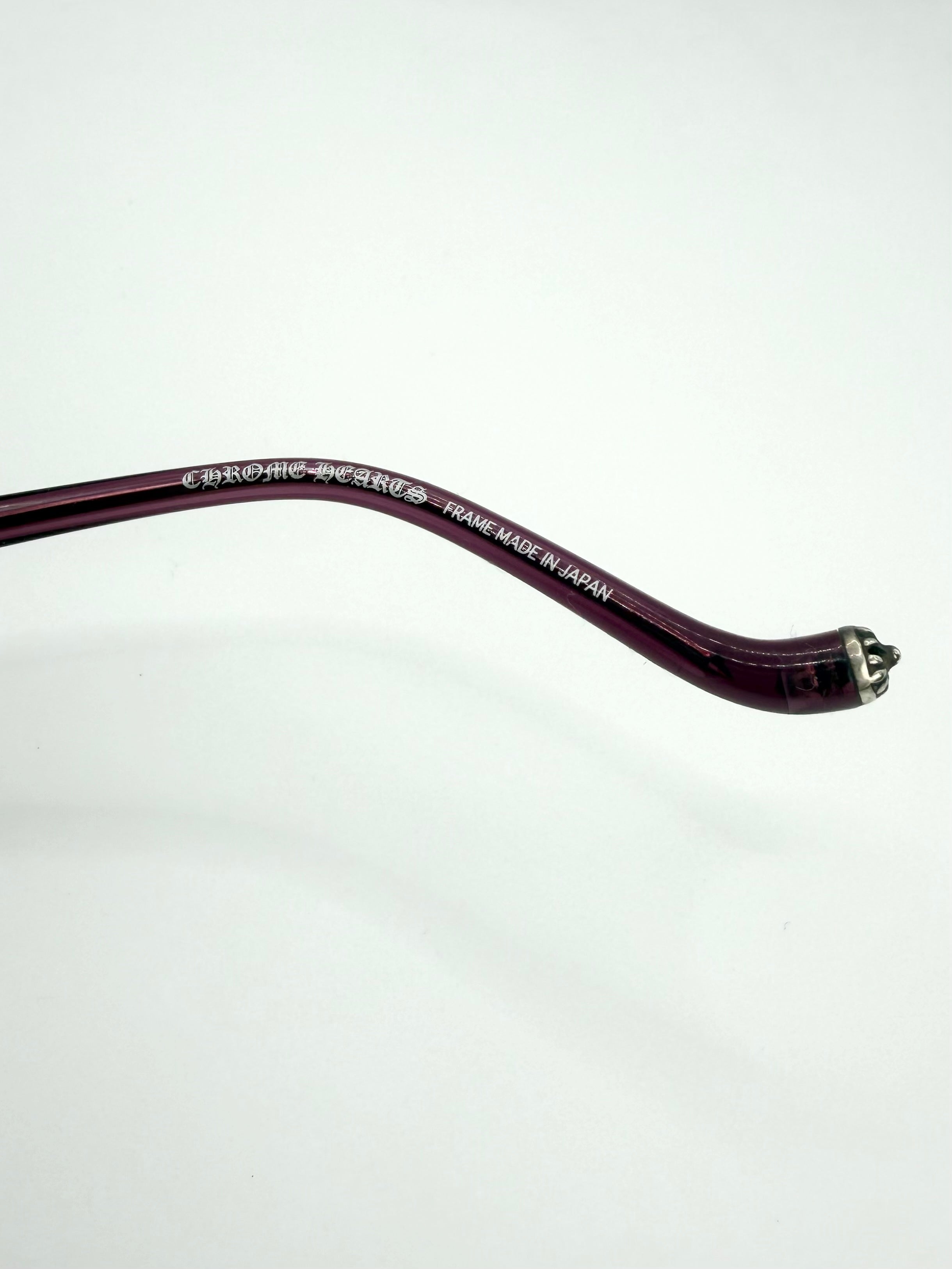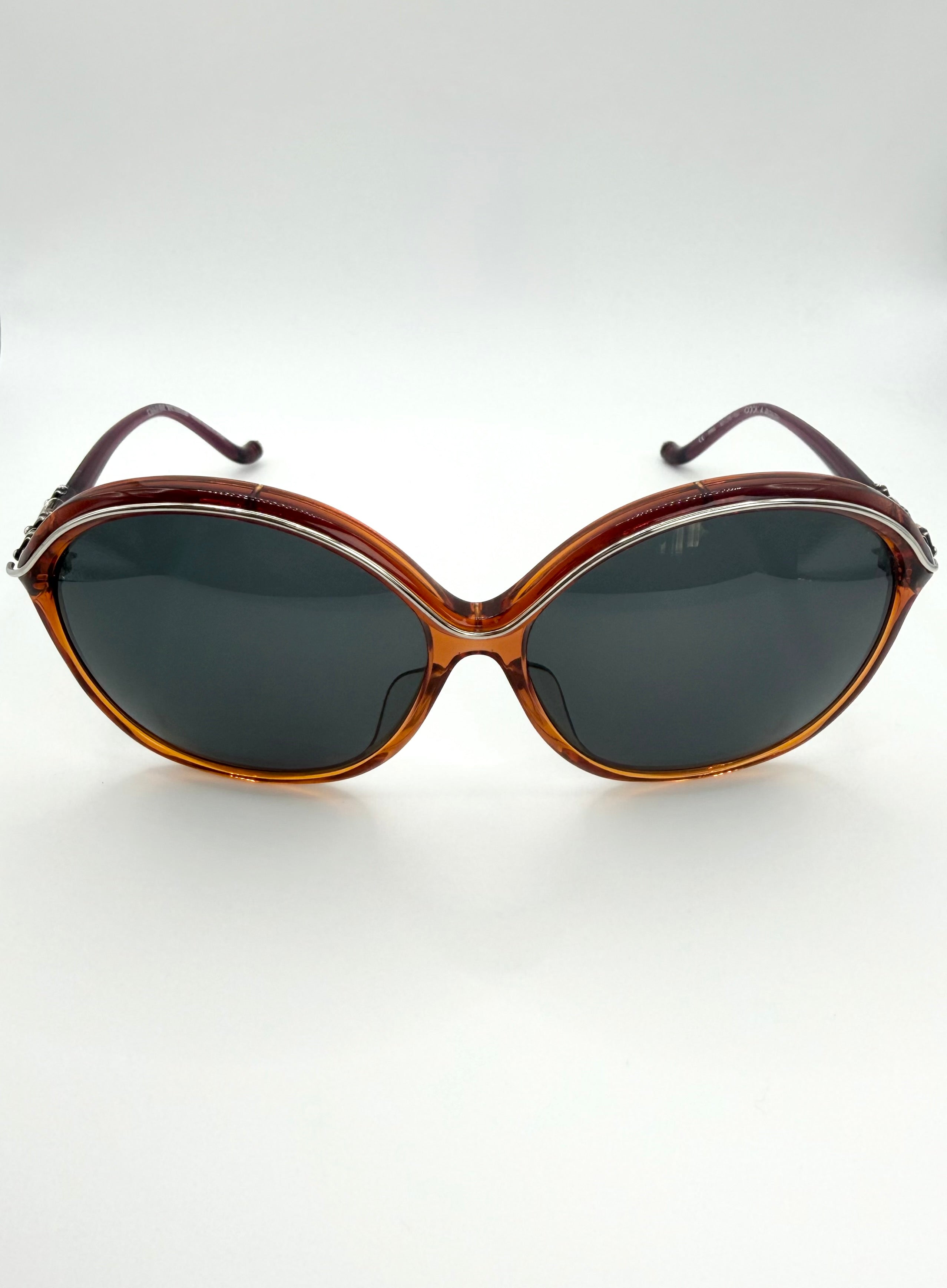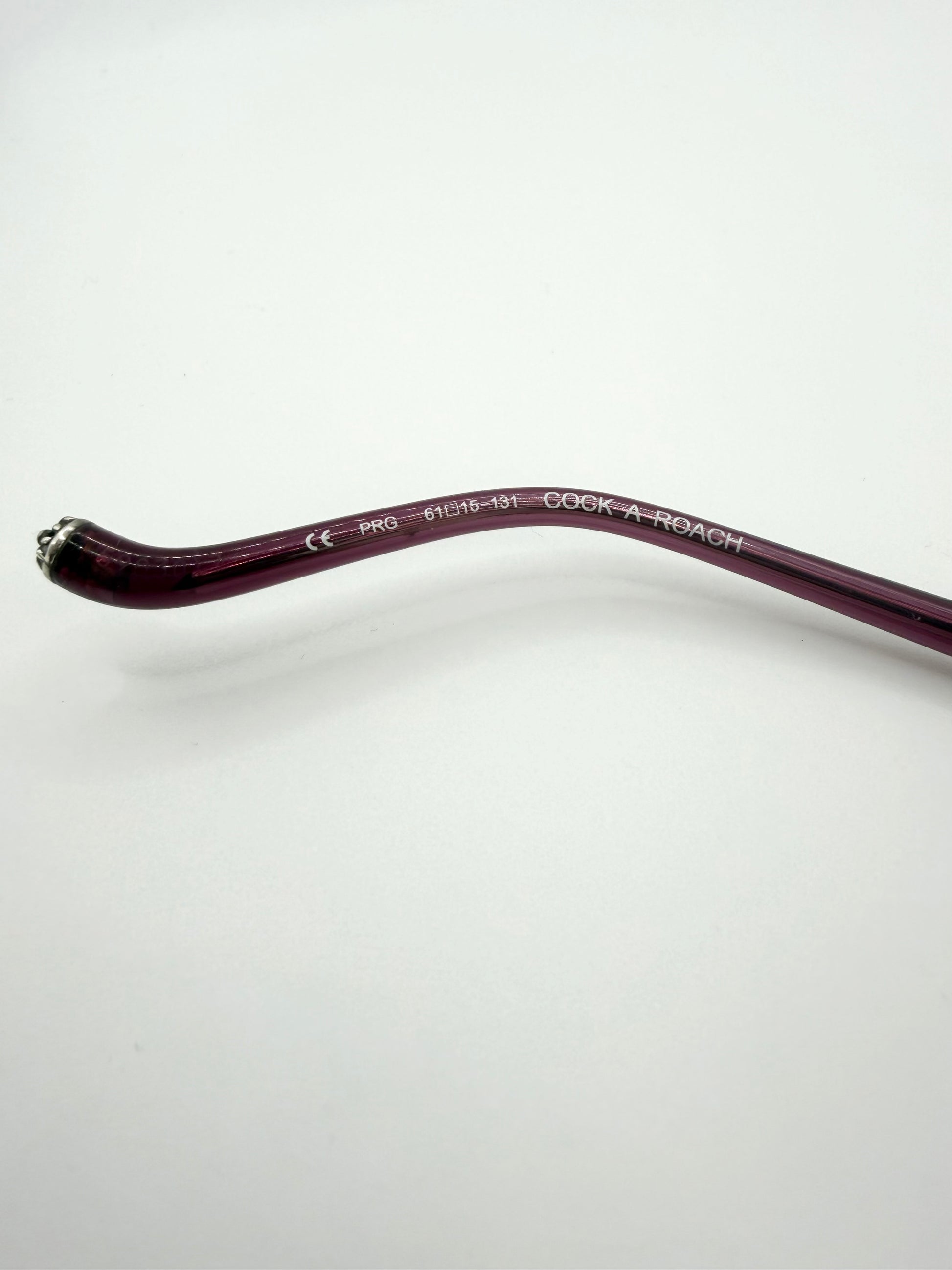 A early 2000s distinctive Chrome Hearts eyewear piece featuring a warm amber acetate front paired with deep purple temples, anchored by the brand’s signature sterling silver cross motifs. The “Cock A Roach” model embodies early Chrome Hearts optical design language, blending bold sculptural framing with intricate gothic hardware. Dark tinted lenses complement the oversized oval silhouette. Good vintage condition with light signs of wear throughout. Minor surface scratches on lenses and faint wear to acetate/temples consistent with age.