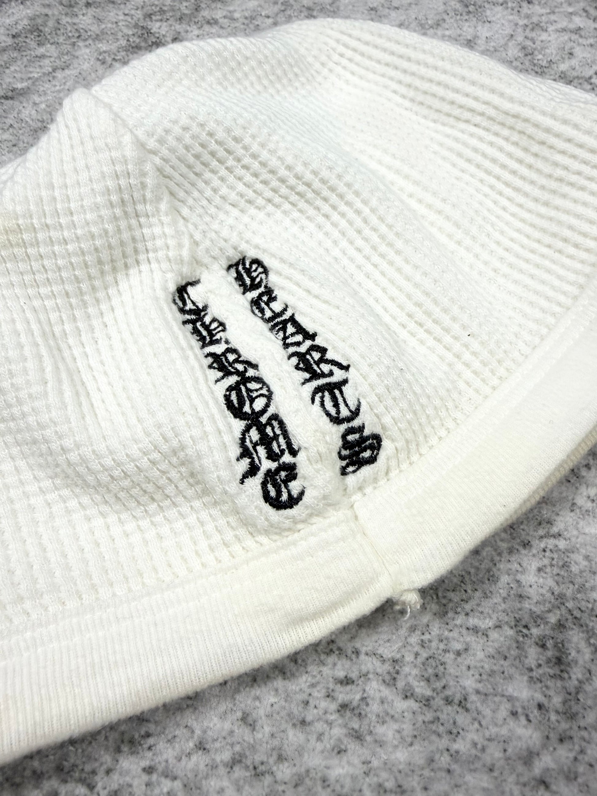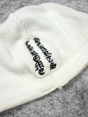 A rare Chrome Hearts thermal beanie constructed from a soft waffle-knit cotton, offering both structure and stretch. The piece features a clean white base contrasted by a bold embroidered 'Hairy Cross’ patch and vertical gothic logo detailing at the crown. Made in the USA, it reflects the brand’s early emphasis on quality basics elevated through signature iconography. Overall good coming with color defect in the inner part (minor on the exterior)