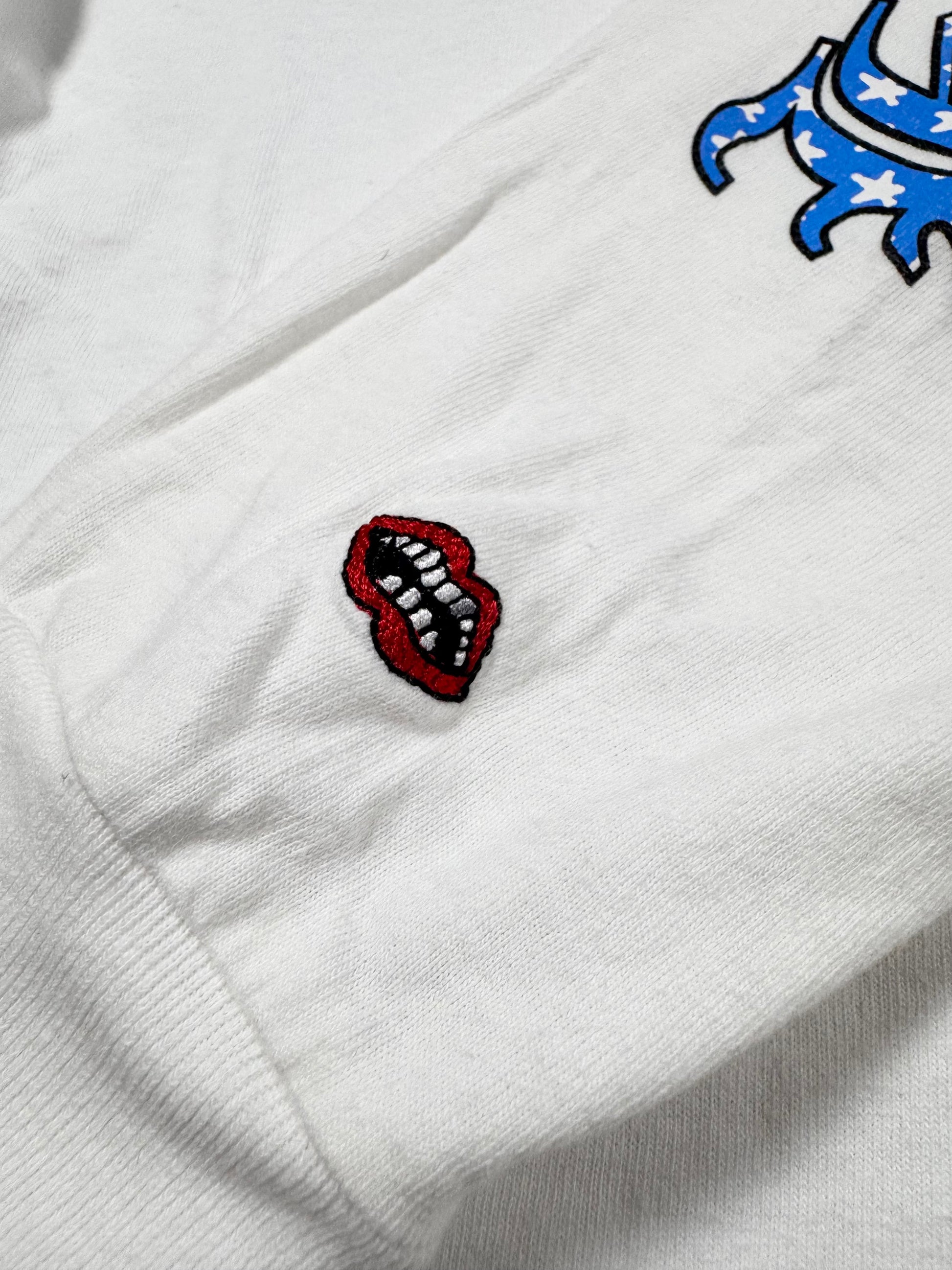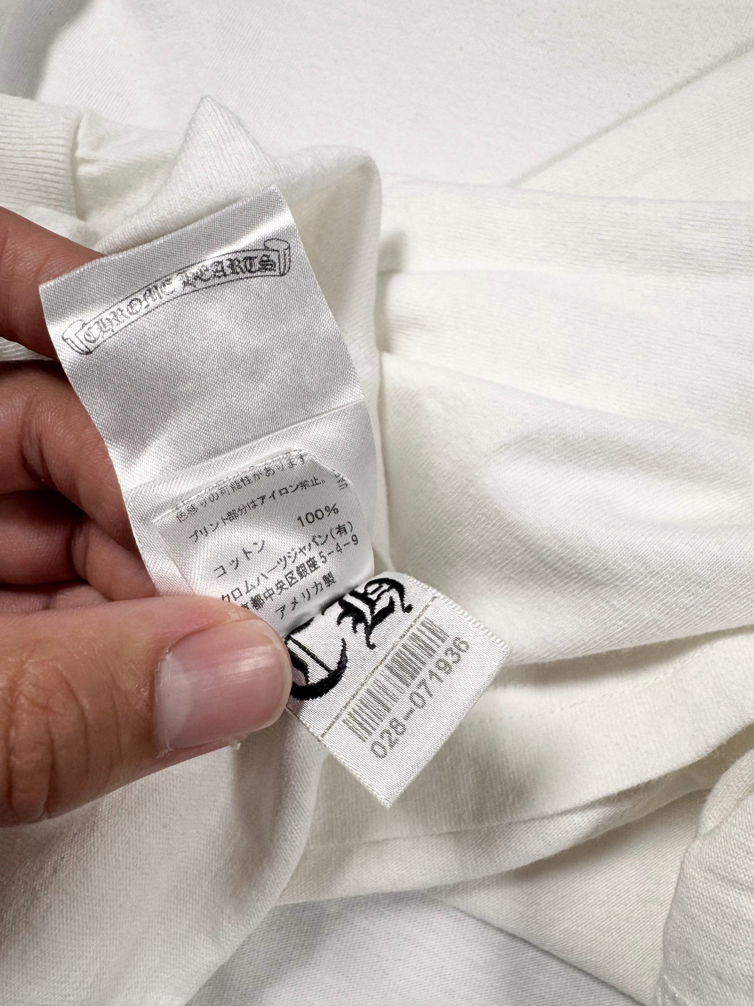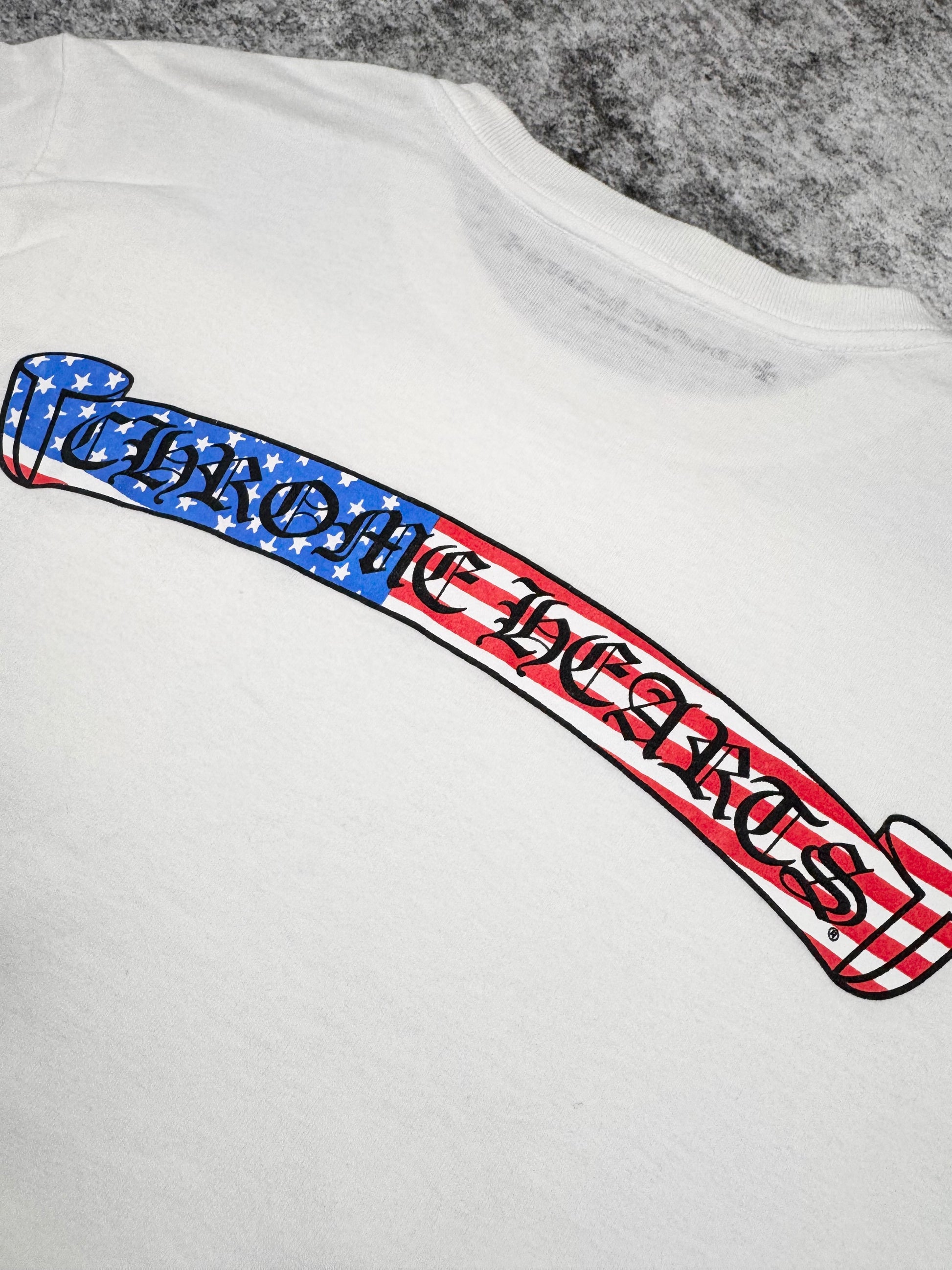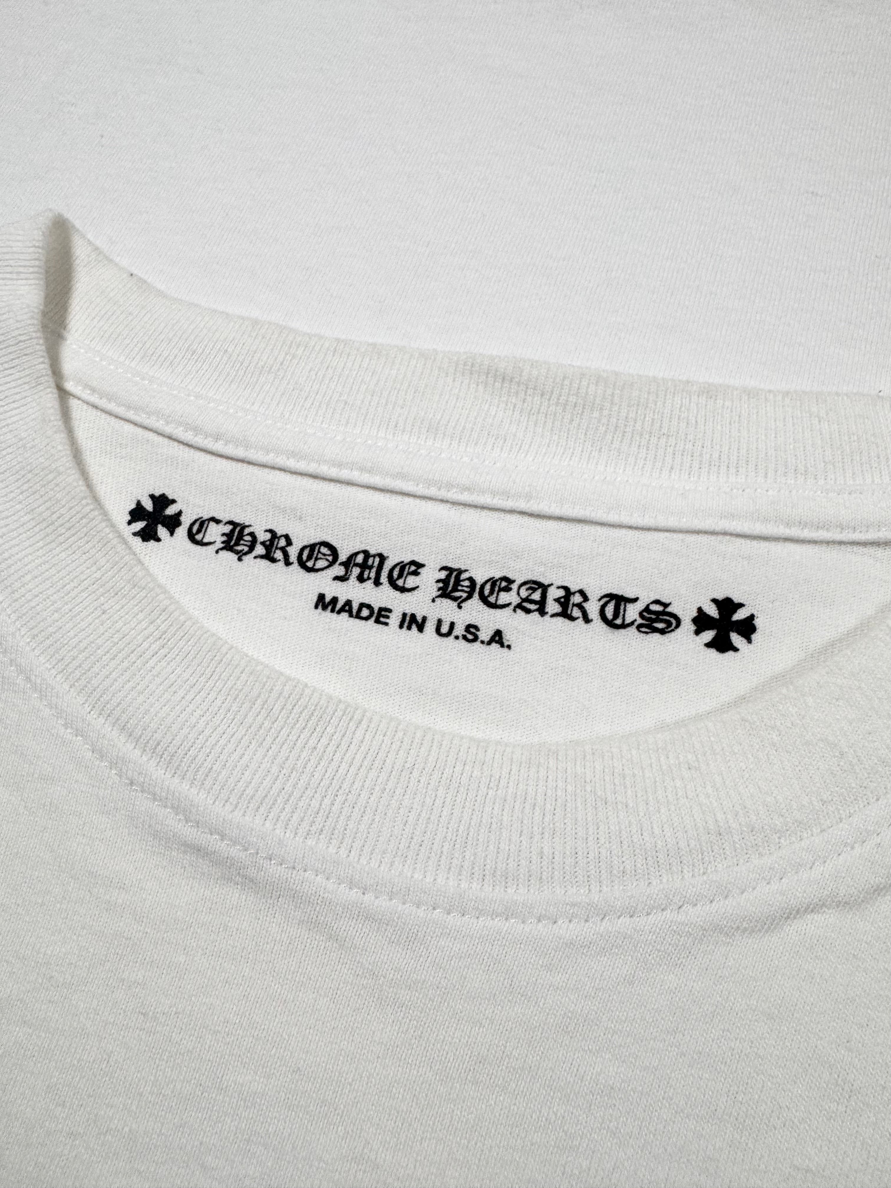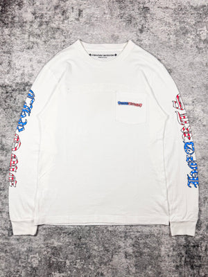 Showcased is a beautiful long sleeve released as part of the Chrome Hearts Matty Boy line, also known as an La-based artist Matt DiGiacomo renown for his tongue-in-cheek illustrations. This patriotic longsleeve features the signature ‘chomper’ embroidery on the end of the sleeve with American flag style Chrome Hearts banners on the front pocket and across the backside. The sleeves also feature the Chrome Hearts gothic text filled with the American flag motif. In good overall condition with no major flaws or damages (small mark on front)