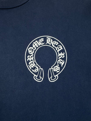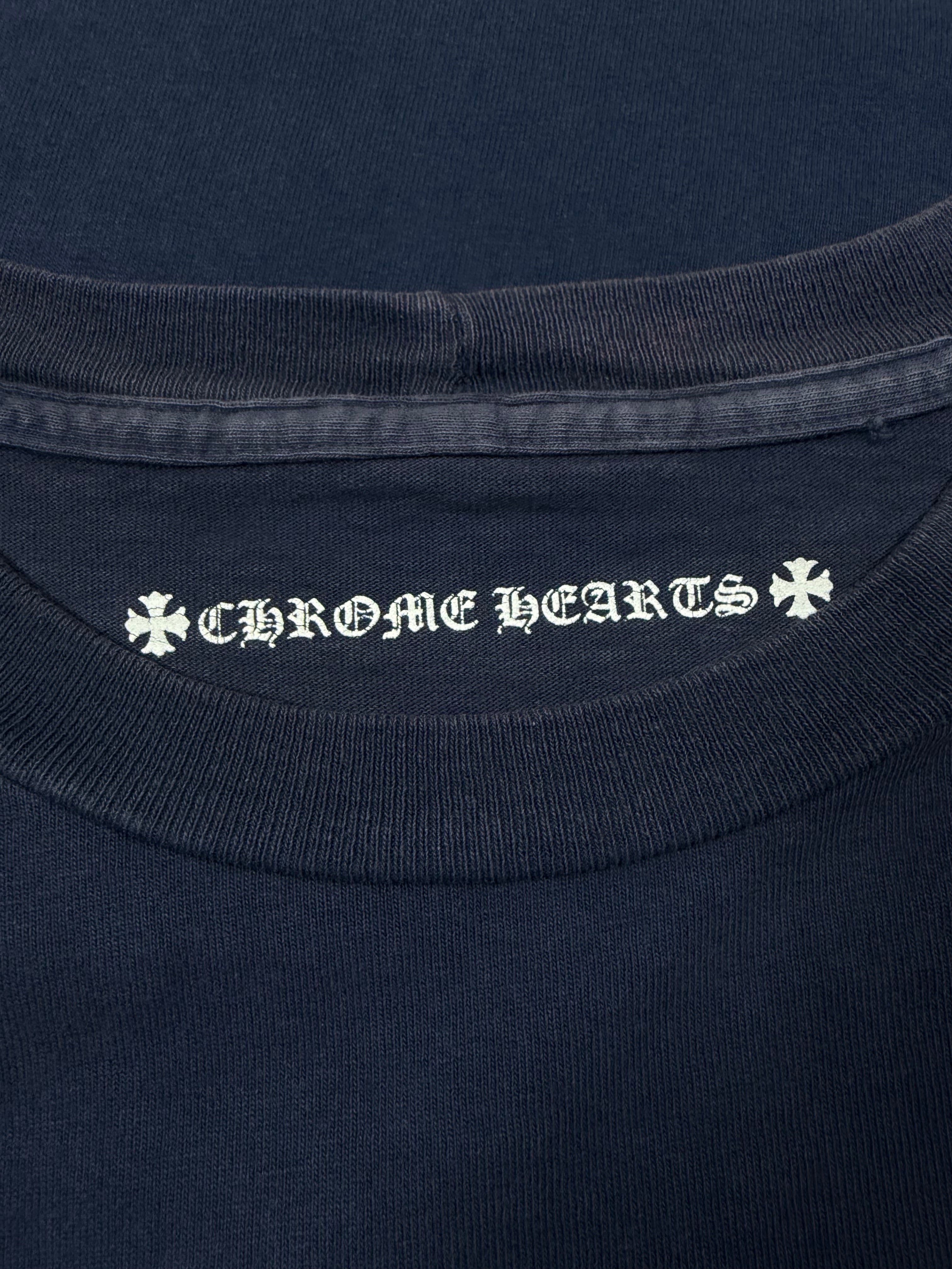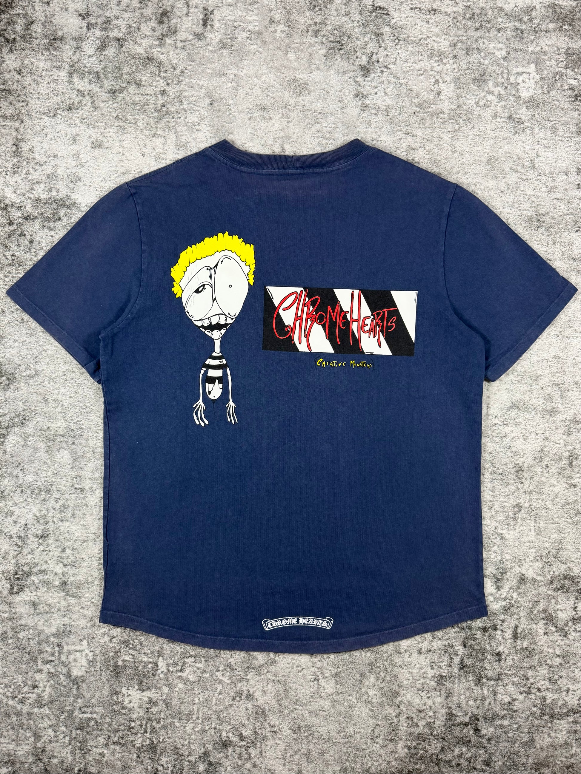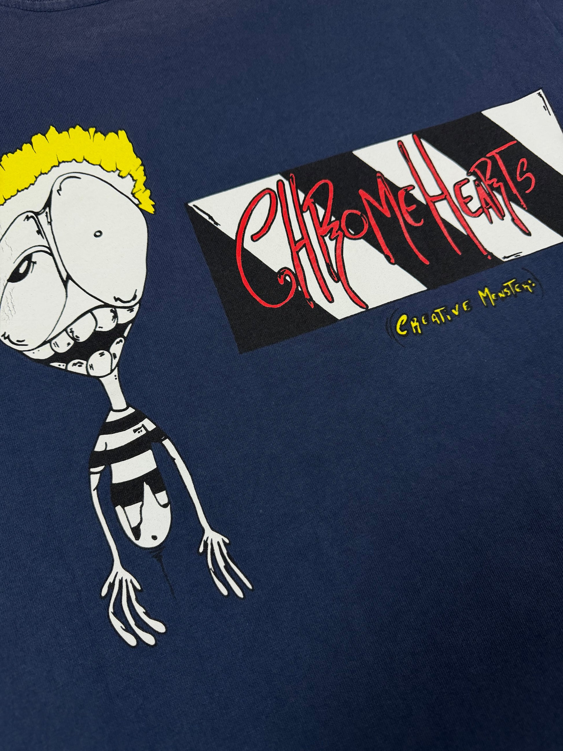 A standout Chrome Hearts Matty Boy release featuring the playful “Creative Monster” graphic contrasted against a deep navy base. The back print blends hand-drawn cartoon aesthetics with the signature Chrome Hearts logo hit, while the front keeps it minimal with a clean horseshoe chest emblem. Produced in the USA, this piece reflects the brand’s late-2010s shift into more expressive, artist-driven visuals under Matty Boy. In brilliant condition with no flaws or damages