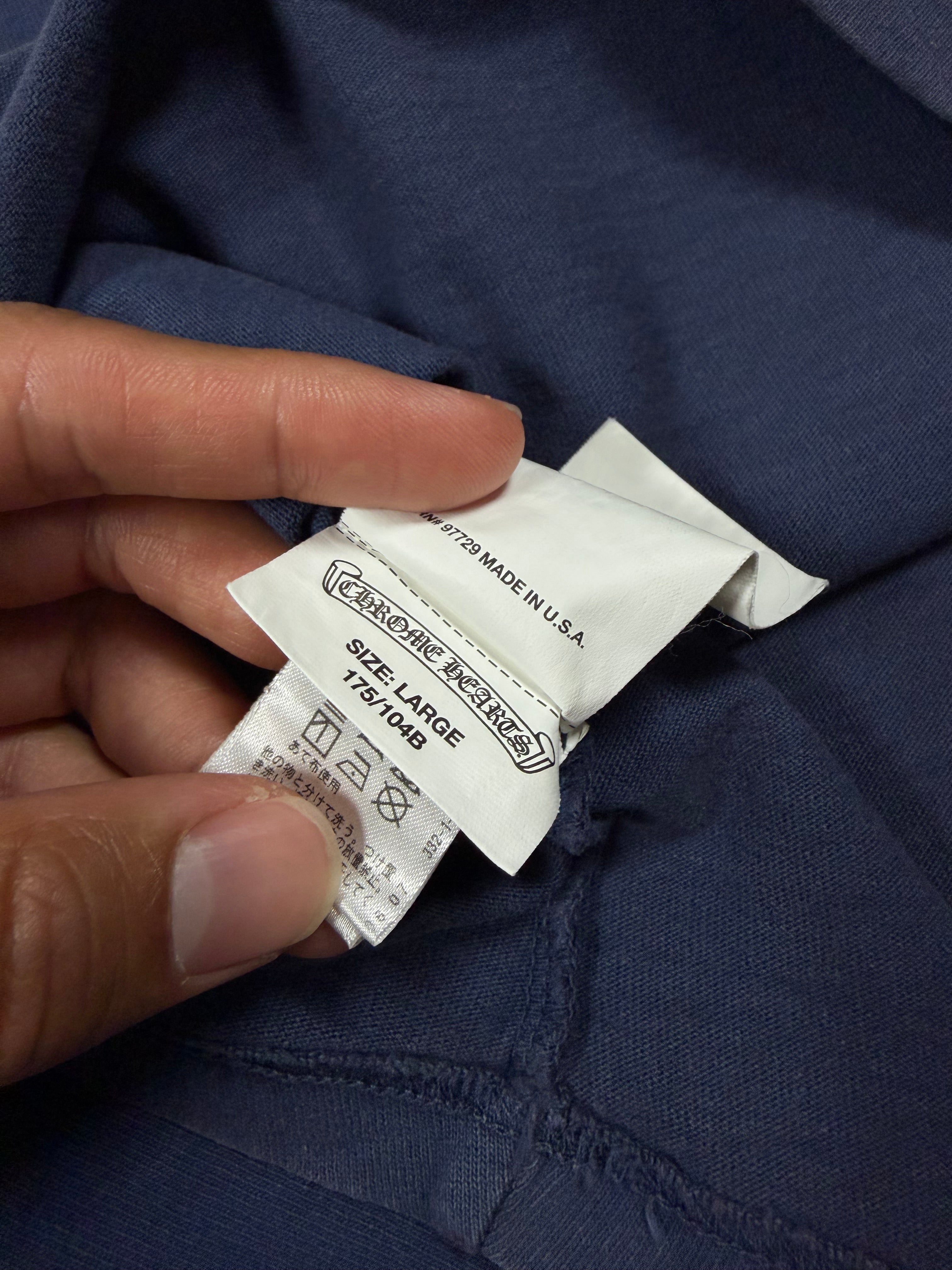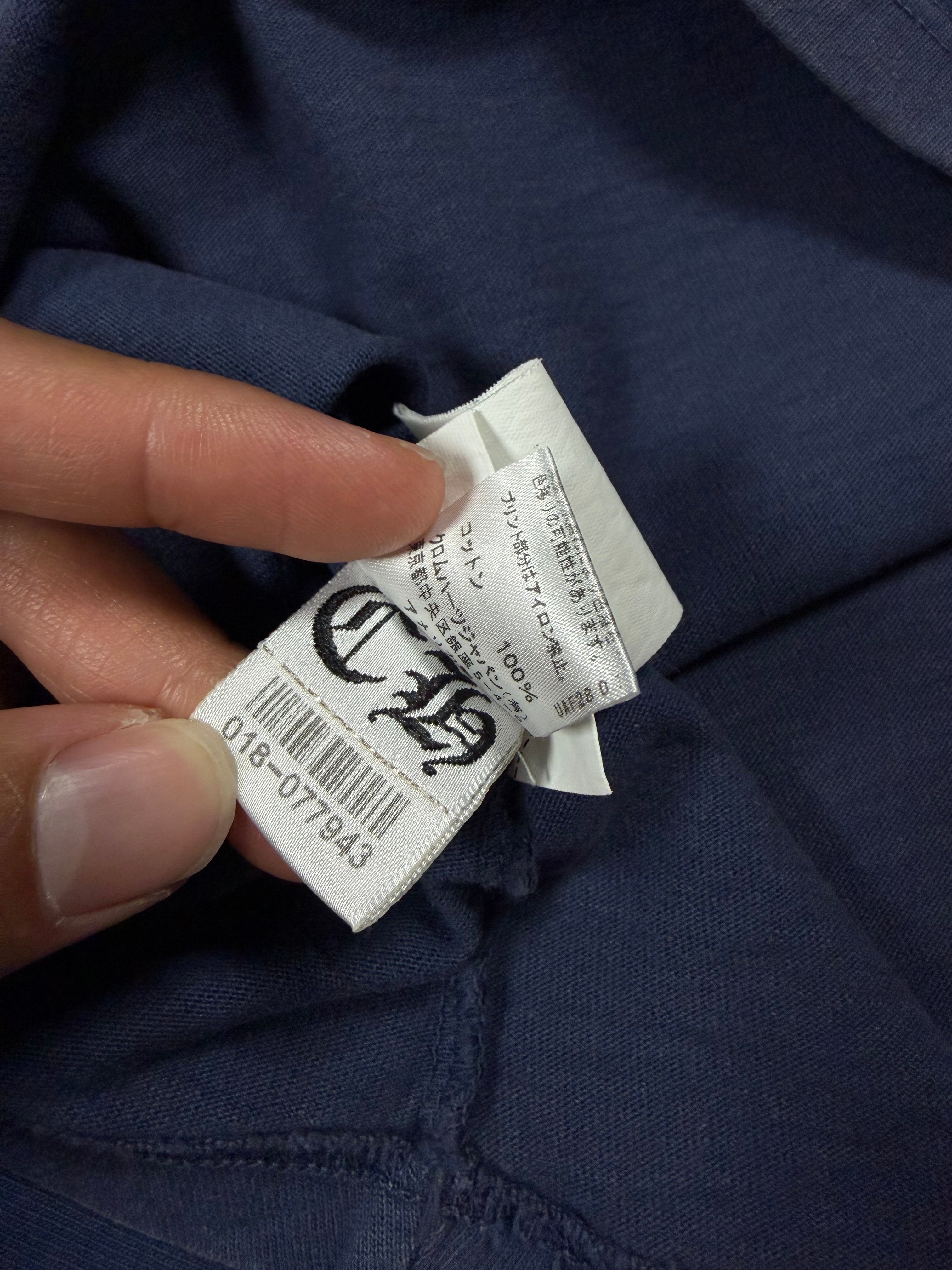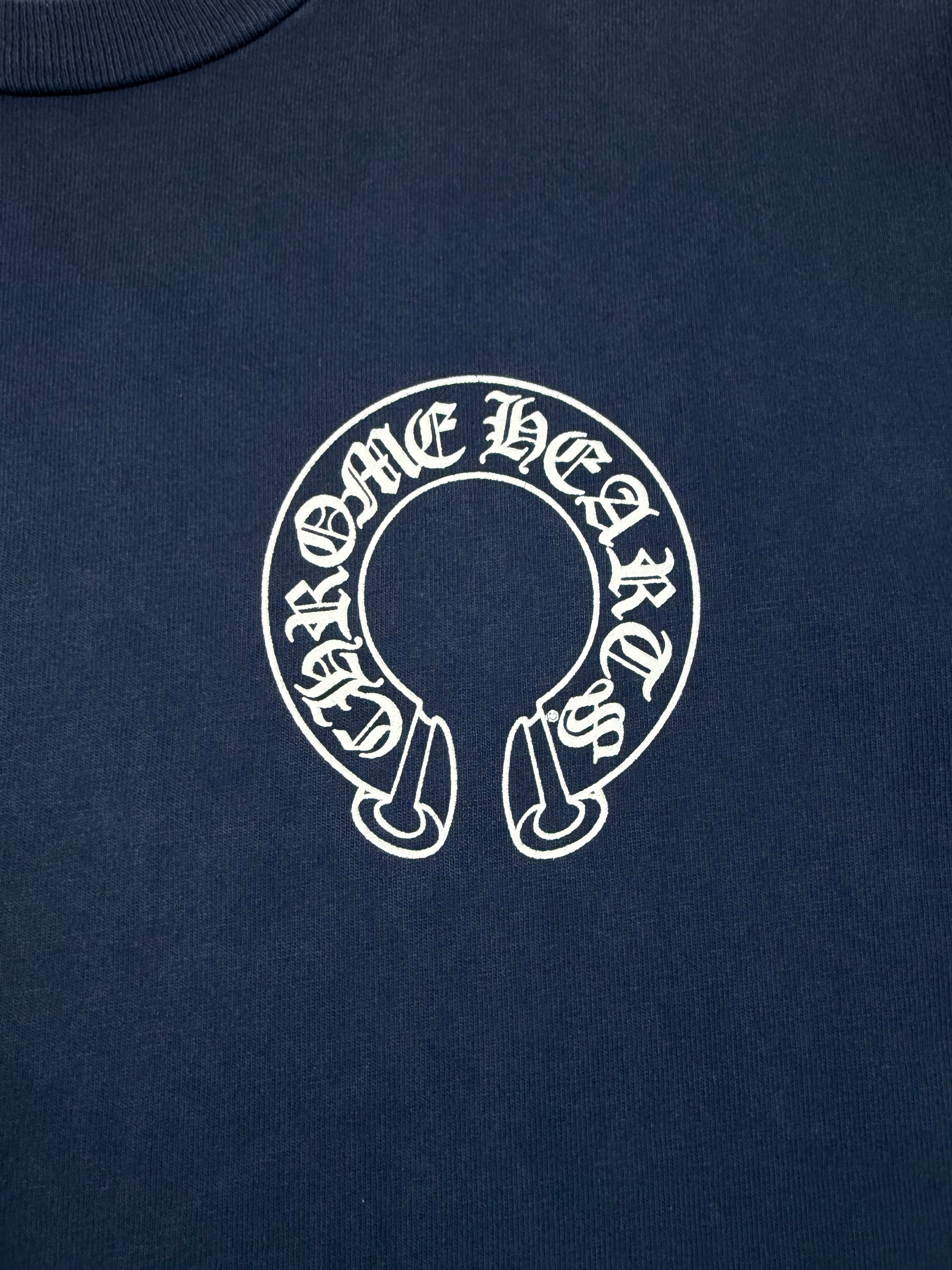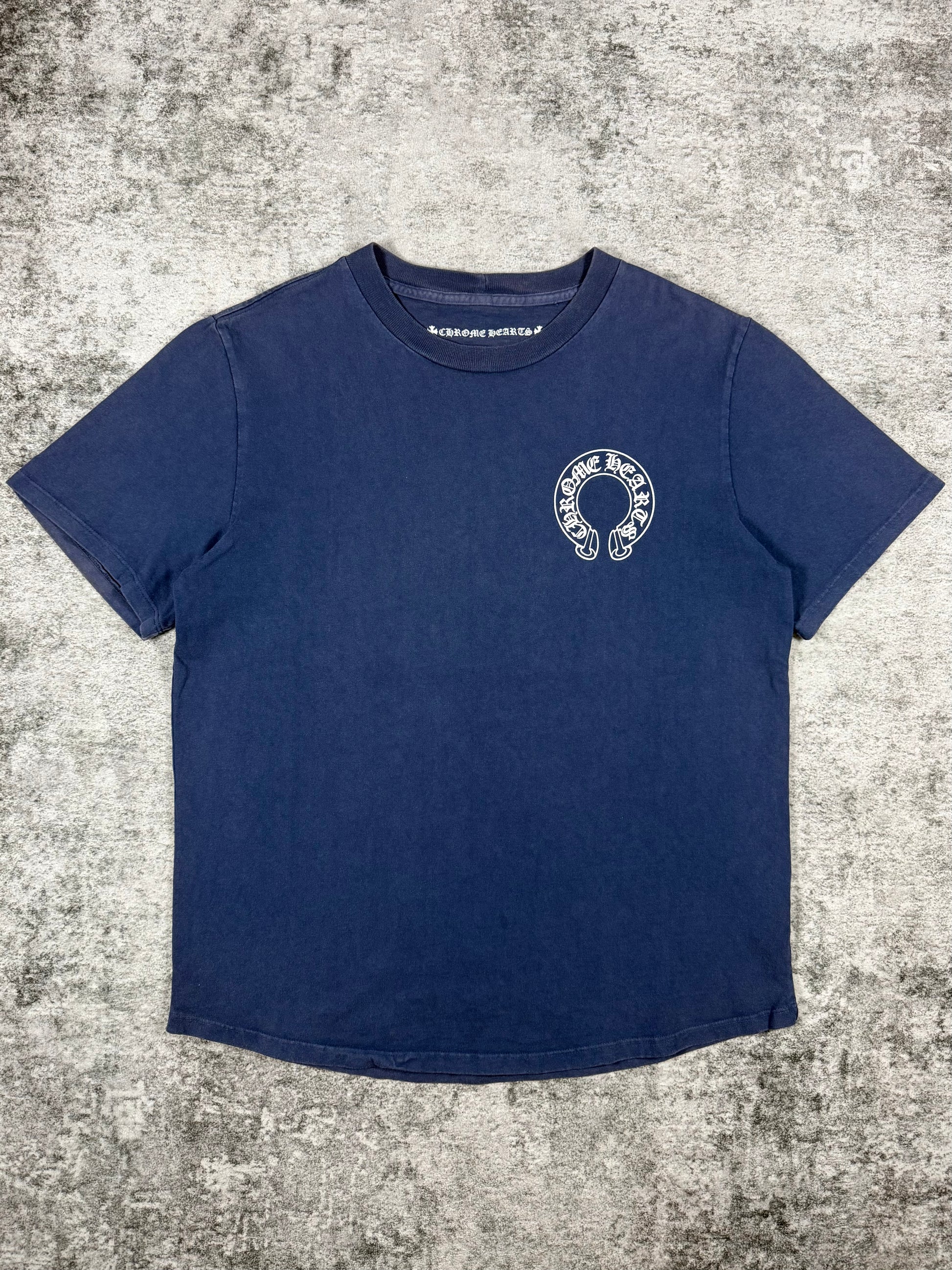 A standout Chrome Hearts Matty Boy release featuring the playful “Creative Monster” graphic contrasted against a deep navy base. The back print blends hand-drawn cartoon aesthetics with the signature Chrome Hearts logo hit, while the front keeps it minimal with a clean horseshoe chest emblem. Produced in the USA, this piece reflects the brand’s late-2010s shift into more expressive, artist-driven visuals under Matty Boy. In brilliant condition with no flaws or damages