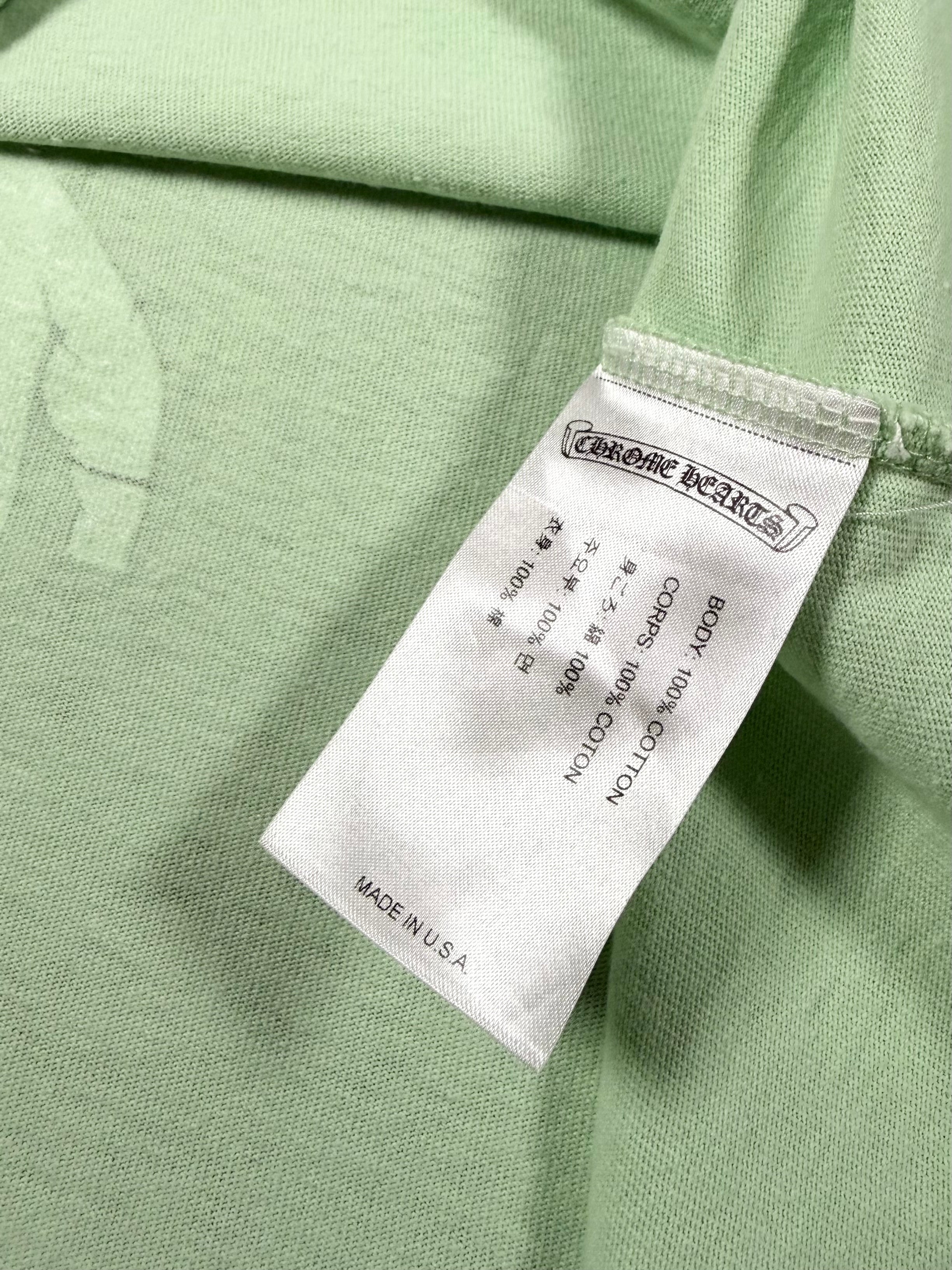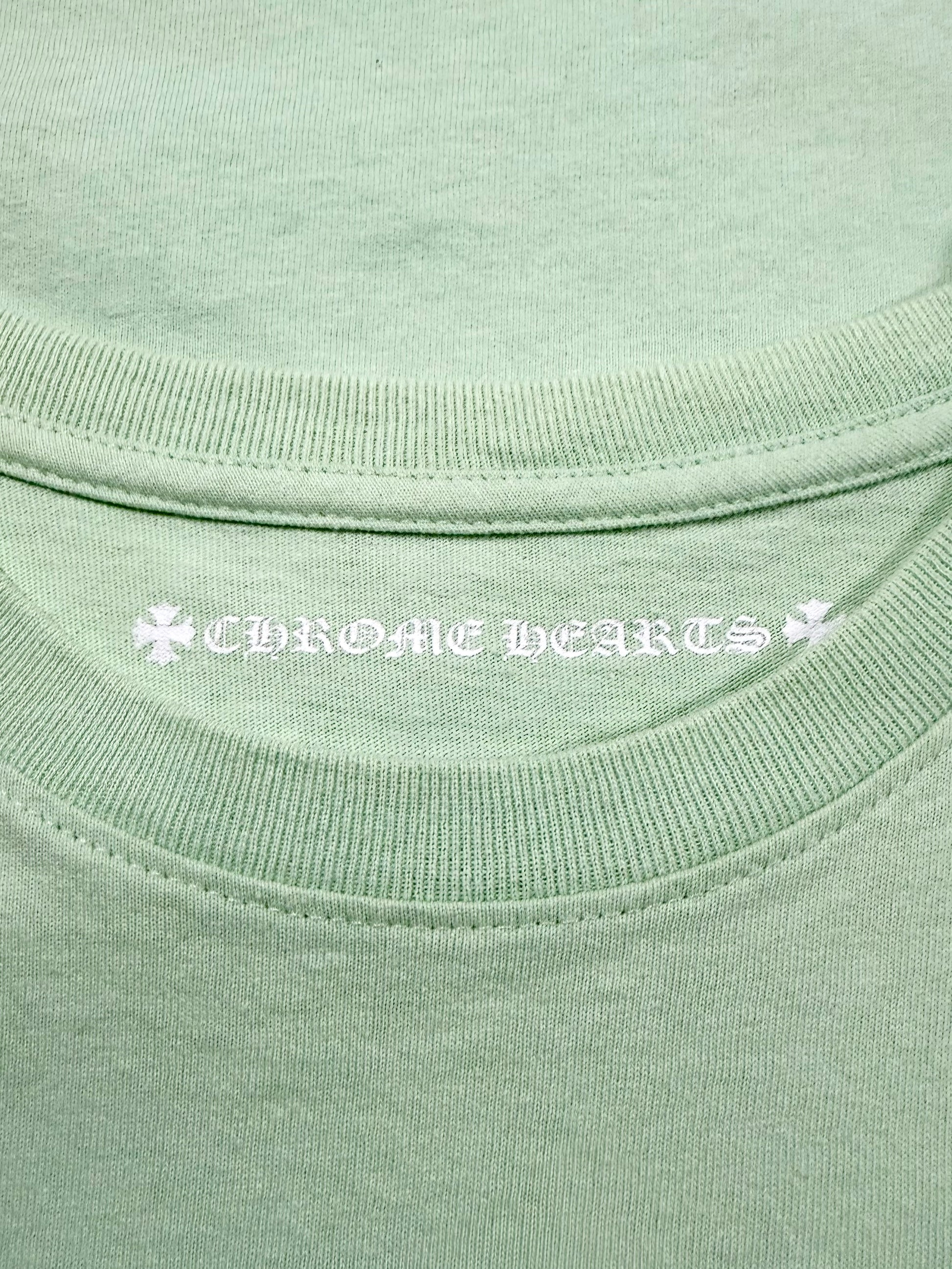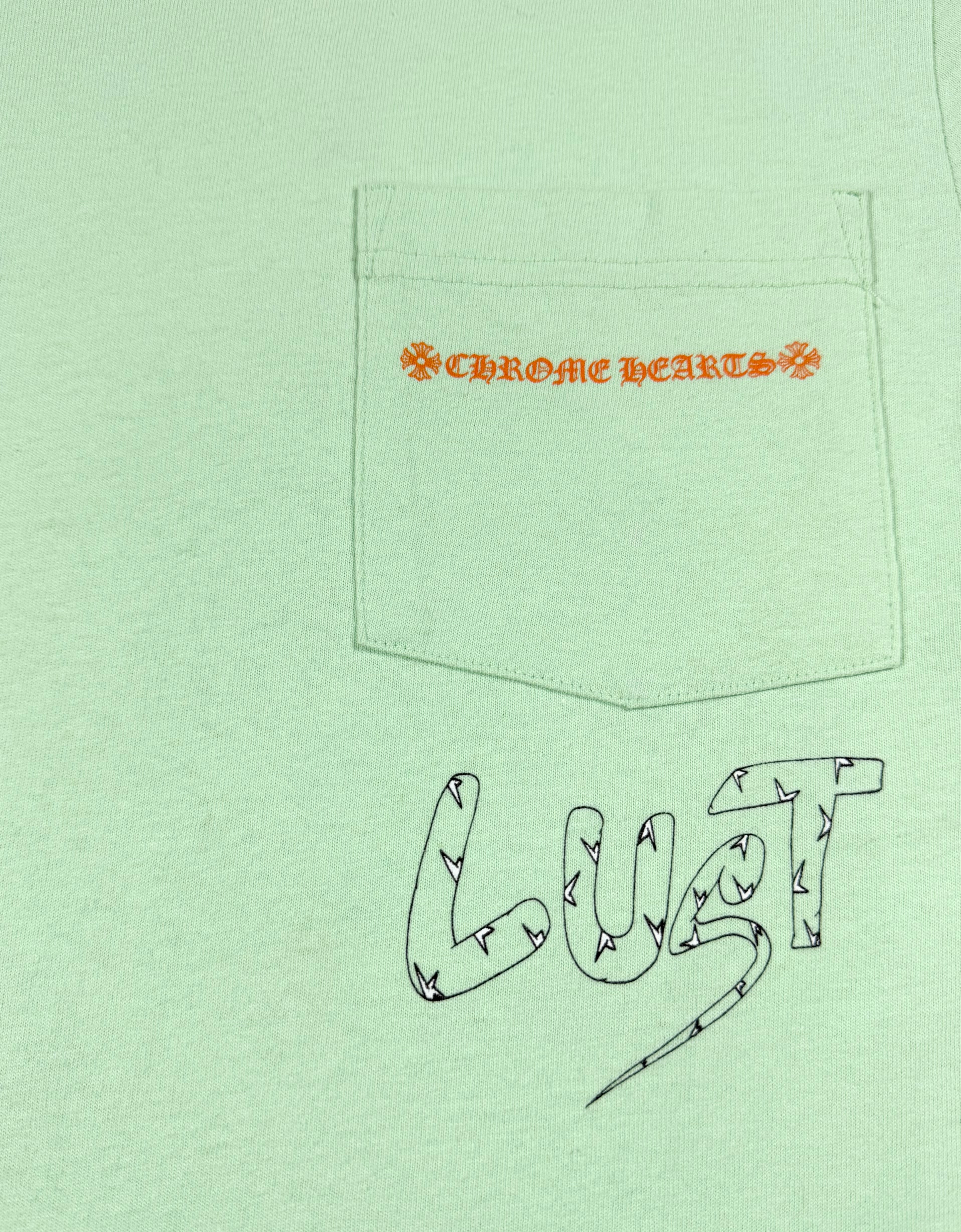 A vibrant Chrome Hearts Matty Boy release featuring the “Lust” graphic, blending surreal collage artwork with distorted cartoon elements. The mint green base contrasts sharply with the monochrome back print, while the front pocket carries a subtle Chrome Hearts logo hit and hand-drawn “Lust” script detail. In good condition with no flaws of damages.