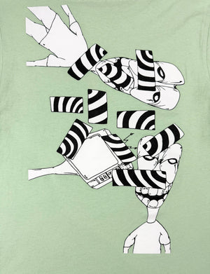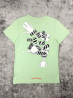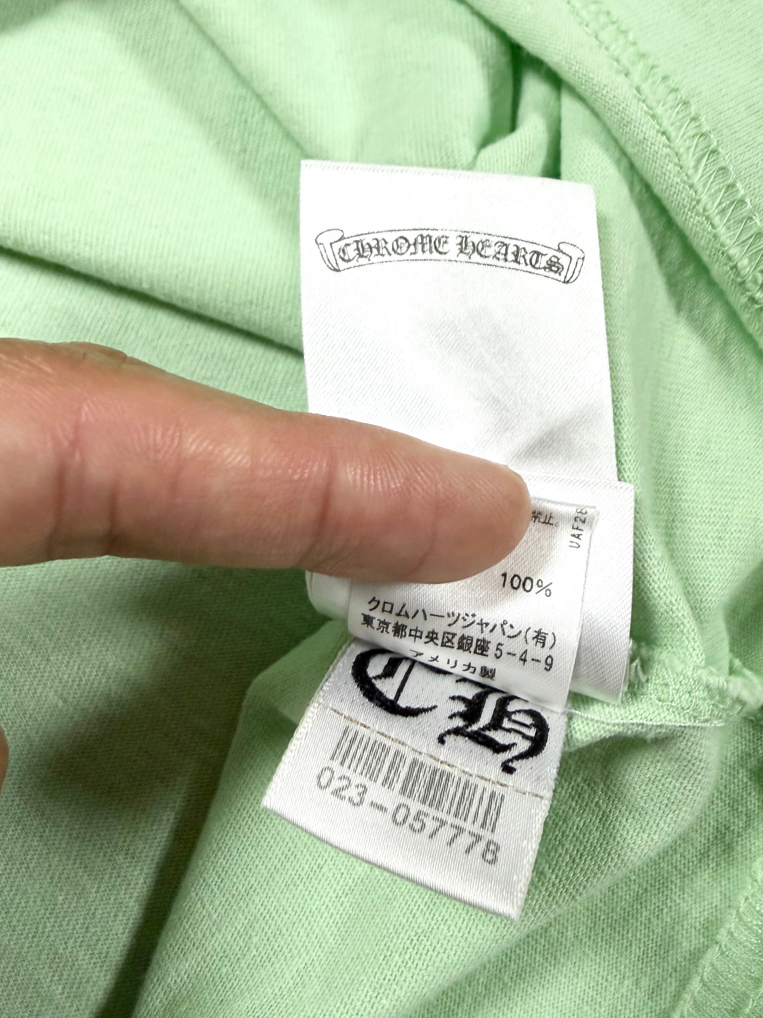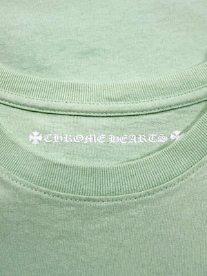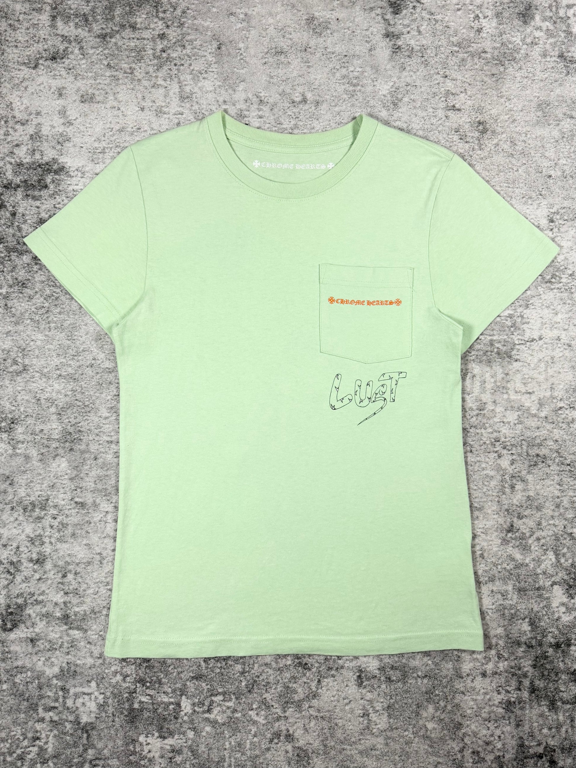 A vibrant Chrome Hearts Matty Boy release featuring the “Lust” graphic, blending surreal collage artwork with distorted cartoon elements. The mint green base contrasts sharply with the monochrome back print, while the front pocket carries a subtle Chrome Hearts logo hit and hand-drawn “Lust” script detail. In good condition with no flaws of damages.