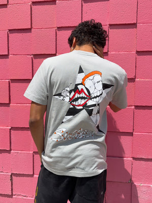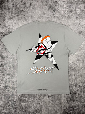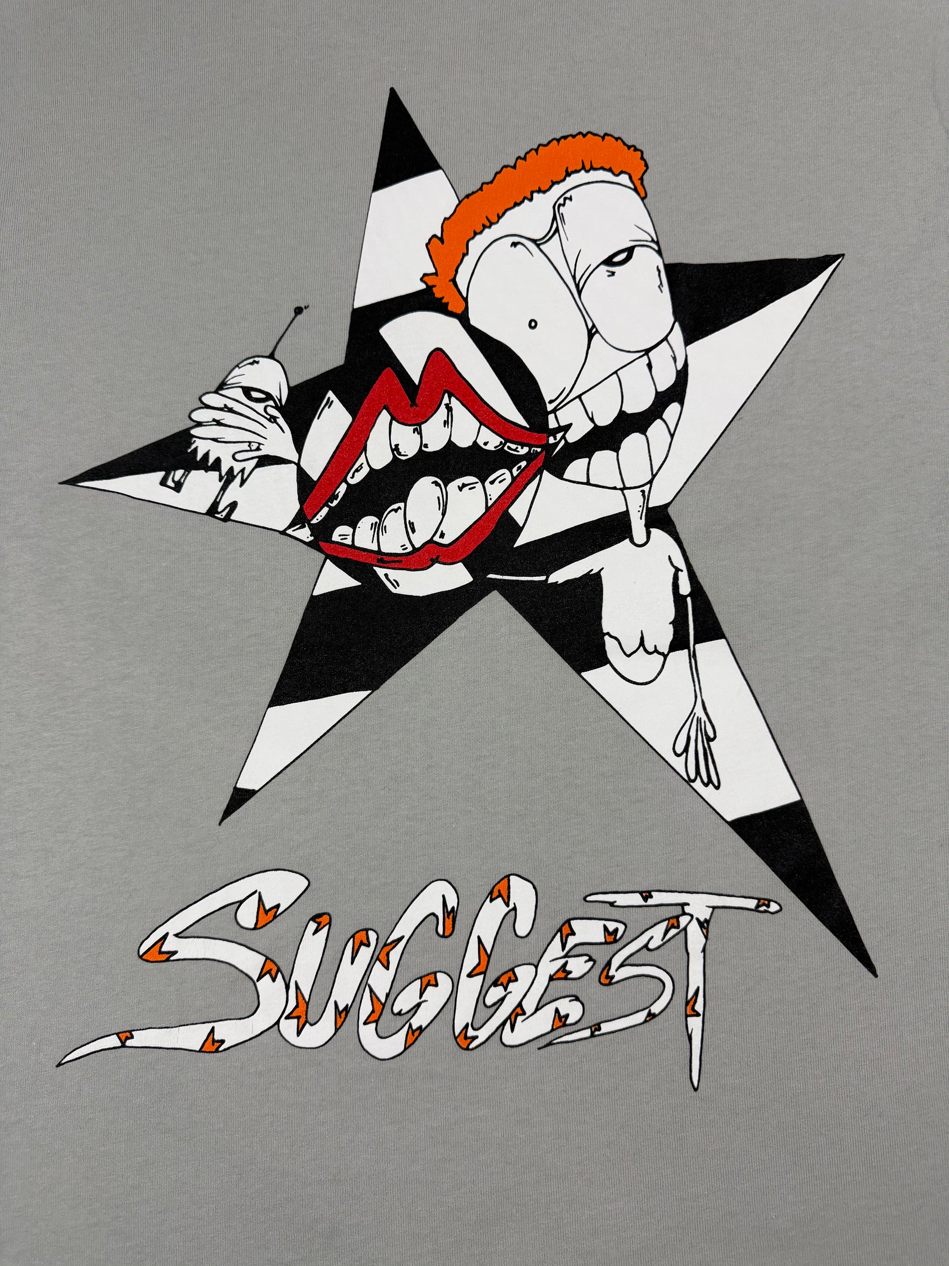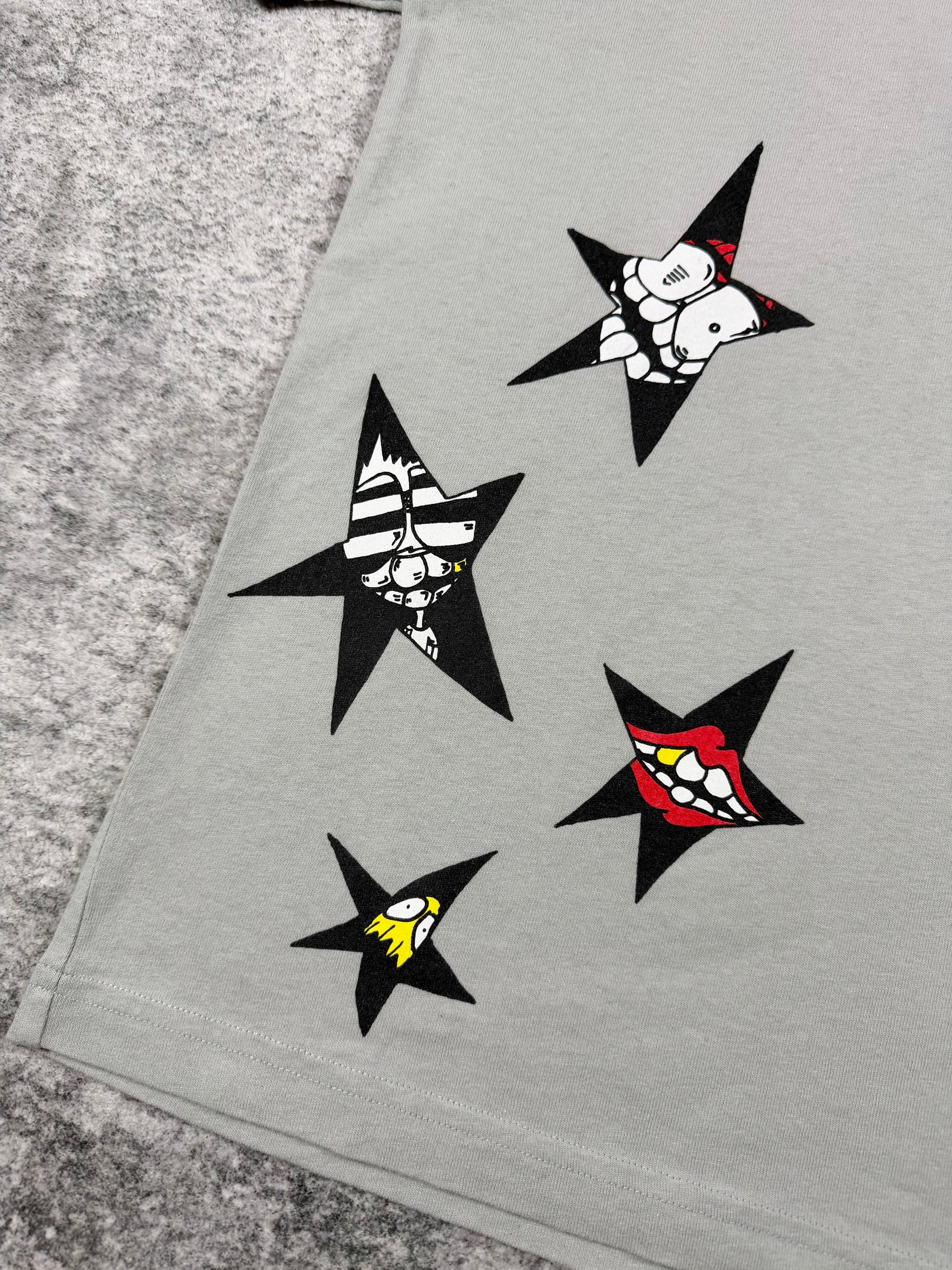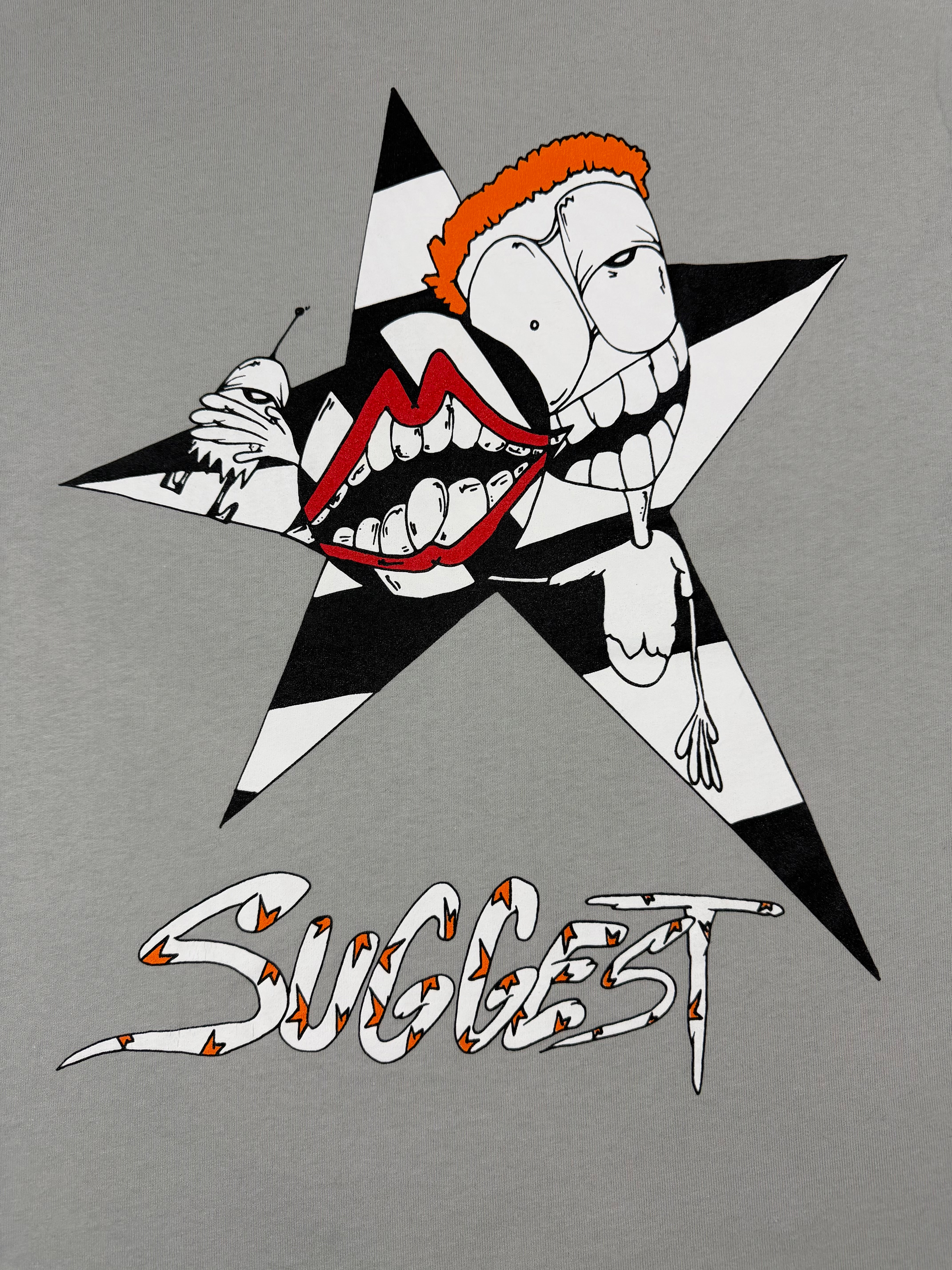 Matty Boy piece featuring the “Suggest” graphic, combining fragmented cartoon visuals within bold star motifs. The light grey base allows the black star shapes and vivid character details to stand out, while the back showcases a larger composition anchored by the signature Matty Boy aesthetic. Finished with a subtle chest pocket logo. In good condition with very minimal flaws (small marks on sleeve)