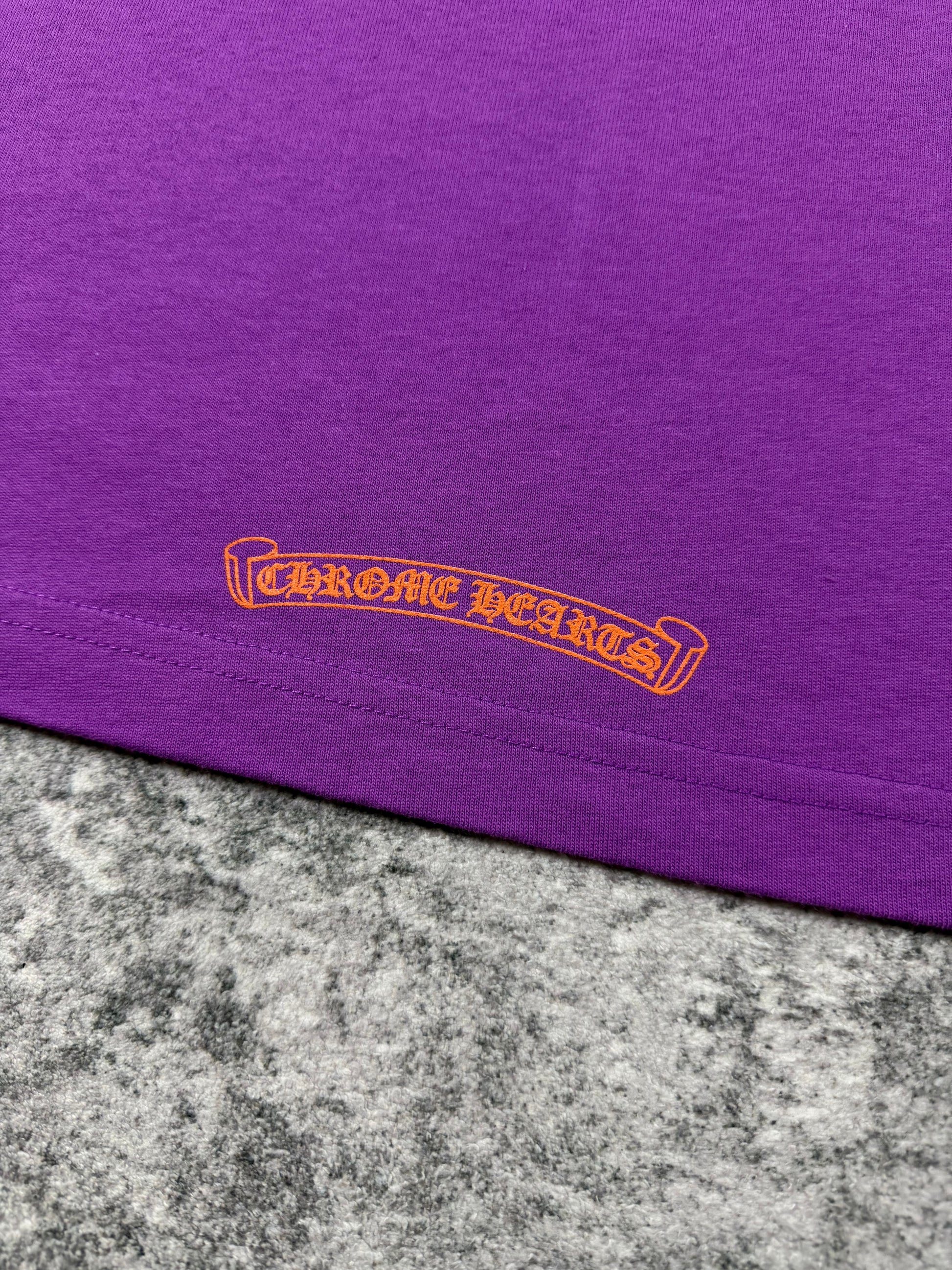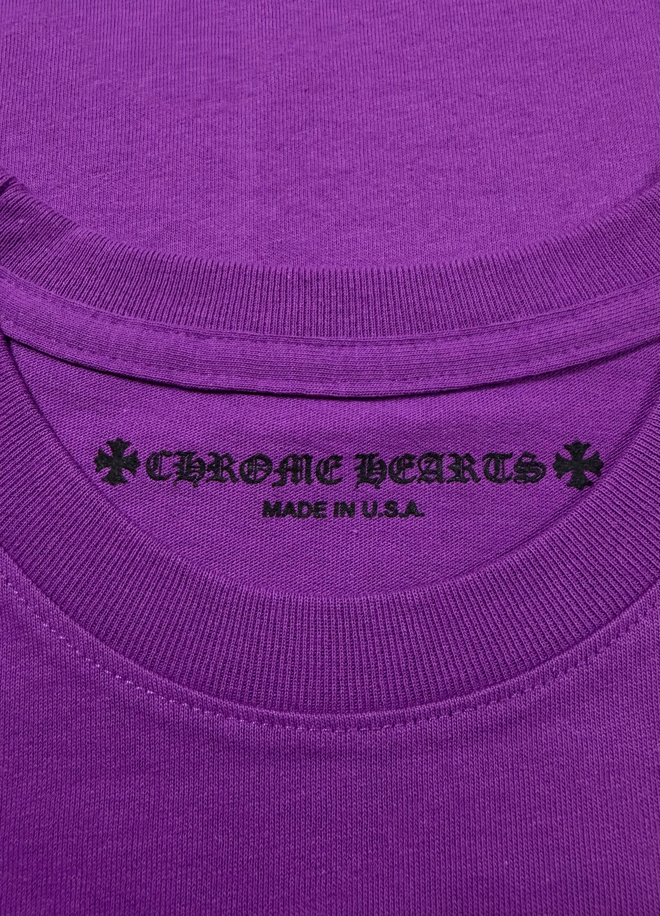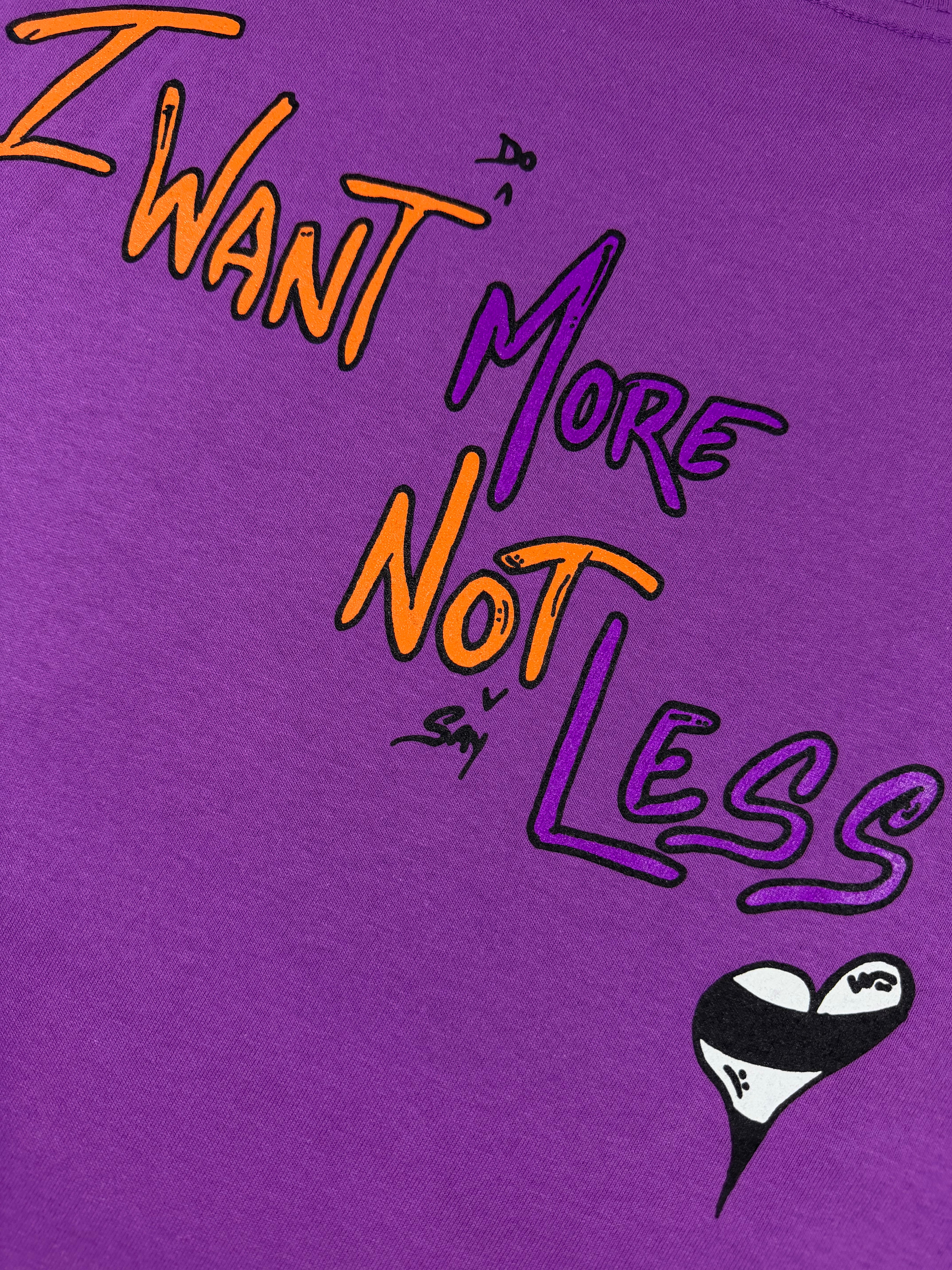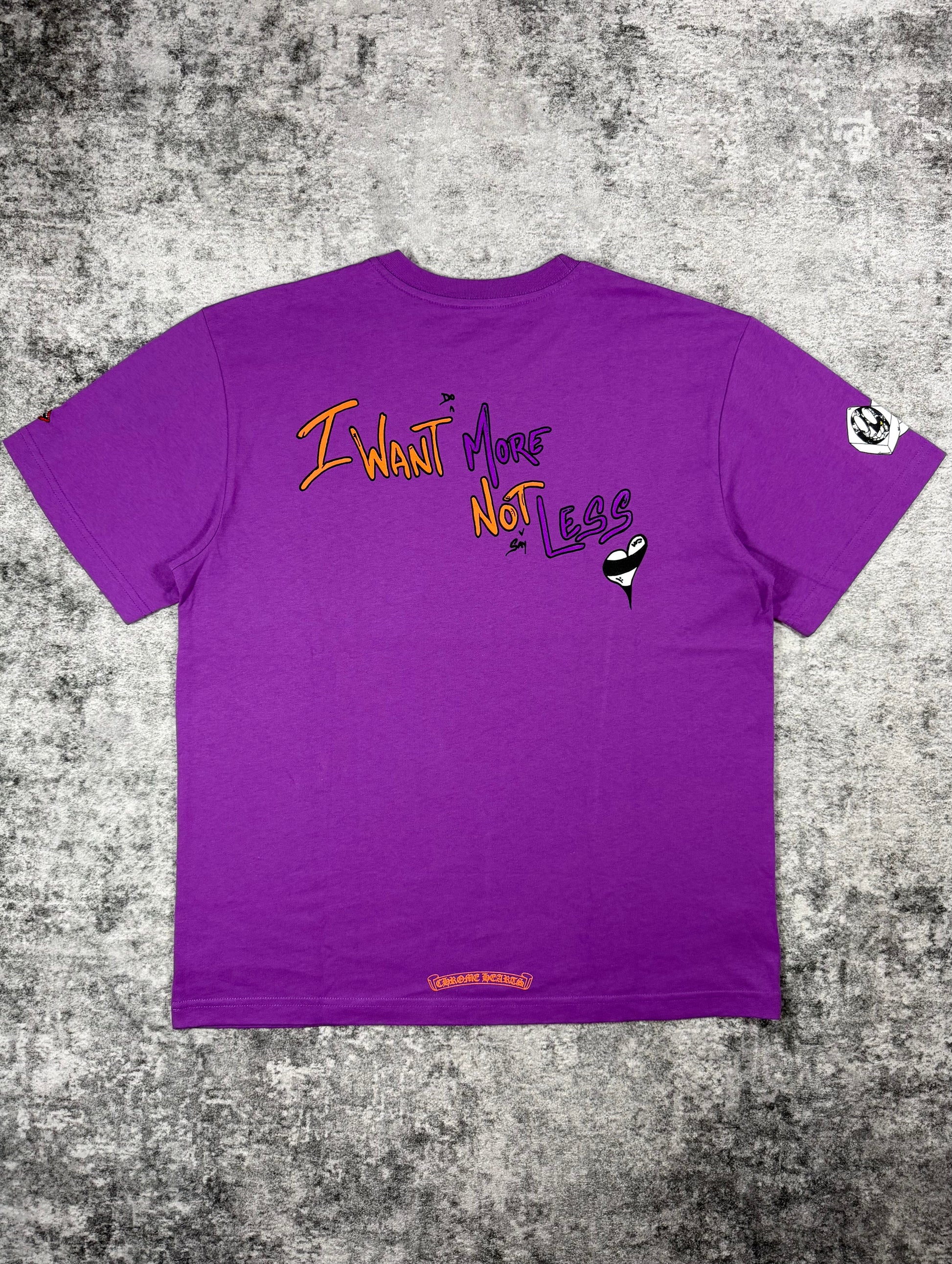 A bold Chrome Hearts Matty Boy piece featuring the expressive “Want More Not Less” slogan rendered in vibrant contrasting tones across the back. The rich purple base elevates the playful typography, while the front remains clean with a subtle pocket logo and complementary script detail; dice logo on the right sleeve. A standout collectible that merges Chrome Hearts’ identity with energetic, contemporary street-art expression.