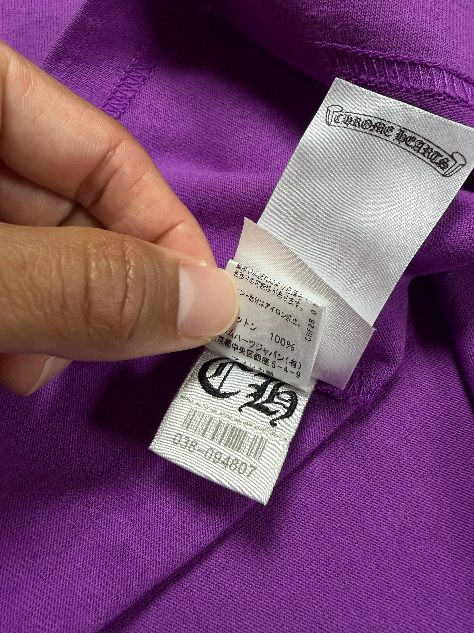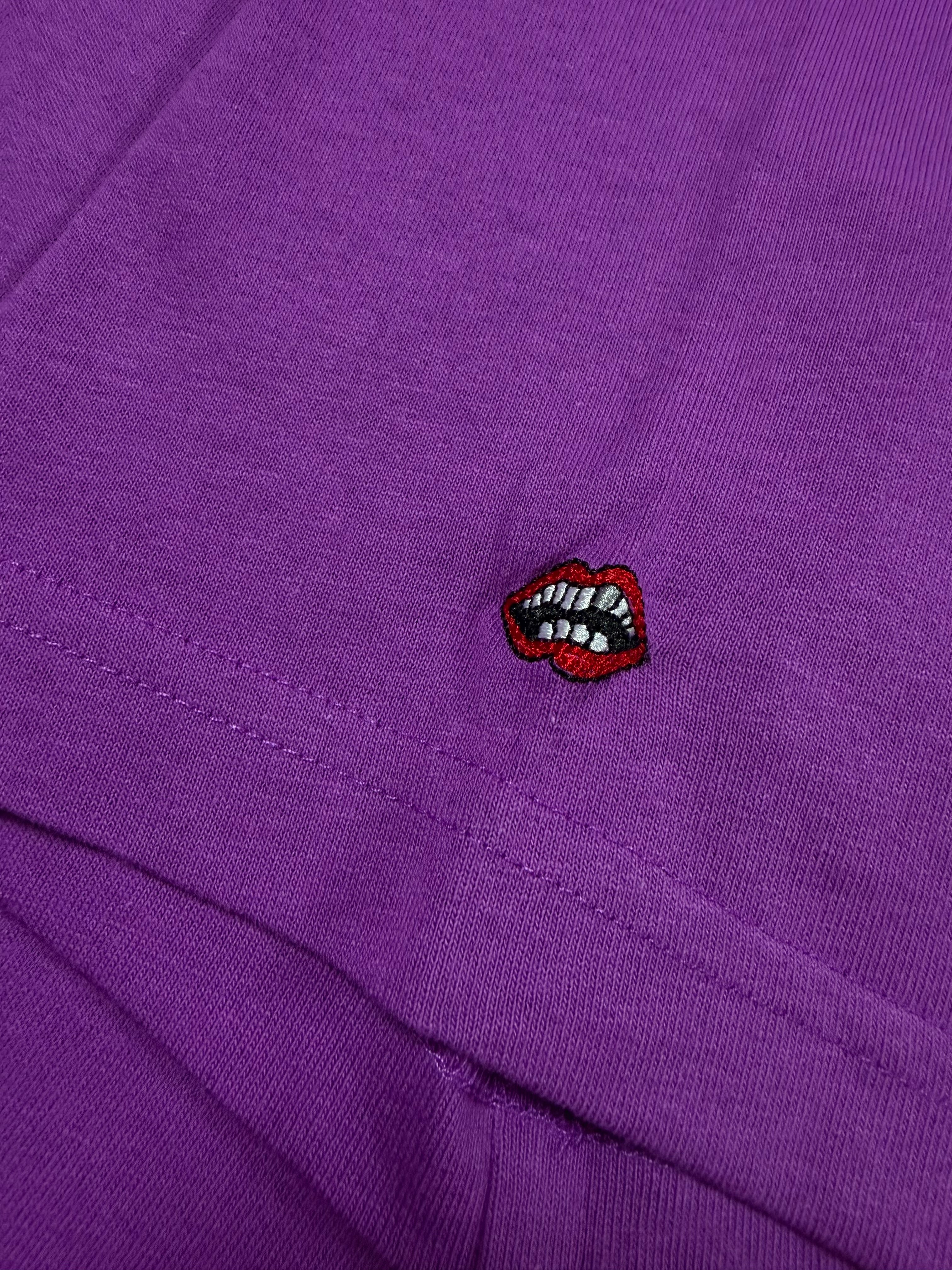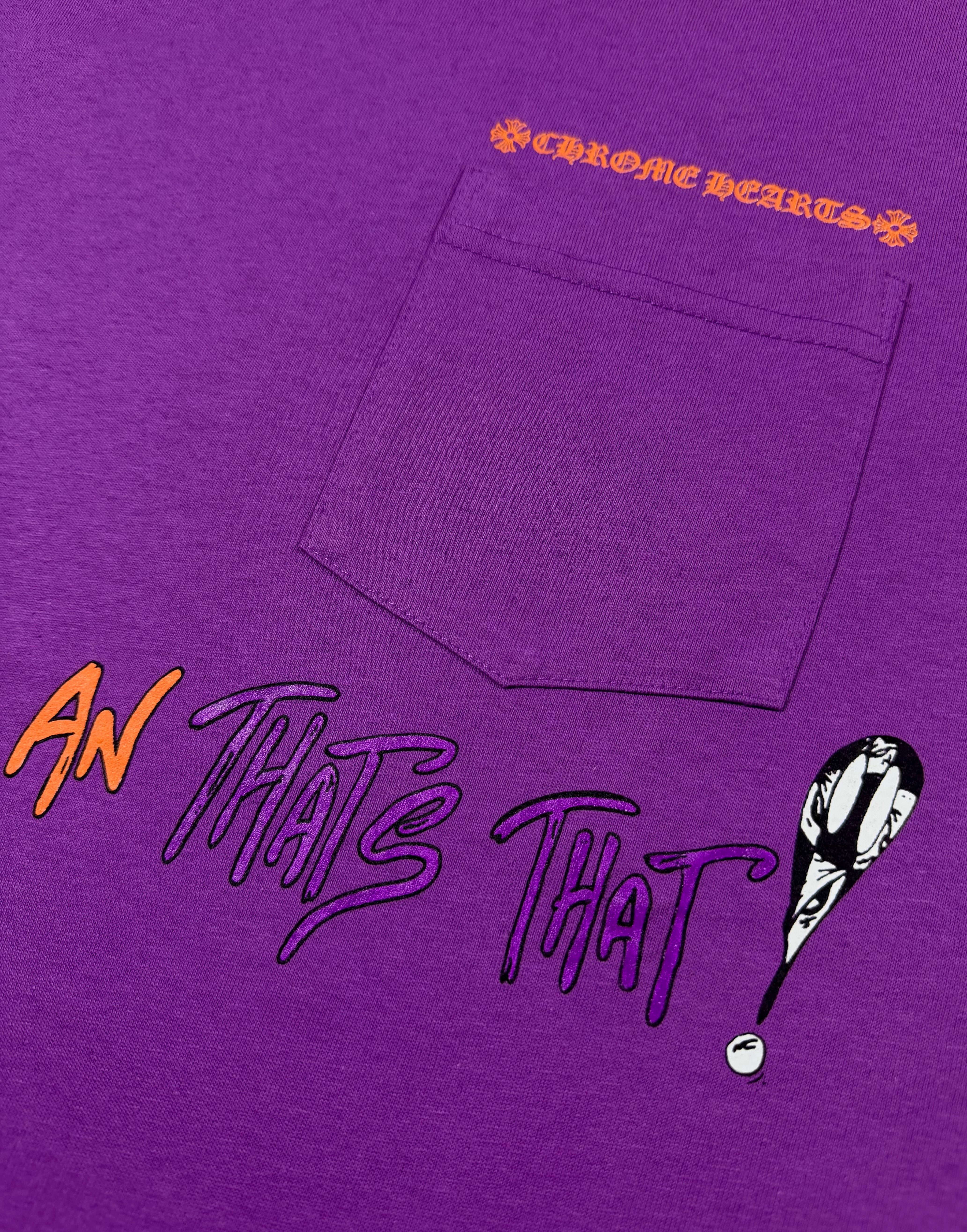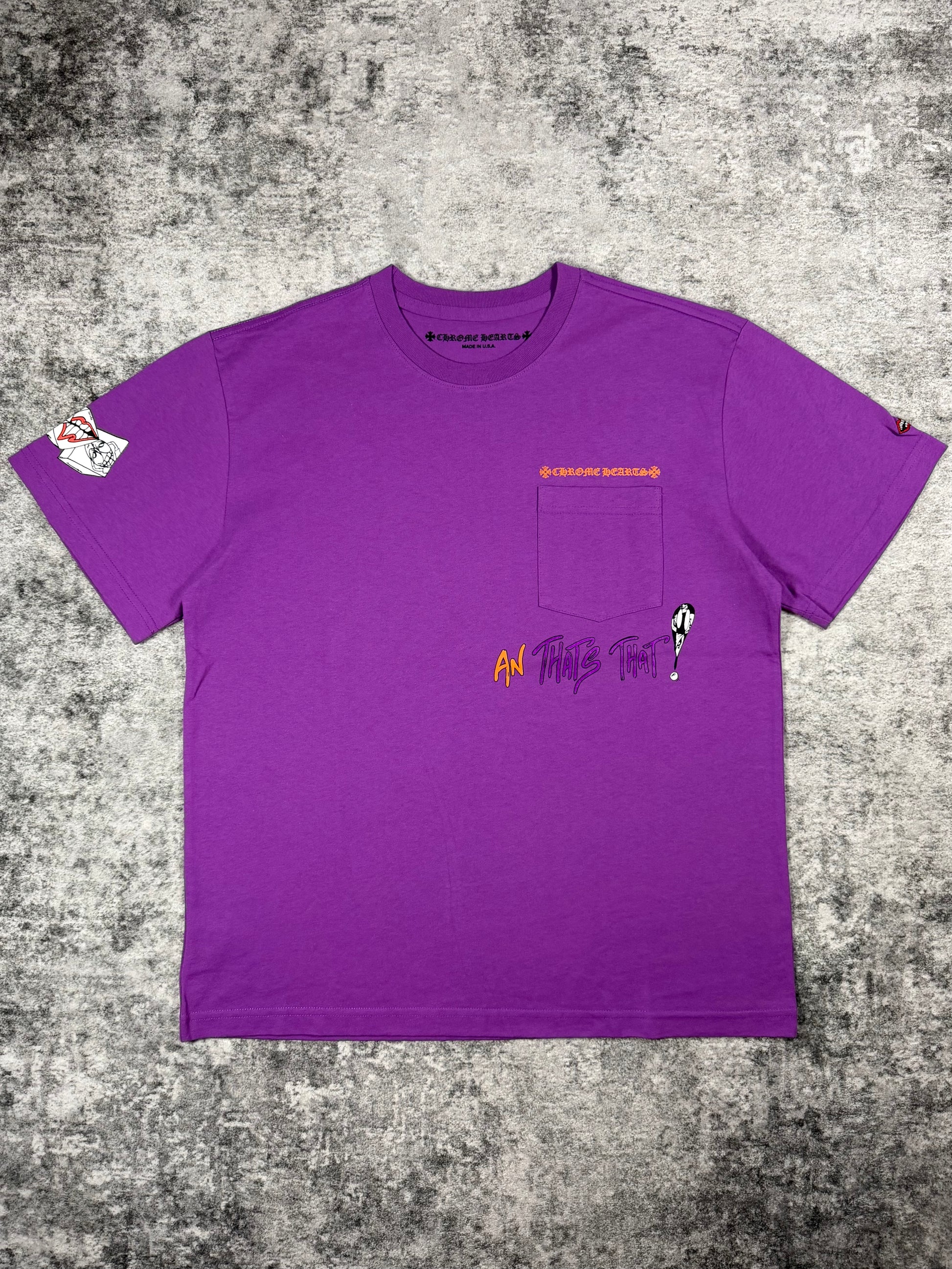 A bold Chrome Hearts Matty Boy piece featuring the expressive “Want More Not Less” slogan rendered in vibrant contrasting tones across the back. The rich purple base elevates the playful typography, while the front remains clean with a subtle pocket logo and complementary script detail; dice logo on the right sleeve. A standout collectible that merges Chrome Hearts’ identity with energetic, contemporary street-art expression.