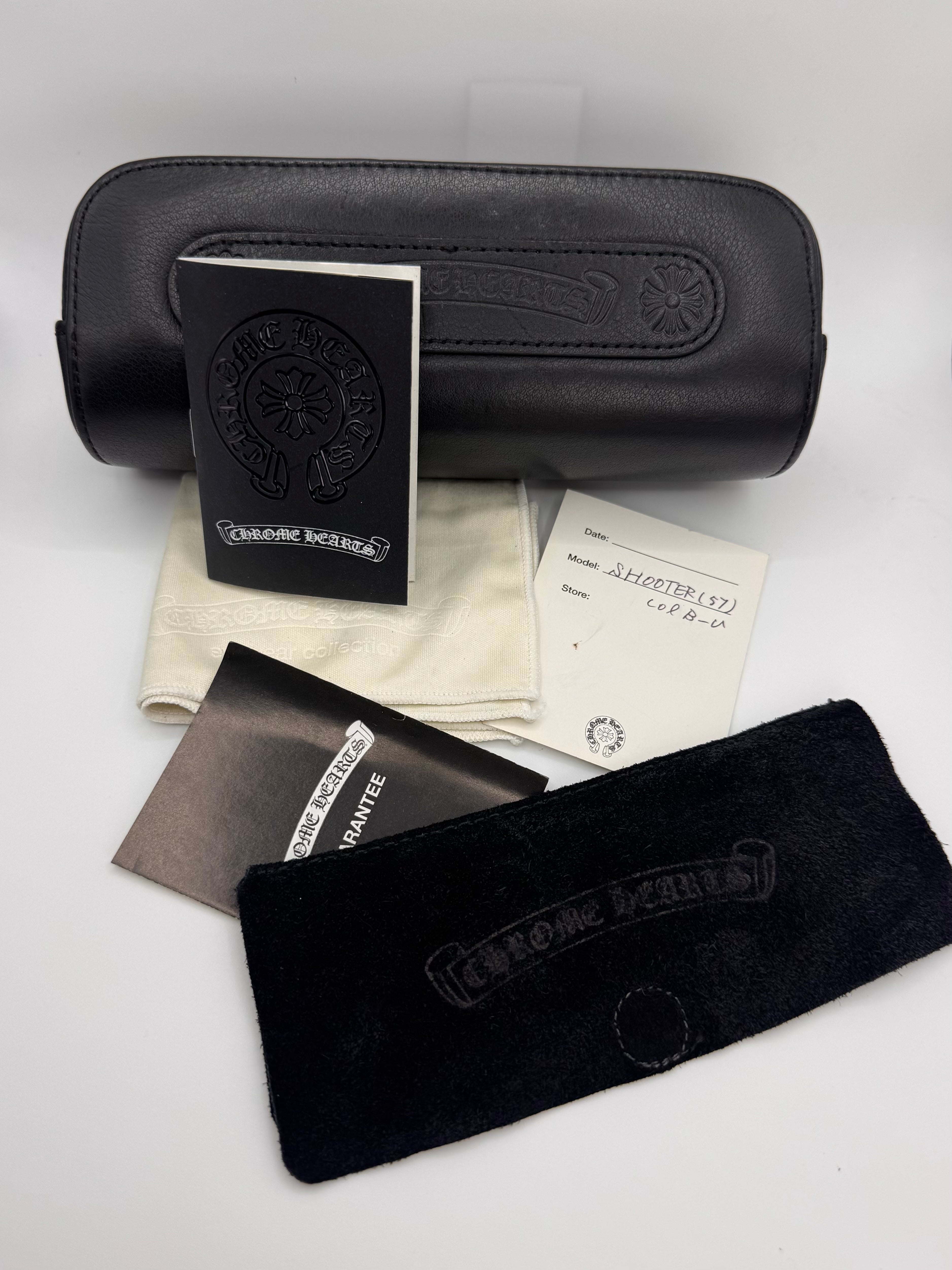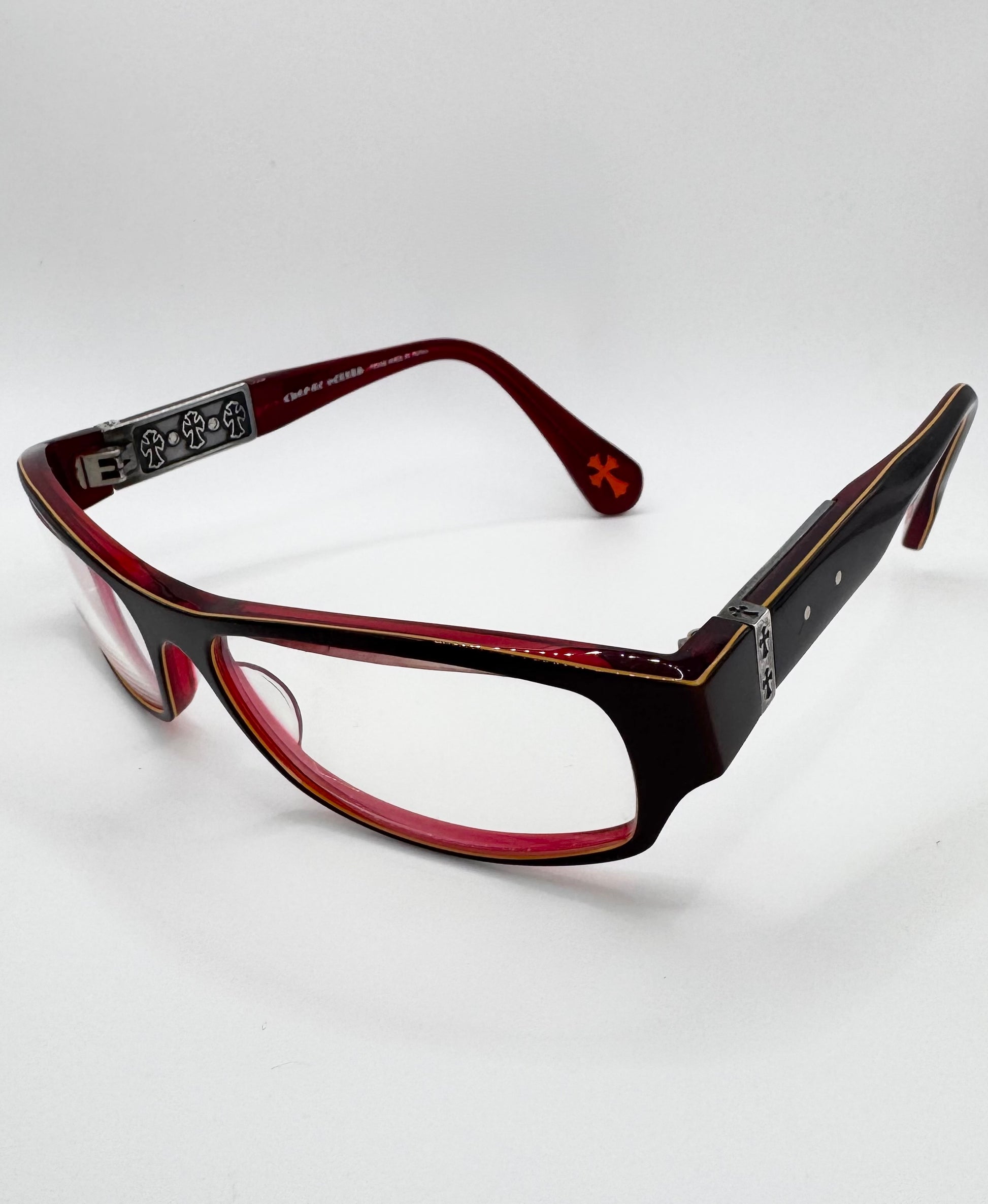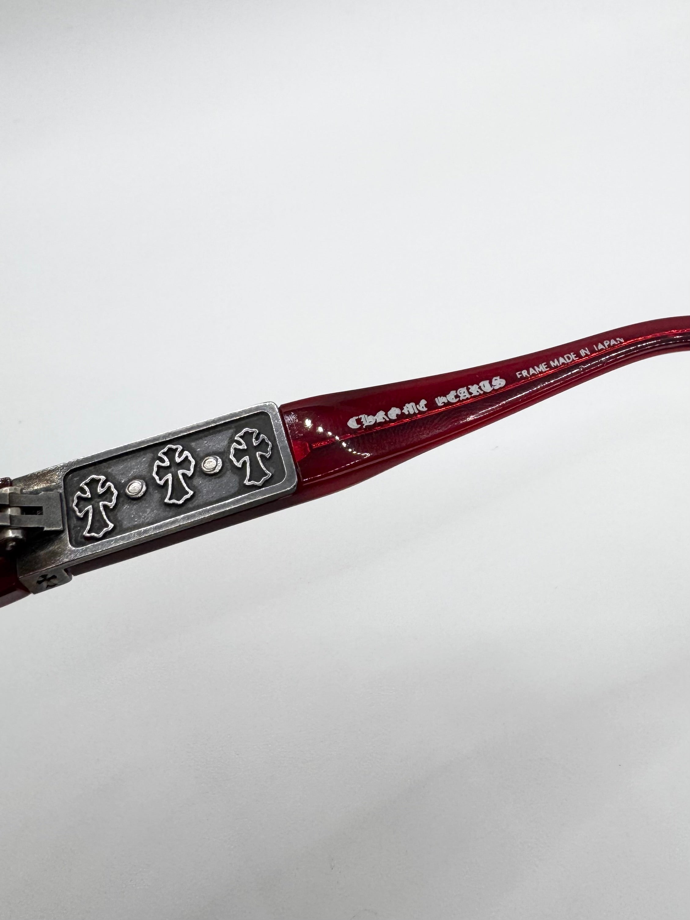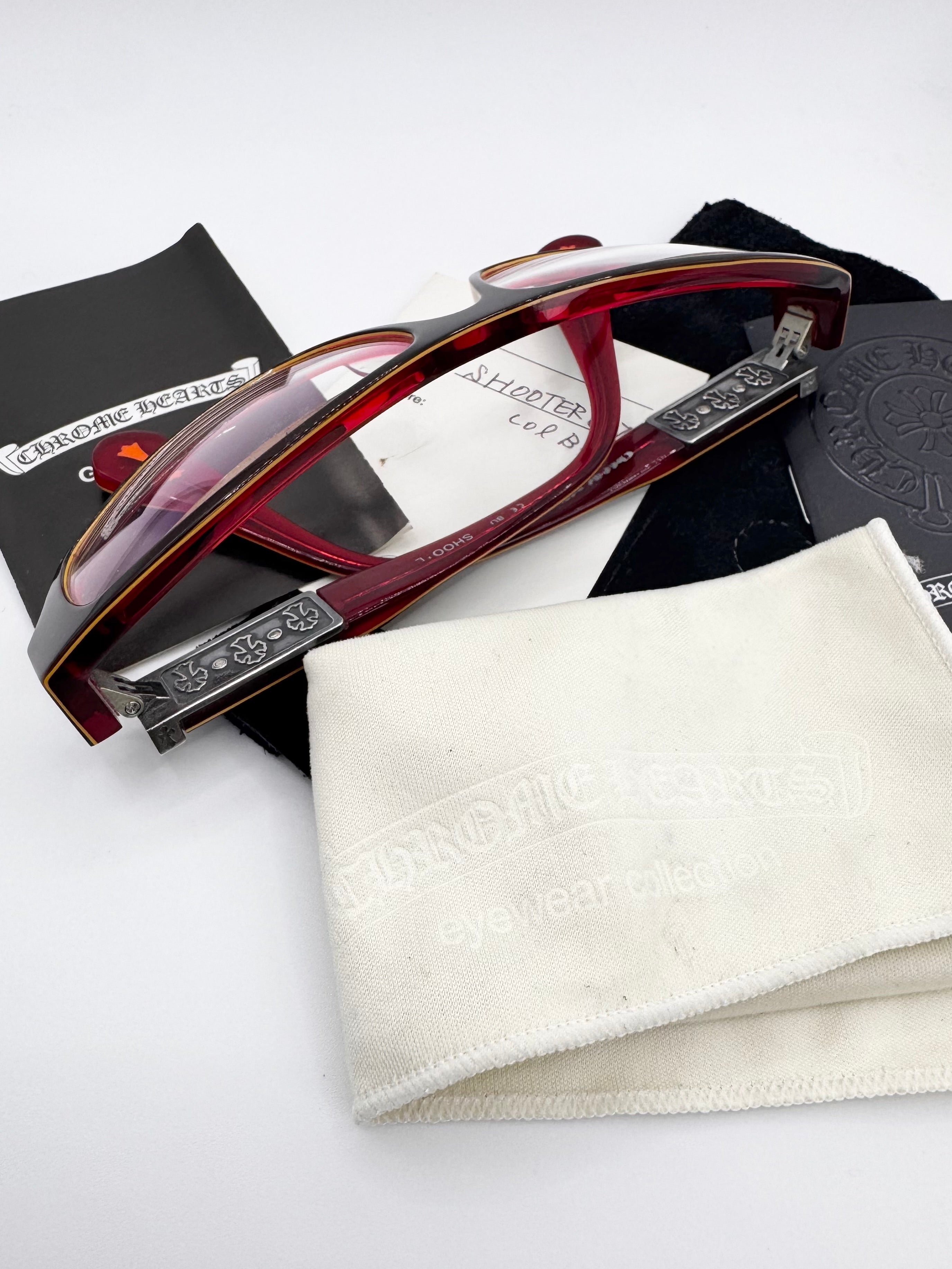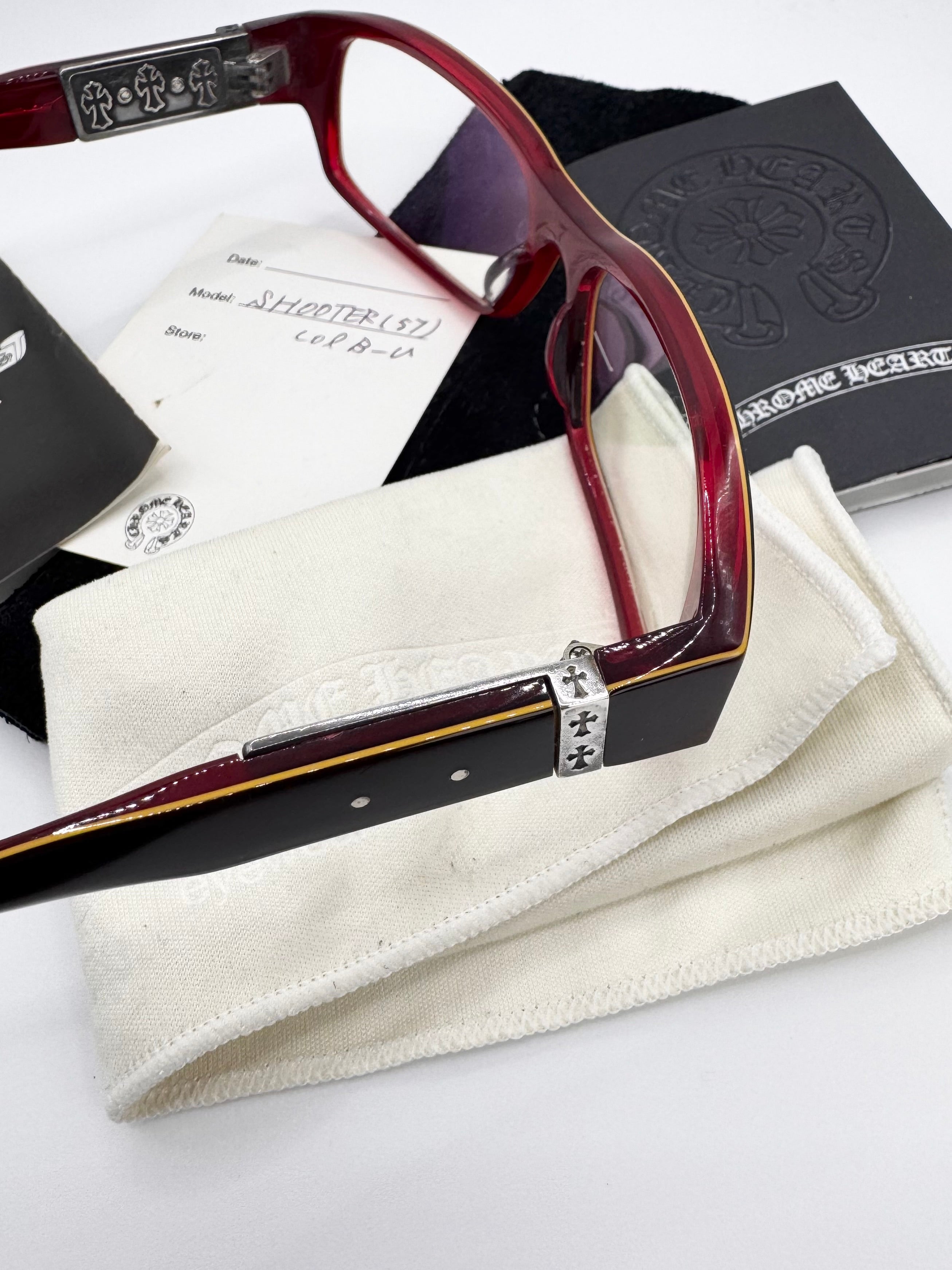 Showcased is an absolutely stunning pair of Chrome Hearts frames in the ‘Shooter’ silhouette coming in a lava red color. Features the signature triple cemetery cross detailing on the inner temple as well as the exterior. Orange cross at the top both on the inner and outer. The lens aren’t prescribed, comes with everything from purchase including the Chrome hearts glass cover, cleaning wipe, guarantee card, and the signature leather case . In brilliant condition with no major flaws, maintains great quality (arm slightly misaligned)