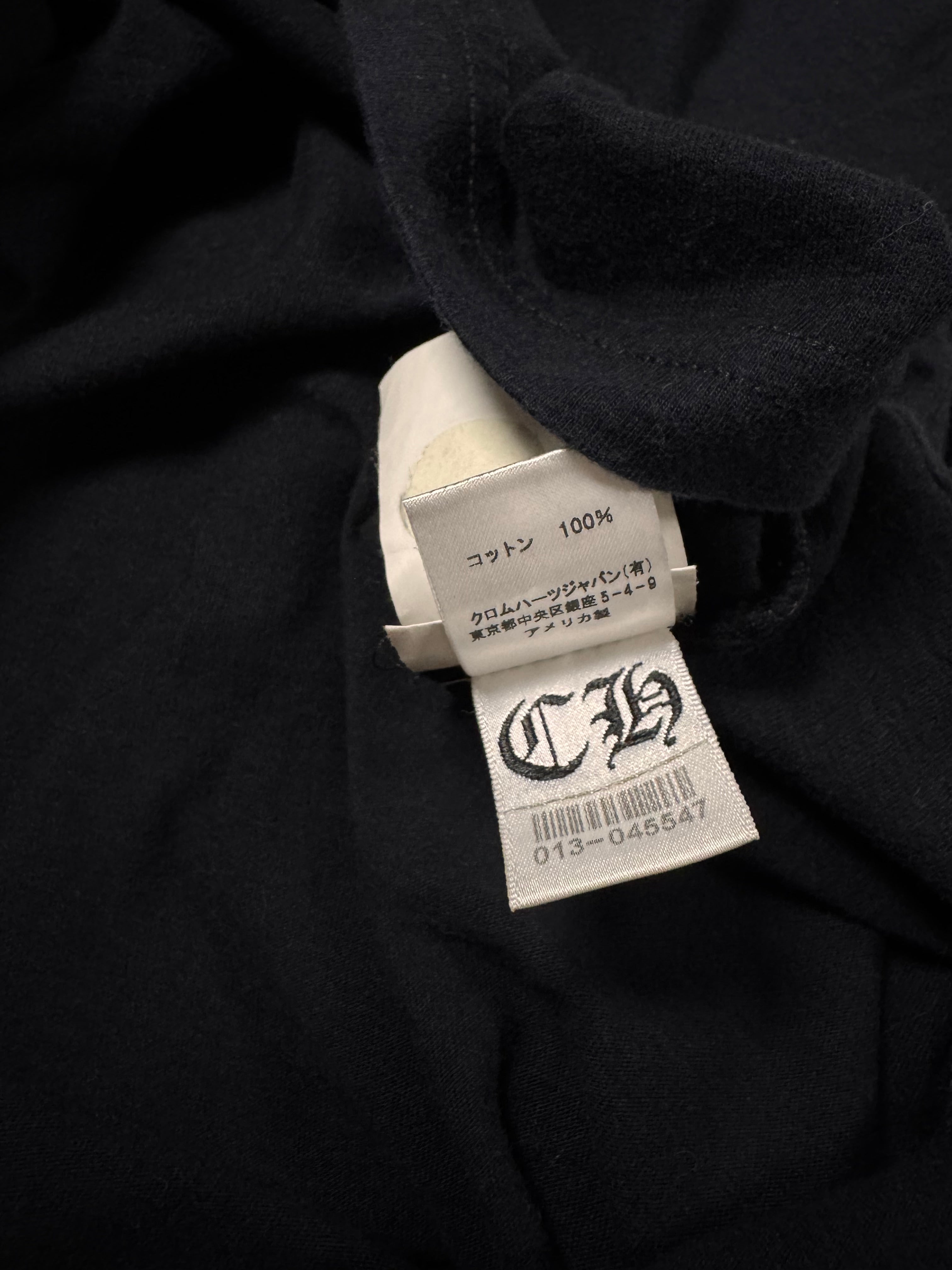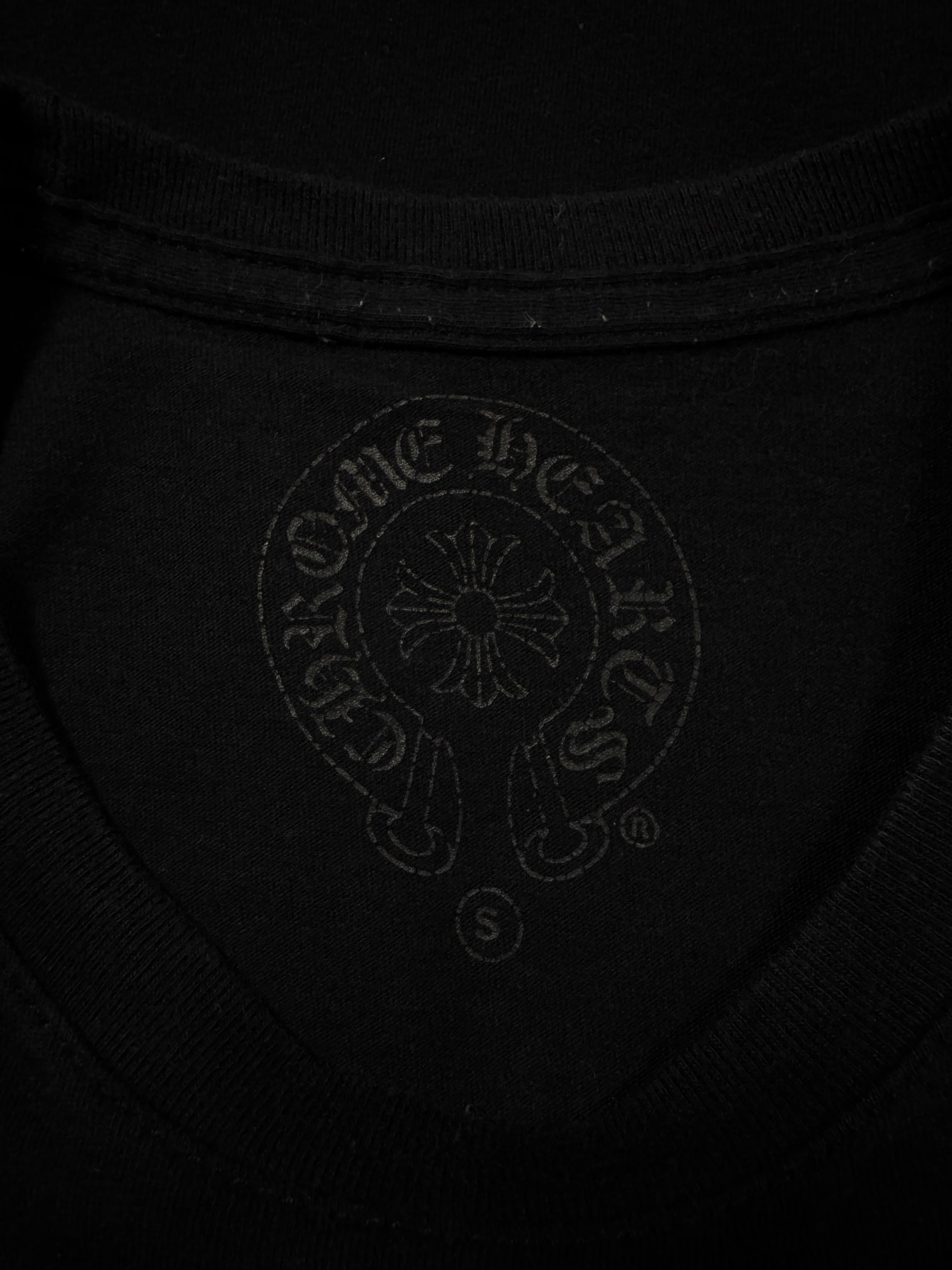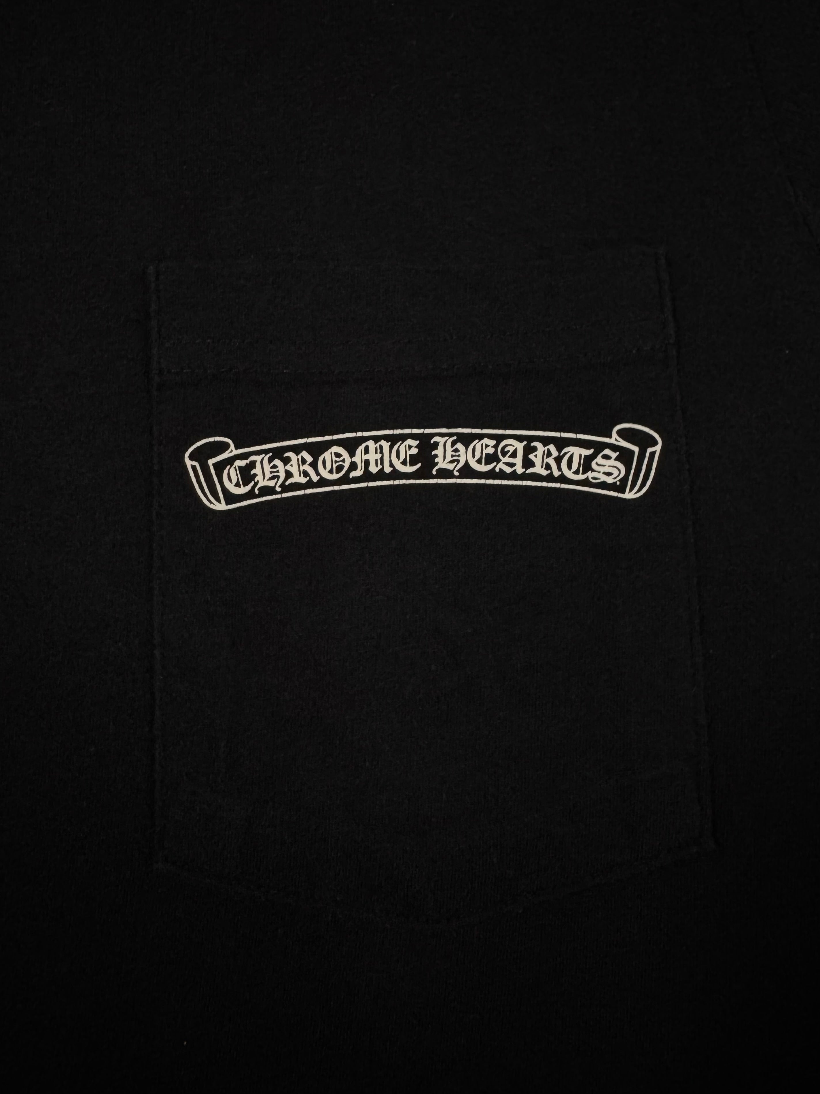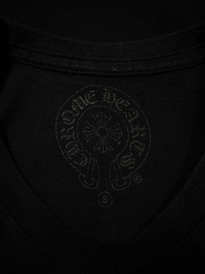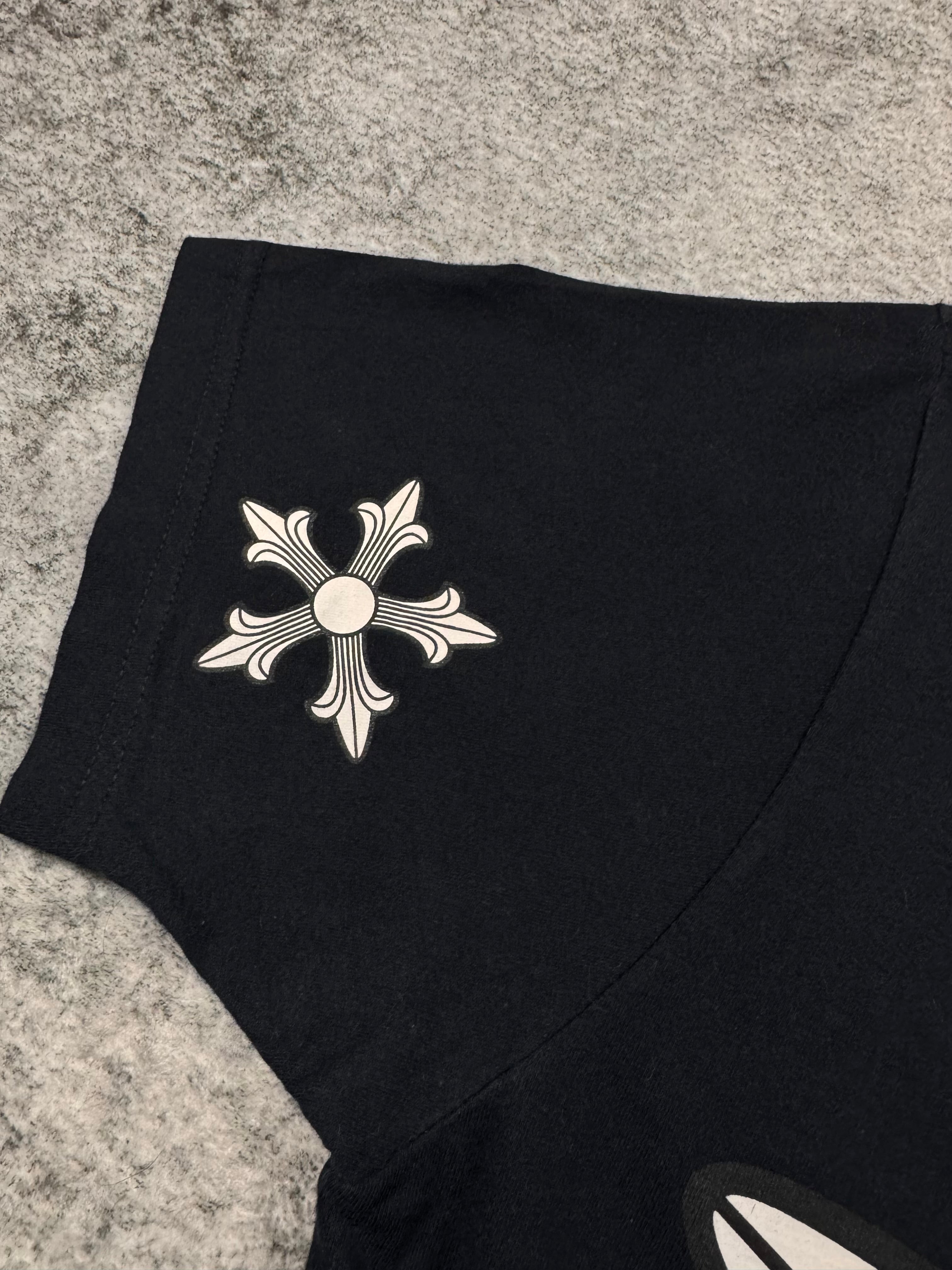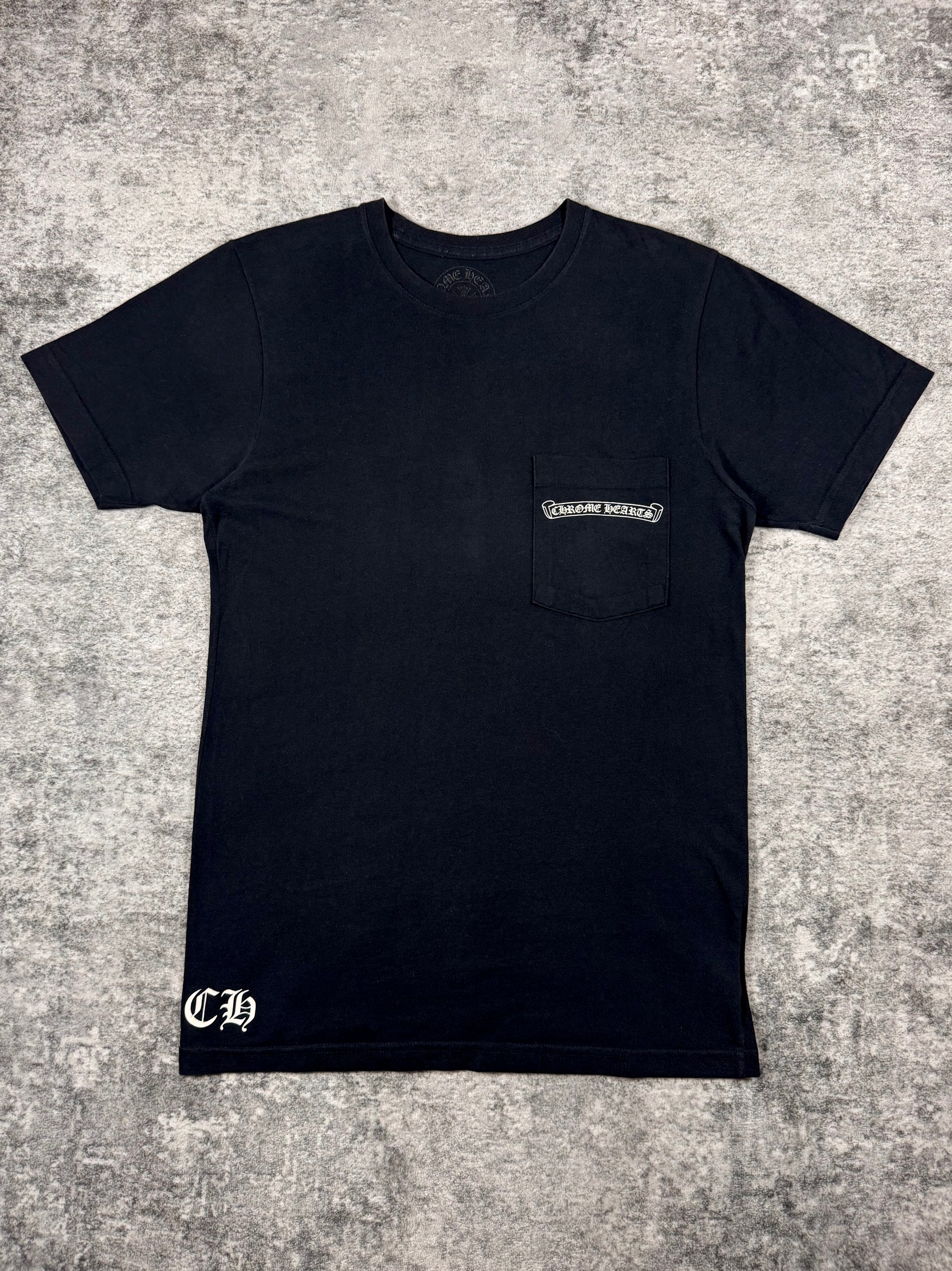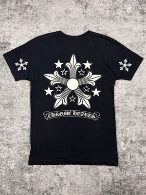 Chrome Hearts black short t shirt featuring a bold multi-cross graphic across the back, flanked by star detailing and finished with Chrome Hearts script branding. The front is kept minimal with a chest pocket bearing the brand’s logo, complemented by cross motifs printed on both sleeves and a subtle “CH” hit near the hem. In brilliant condition with no flaws or damages