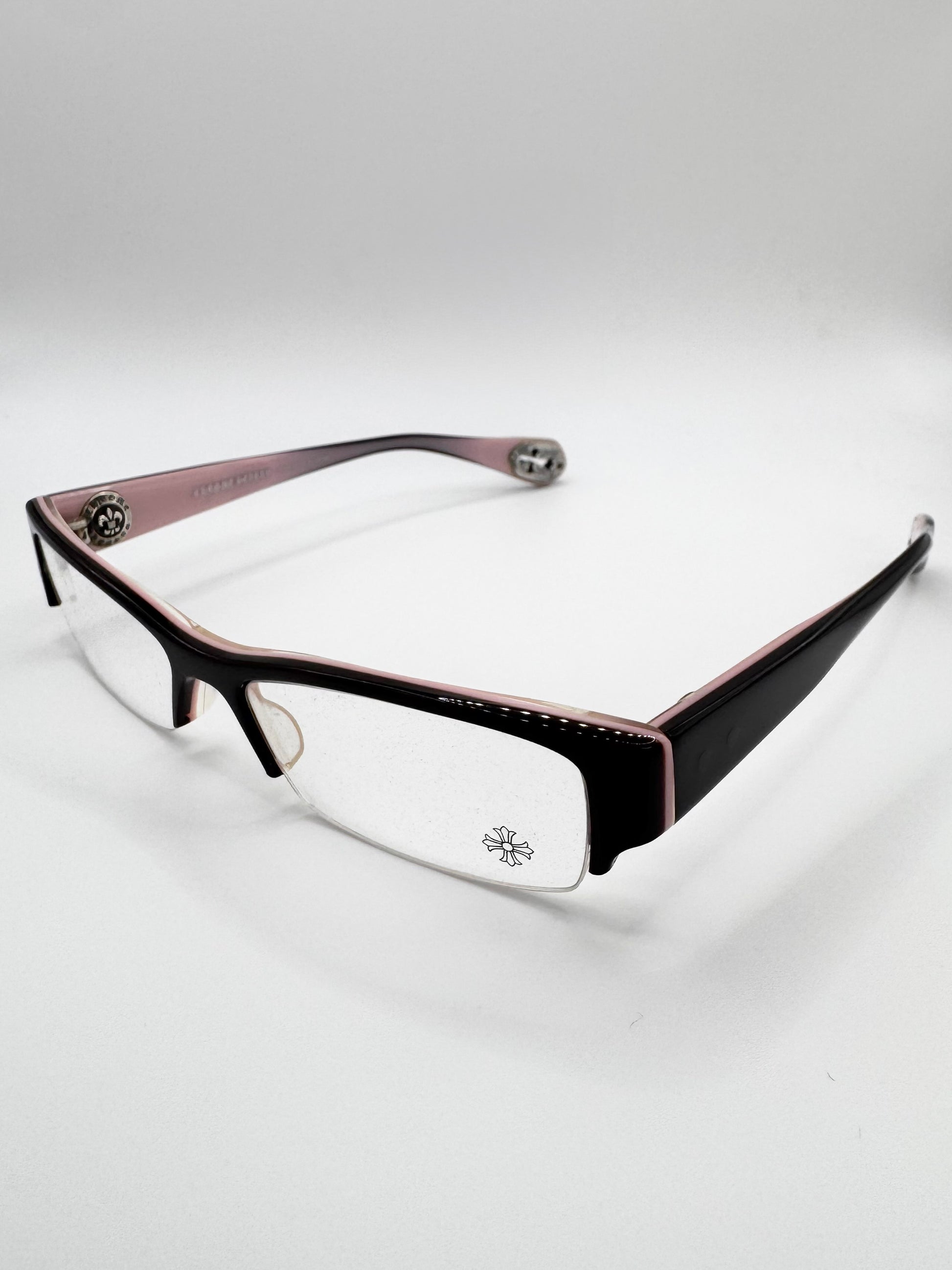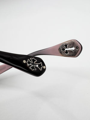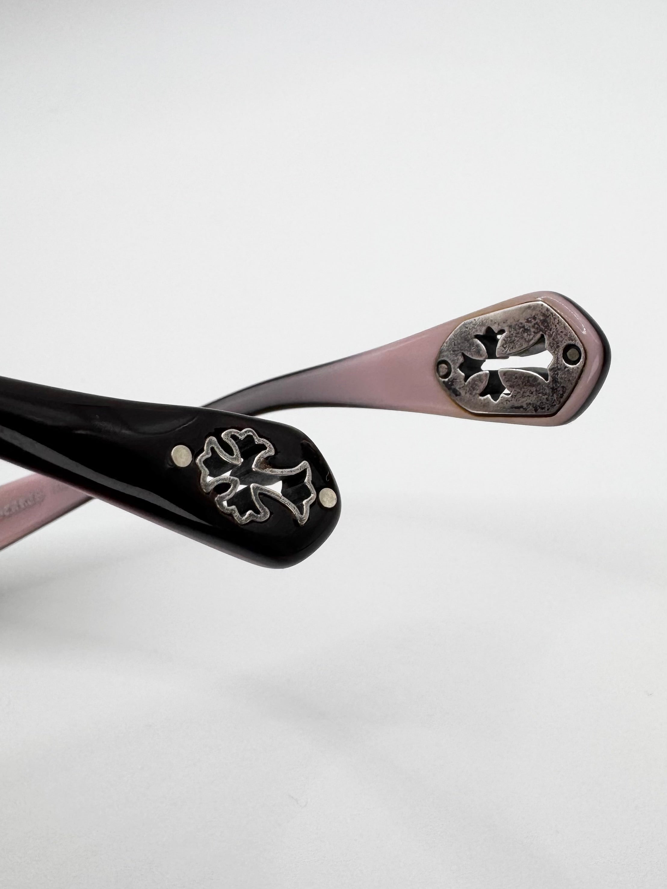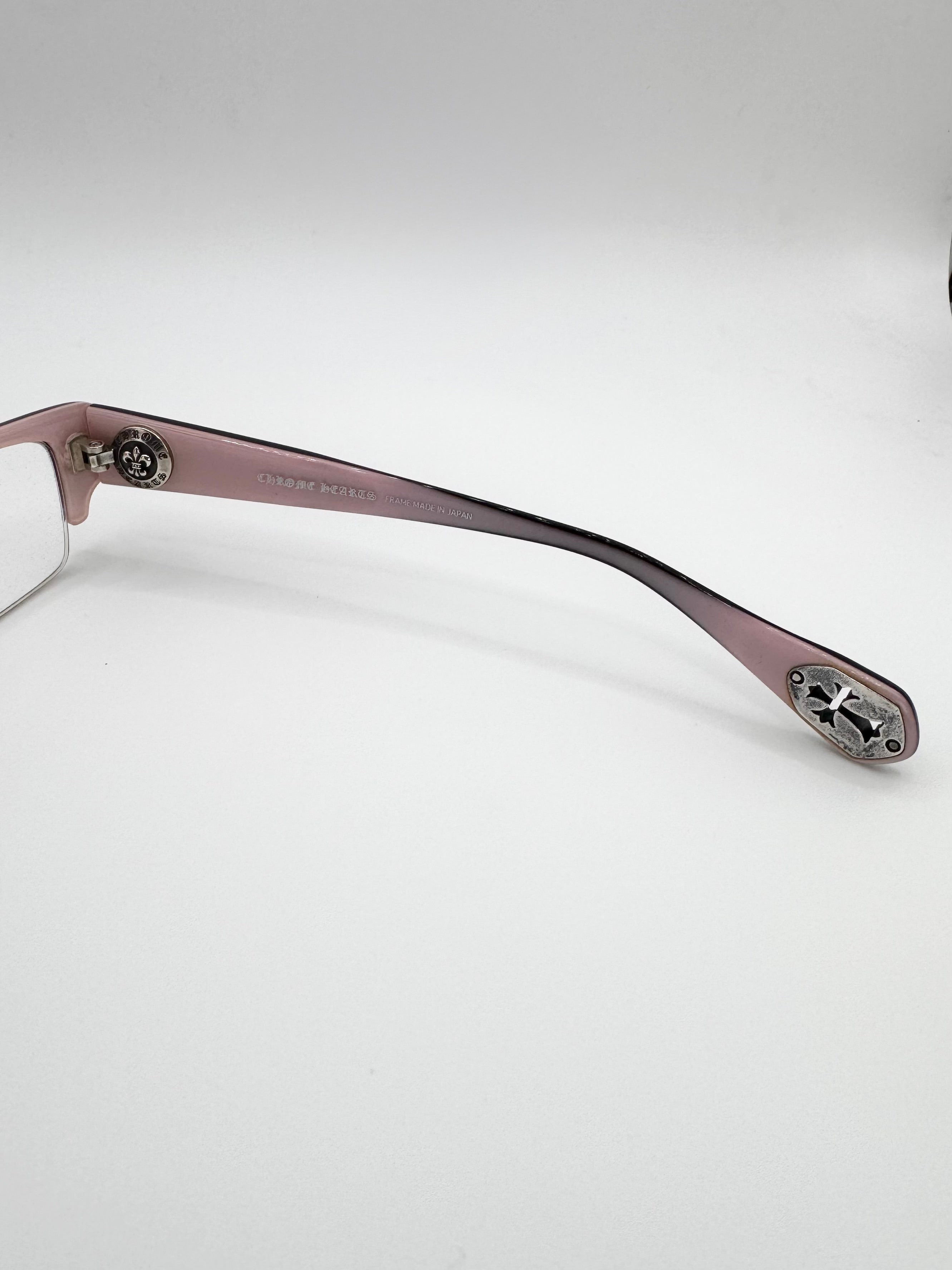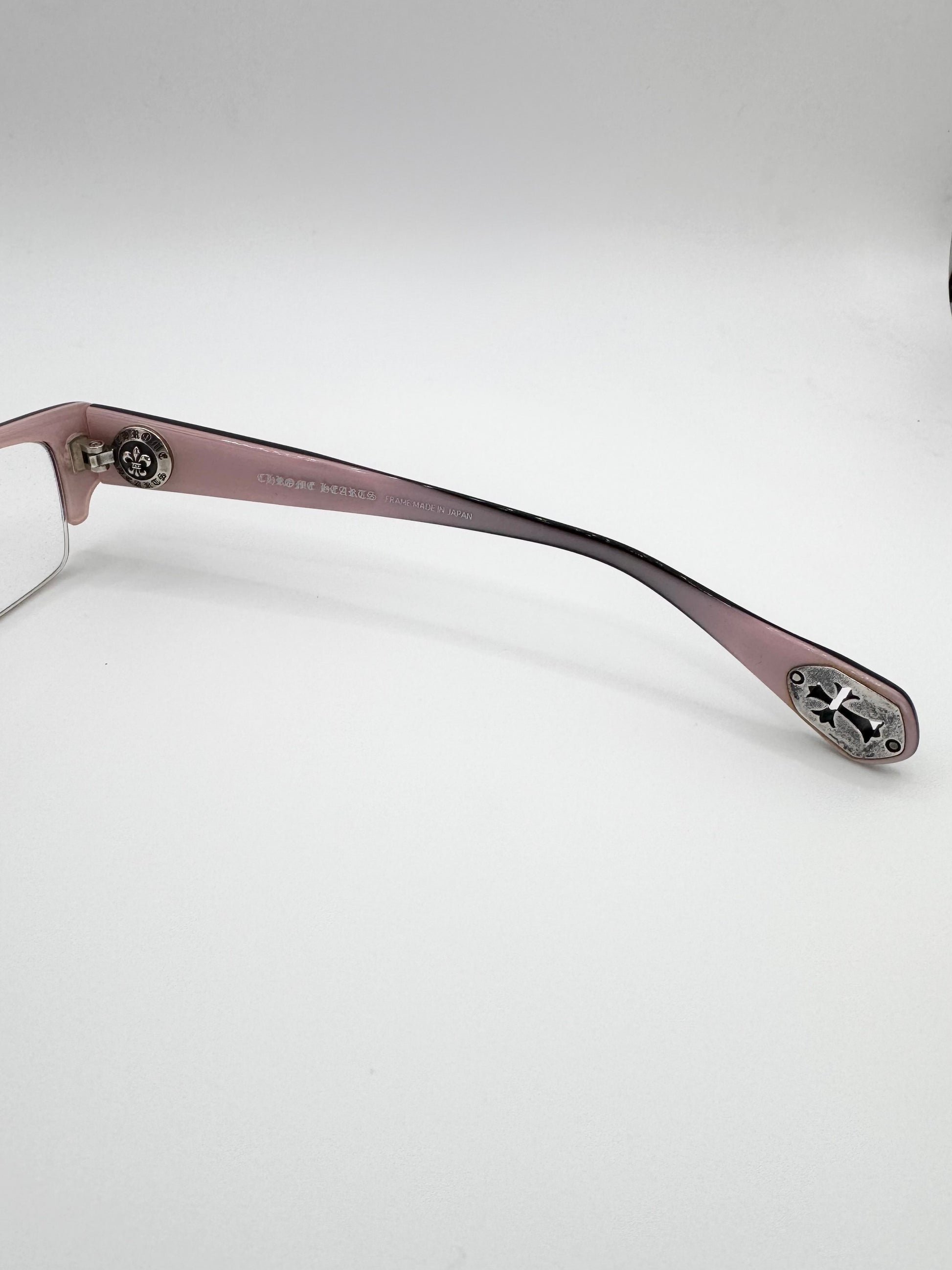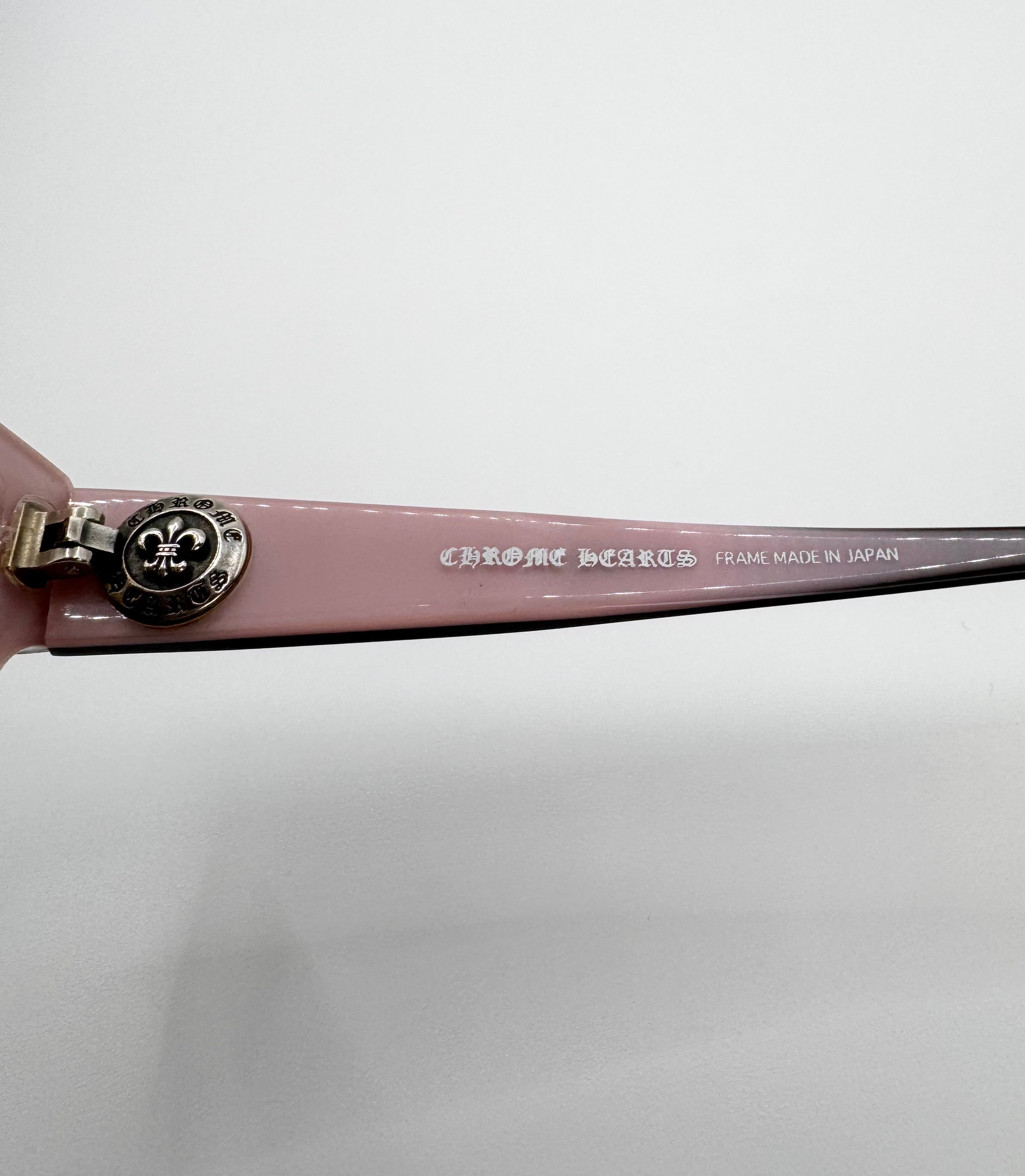 Exquisite pair of Chrome Hearts glass frames named ‘Head Frost’. Features cut-out .925 cemetery crosses at the tip of the arms. Half-frame design with the entire inner frame including the arm in light pink. The inner hinge is a .925 circular Fleur logo with the branding embossed around. Stunning frames coming in close to new condition with no flaws or damages
