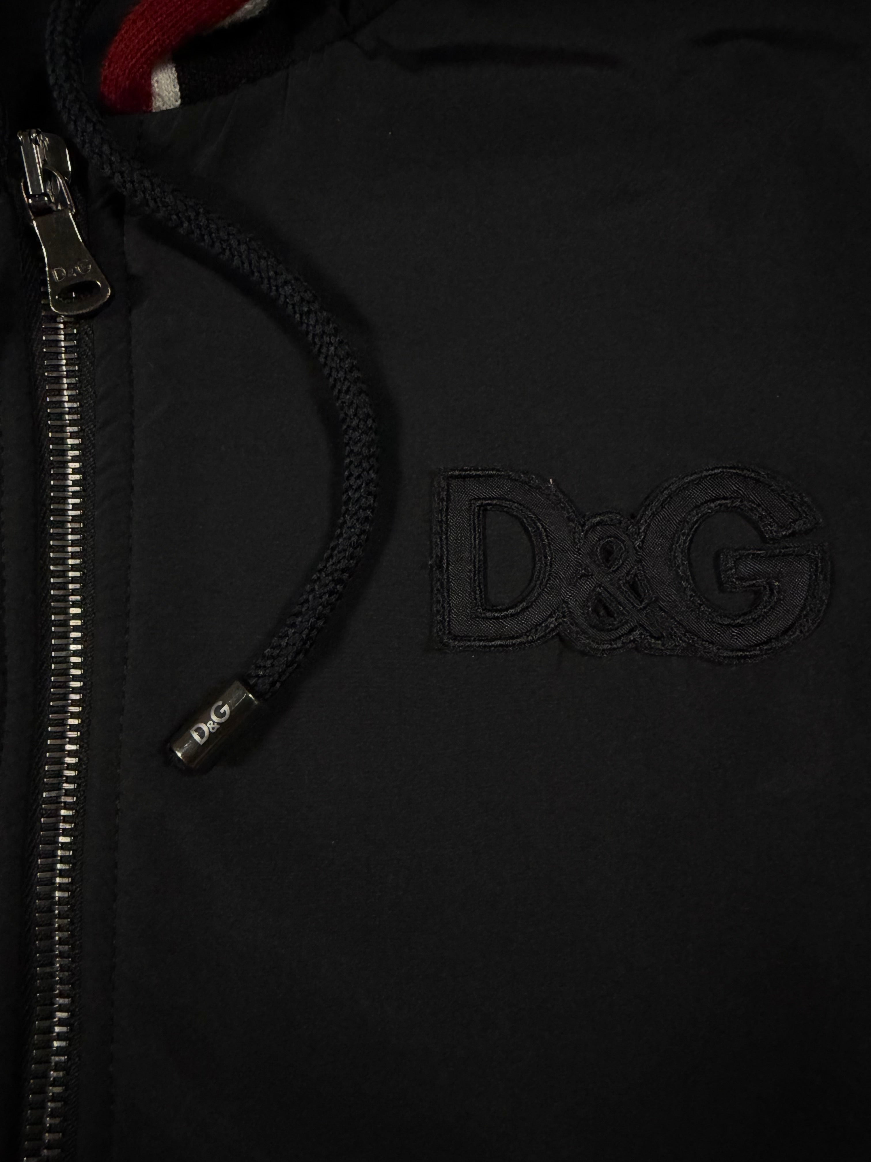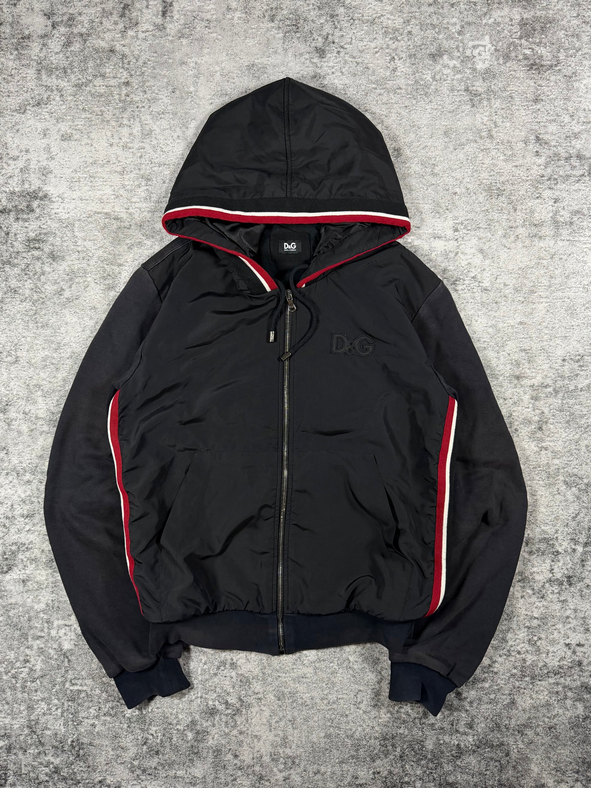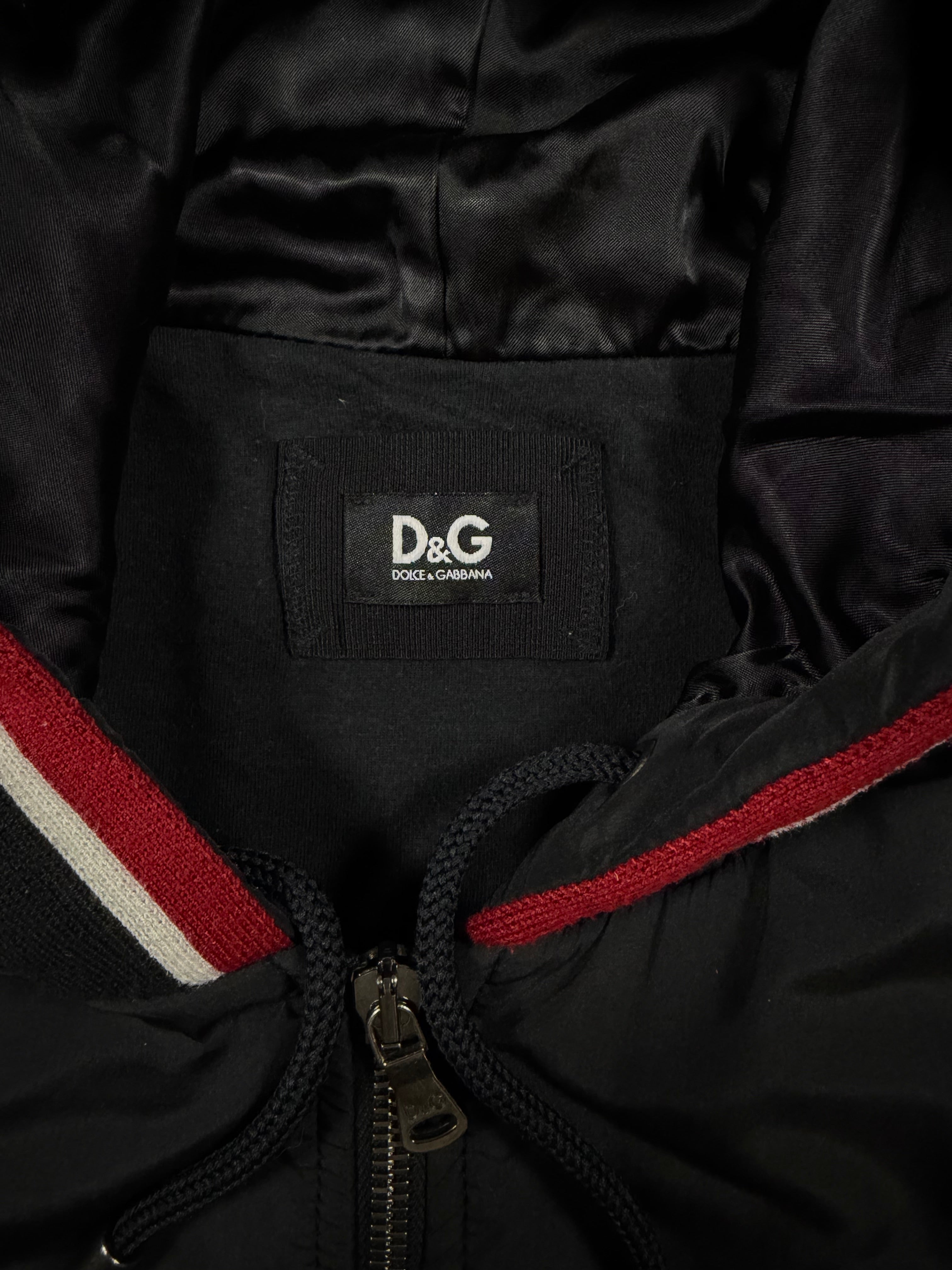 A sharp hybrid construction from Dolce & Gabbana’s D&G line, blending technical nylon paneling with soft fleece for a distinctly Y2K silhouette. Subtle tonal D&G chest branding is paired with bold red and white contrast striping, giving the piece a sporty yet elevated presence. The cropped, slightly boxy fit with ribbed hems and a structured hood reflects early 2000s design language. Slightly sun faded from natural aging, giving it a vintage look.