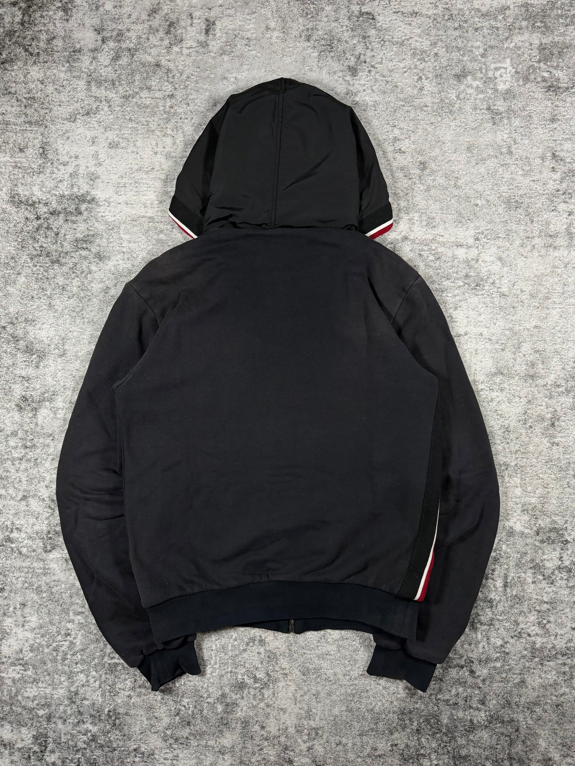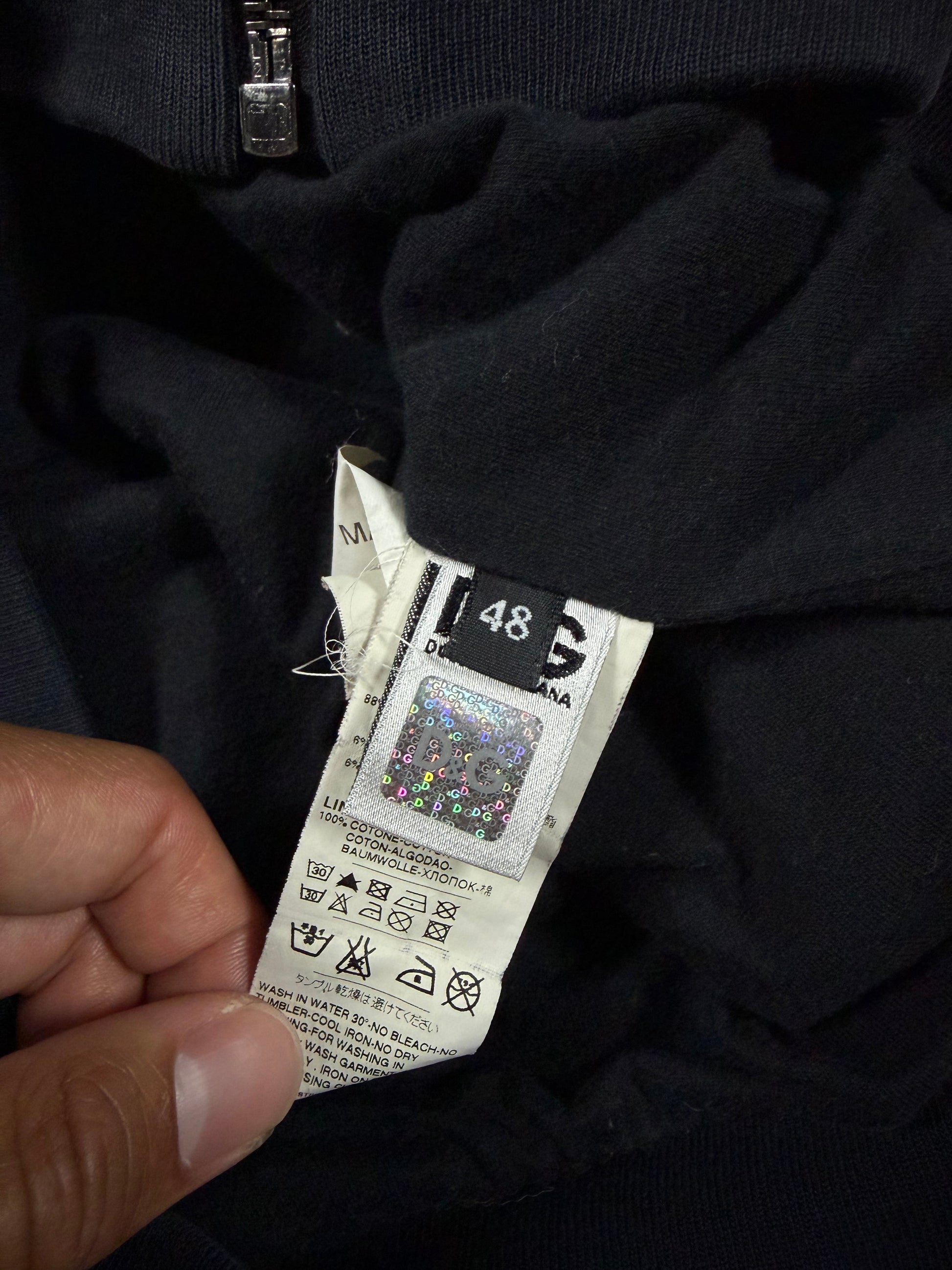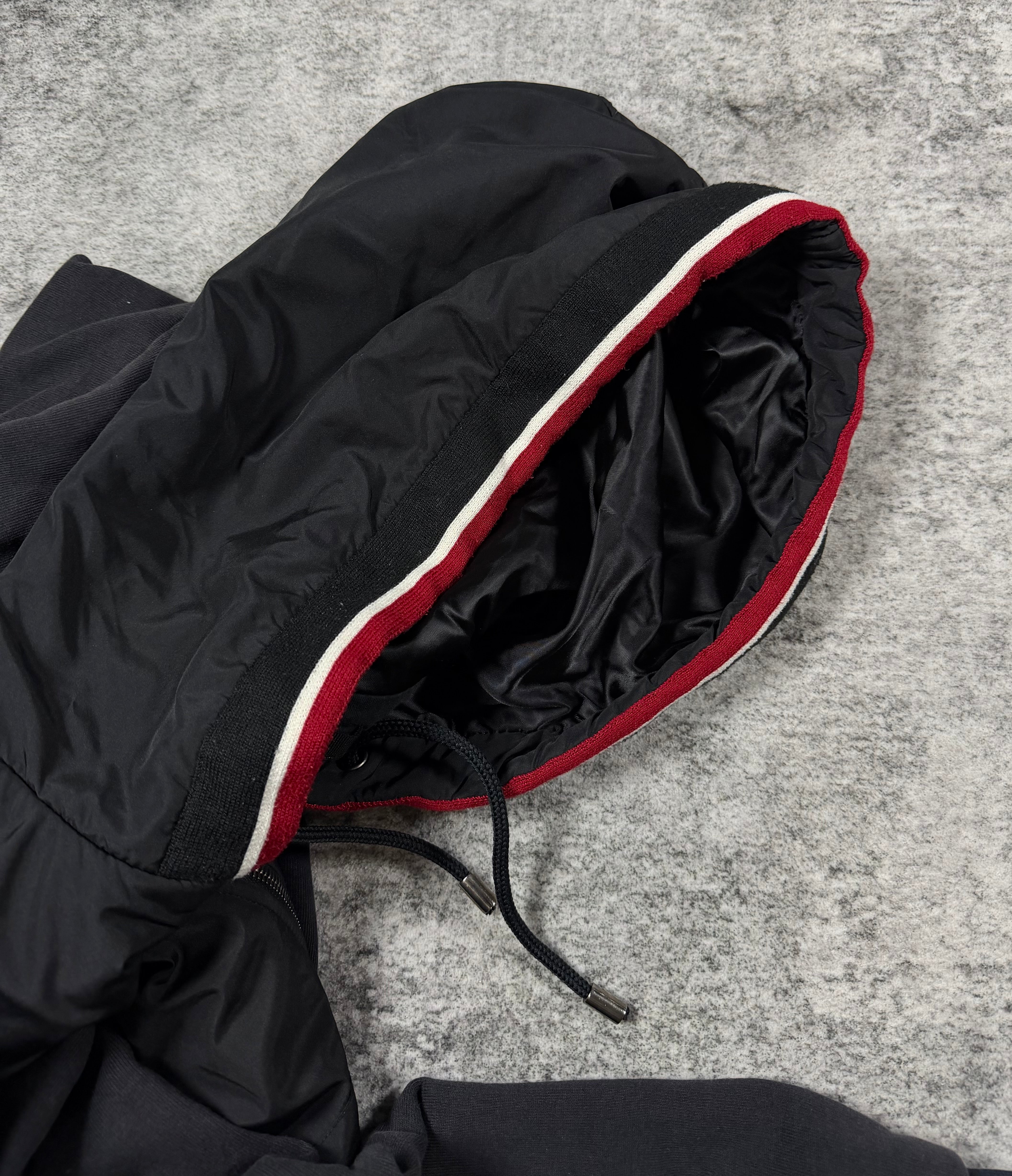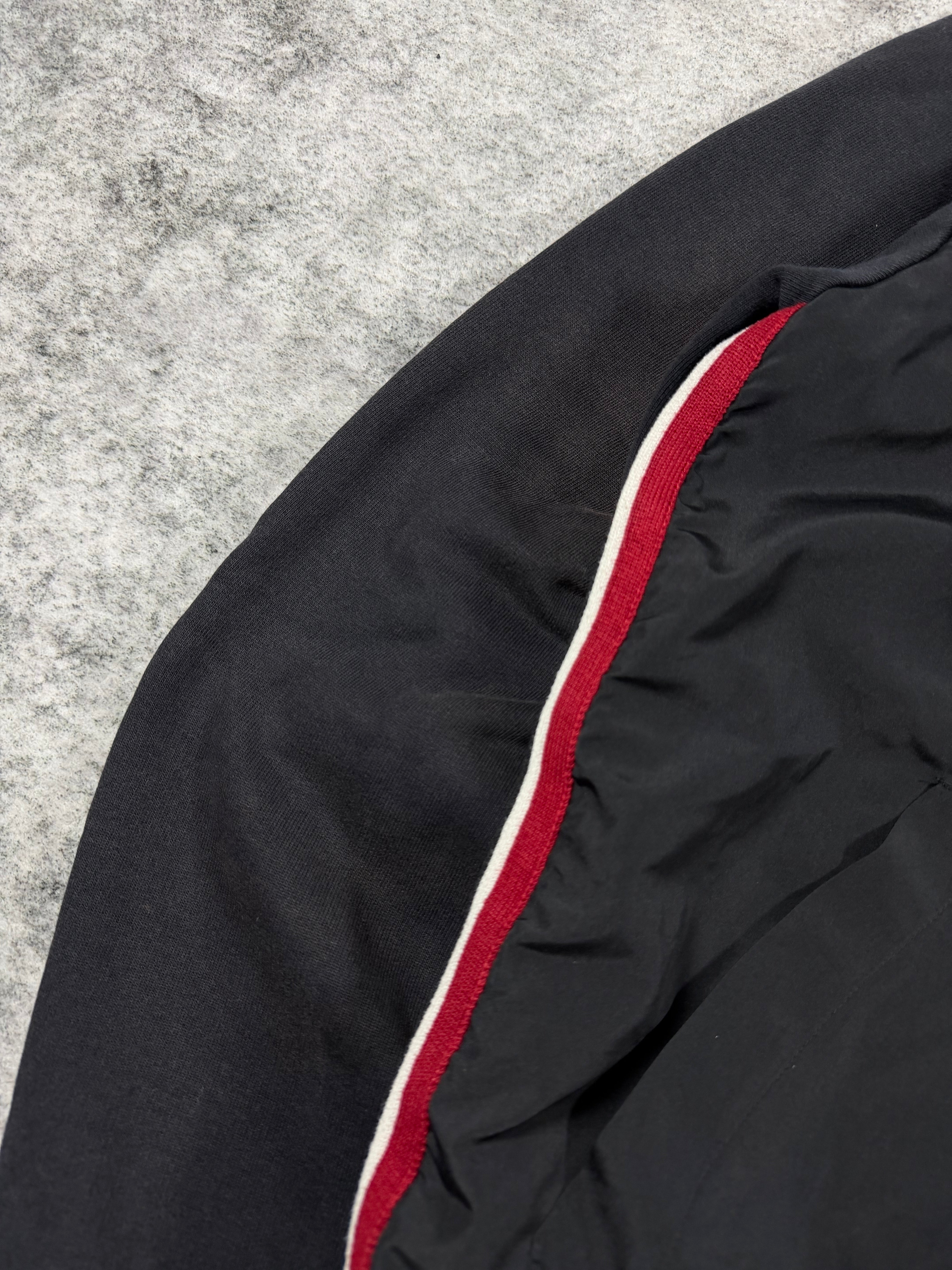 A sharp hybrid construction from Dolce & Gabbana’s D&G line, blending technical nylon paneling with soft fleece for a distinctly Y2K silhouette. Subtle tonal D&G chest branding is paired with bold red and white contrast striping, giving the piece a sporty yet elevated presence. The cropped, slightly boxy fit with ribbed hems and a structured hood reflects early 2000s design language. Slightly sun faded from natural aging, giving it a vintage look.