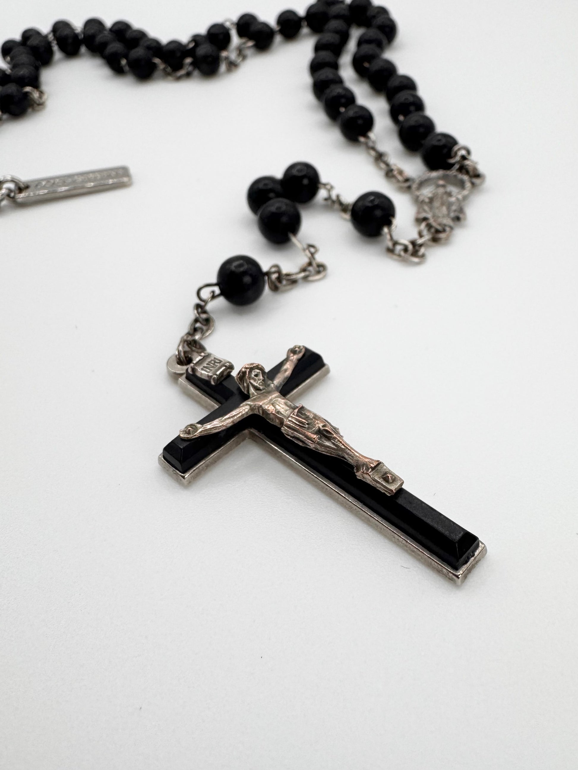 From the early 2000s, this Dolce & Gabbana black rosary-style necklace channels the label’s iconic fusion of edge and elegance. Smooth black beads lead to a sculptural silver cross pendant. The piece remains in great vintage condition, showing only minimal wear that adds to its character