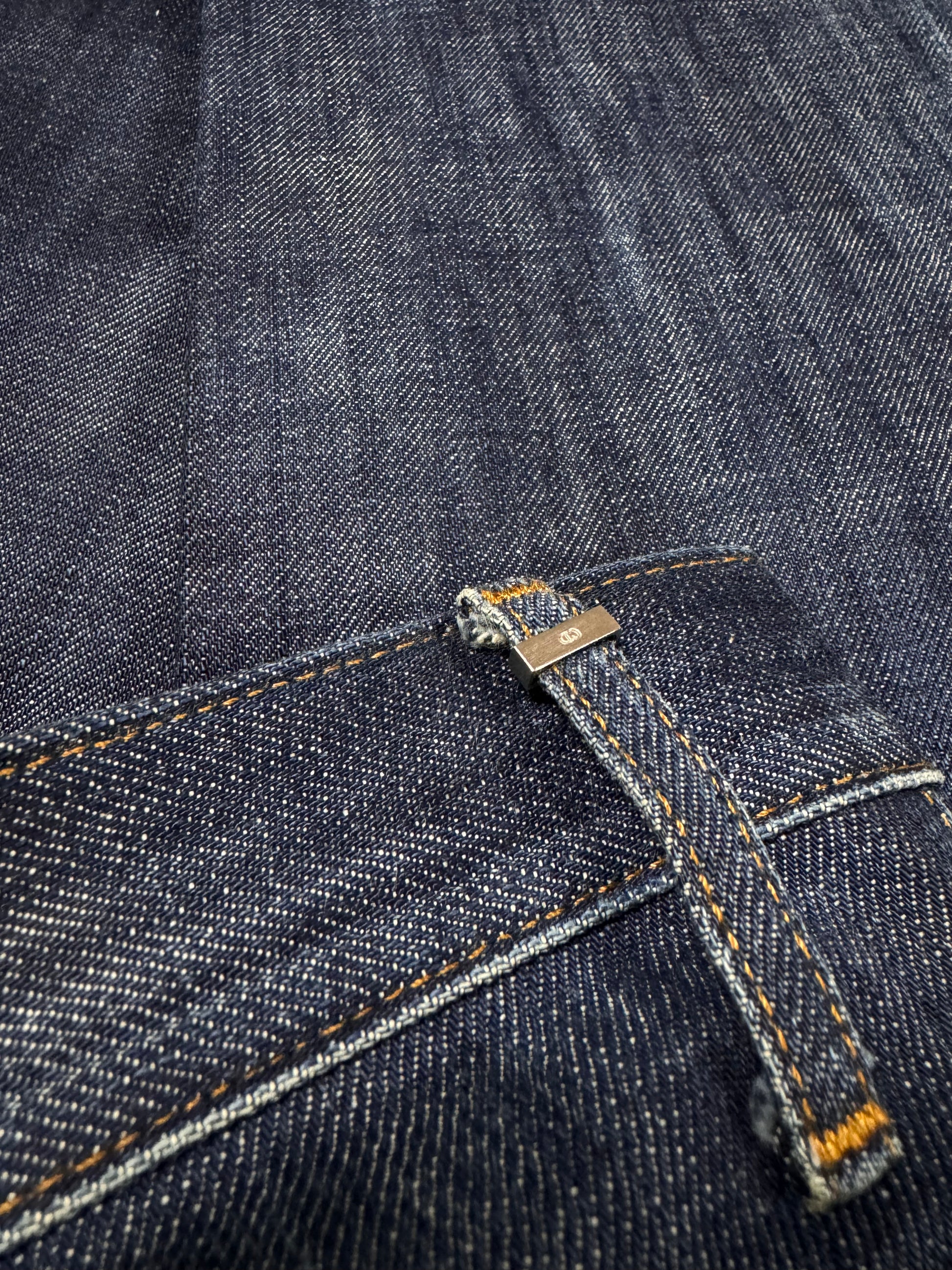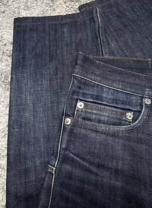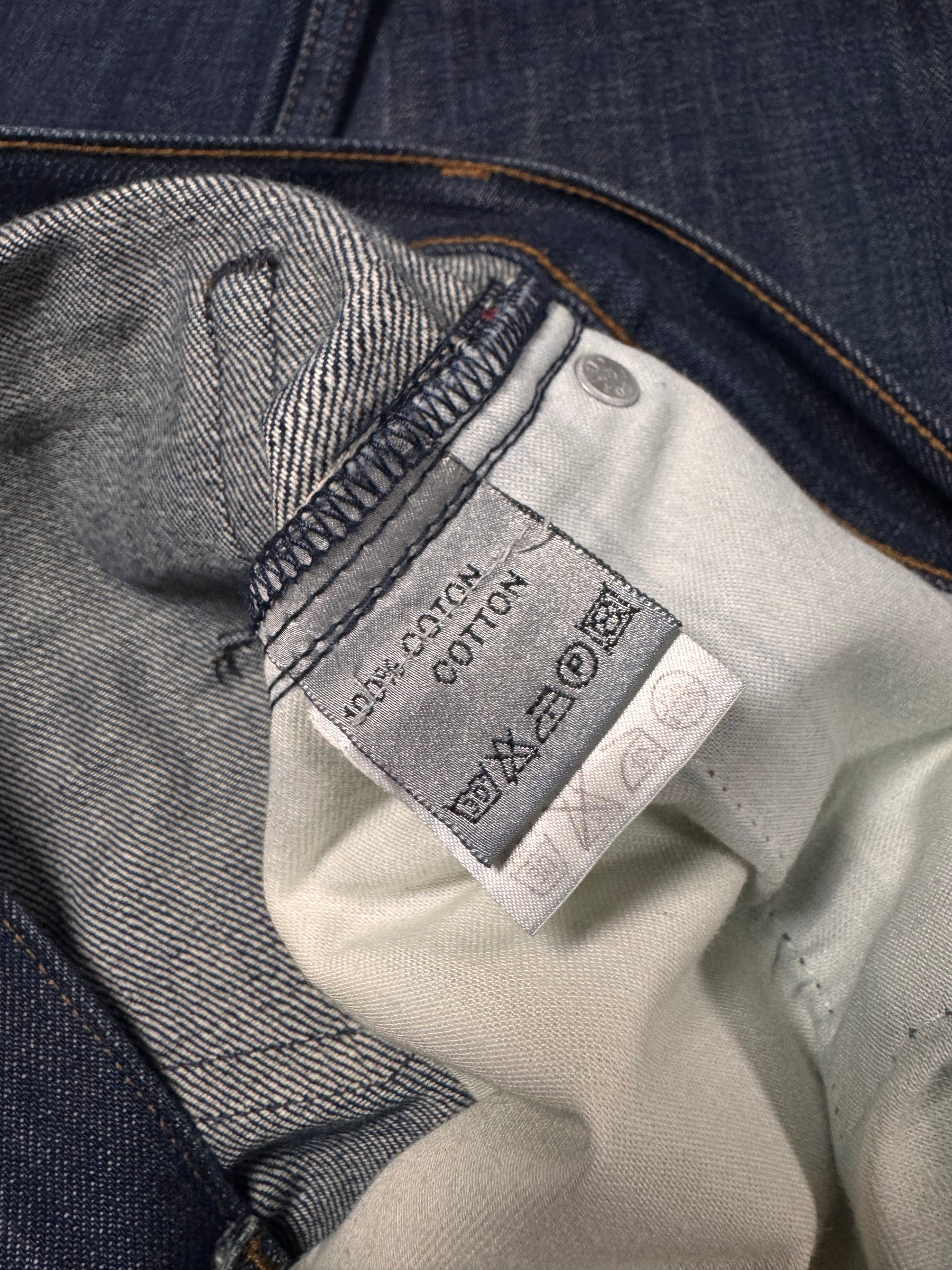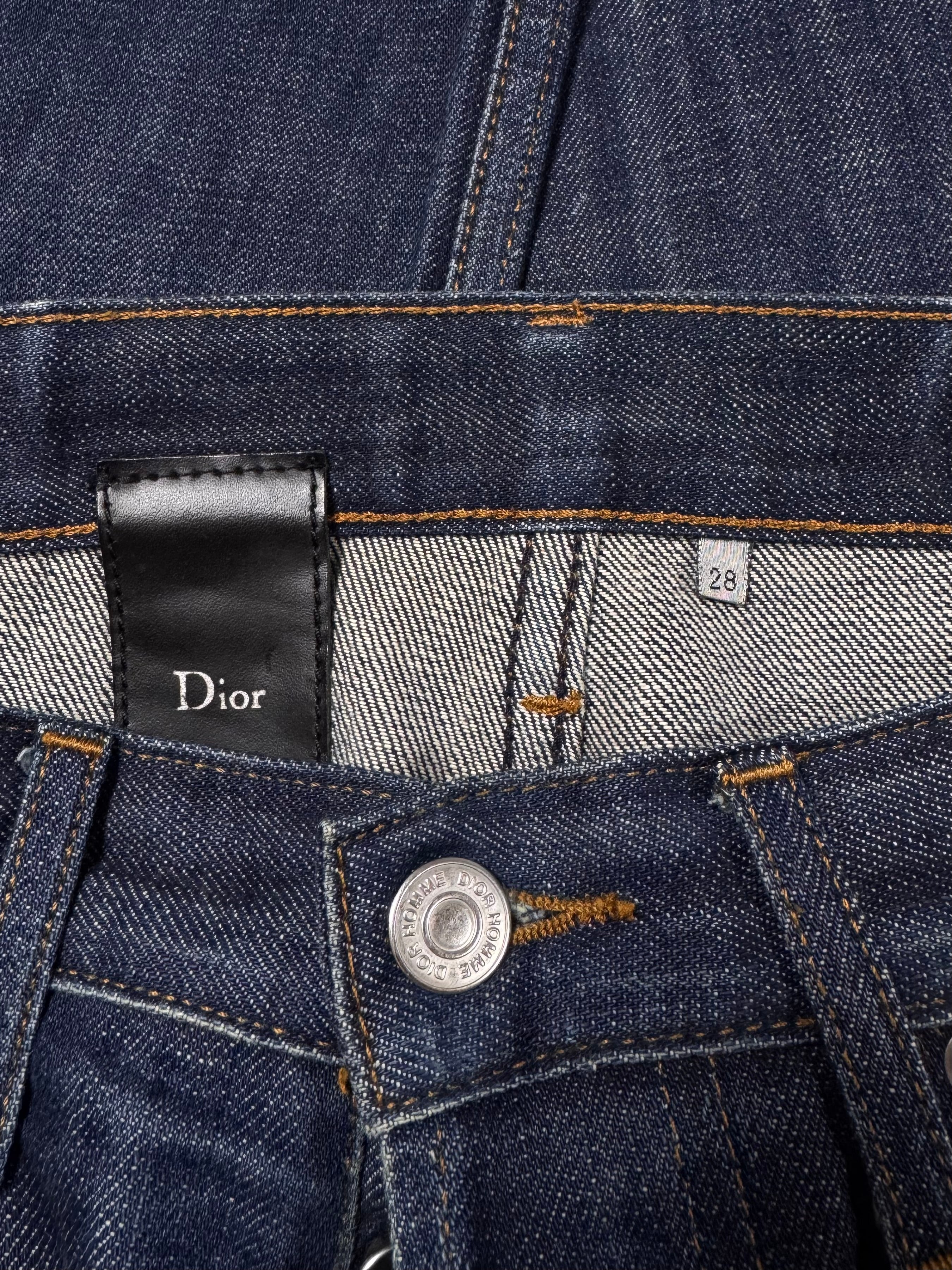 Stunning pair of Dior denim from the Autumn/Winter 2008 collection titled “Lumiere Du Nord” featuring a gorgeous raw indigo wash with a satin-like finish that gives it a uniquely smooth, luxurious touch. Hardware tag labeled “CD” on one of the rear belt loops. In great condition with no major flaws or damages, maintains superb quality