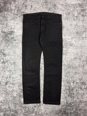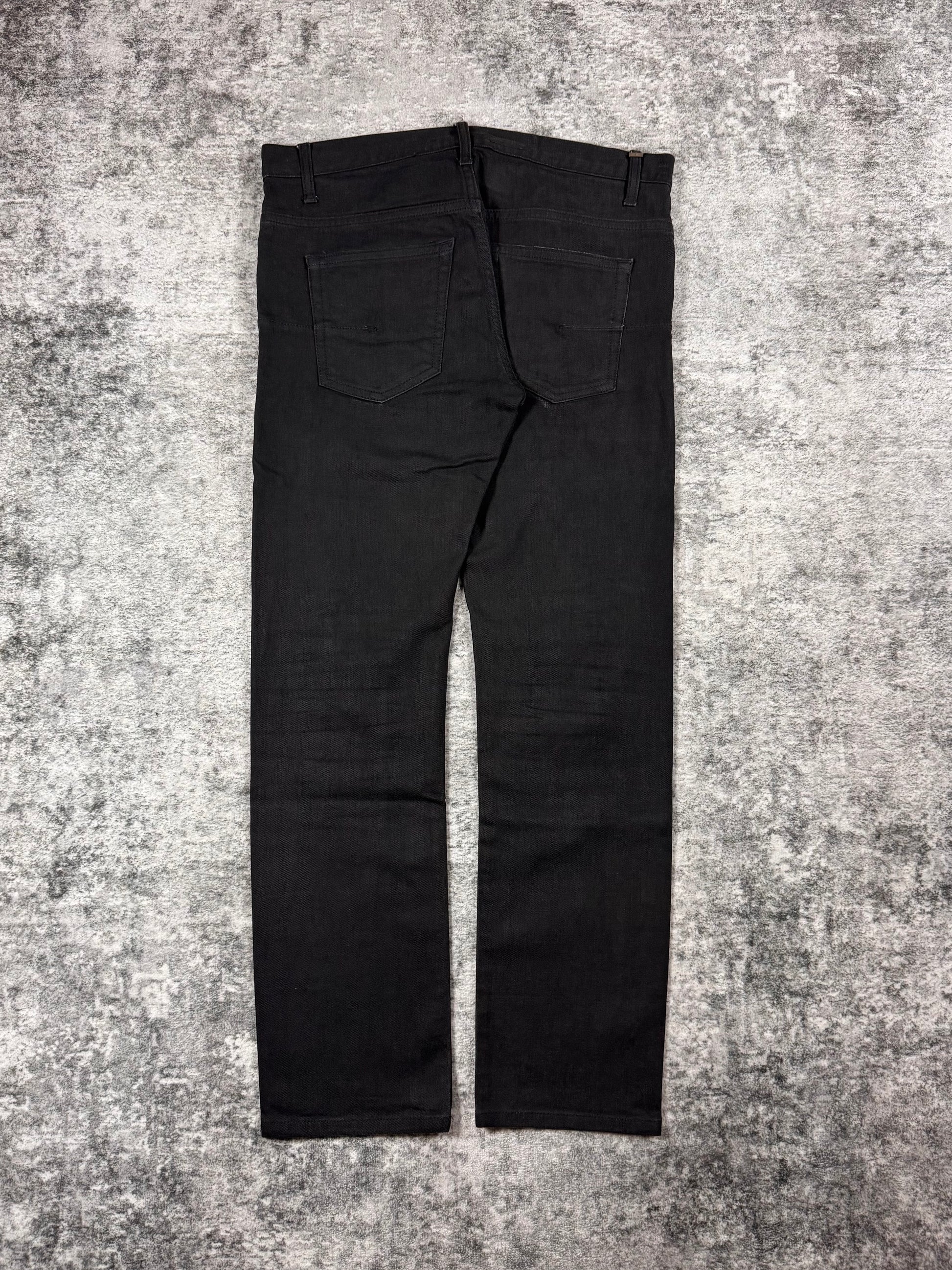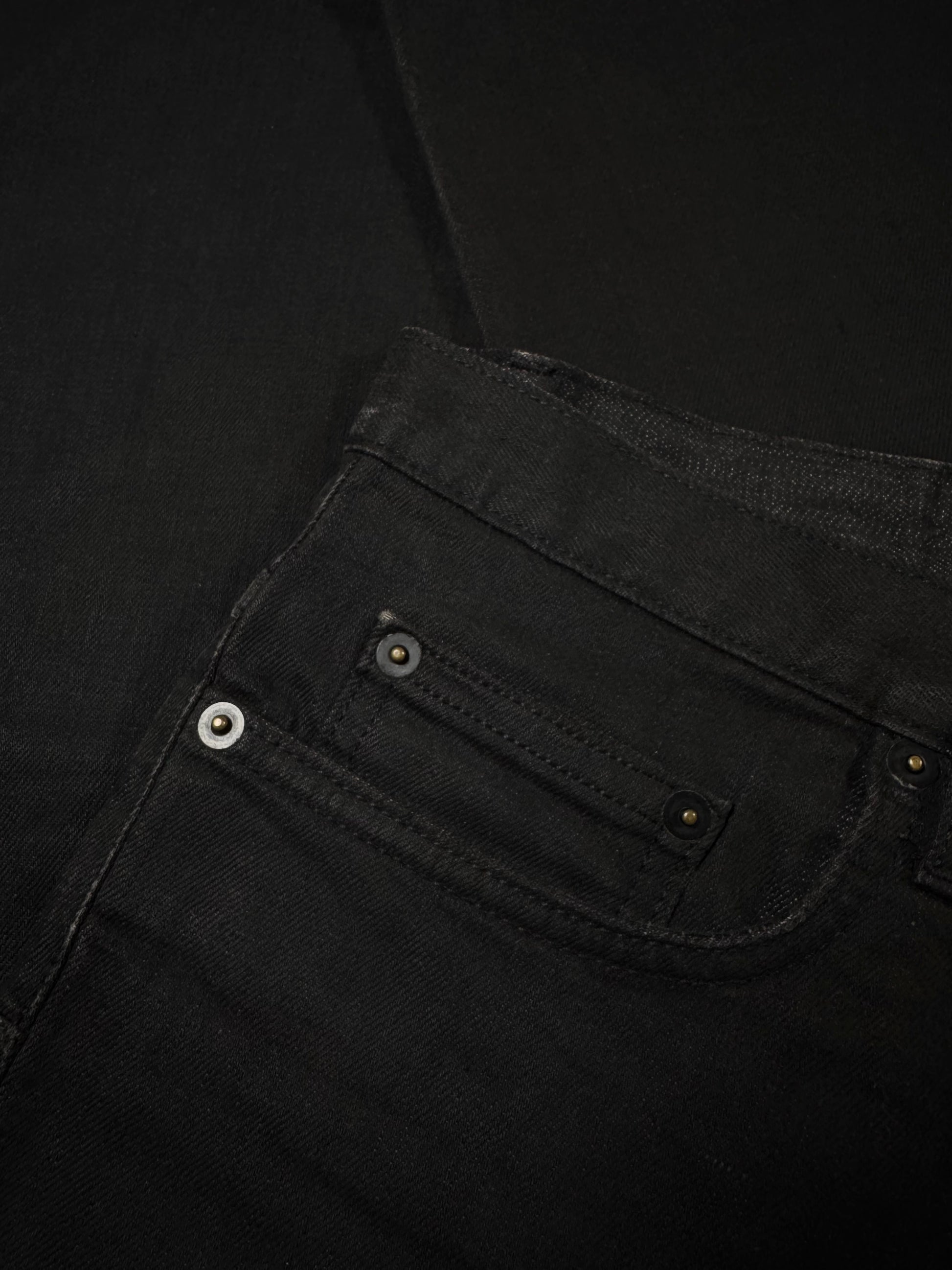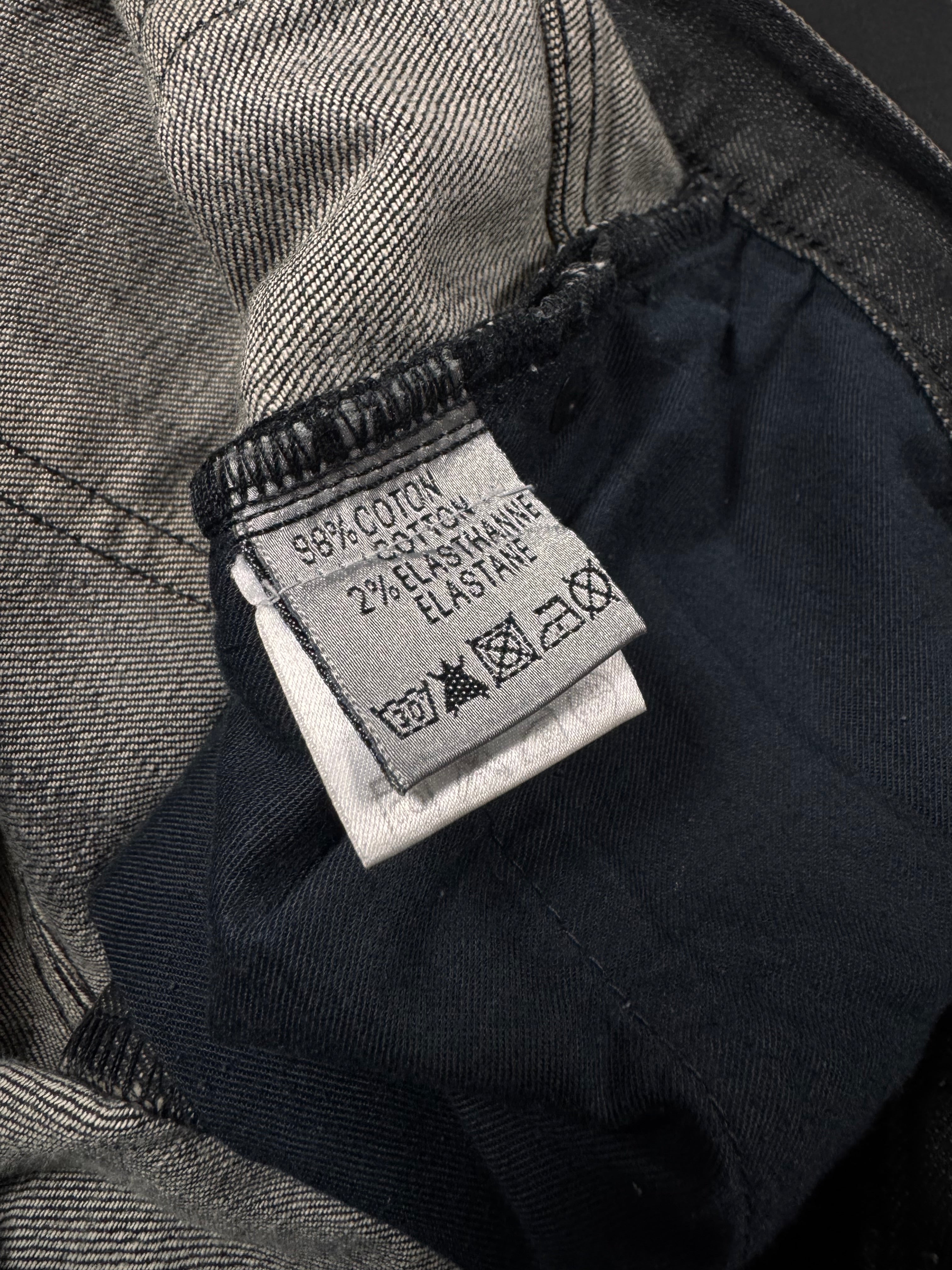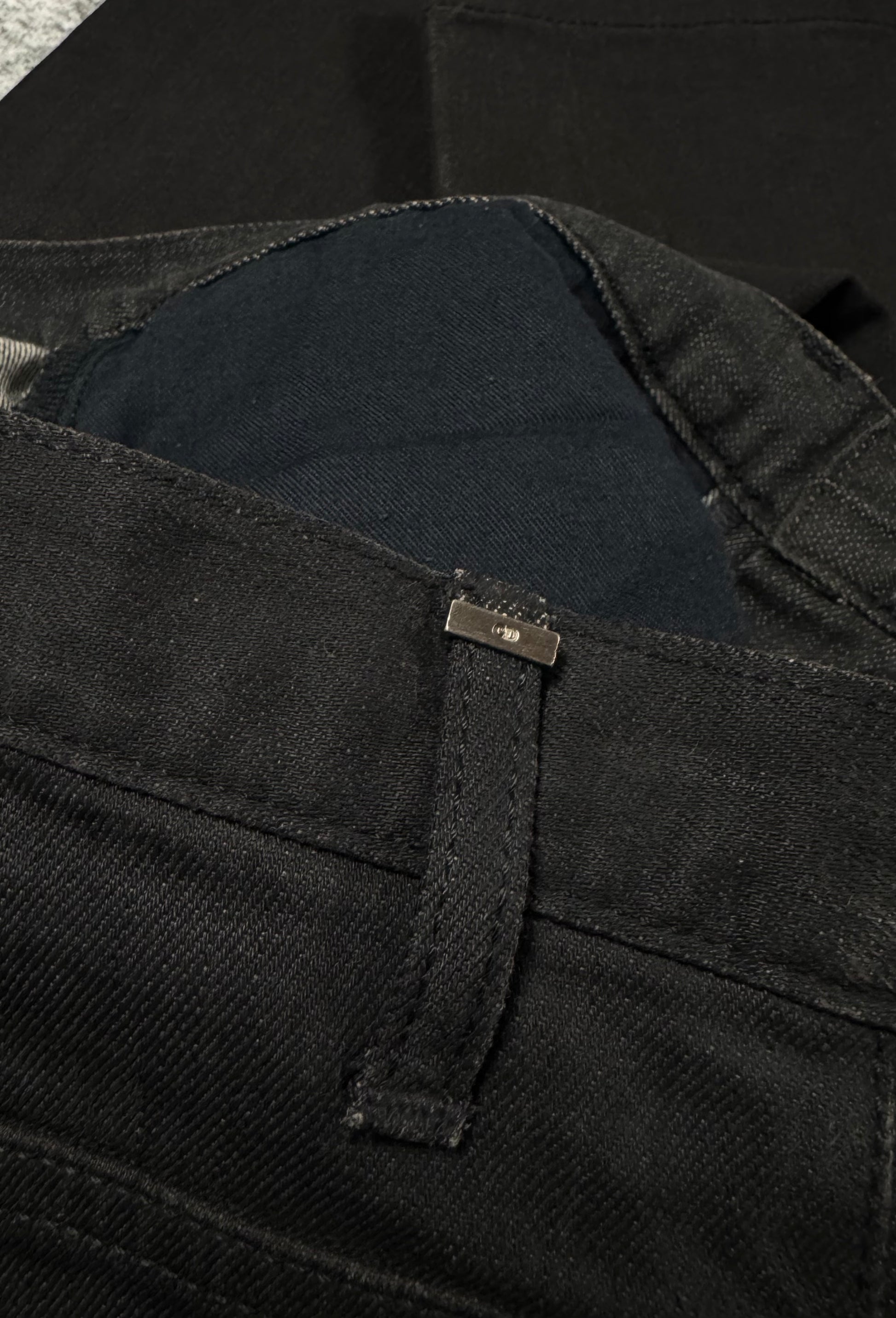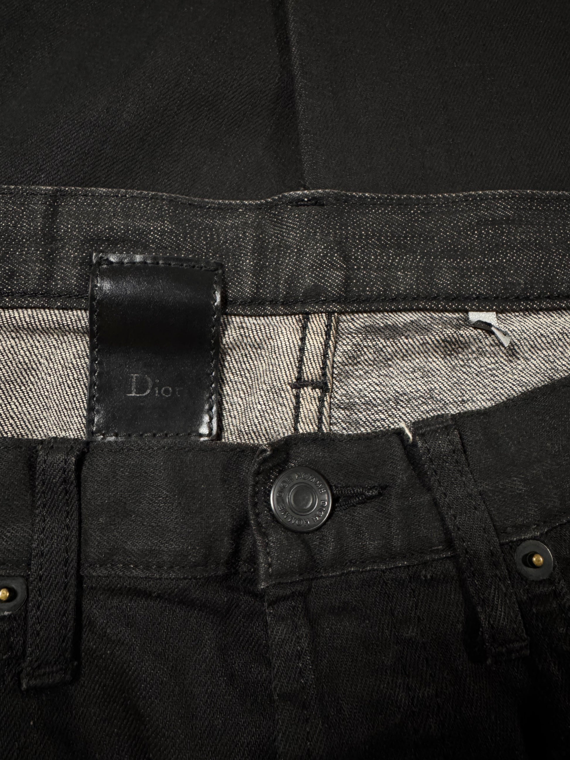 Stunning pair of Dior denim from the Autumn/Winter 2008 collection titled “Lumiere Du Nord” featuring waxed coating. Hardware tag labeled “CD” on one of the back belt loops. In great condition with no major flaws or damages, maintains superb quality with washed off wax due to aging