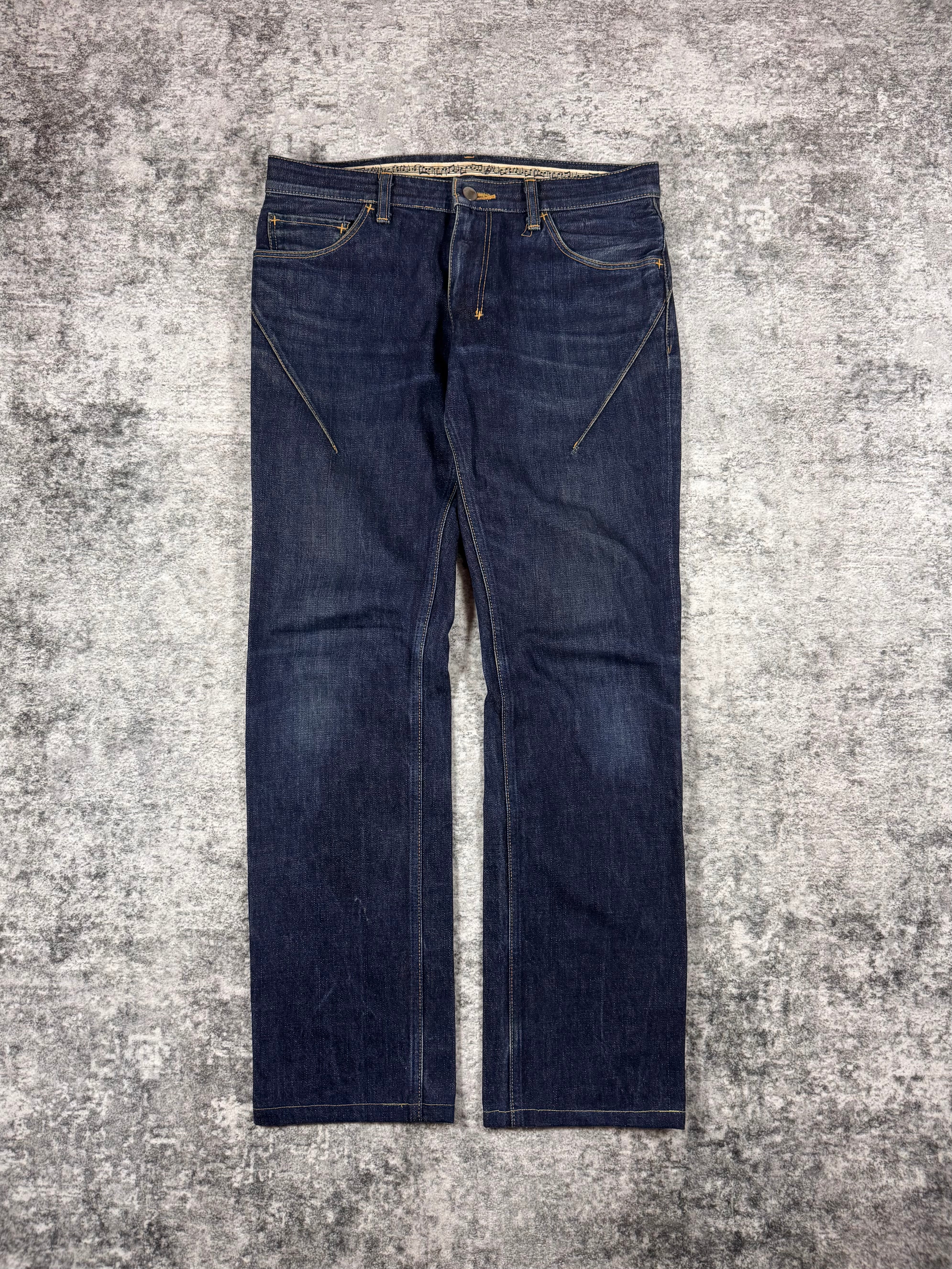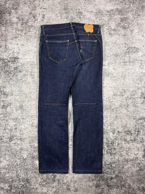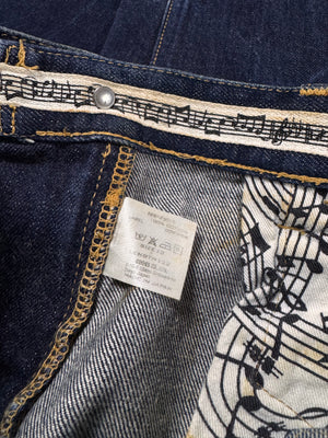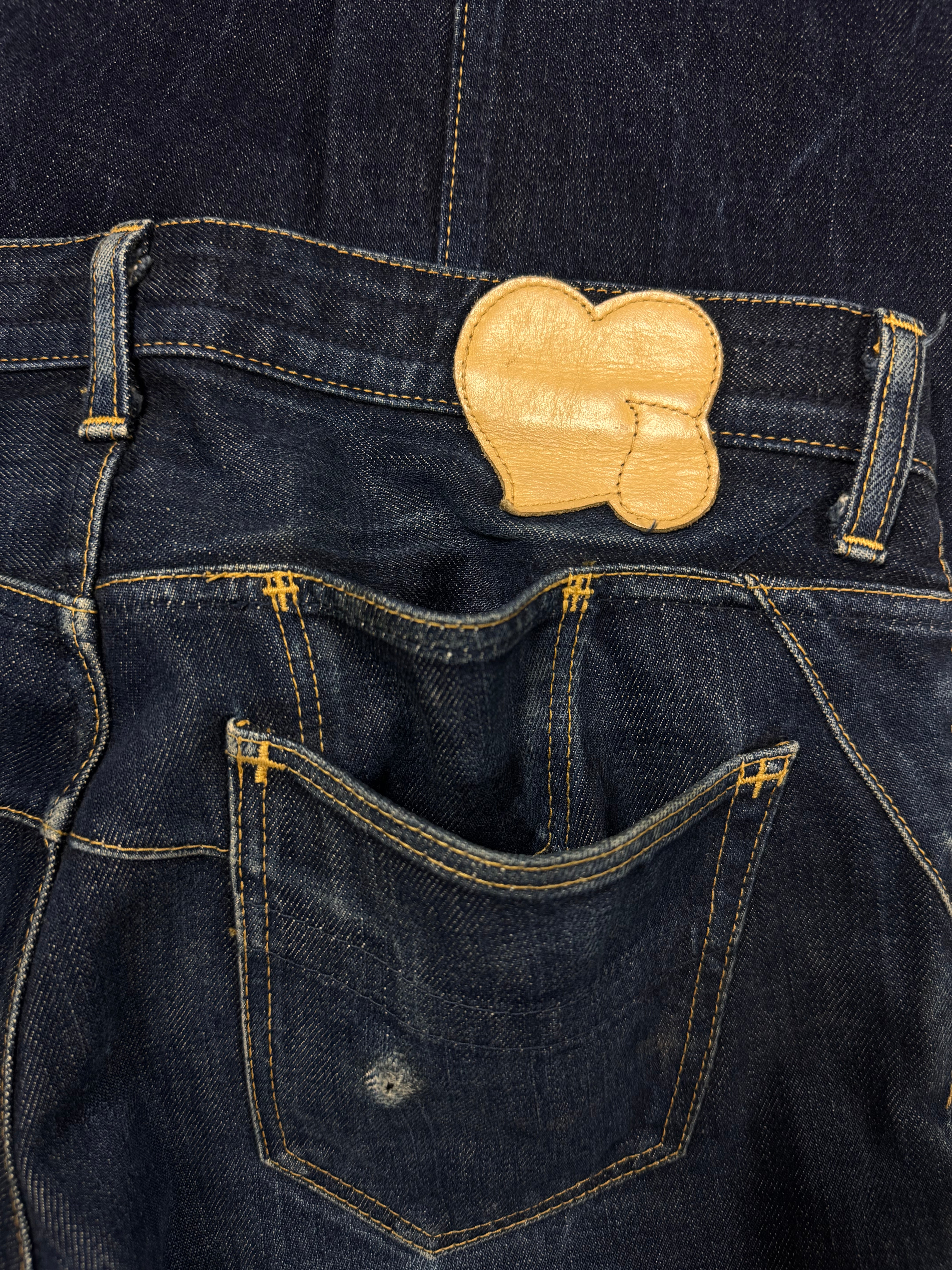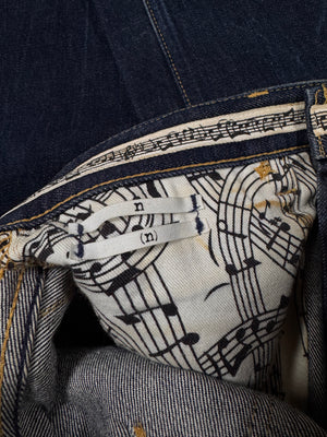 Signature pair of the ‘Pain’ denim from Fall/Winter 2008 “My Own Private Portland”. Features a rare double back pocket construction, designed with an internal secondary pocket layered beneath the main patch pocket for added utility. Deep indigo wash with the signature music note interior lining and crying heart patch on the rear. In great condition, maintains top quality (small rip on rear pocket)