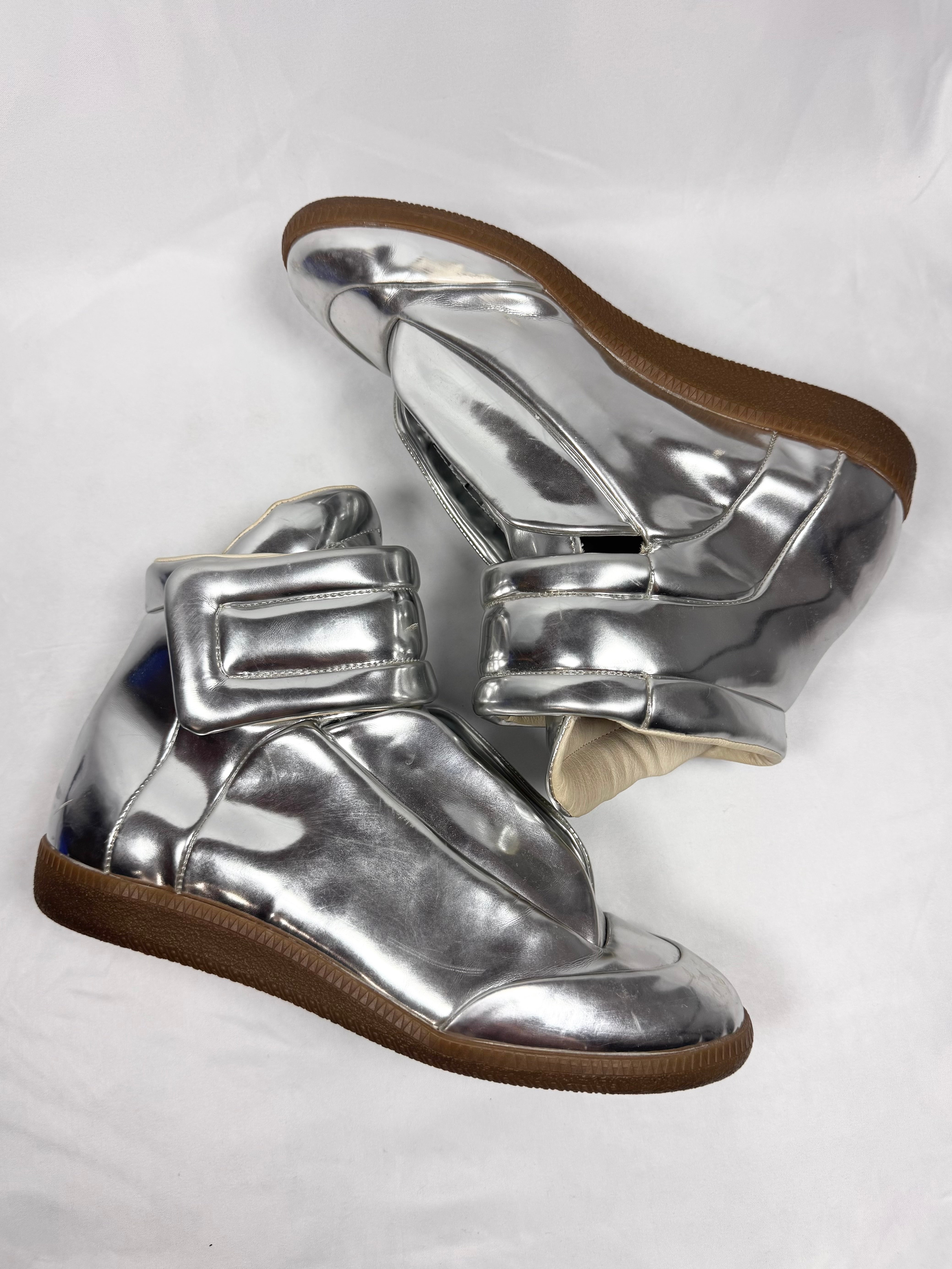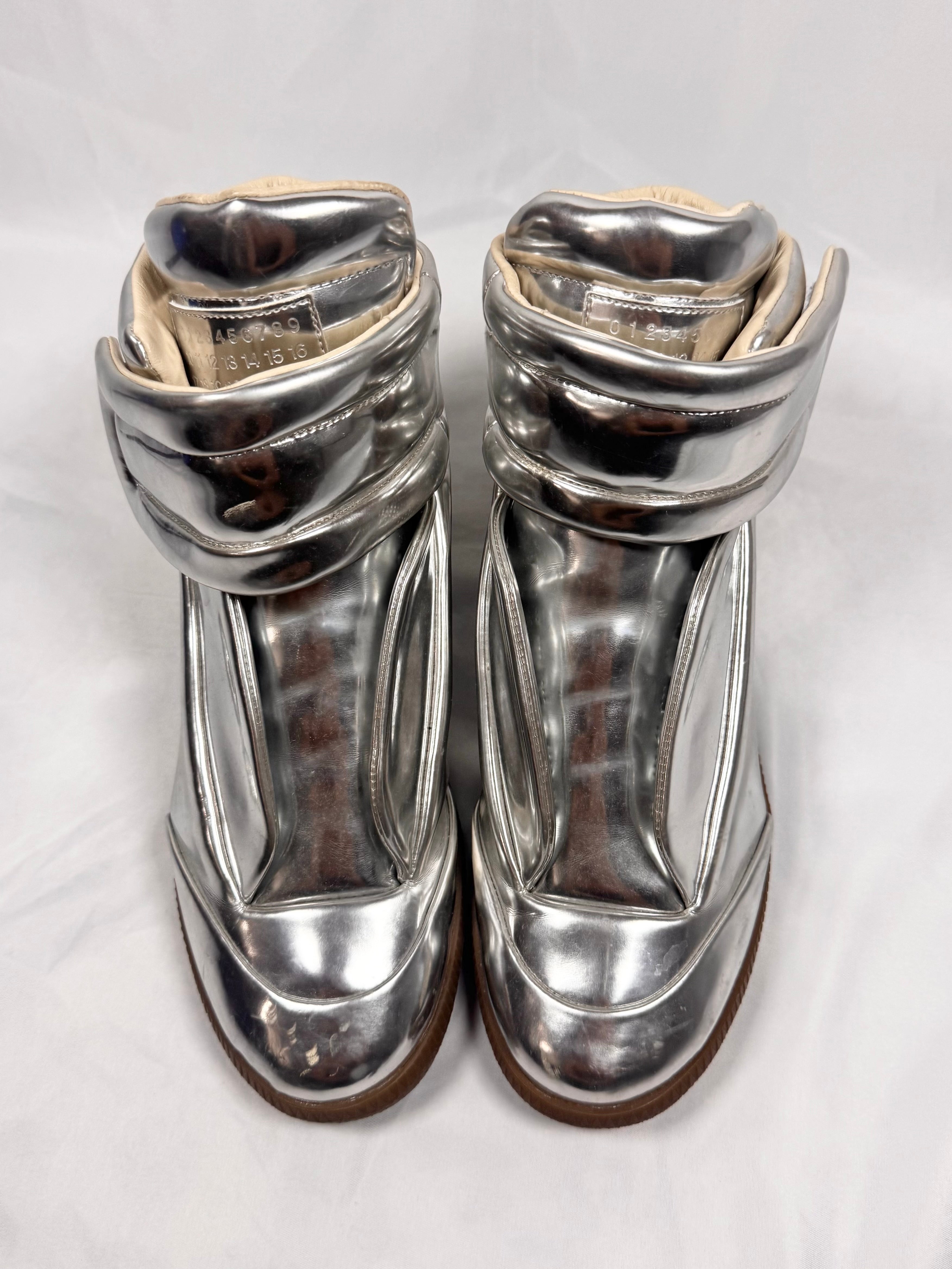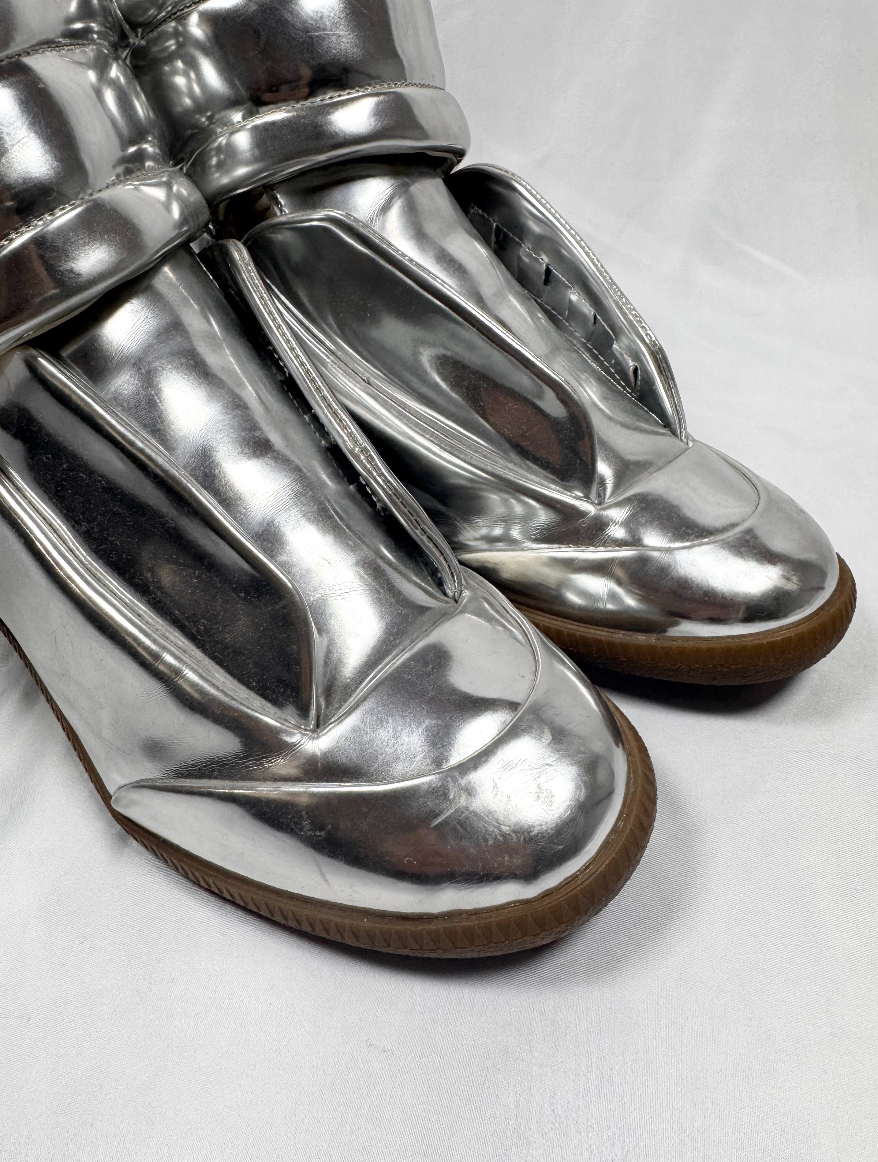Unique pair of the classic Maison Margiela GAT sneakers in the ‘Future’ high model. Making its return this year, this extremely rare variation is from the Fall/Winter 2011 collection, constructed out of patent leather upper in ‘metallic silver’ giving it a sci-fi look. Features a concealed lace-up closure and adjustable velcro ankle strap; numbers logo patch at padded tongue. In very good condition with some minor scuffs, missing laces