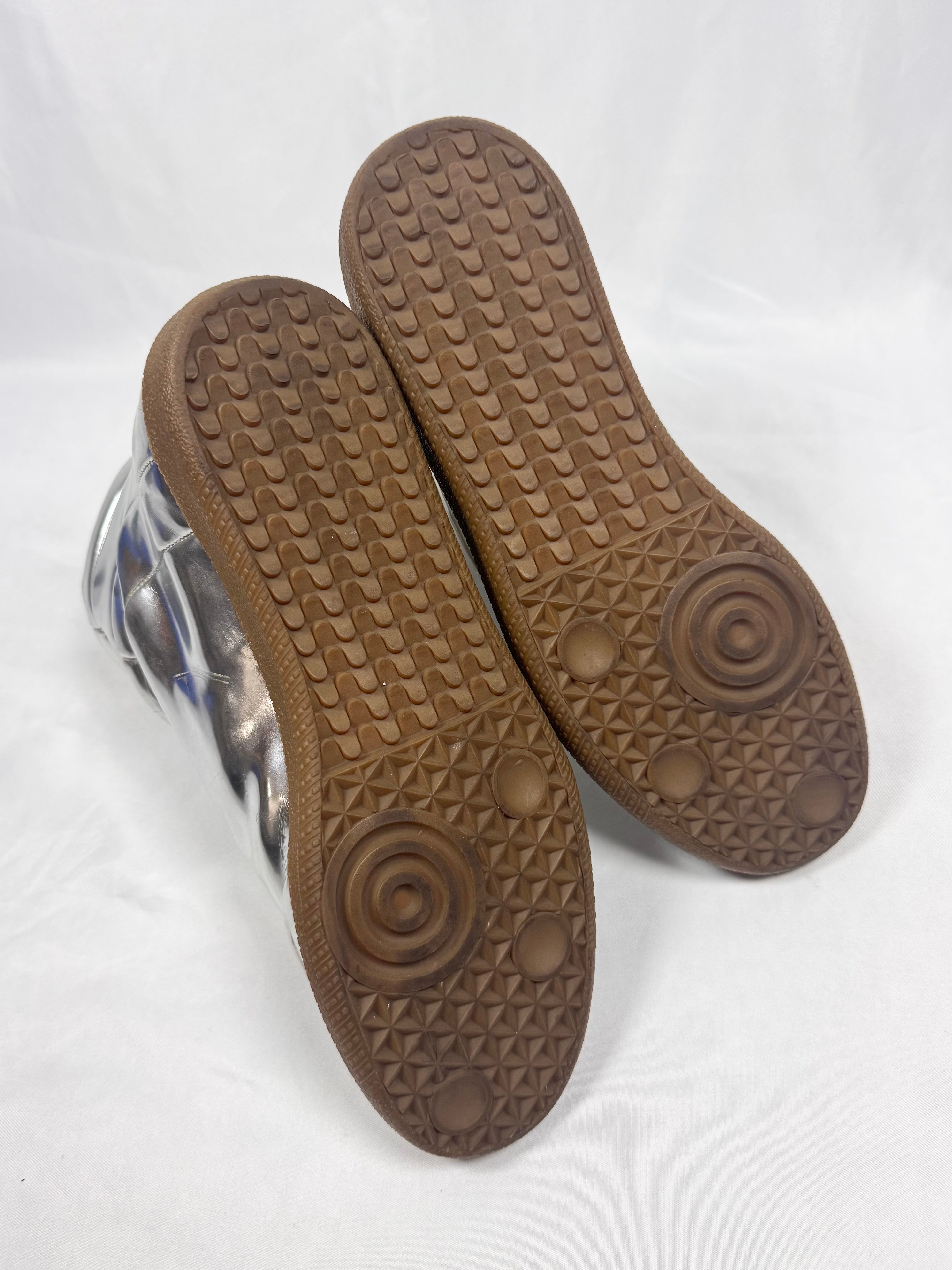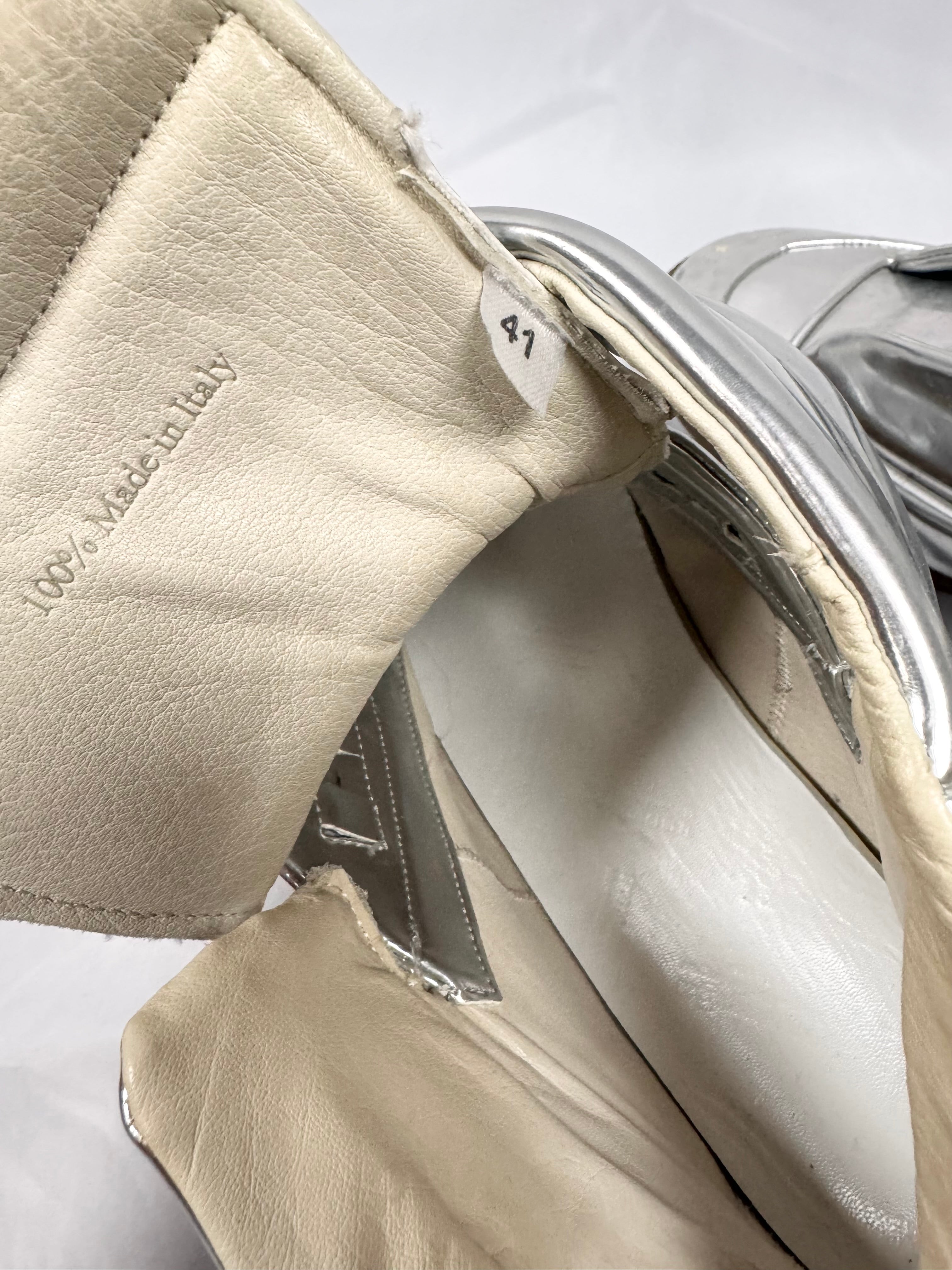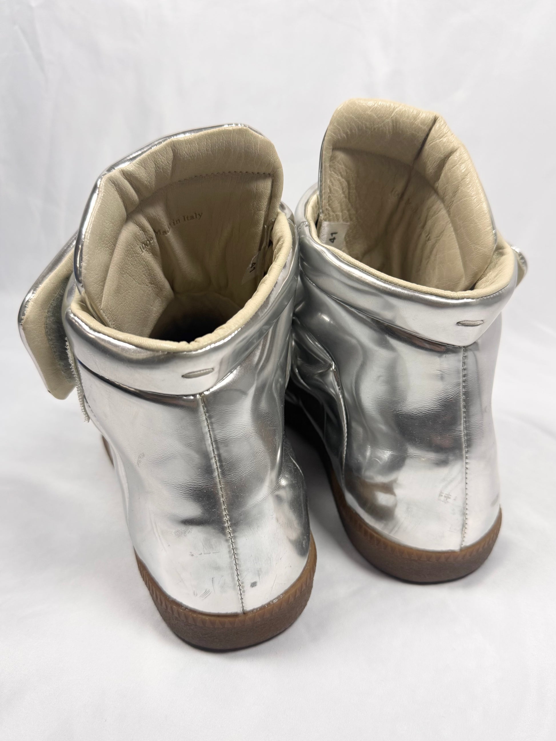 Unique pair of the classic Maison Margiela GAT sneakers in the ‘Future’ high model. Making its return this year, this extremely rare variation is from the Fall/Winter 2011 collection, constructed out of patent leather upper in ‘metallic silver’ giving it a sci-fi look. Features a concealed lace-up closure and adjustable velcro ankle strap; numbers logo patch at padded tongue. In very good condition with some minor scuffs, missing laces