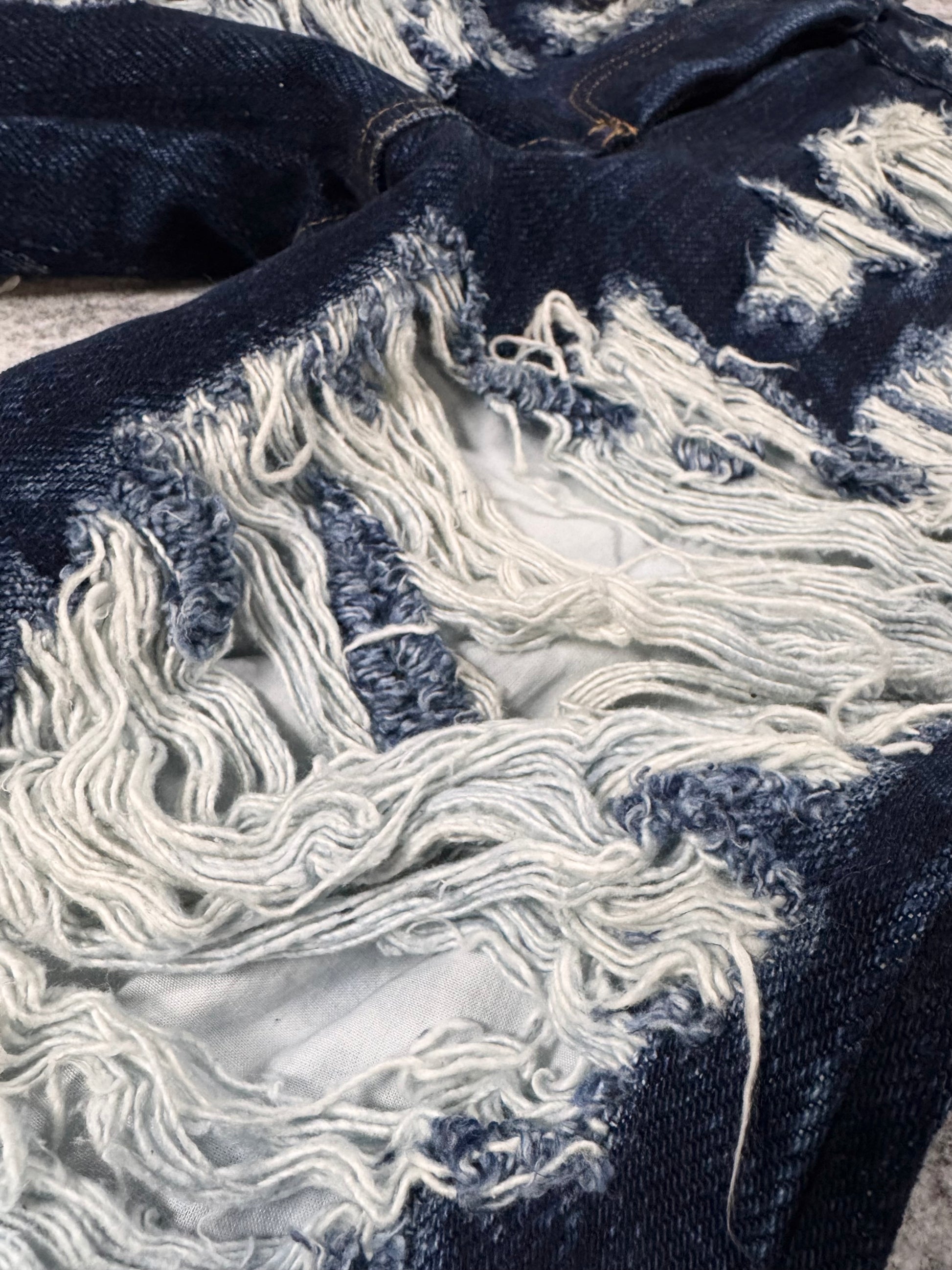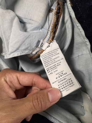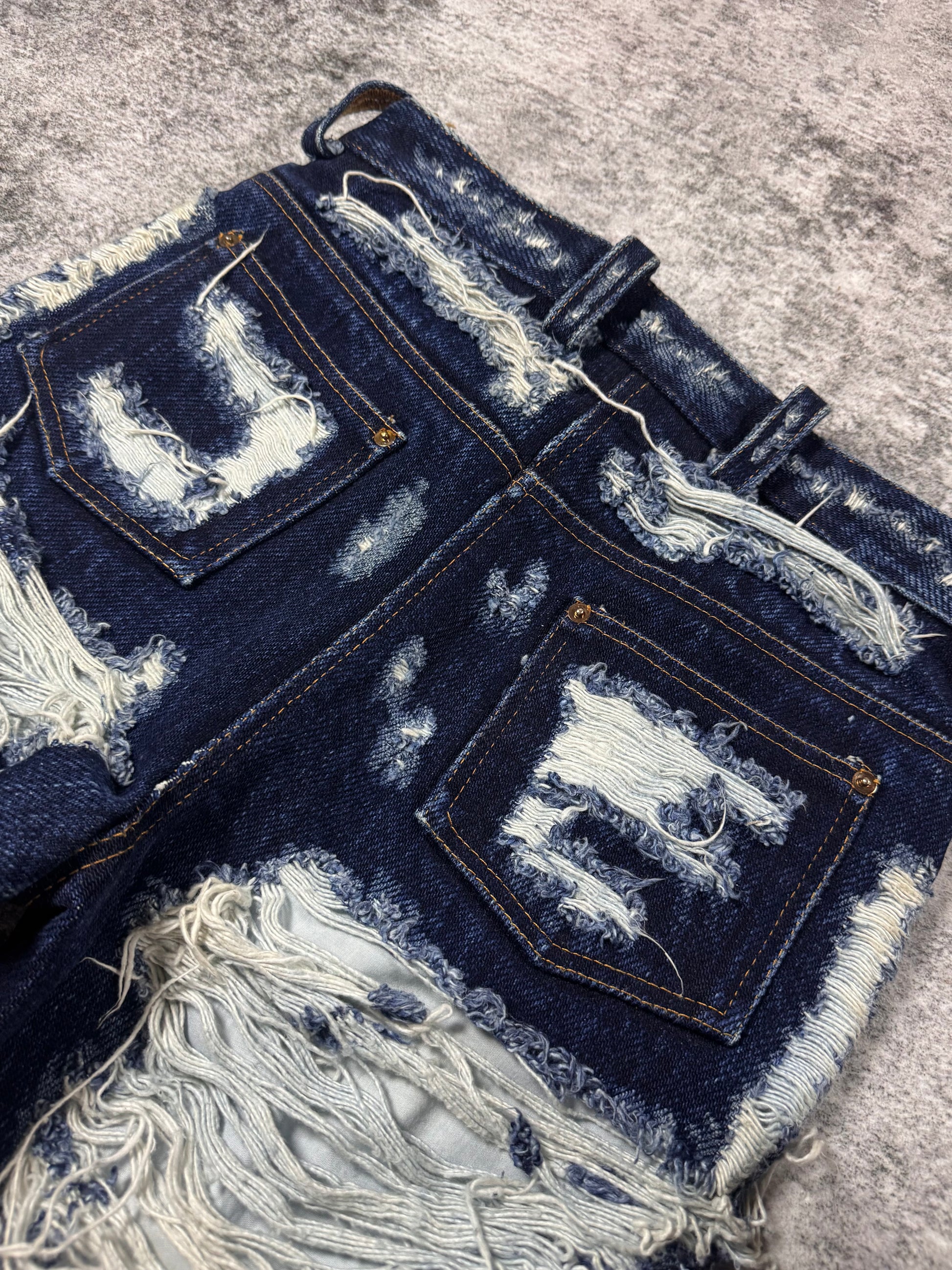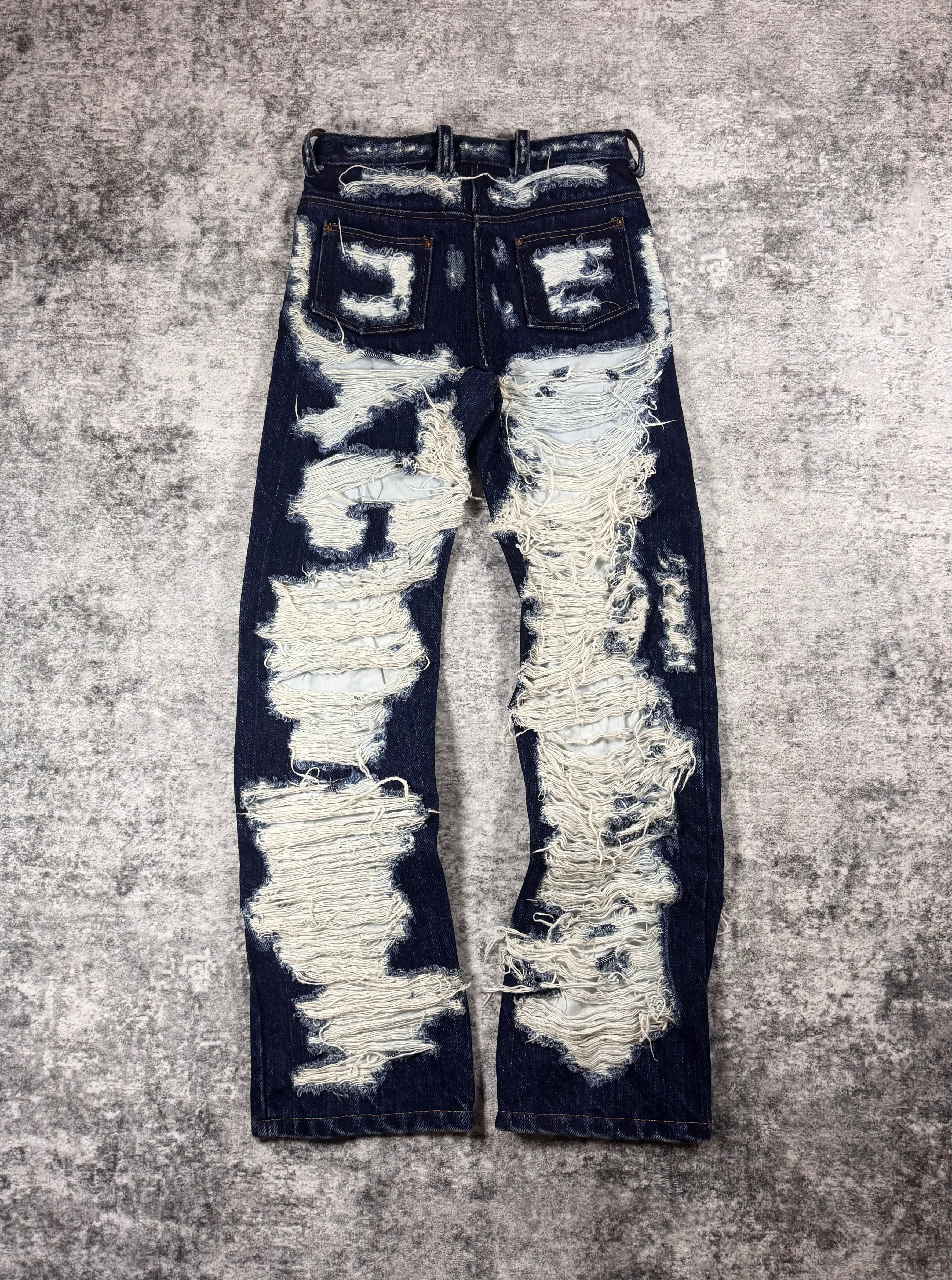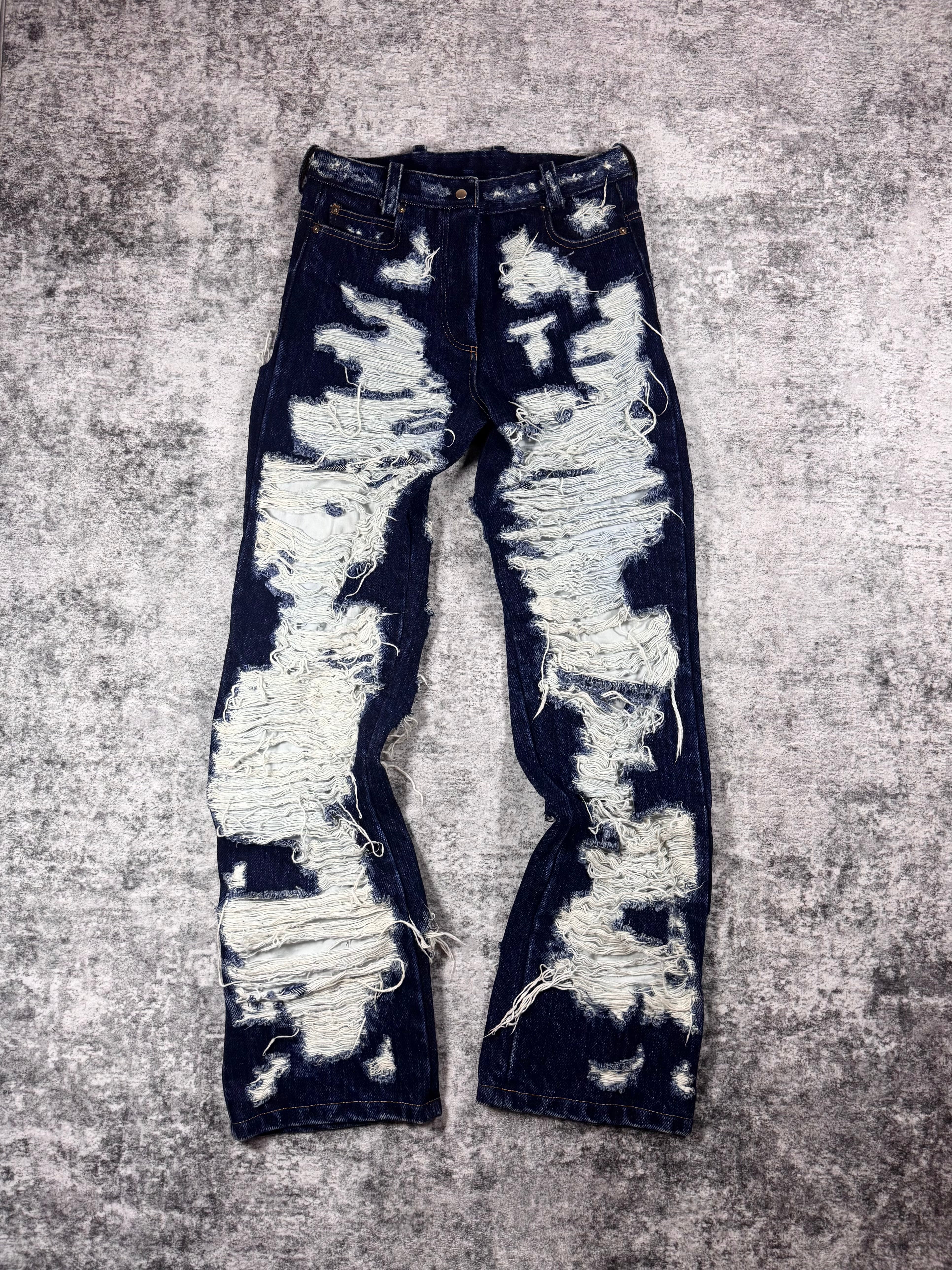 Extremely limited pair of Maison Margiela destroyed jeans from the Fall/Winter 2014 collection; crafted from raw indigo denim and defined by extreme horizontal distressing that exposes the underlying weft for a striking textural contrast. The aggressive abrasion creates layered, fabric-like panels while preserving the original structure of the denim, reflecting Margiela’s signature approach to controlled destruction. Designed as part of the mainline collection, the pair balances archival experimentation with everyday wearability. In top condition with no flaws or damages