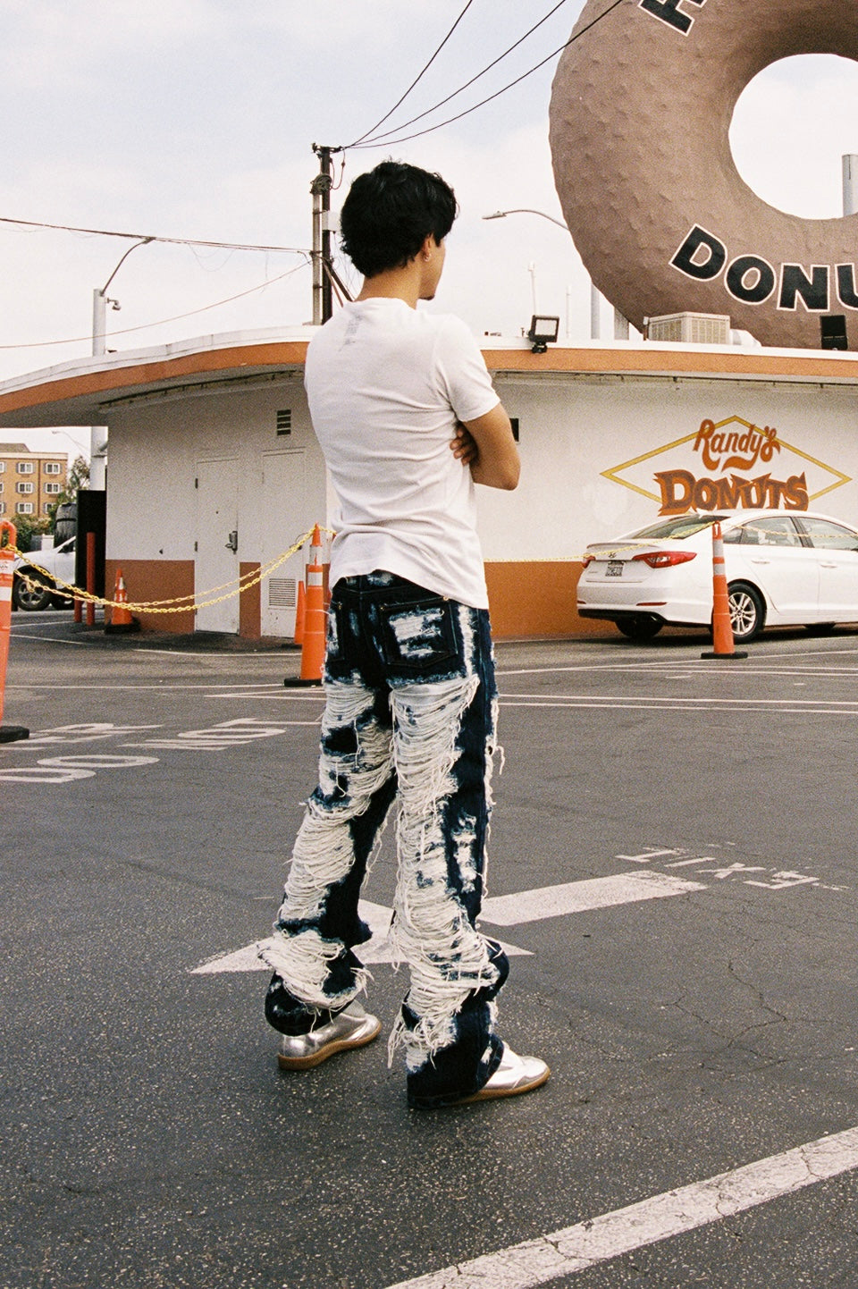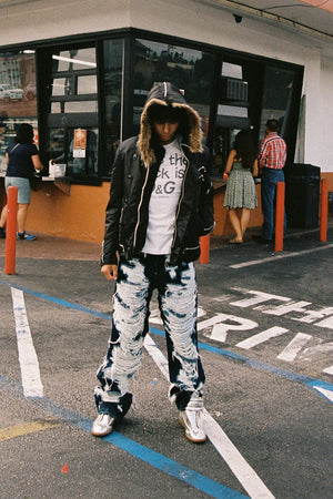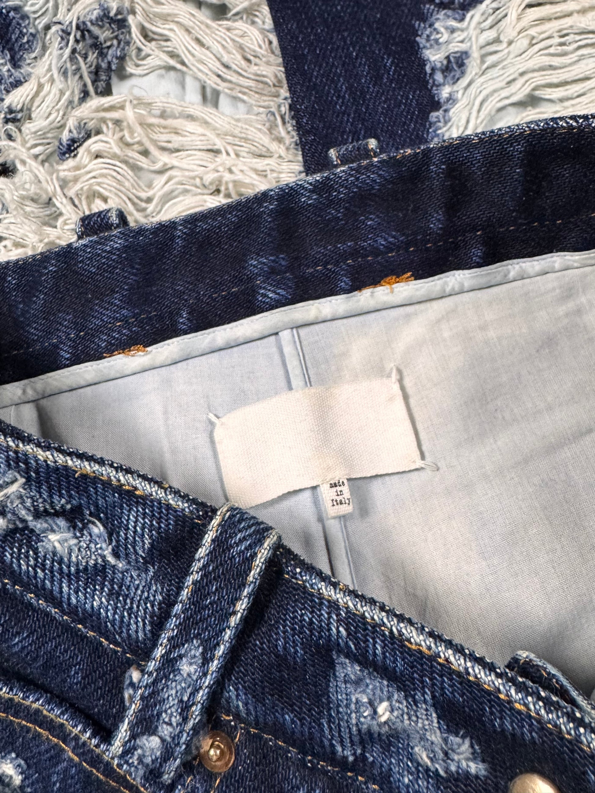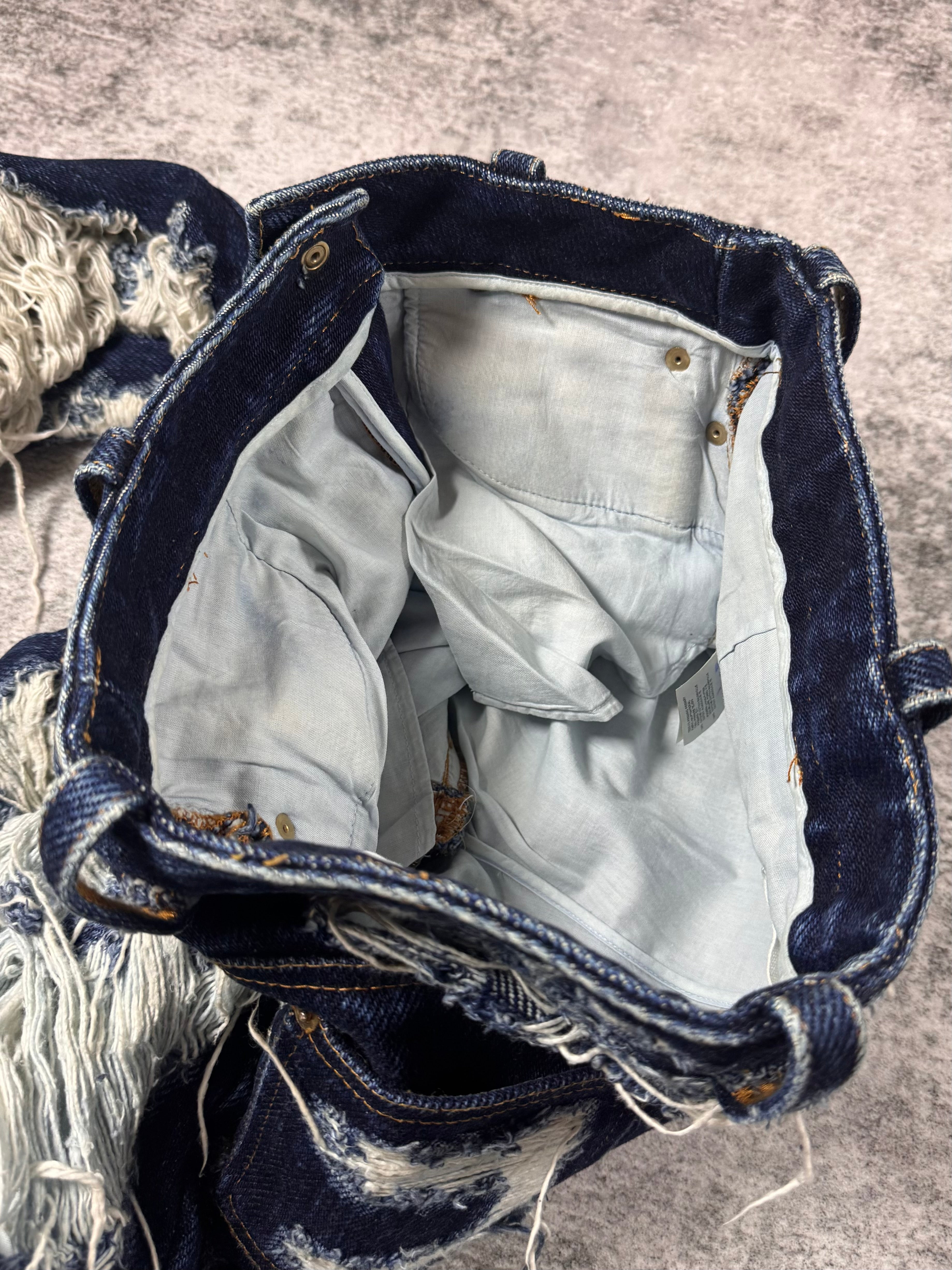 Extremely limited pair of Maison Margiela destroyed jeans from the Fall/Winter 2014 collection; crafted from raw indigo denim and defined by extreme horizontal distressing that exposes the underlying weft for a striking textural contrast. The aggressive abrasion creates layered, fabric-like panels while preserving the original structure of the denim, reflecting Margiela’s signature approach to controlled destruction. Designed as part of the mainline collection, the pair balances archival experimentation with everyday wearability. In top condition with no flaws or damages