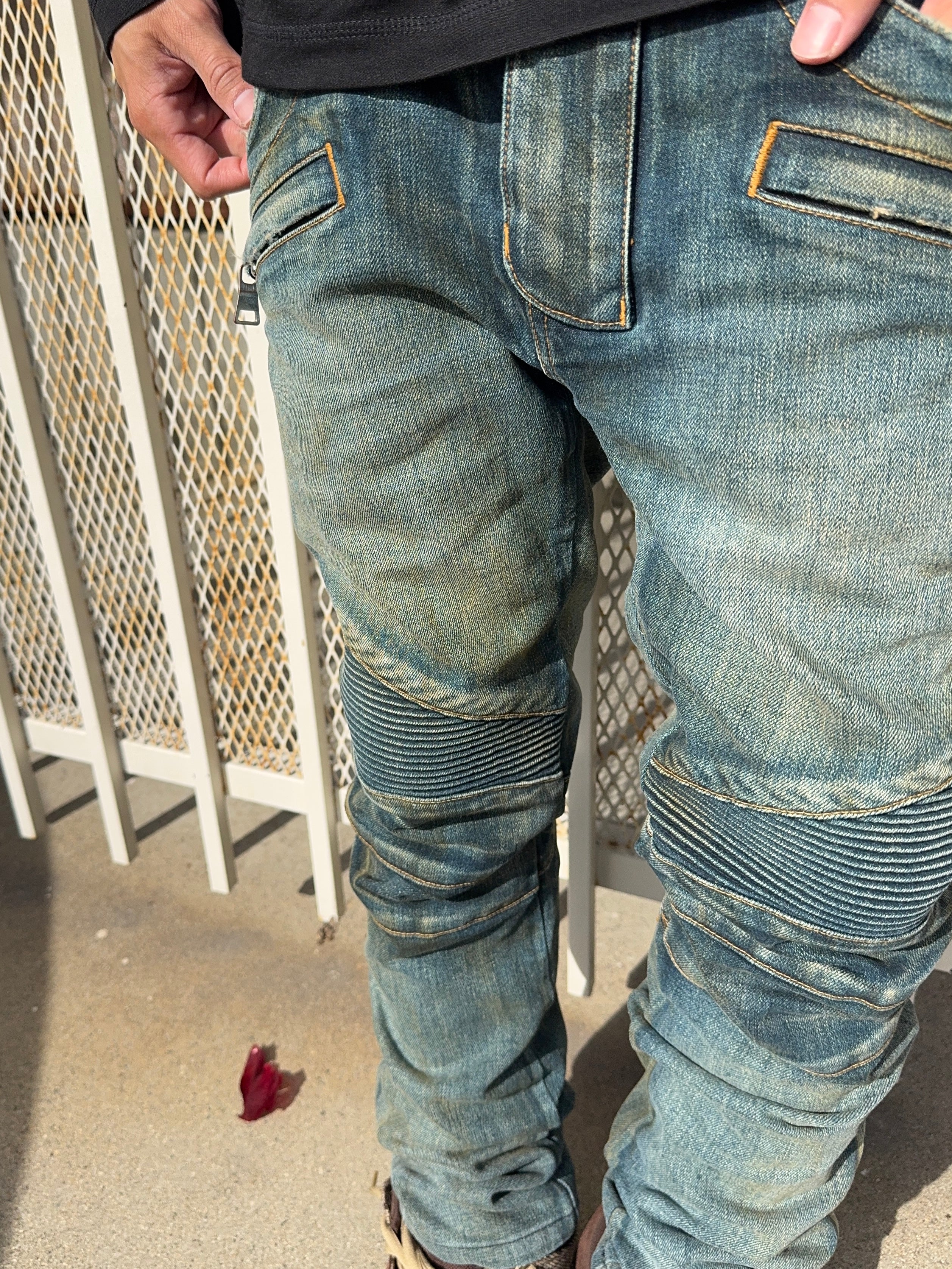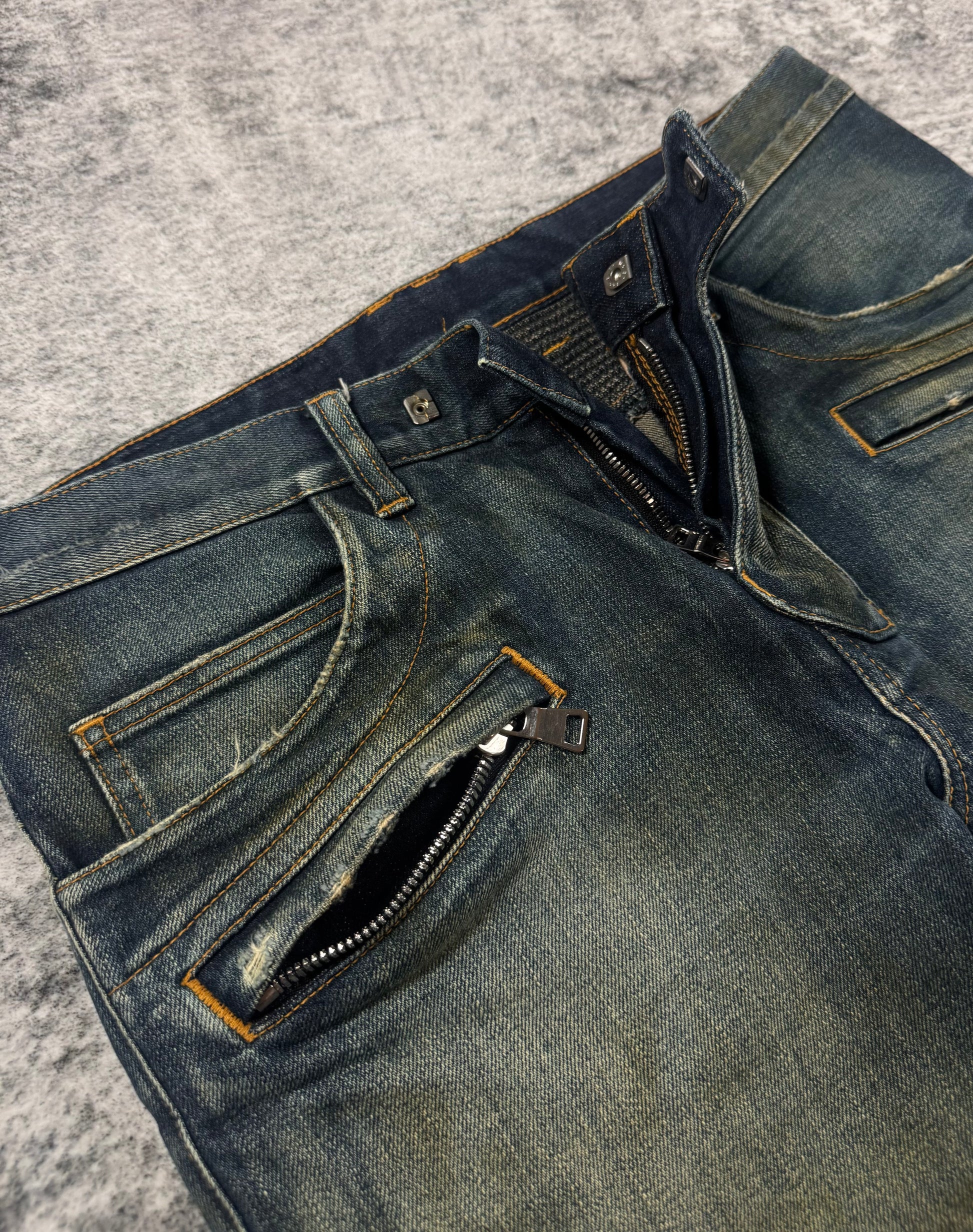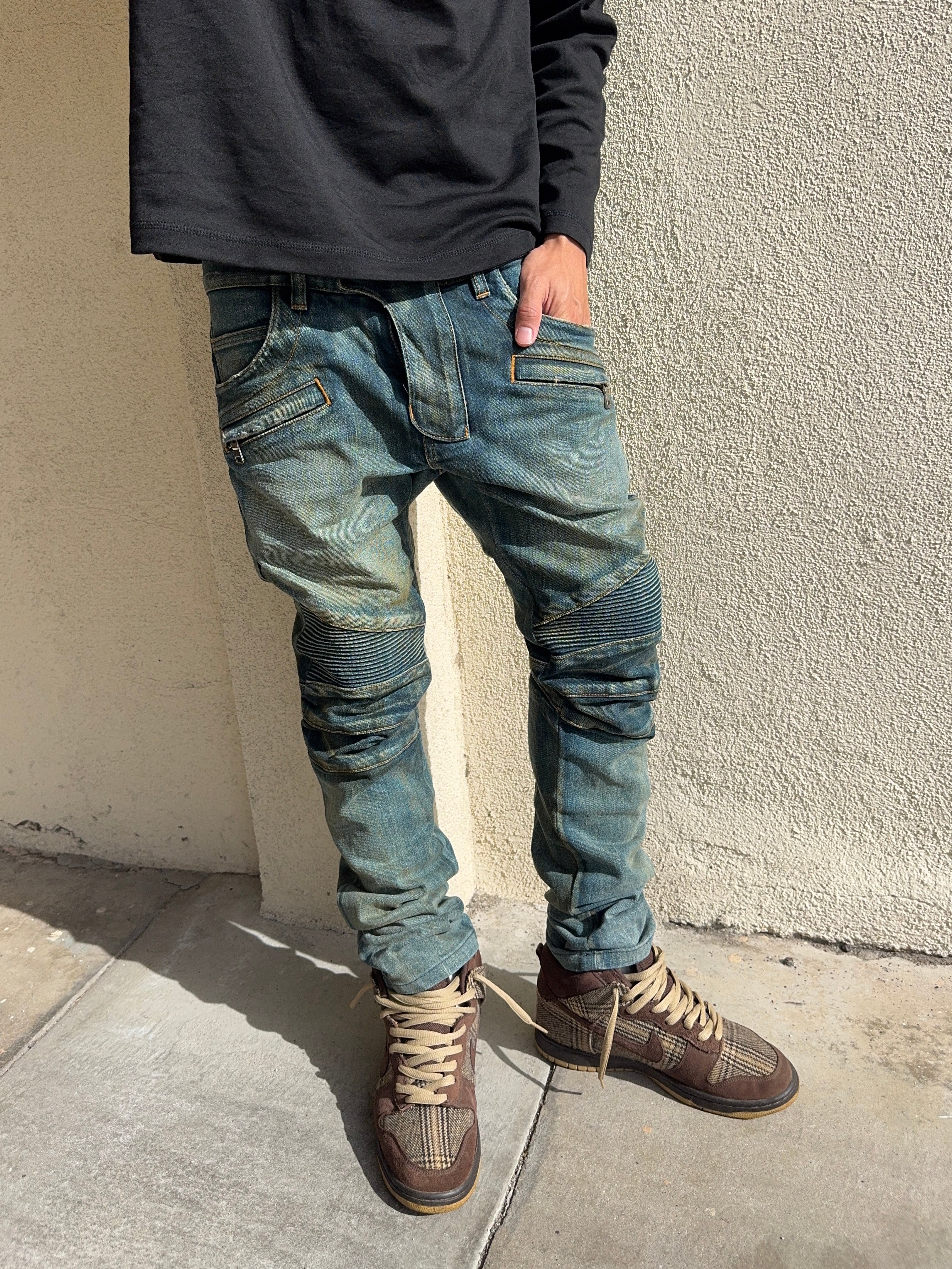 These Balmain Homme biker jeans from Fall/Winter 2015, designed under Olivier Rousteing, feature the house’s signature moto construction with ribbed accordion knee panels and zippered front pockets that sculpt a sharp, armored silhouette. Finished in a rich mud-washed indigo with earthy brown undertones and natural abrasion. While executed with Rousteing’s sleek, body-conscious precision, the design continues the aggressive, rock-driven biker language first introduced during Christophe Decarnin’s era. In excellent condition with no major flaws or damages