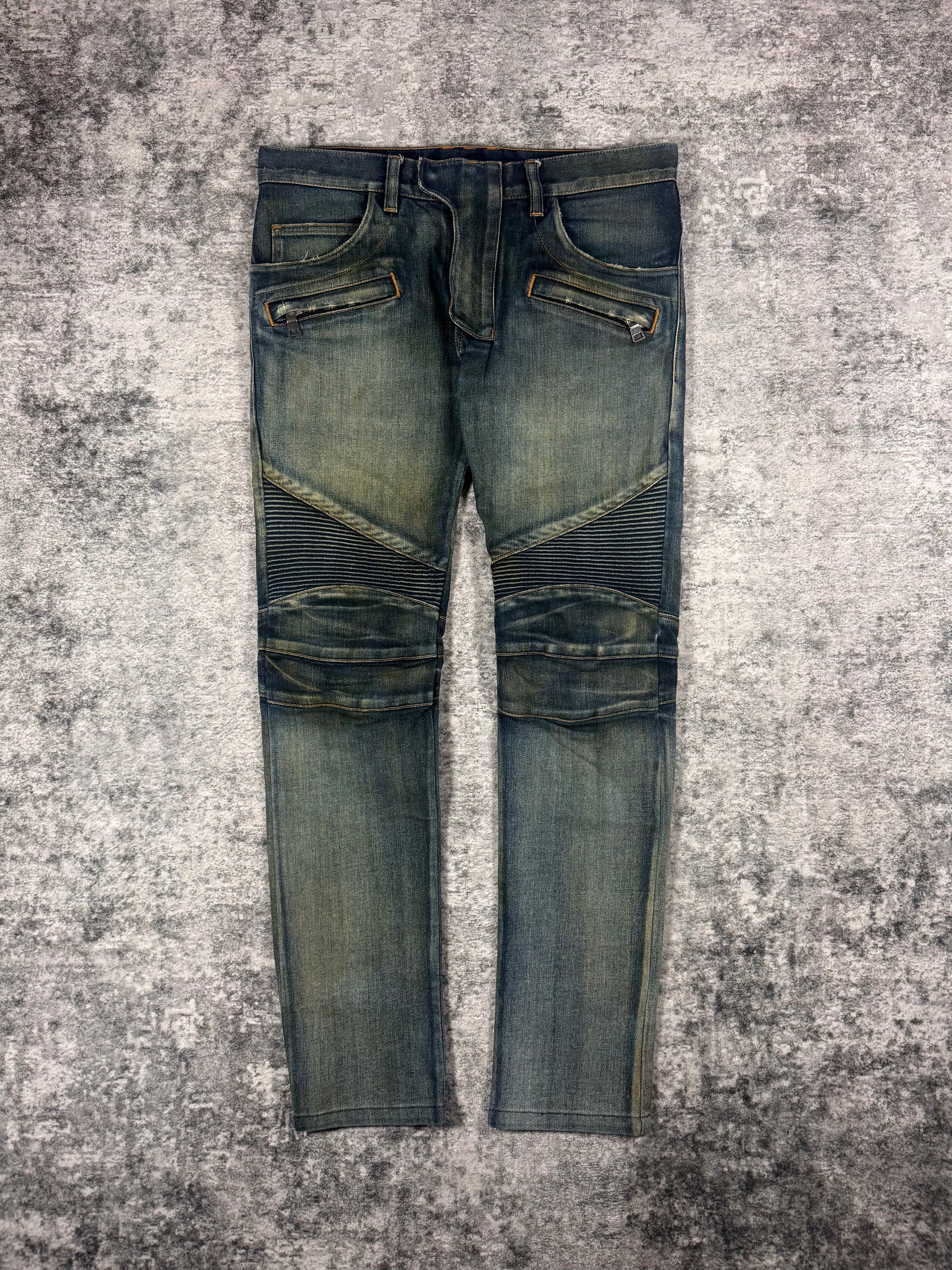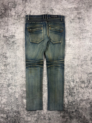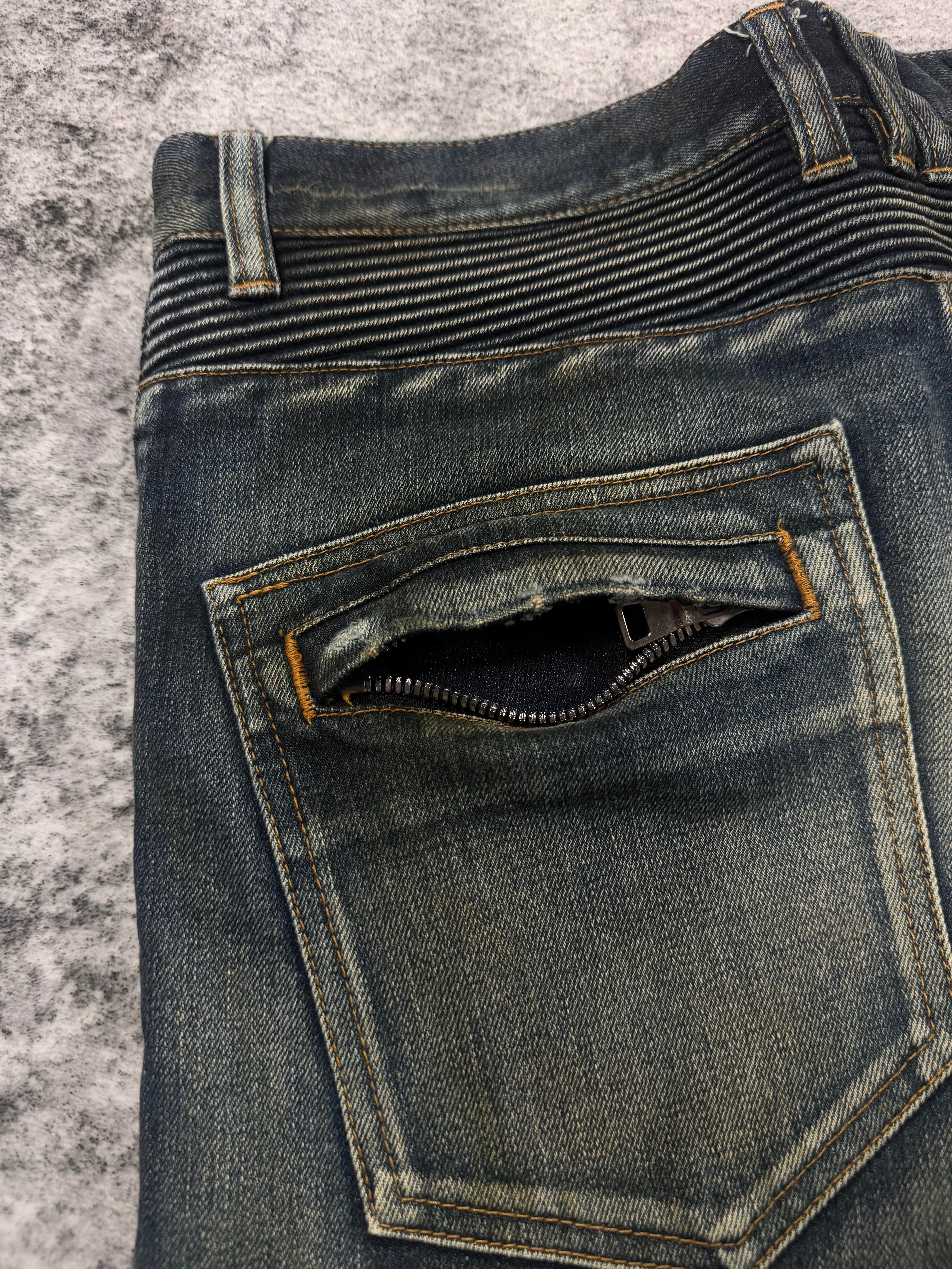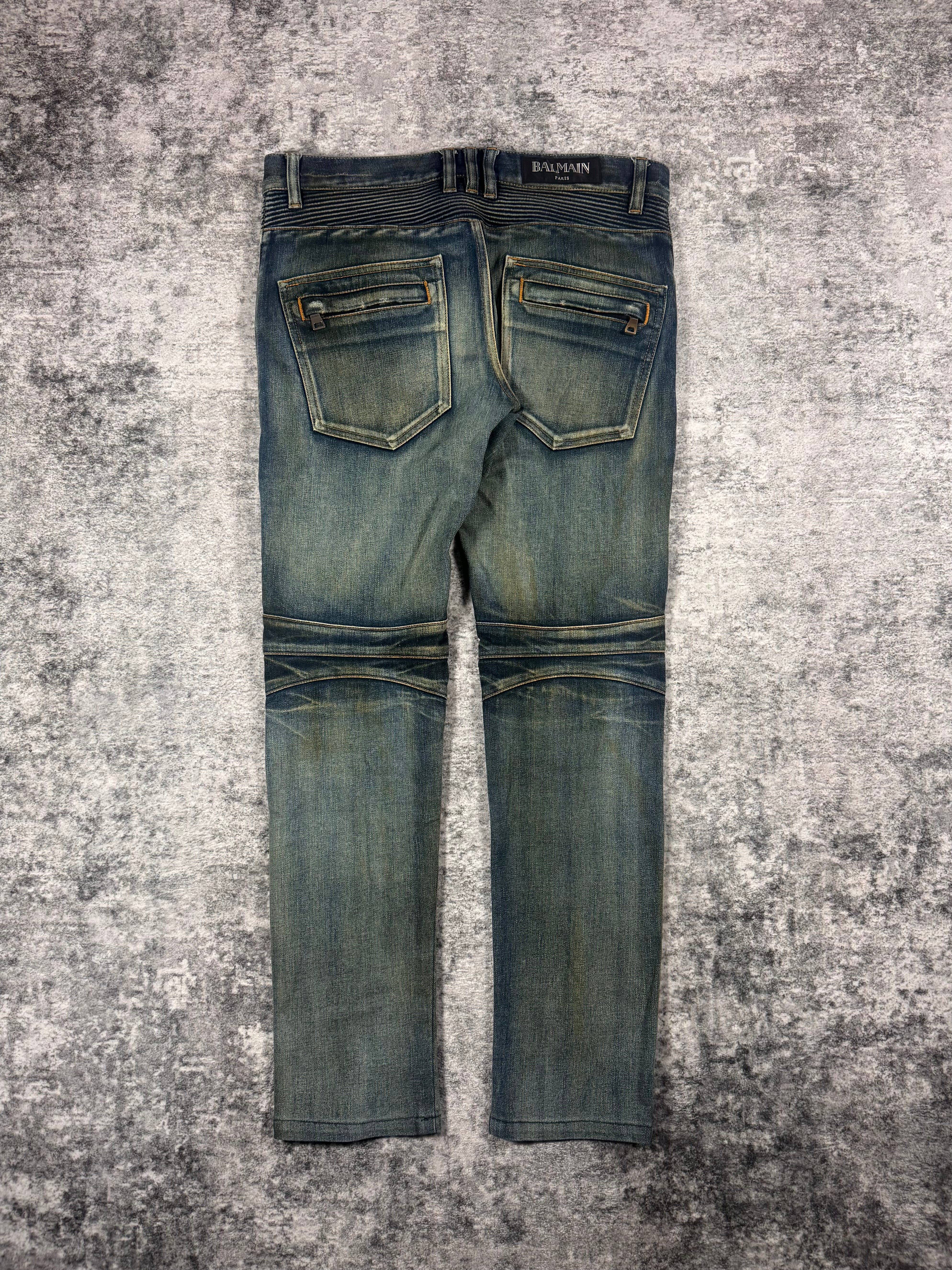 FW15 Balmain Homme Olivier Rousteing Indigo ‘Dirt Stain’ Biker Denim