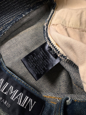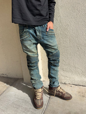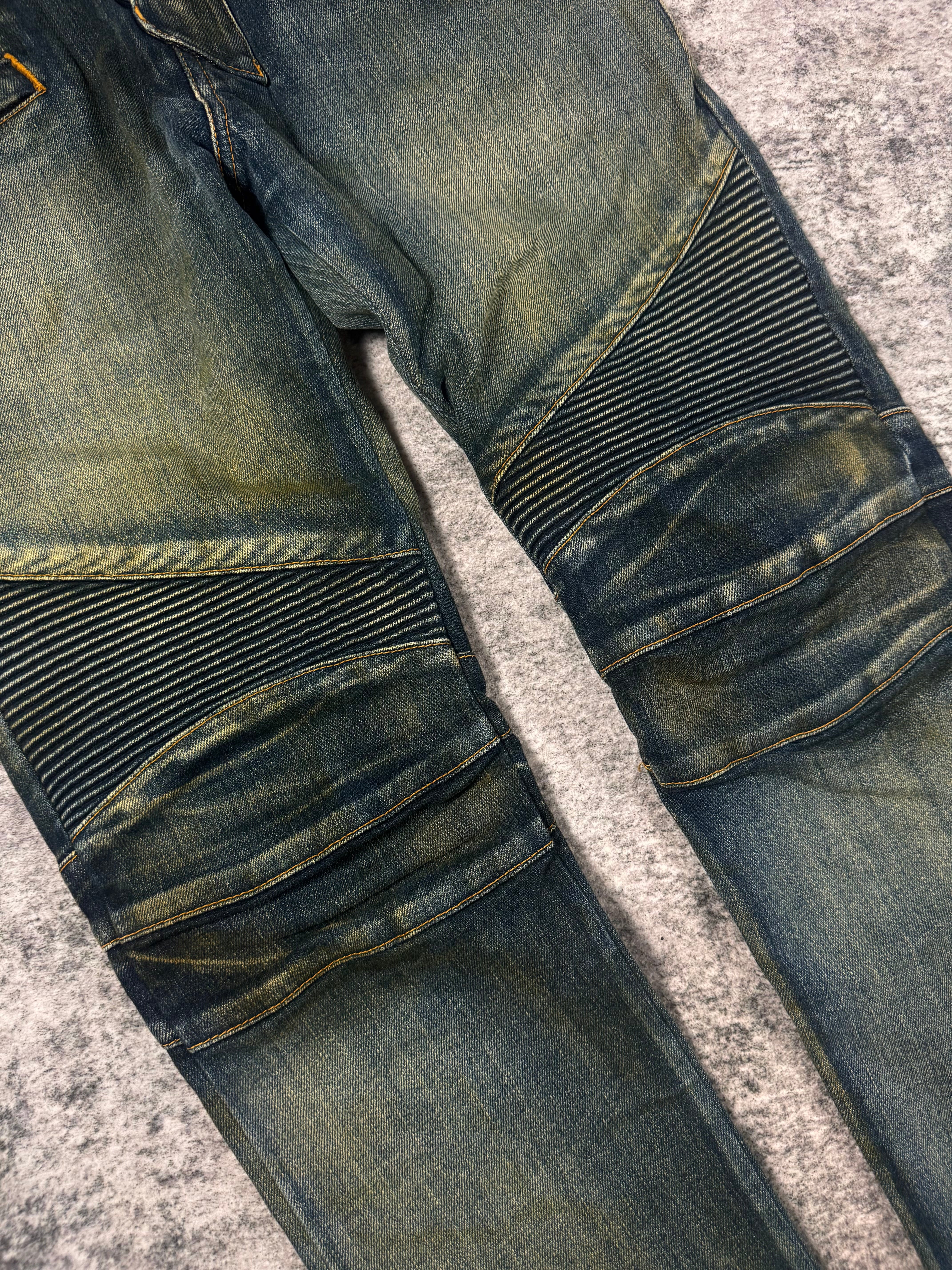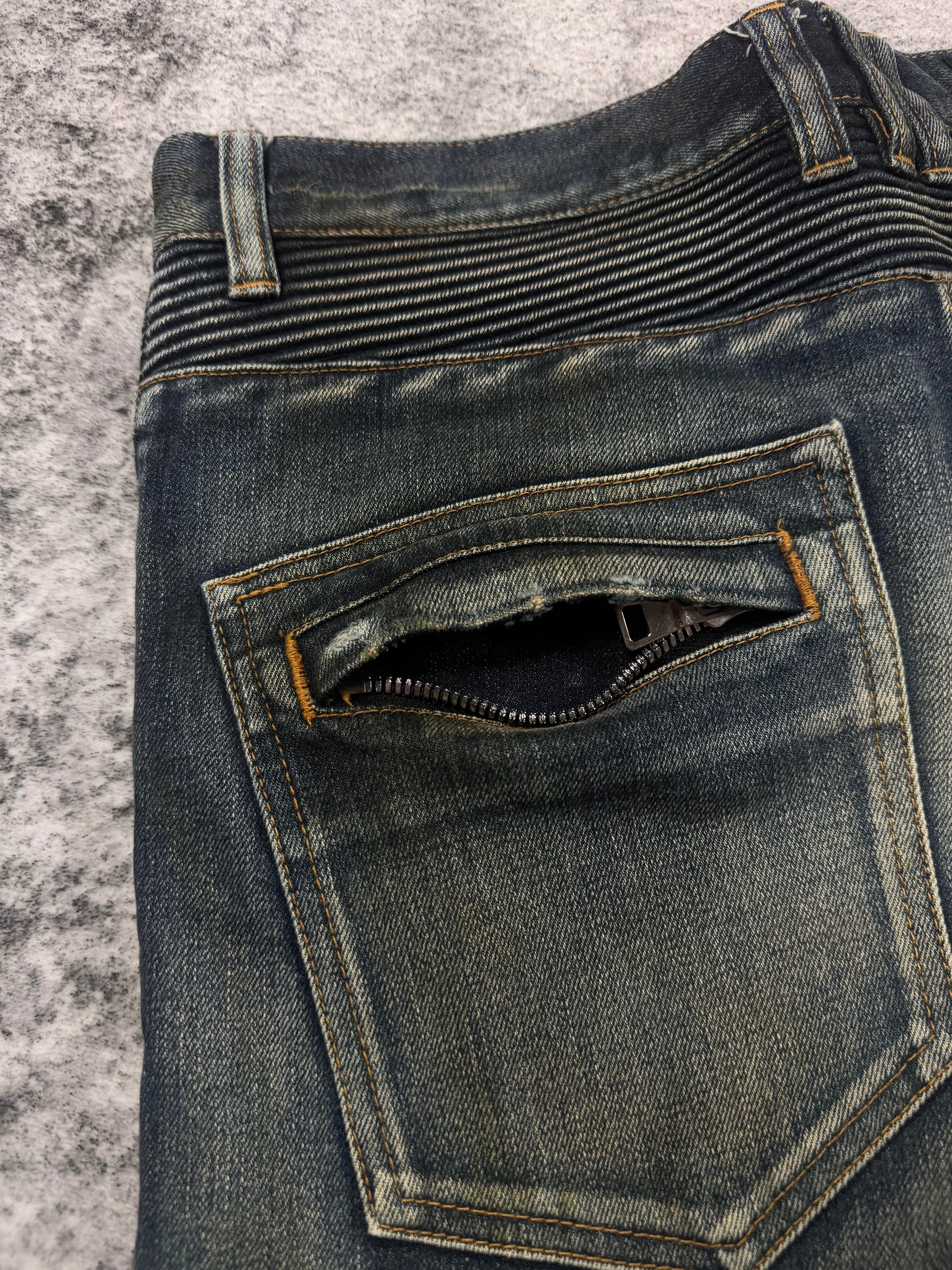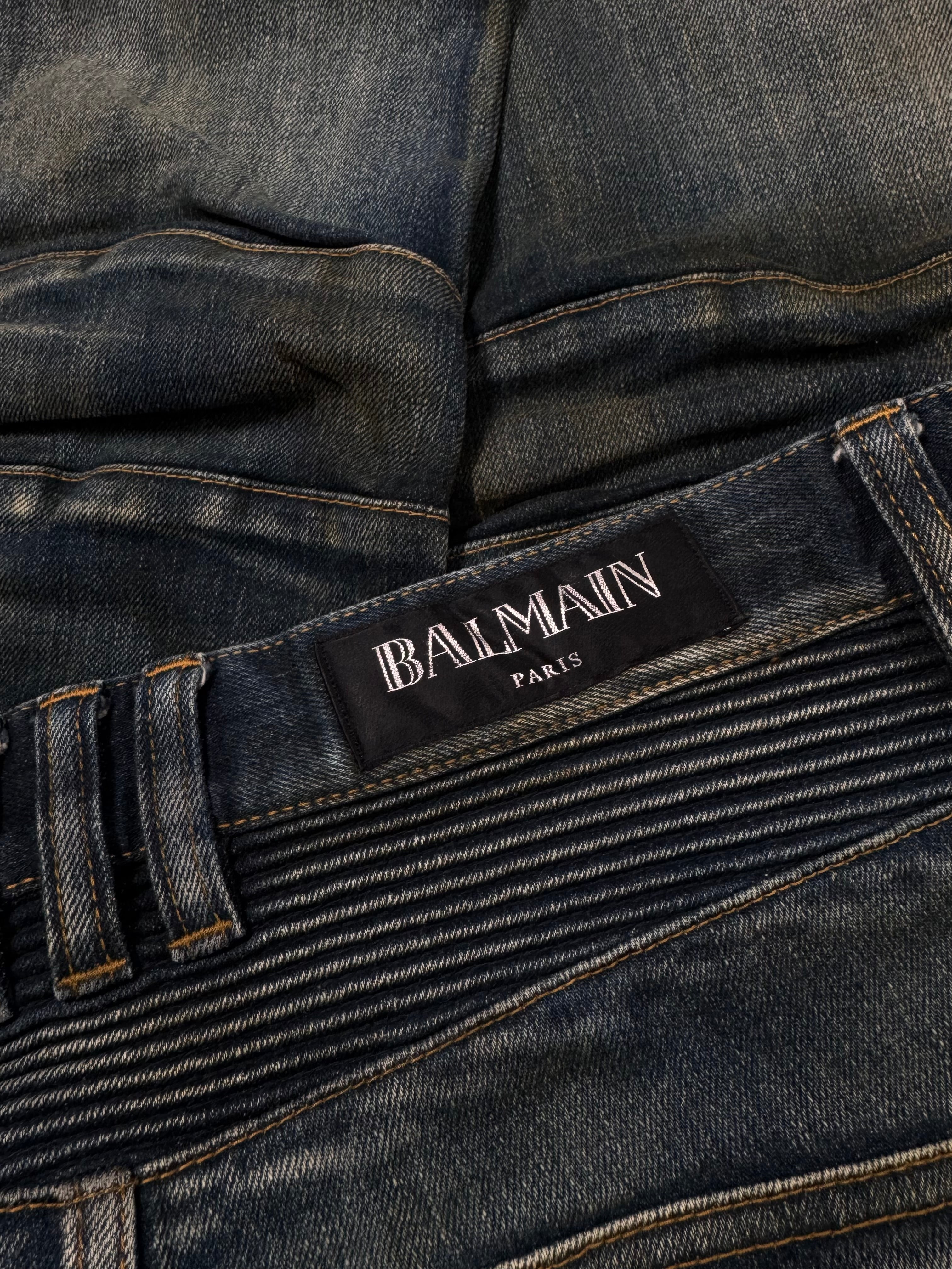 FW15 Balmain Homme Olivier Rousteing Indigo ‘Dirt Stain’ Biker Denim