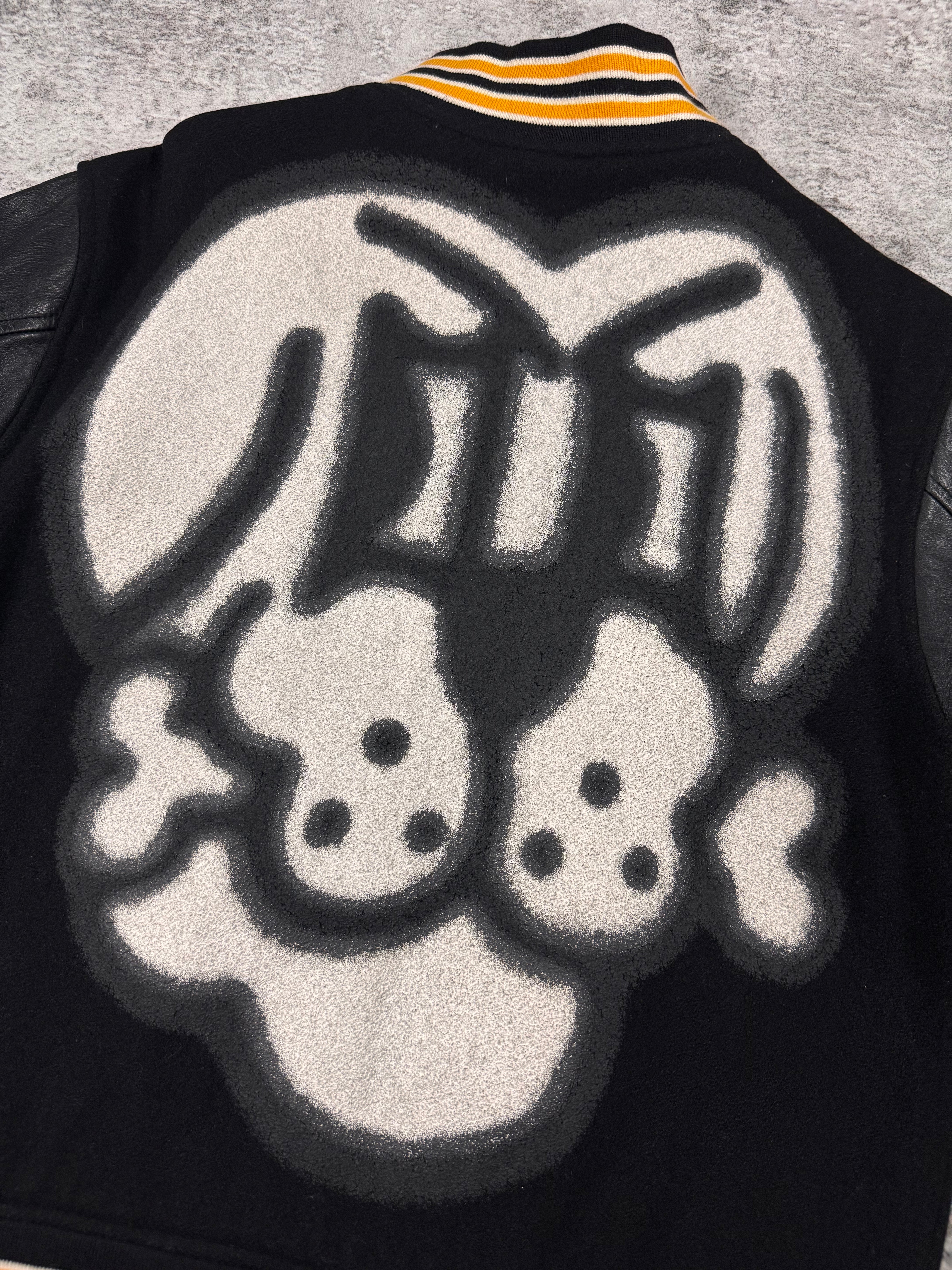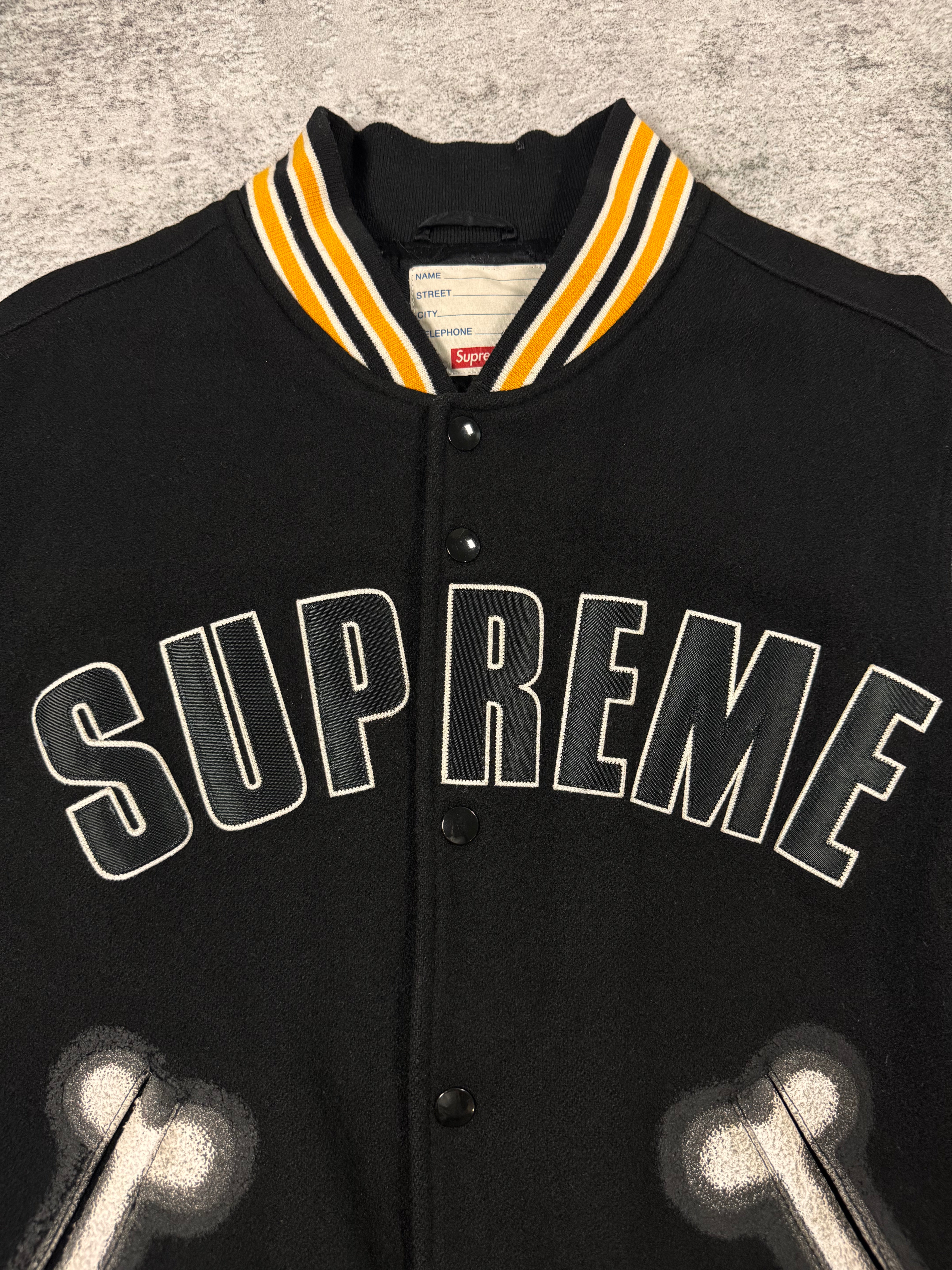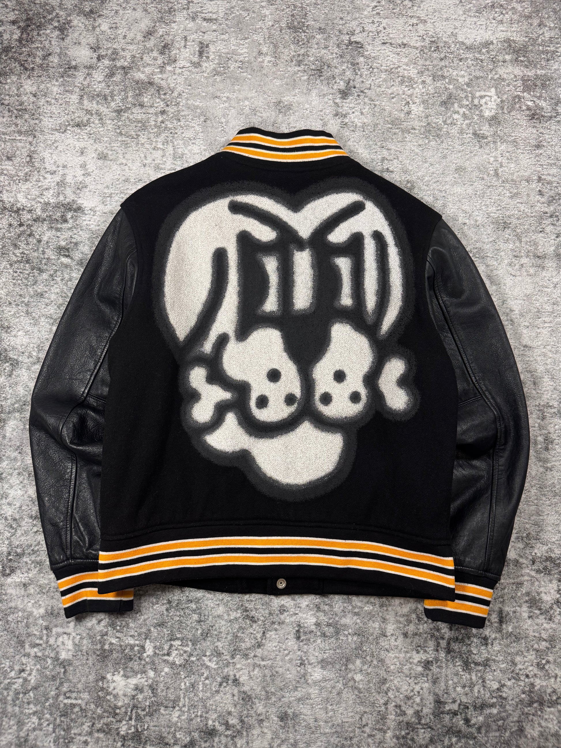 Gorgeous Supreme varsity jacket from the Fall/Winter 2018 collection, featuring graffiti artist Sancheeto’s (Chito) signature dog artwork across the back. The front showcases an embroidered Supreme logo on the chest, complemented by Chito’s bone motifs layered over the front pockets for added character. Crafted in classic varsity construction with premium materials, this piece captures the playful, street-leaning aesthetic of the collaboration. In magnificent condition with no flaws or major signs of wear