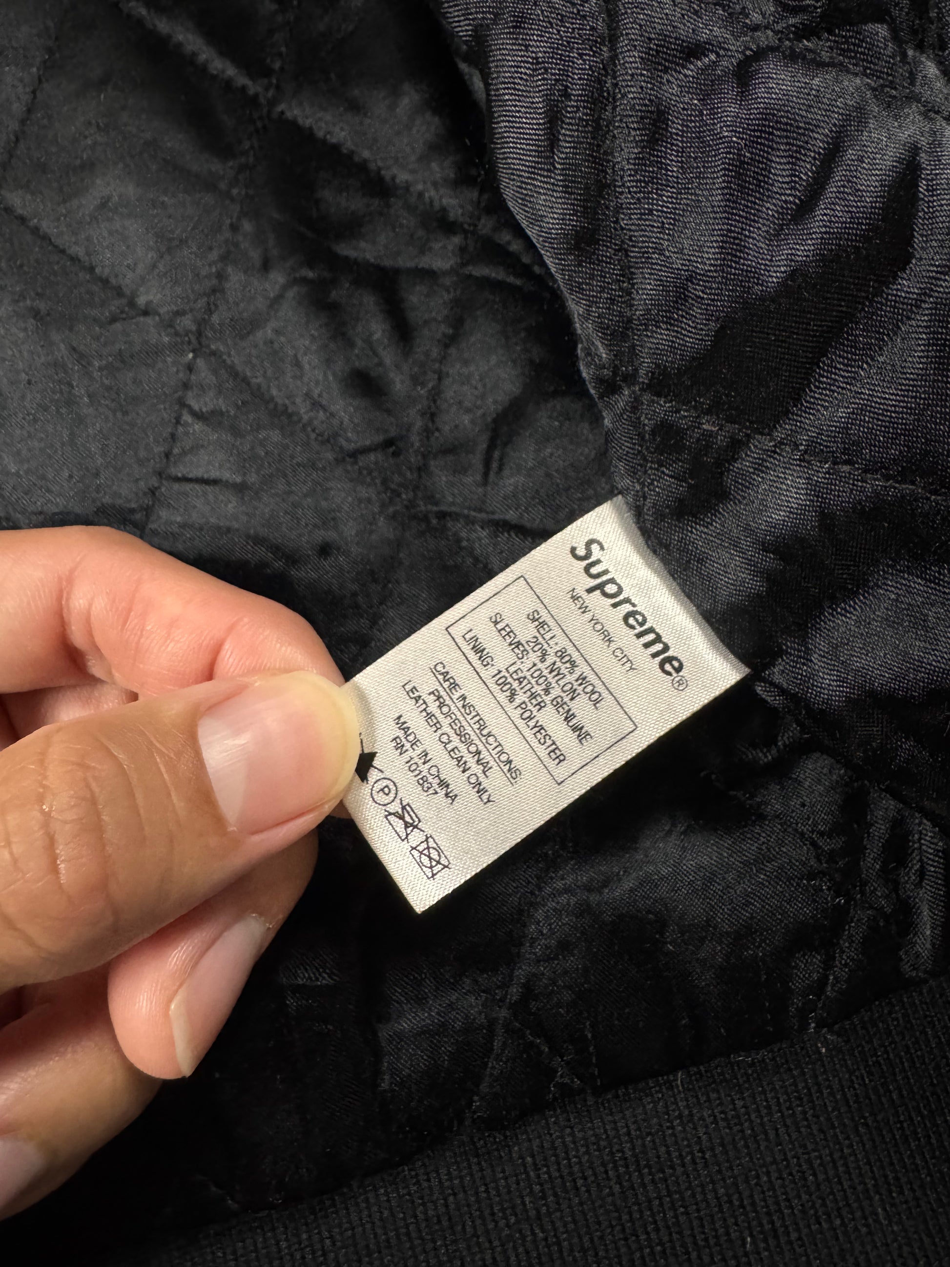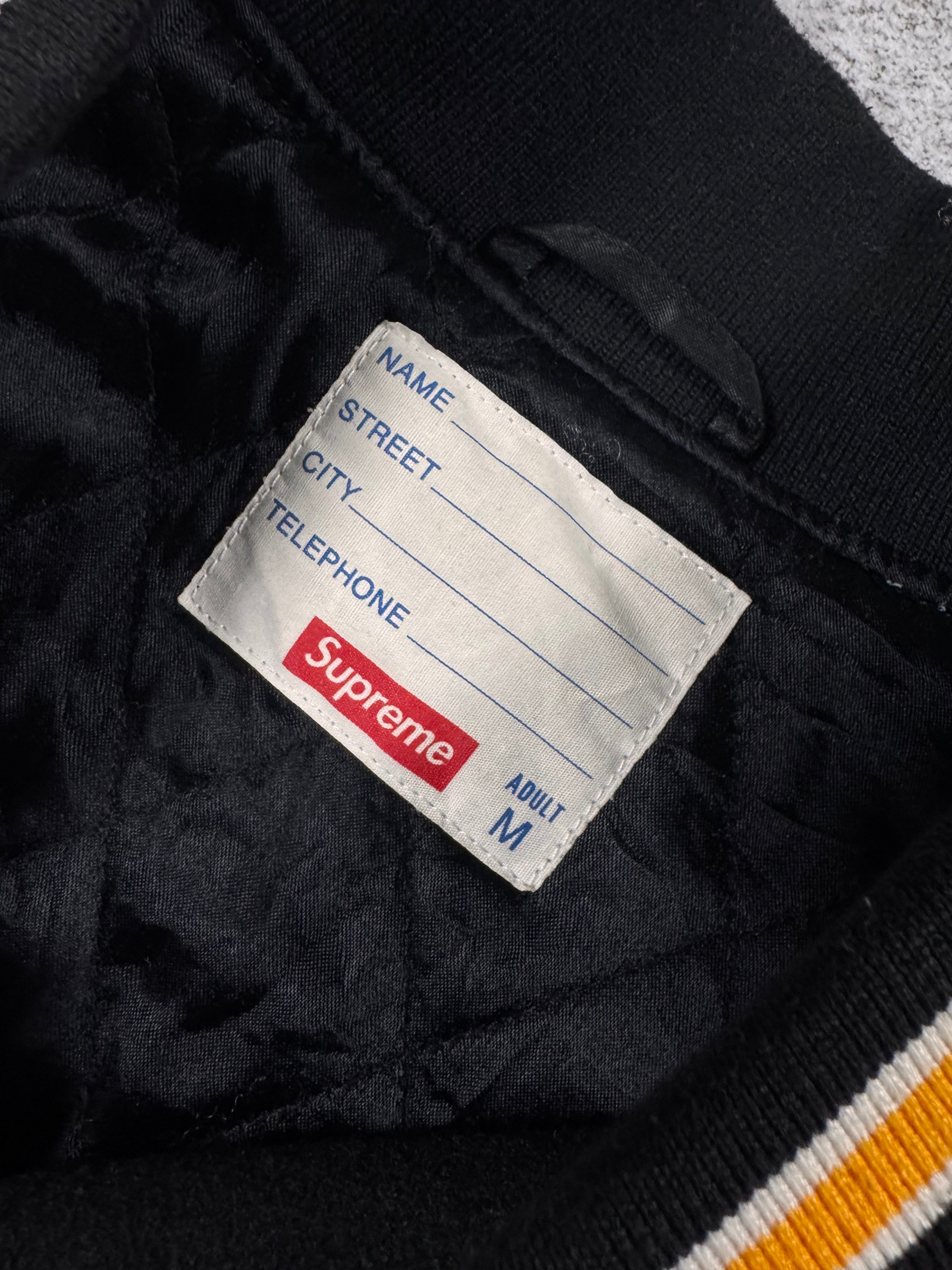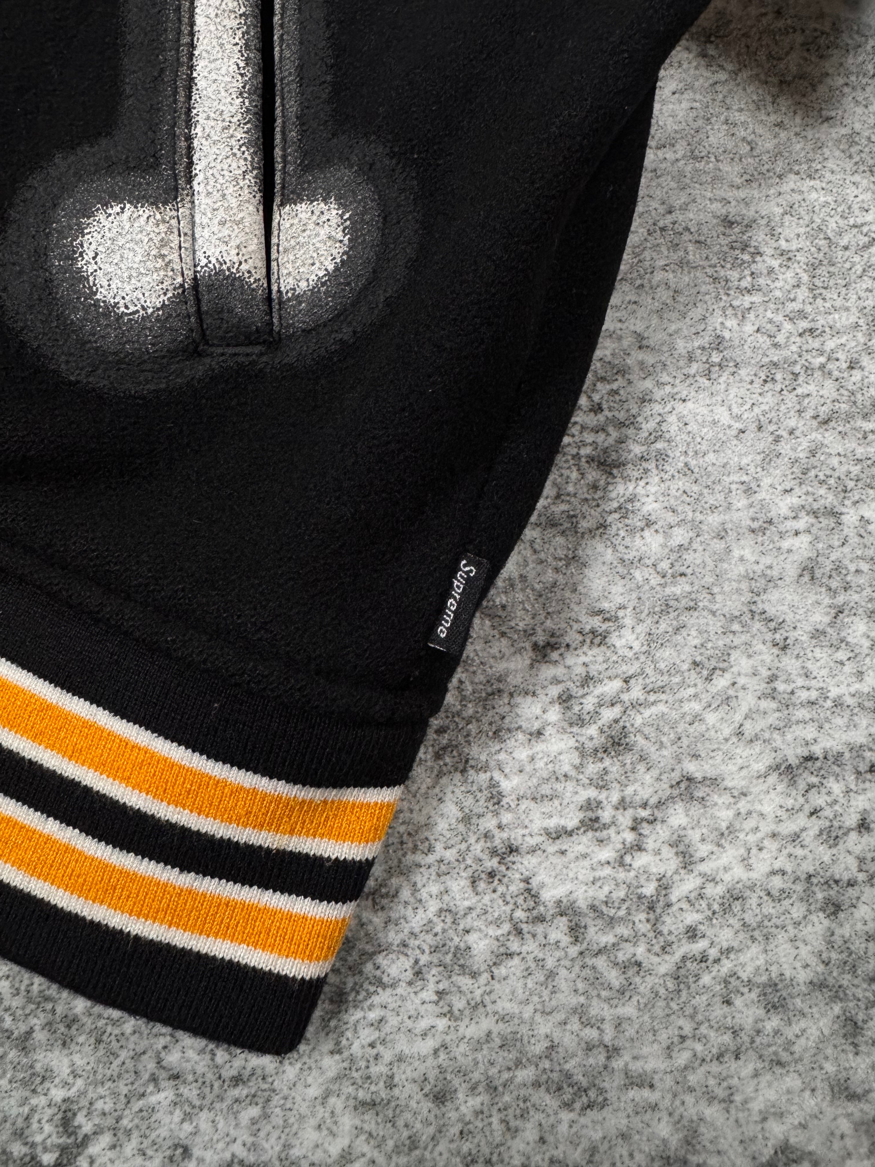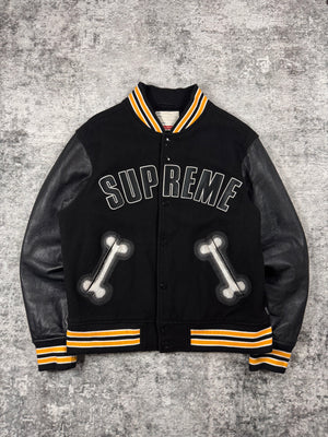 Gorgeous Supreme varsity jacket from the Fall/Winter 2018 collection, featuring graffiti artist Sancheeto’s (Chito) signature dog artwork across the back. The front showcases an embroidered Supreme logo on the chest, complemented by Chito’s bone motifs layered over the front pockets for added character. Crafted in classic varsity construction with premium materials, this piece captures the playful, street-leaning aesthetic of the collaboration. In magnificent condition with no flaws or major signs of wear