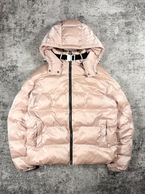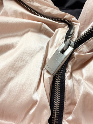 A standout 1017 ALYX 9SM Night Rider puffer from the FW19 collection, executed in a soft blush nylon with a subtle sheen. The piece features Matthew Williams’ signature rollercoaster buckle integrated into the hood, blending utilitarian function with distinct visual identity. A defining outerwear piece from early ALYX runway-era design language. Maintains good overall condition—visible damage to inner collar lining, fraying and distressing from aging.