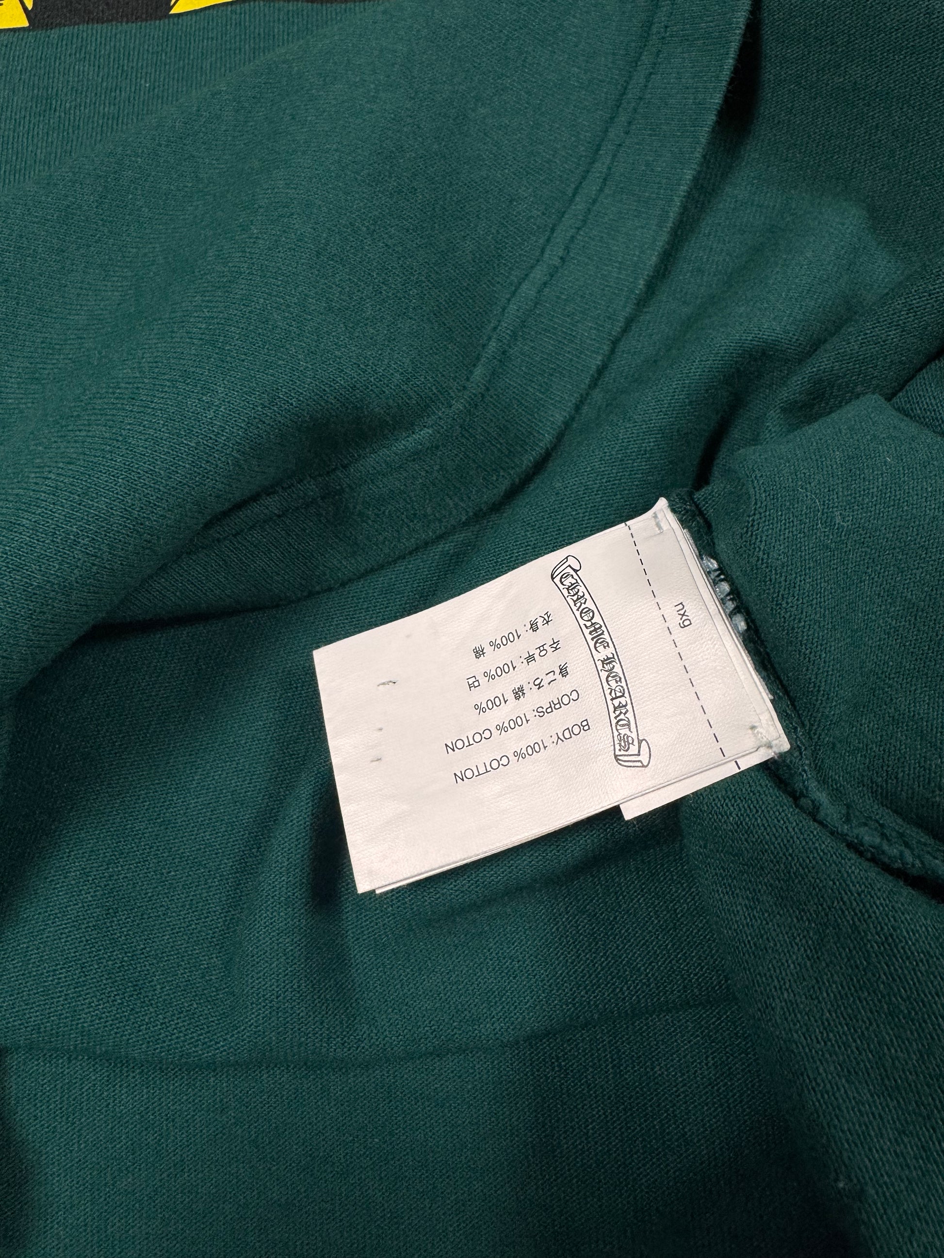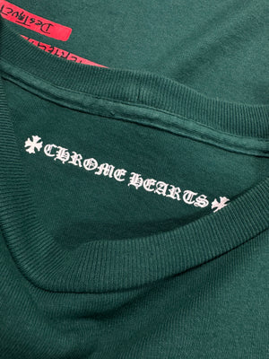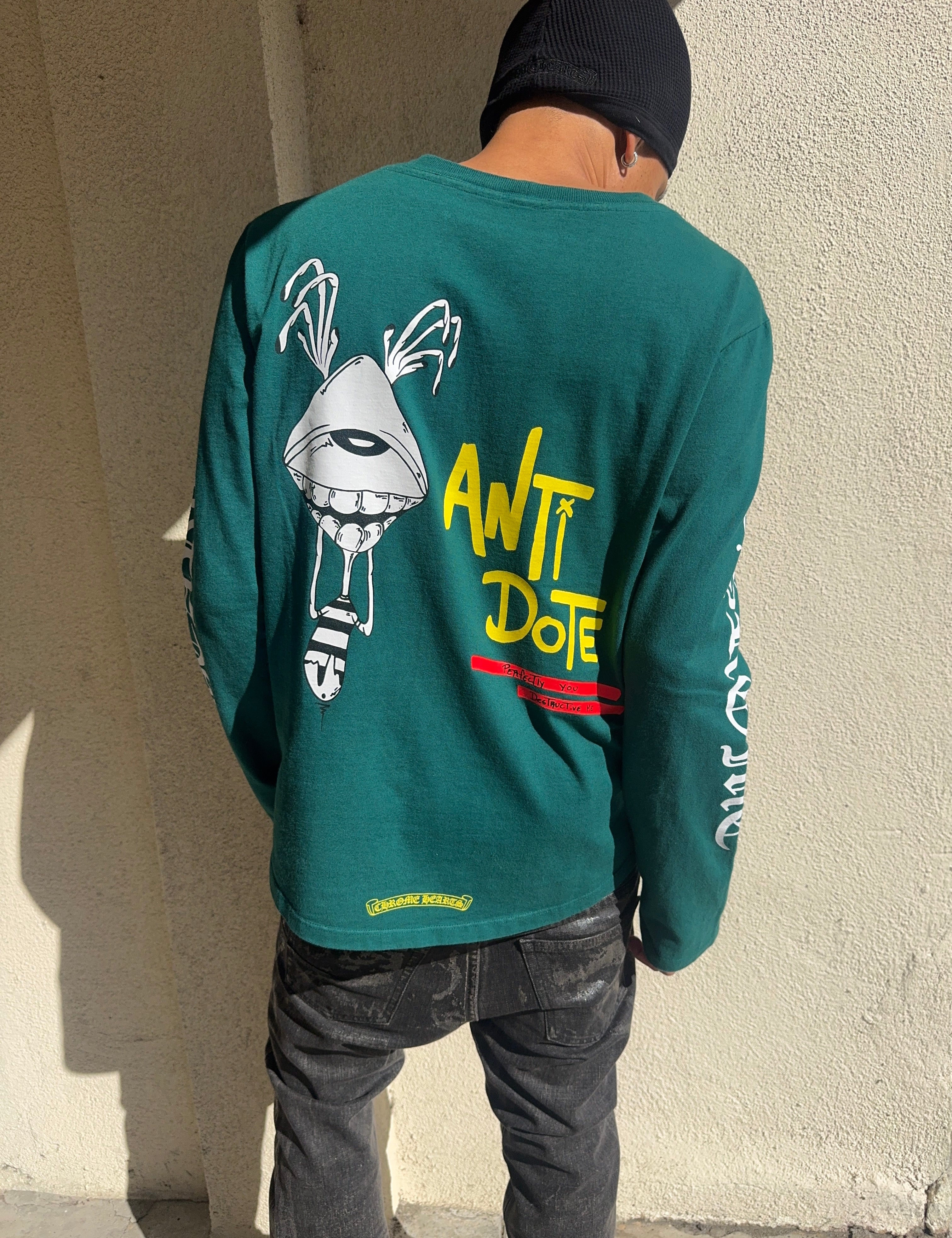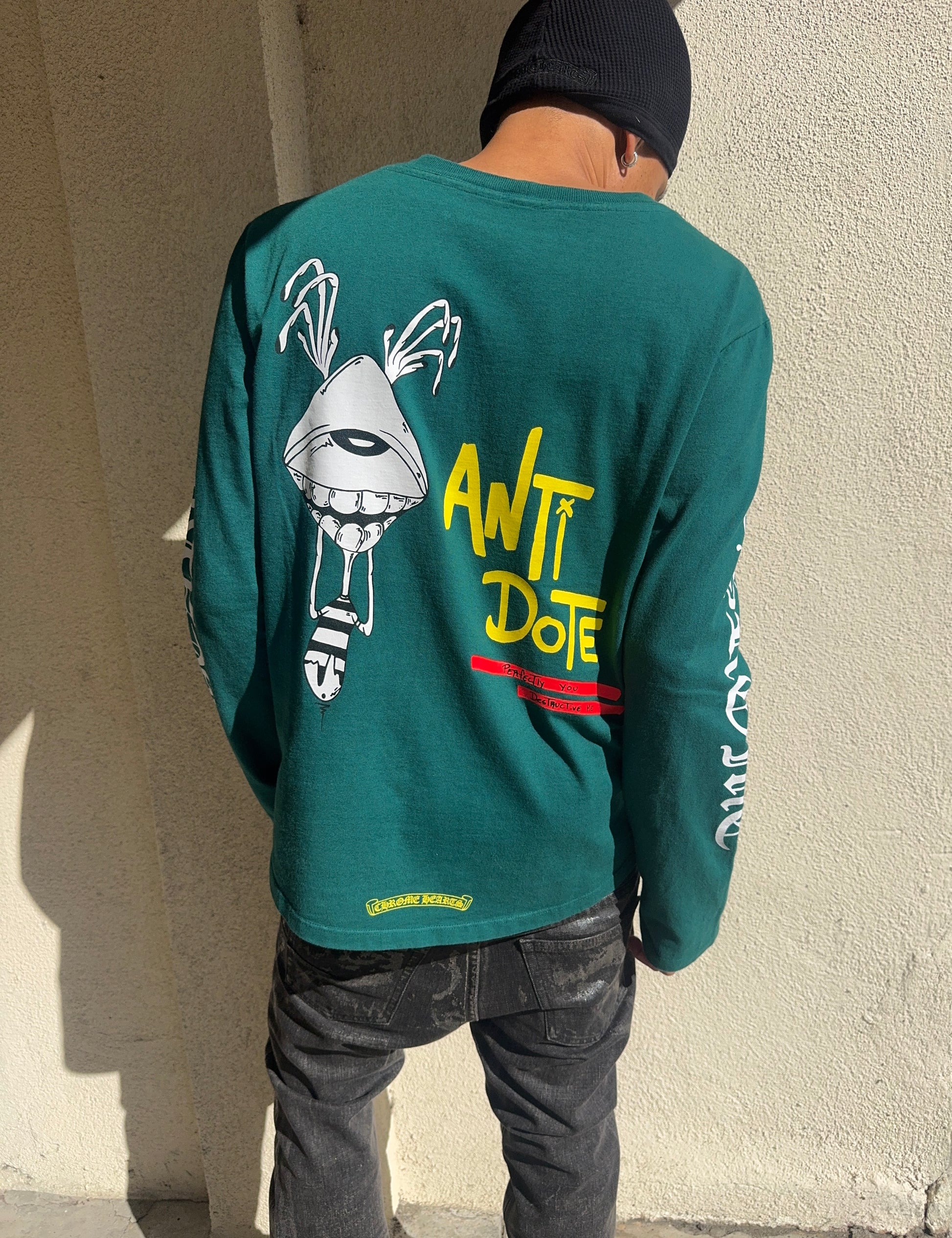 Rare Chrome Hearts Matty Boy line piece released in the Fall/Winter 2019 collection. Features bold hand-drawn graphics across a deep green cotton base, highlighted by the signature ‘Antidote’ text and surreal character artwork on the back. Gothic Chrome Hearts lettering runs down both sleeves, as well as the ‘99 Eyes’ checkered banner going across the chest. In brilliant condition with no major flaws (minor unnoticeable stain on sleeve)