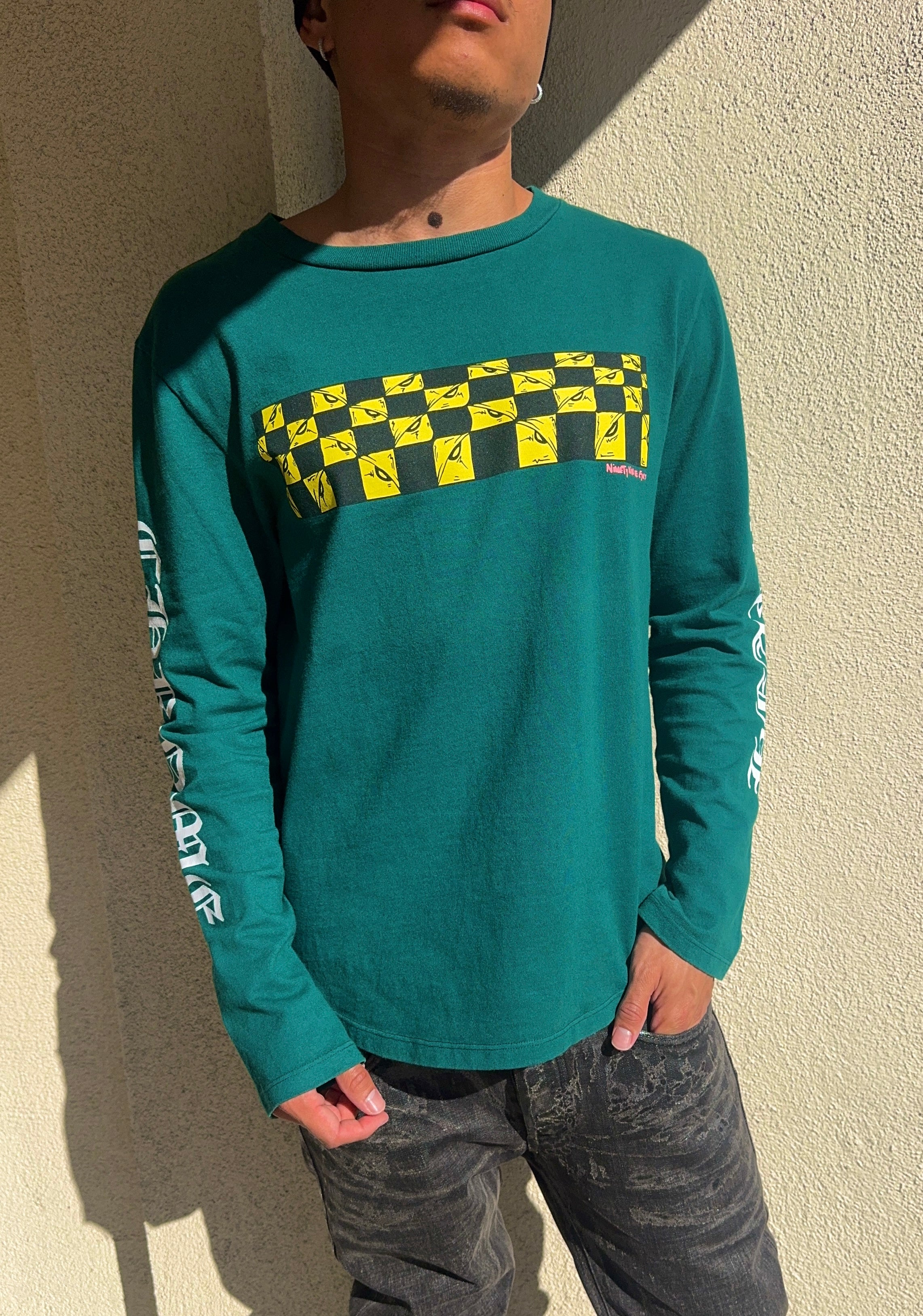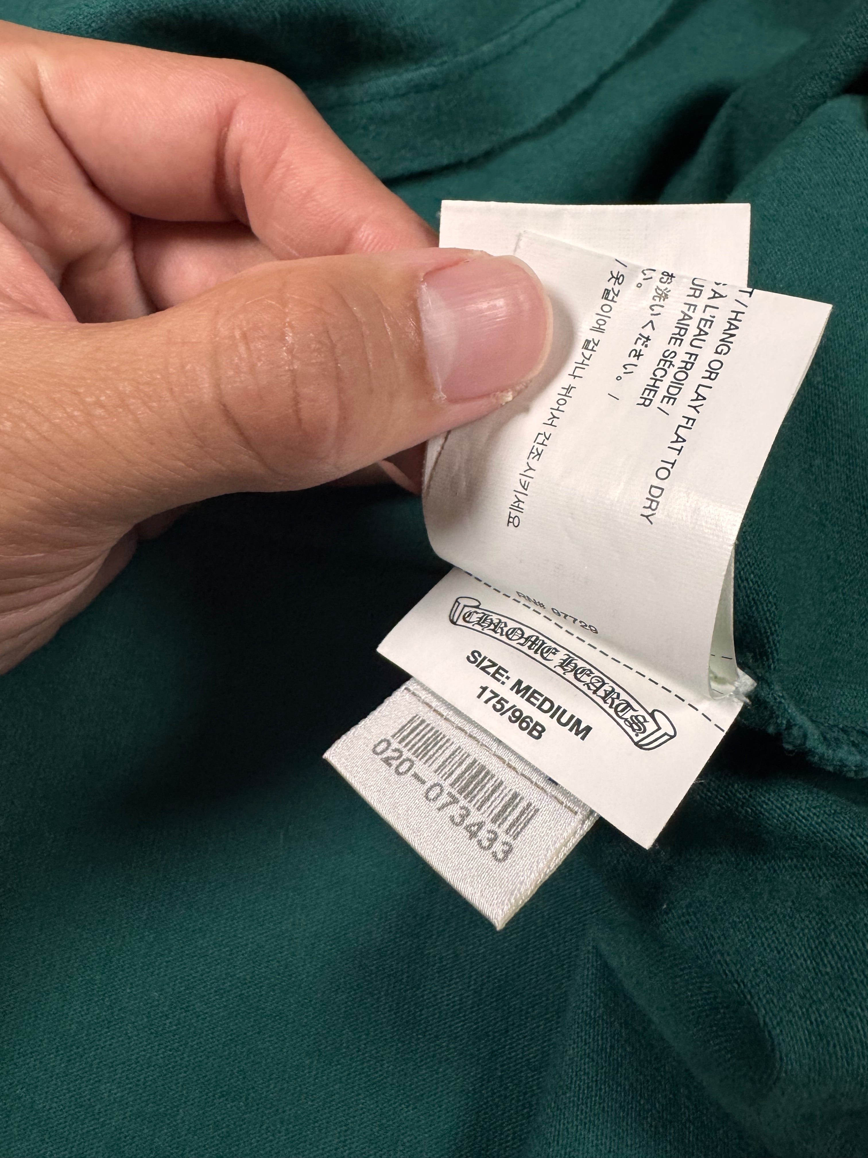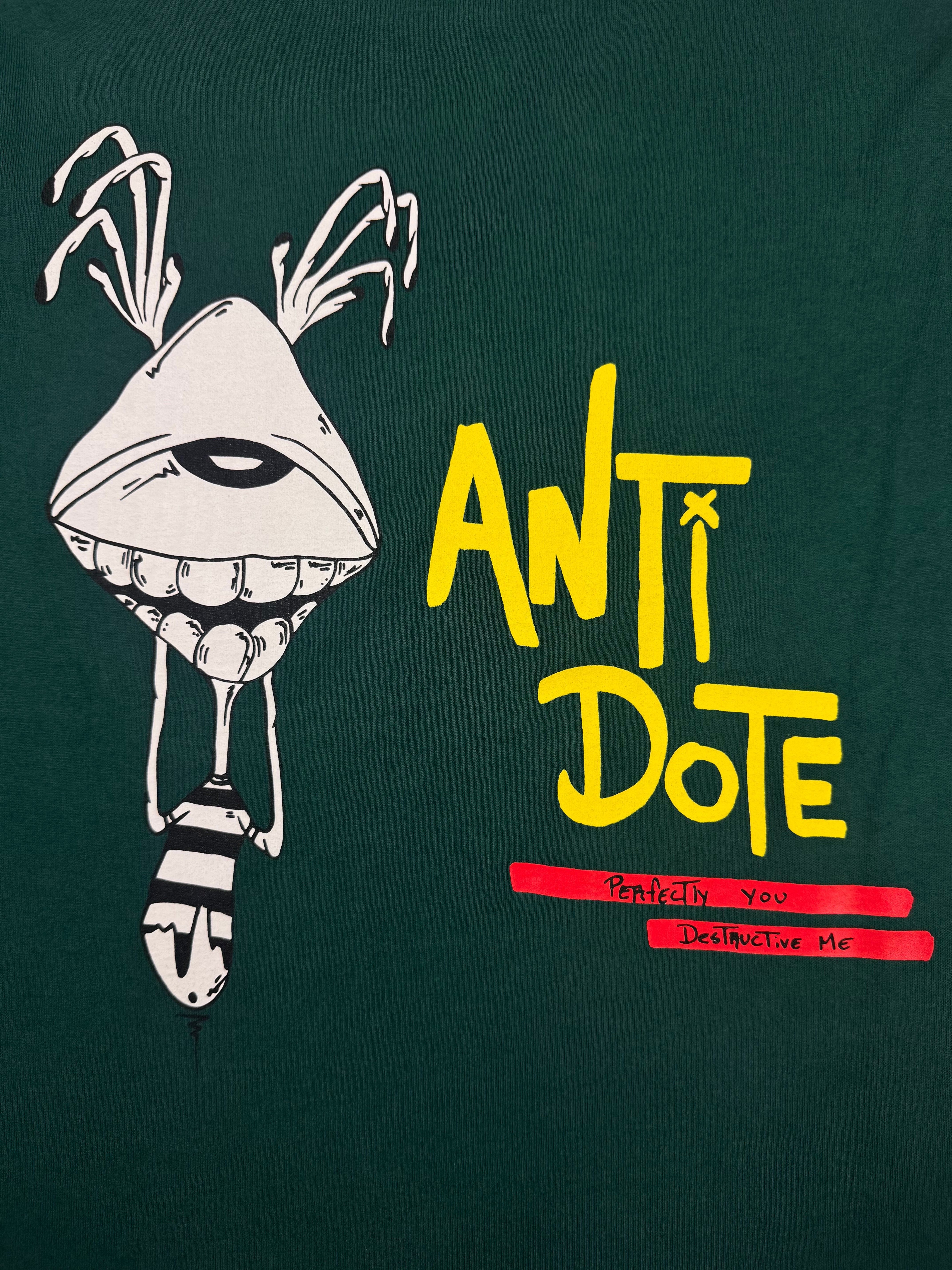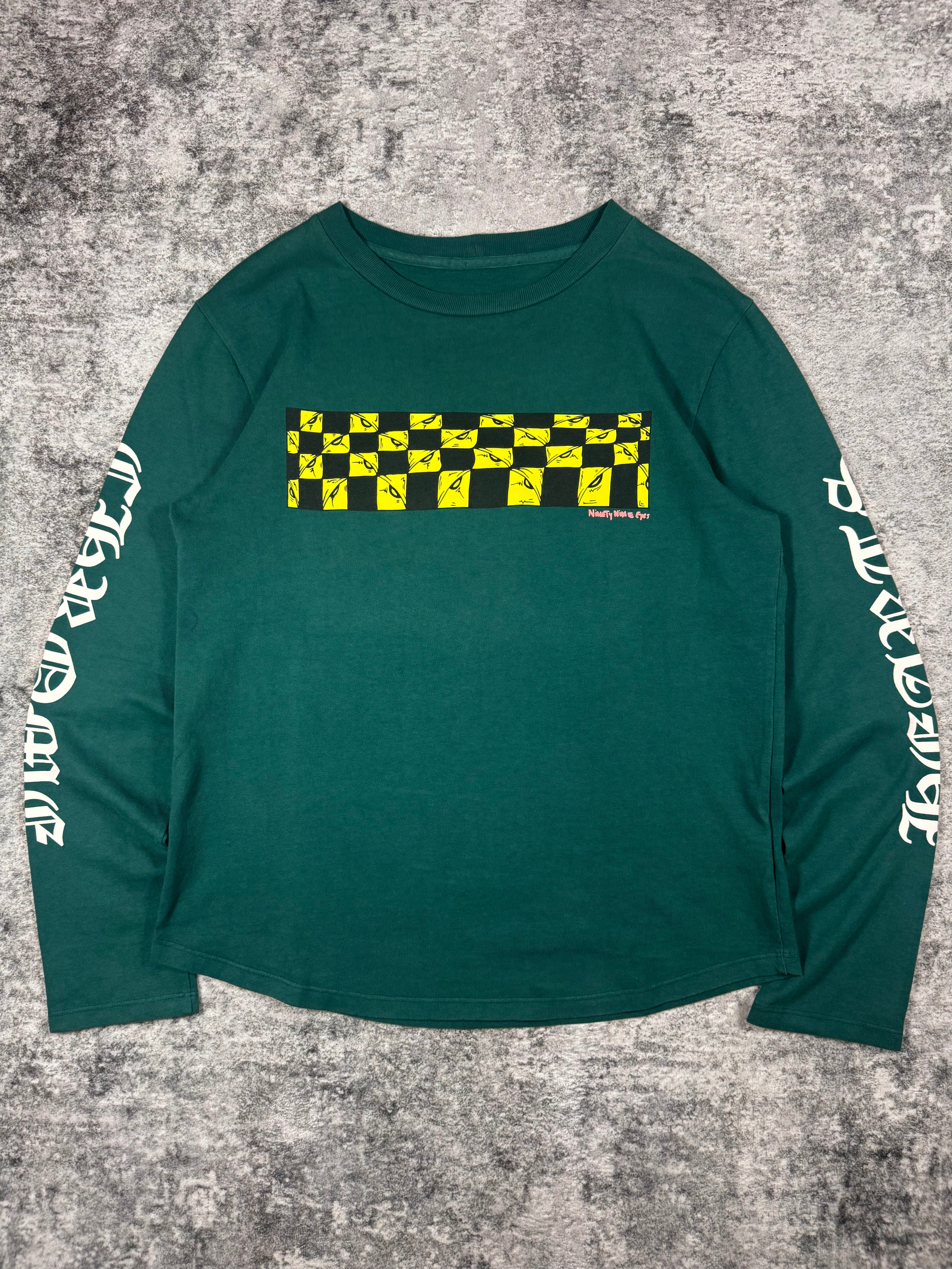 Rare Chrome Hearts Matty Boy line piece released in the Fall/Winter 2019 collection. Features bold hand-drawn graphics across a deep green cotton base, highlighted by the signature ‘Antidote’ text and surreal character artwork on the back. Gothic Chrome Hearts lettering runs down both sleeves, as well as the ‘99 Eyes’ checkered banner going across the chest. In brilliant condition with no major flaws (minor unnoticeable stain on sleeve)
