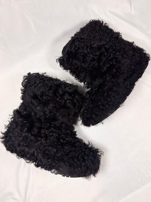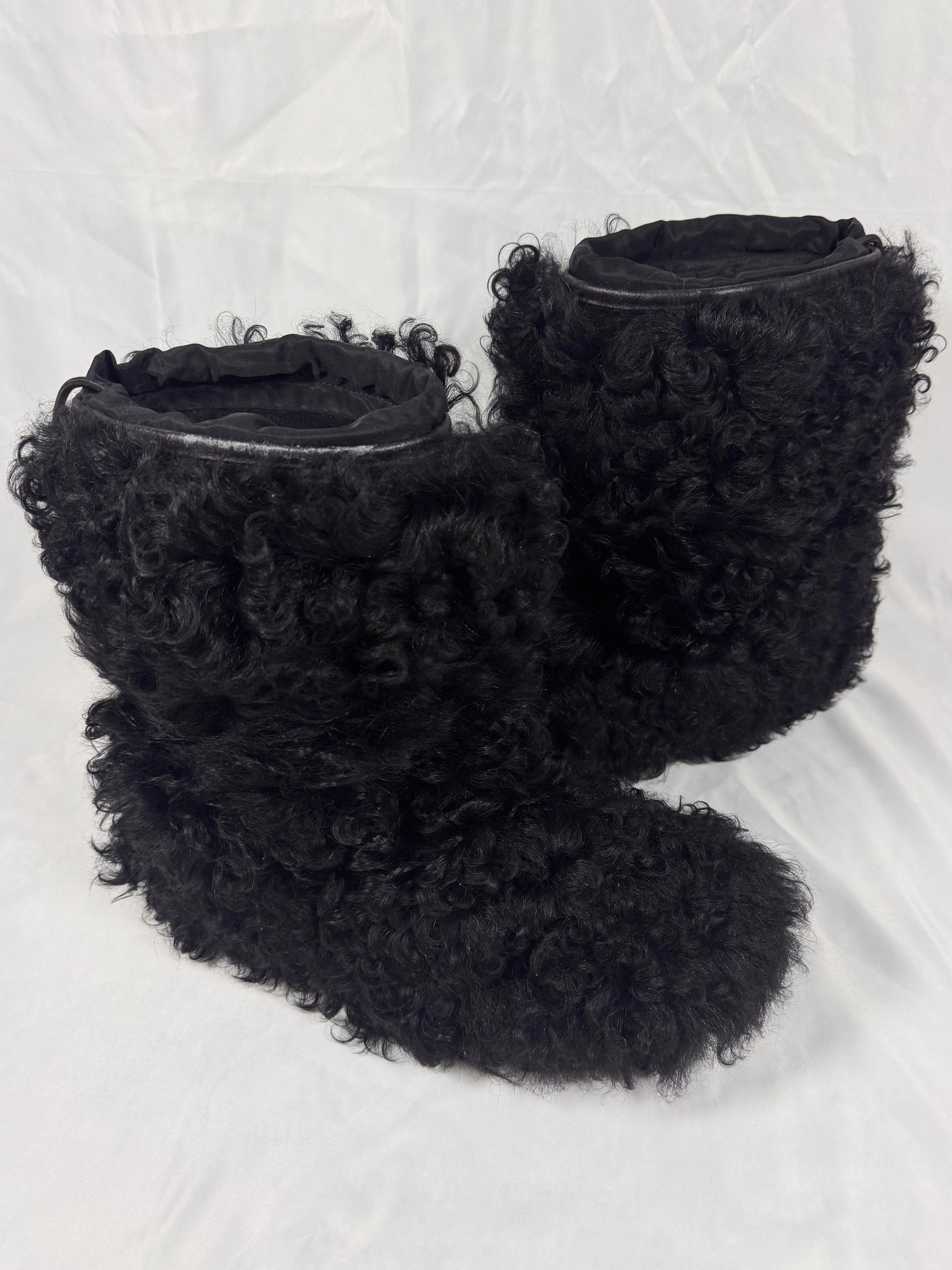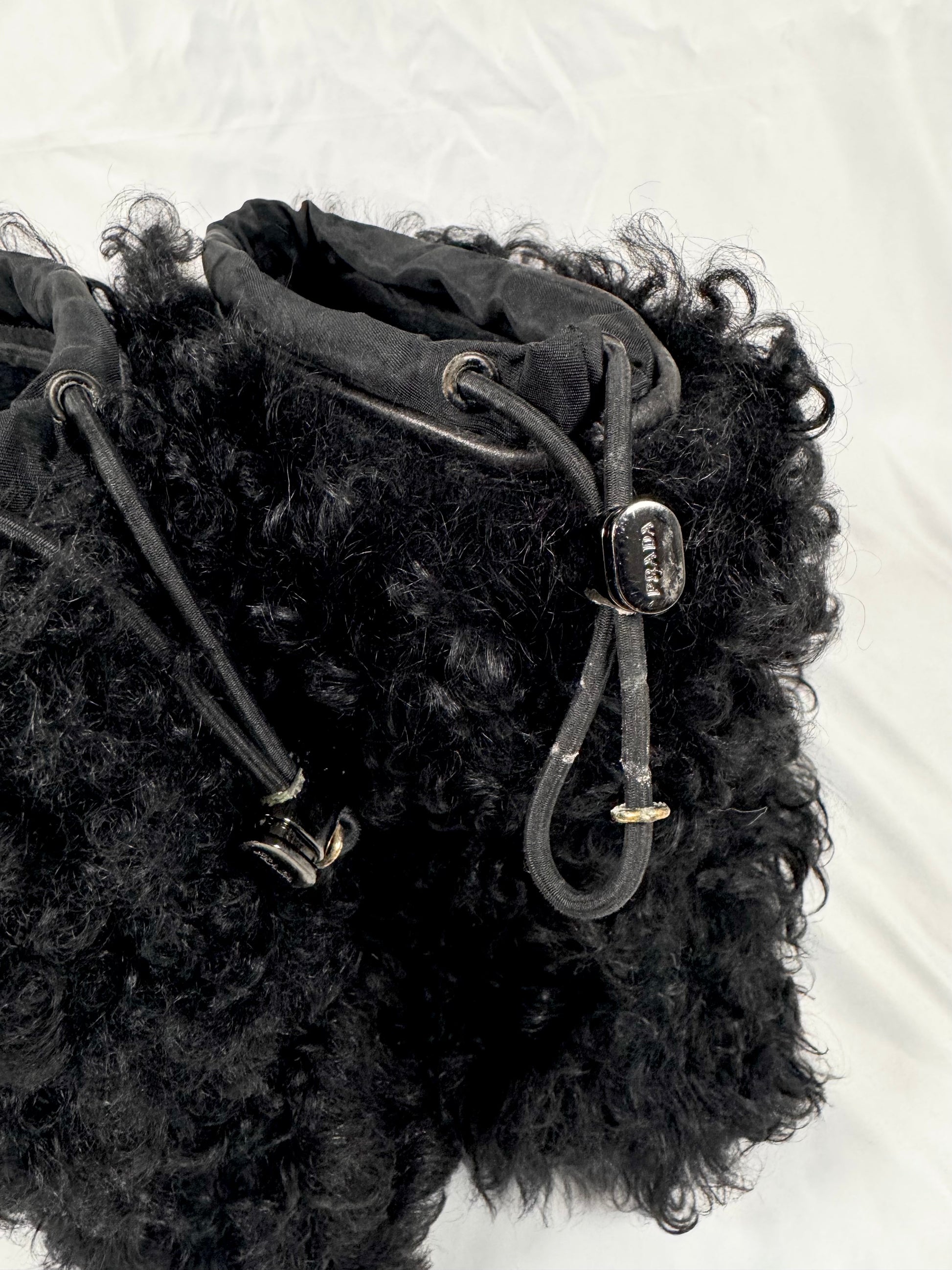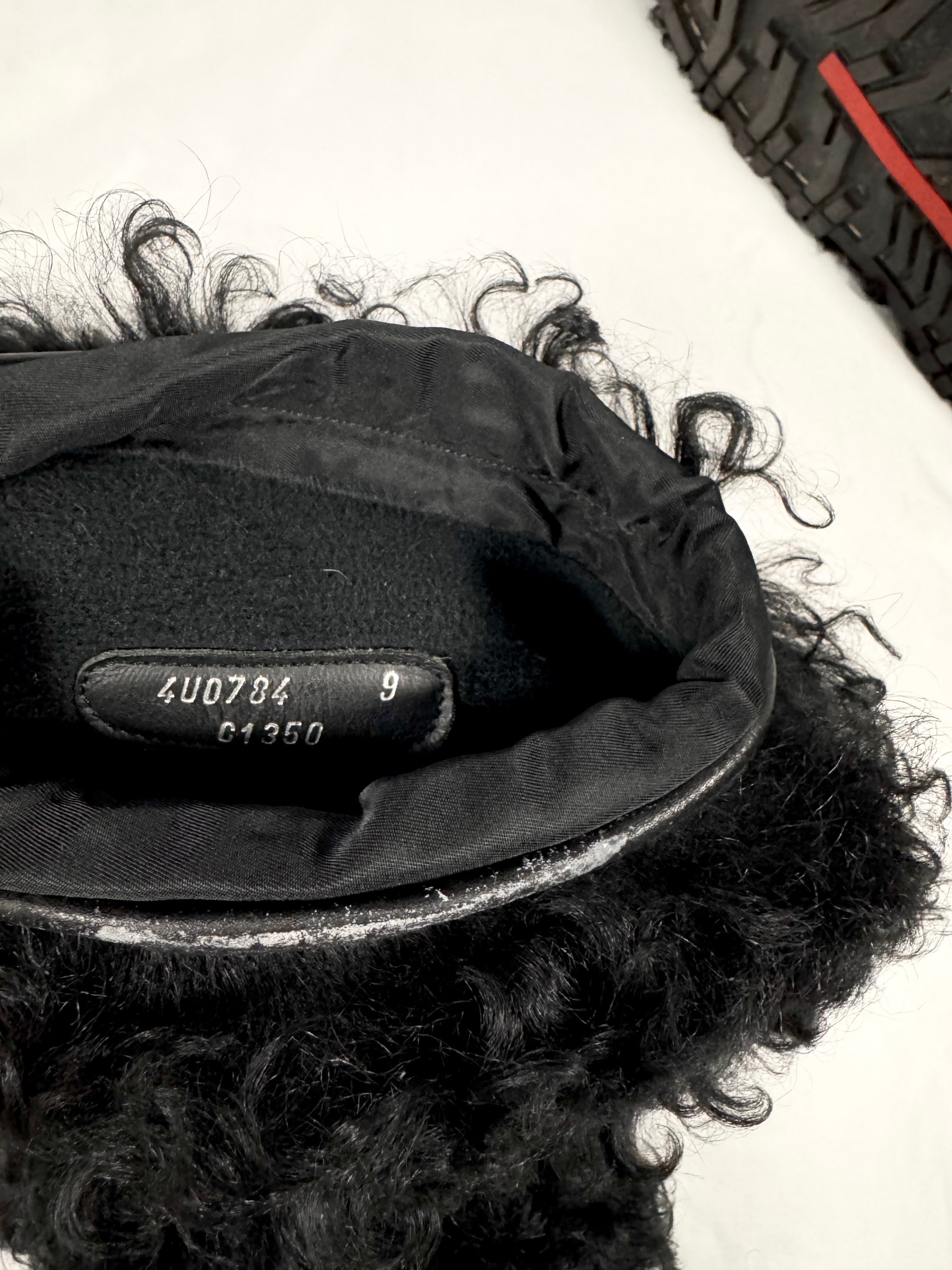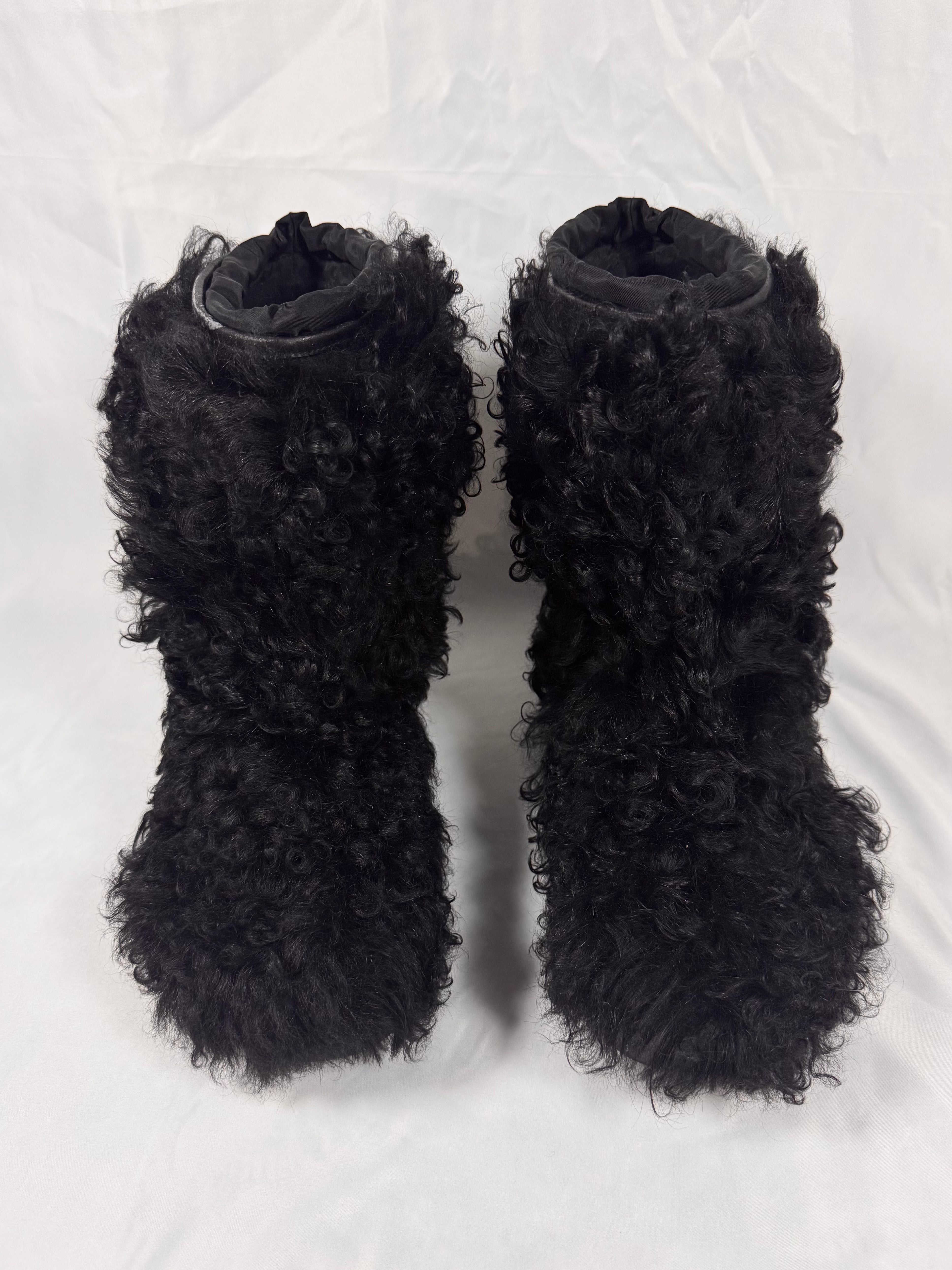 Stunning piece from the Fall/Winter 1999 collection released under the Prada Sports line. The exterior is fully constructed of black faux fur, with a rubberized sole featuring the signature red strip logo. In great condition for its age, no major flaws or damages