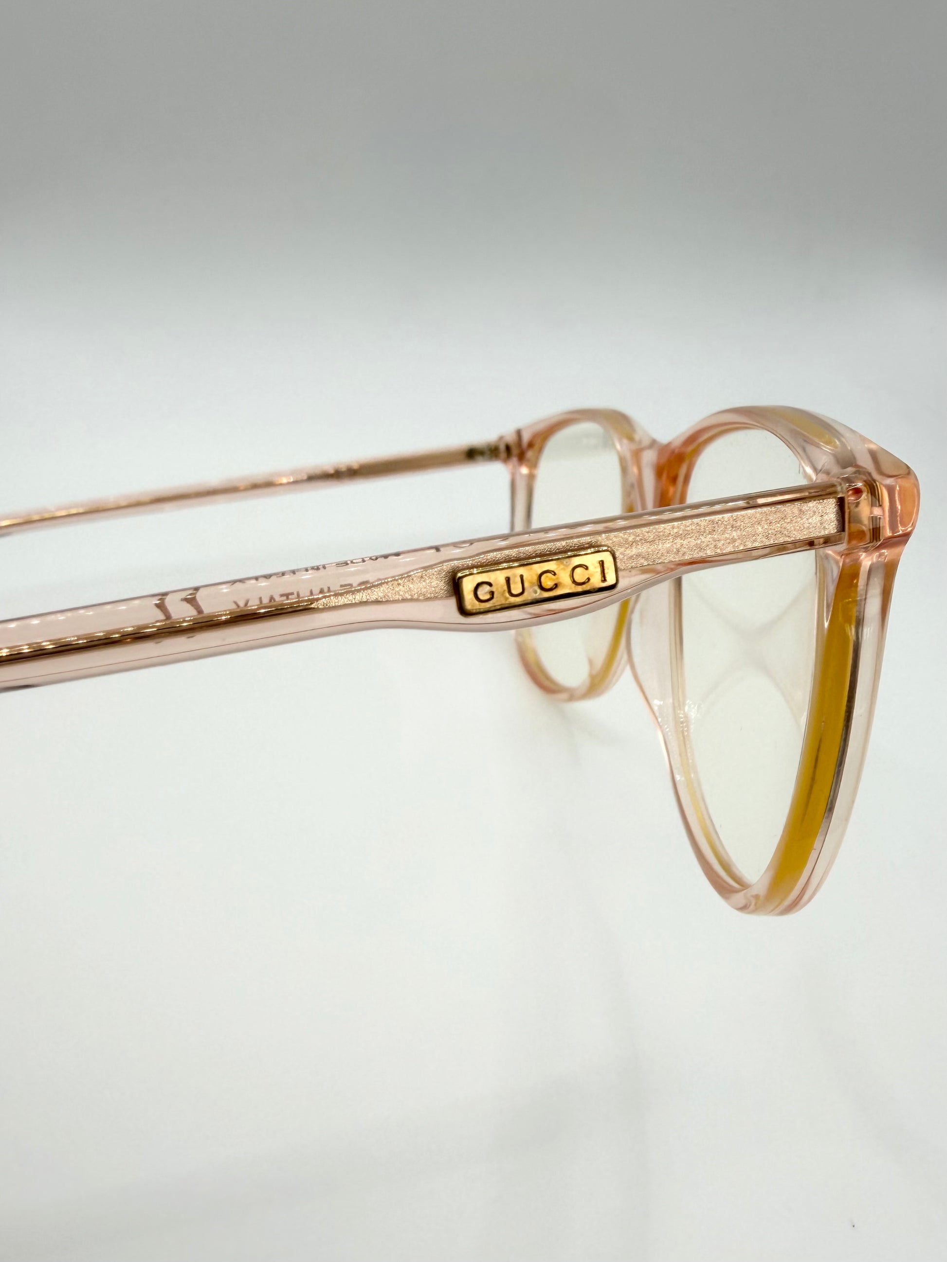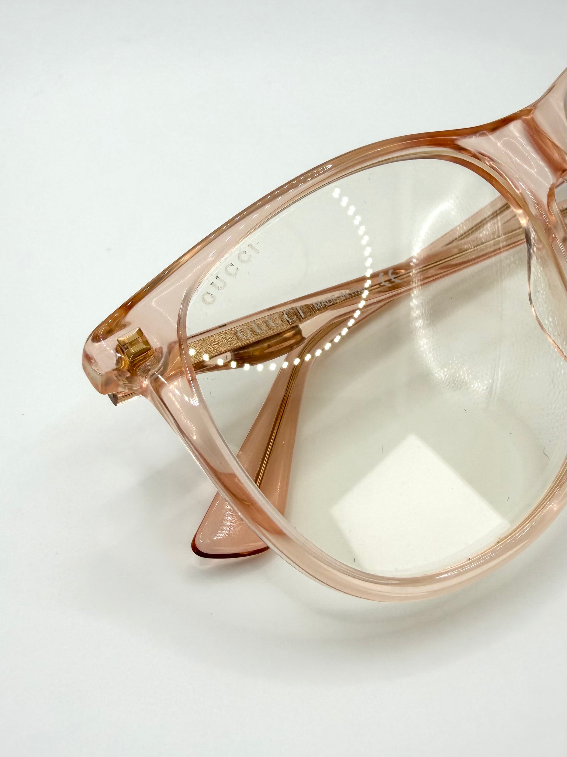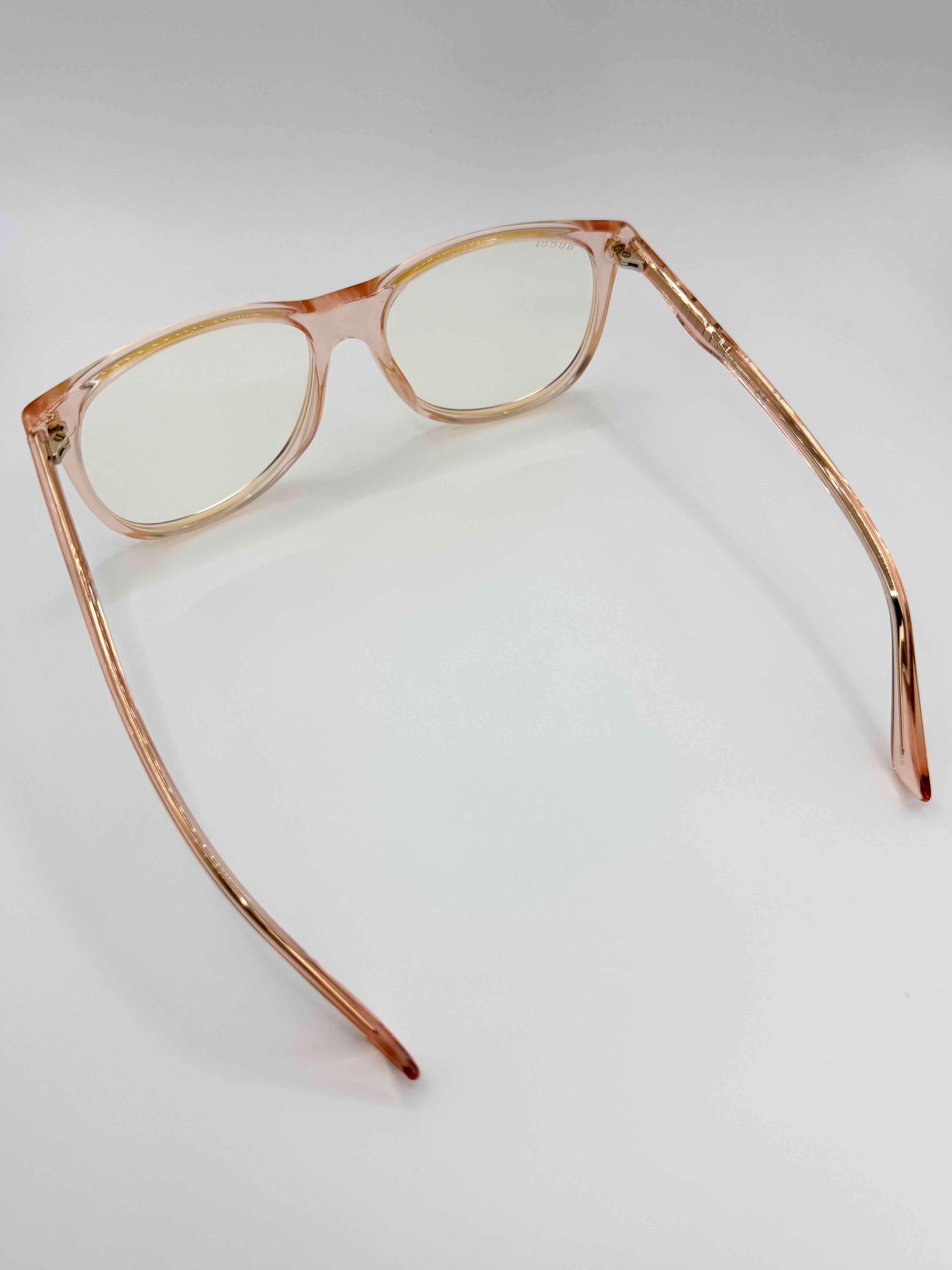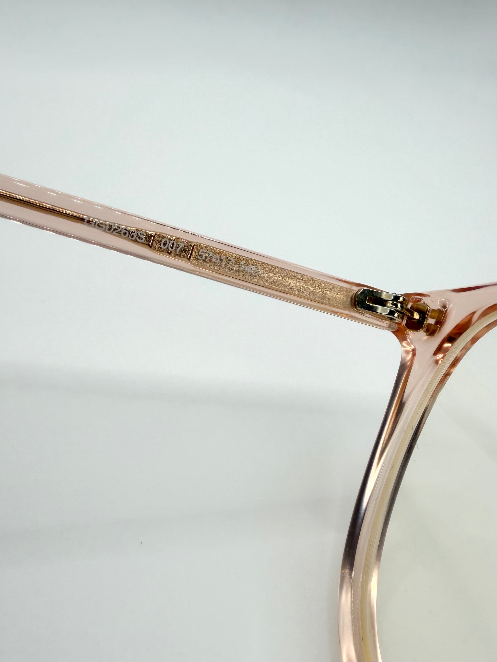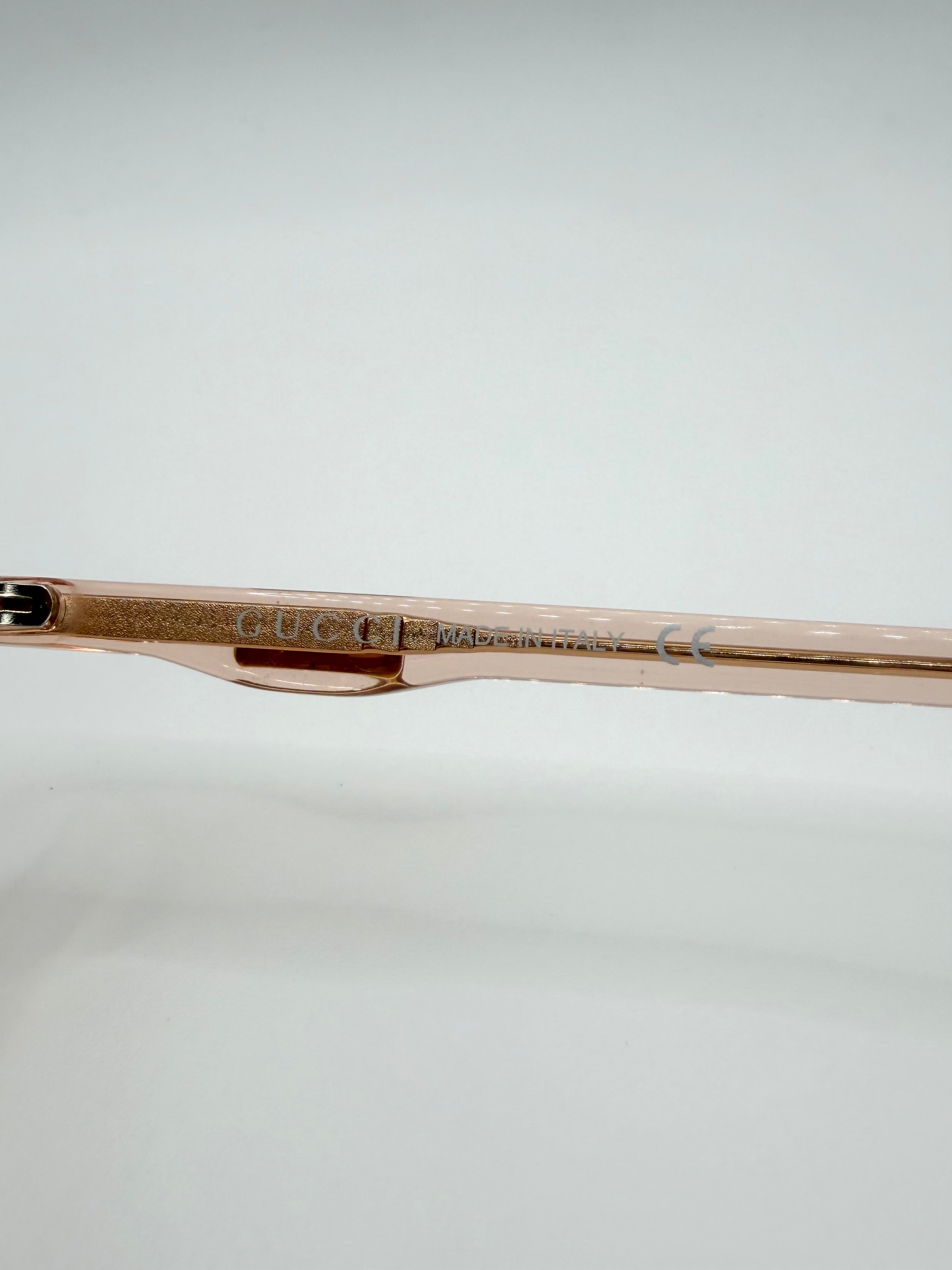A refined Gucci ‘GG0263S’ frame crafted in a soft translucent peach acetate, offering a subtle yet elevated everyday look. The transparent construction reveals a gold-tone internal temple core, adding a quiet layer of luxury detail. Slightly oversized silhouette. features gold plated branding on the right arm. Complete with full original packaging, comes in almost brand new condition with pristine look.