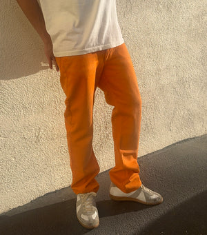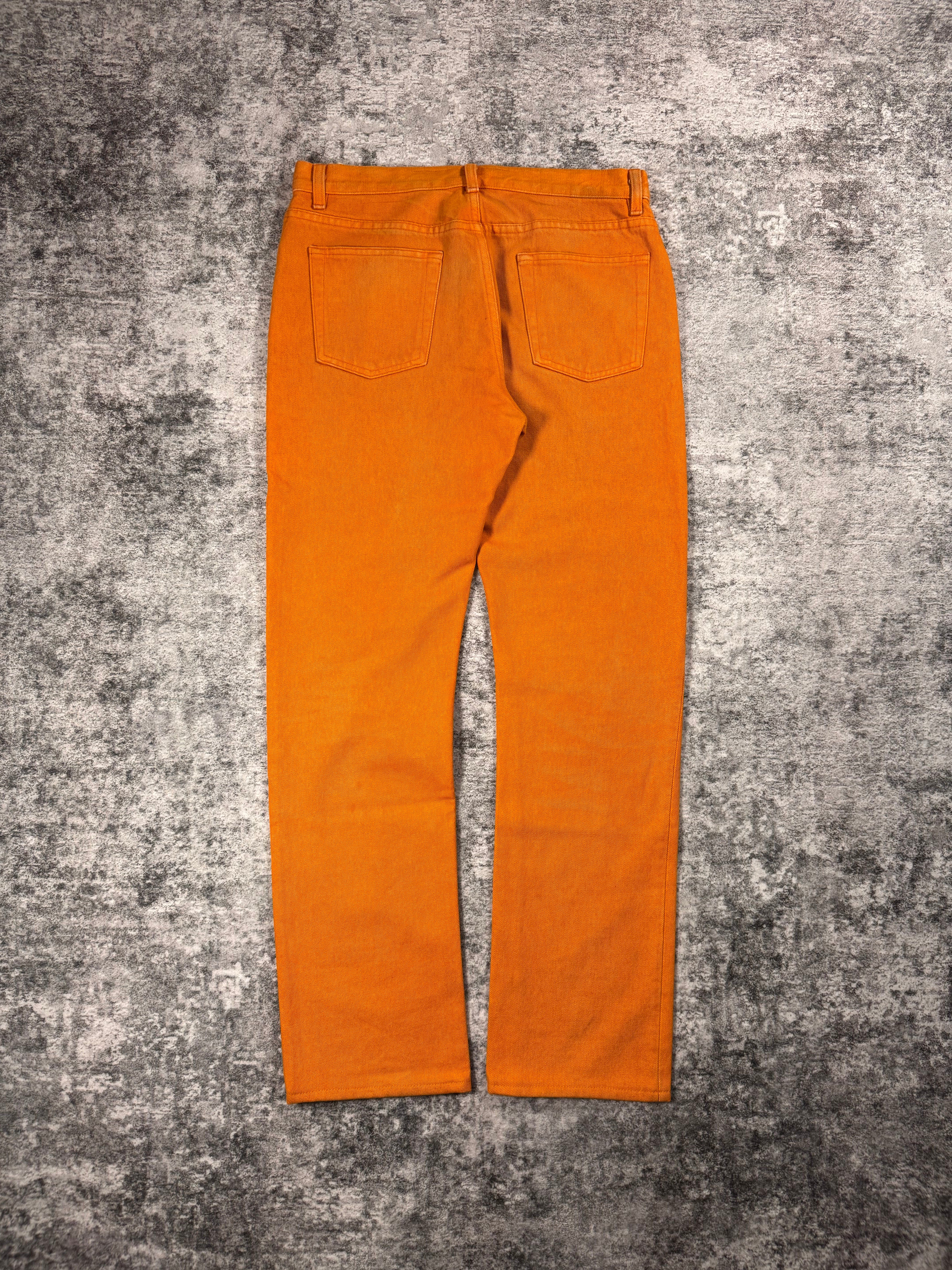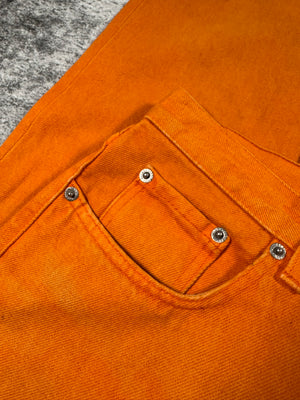 From the Spring/Summer 2000 collection, these gorgeous pair of orange Helmut Lang denim come in the ‘vintage sanded’ wash. Classic Italian cut silhouette, all hardware features branding embossed. In good condition with no flaws or damages, natural aging on denim