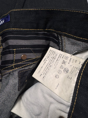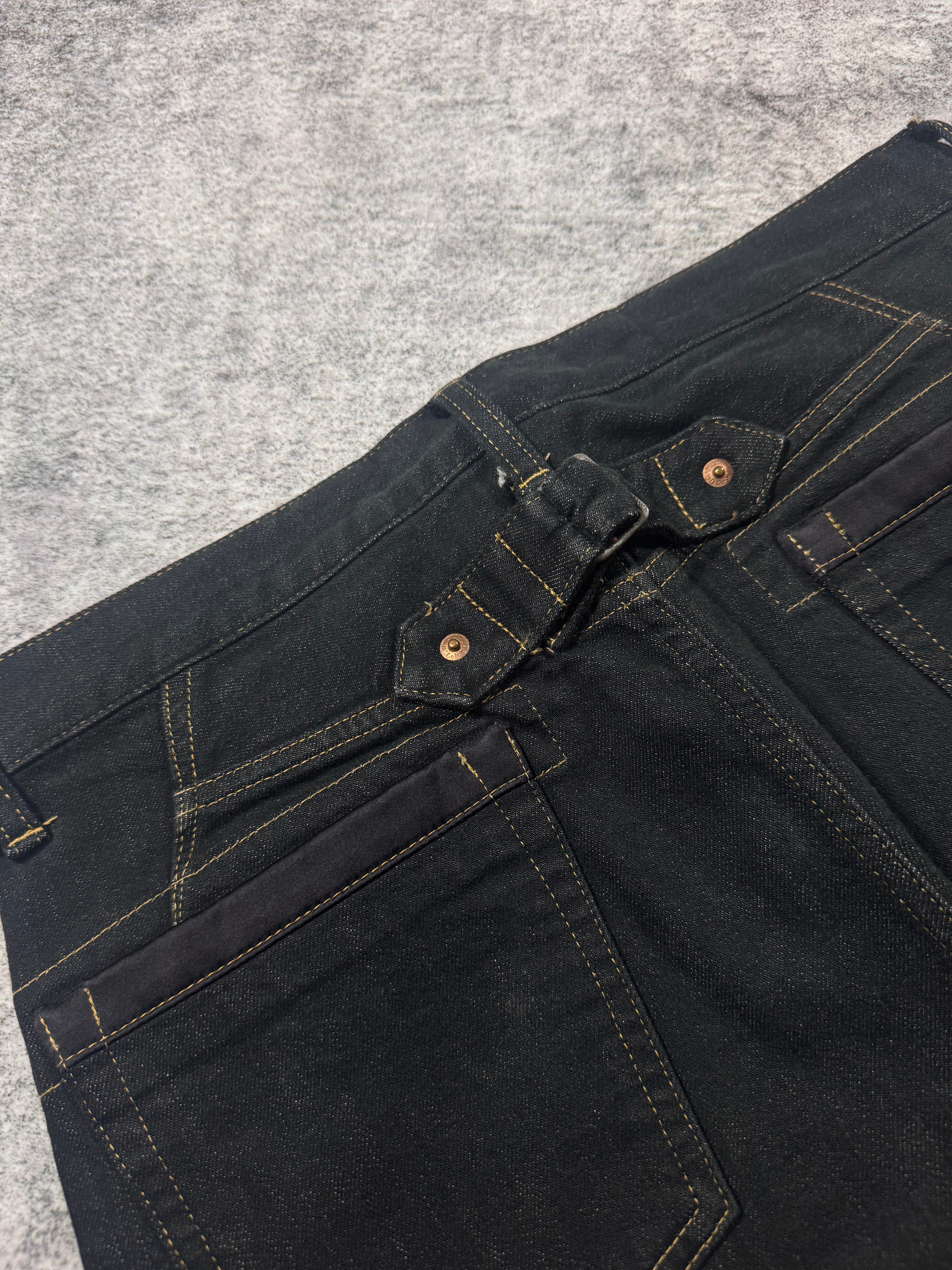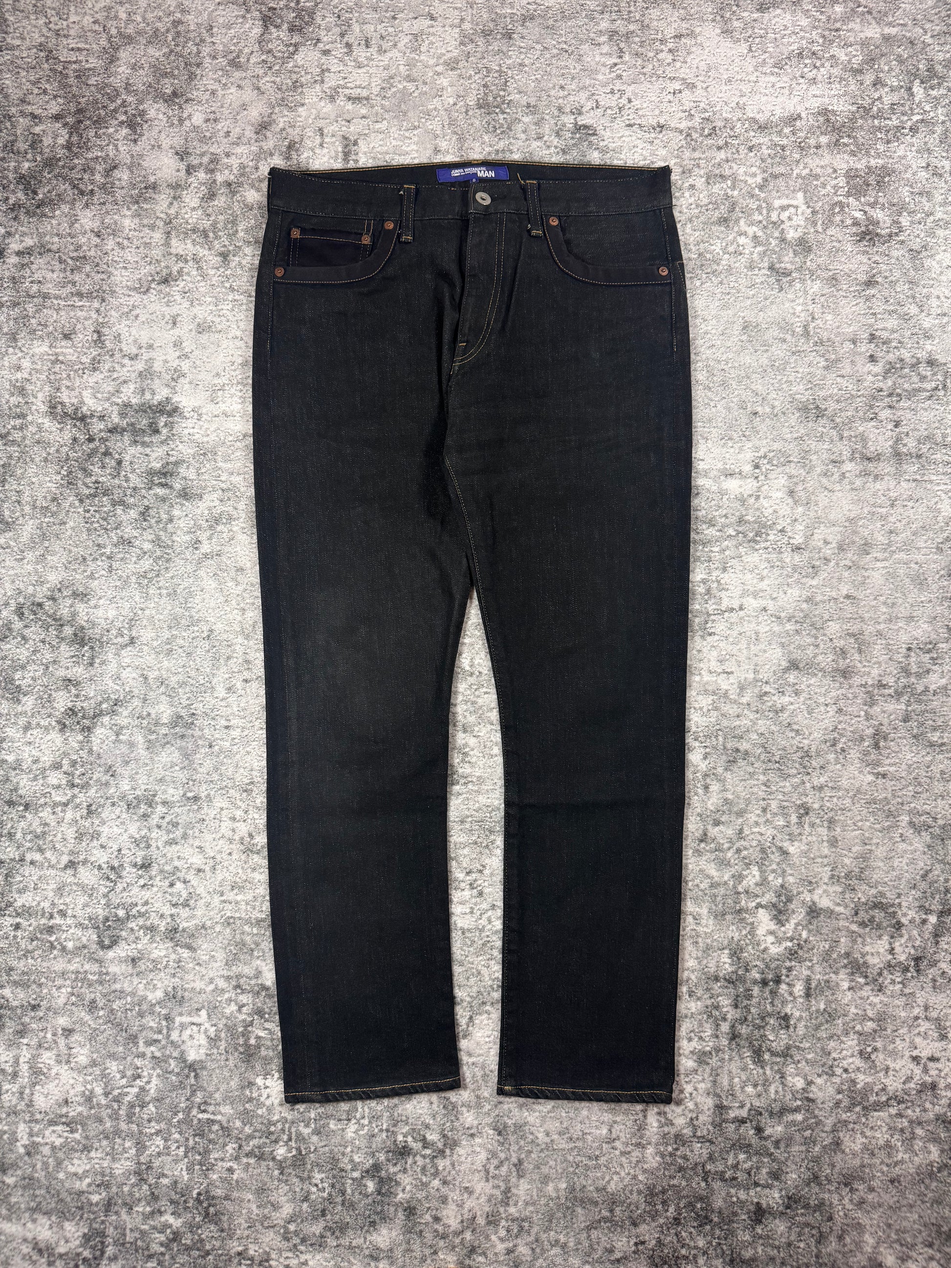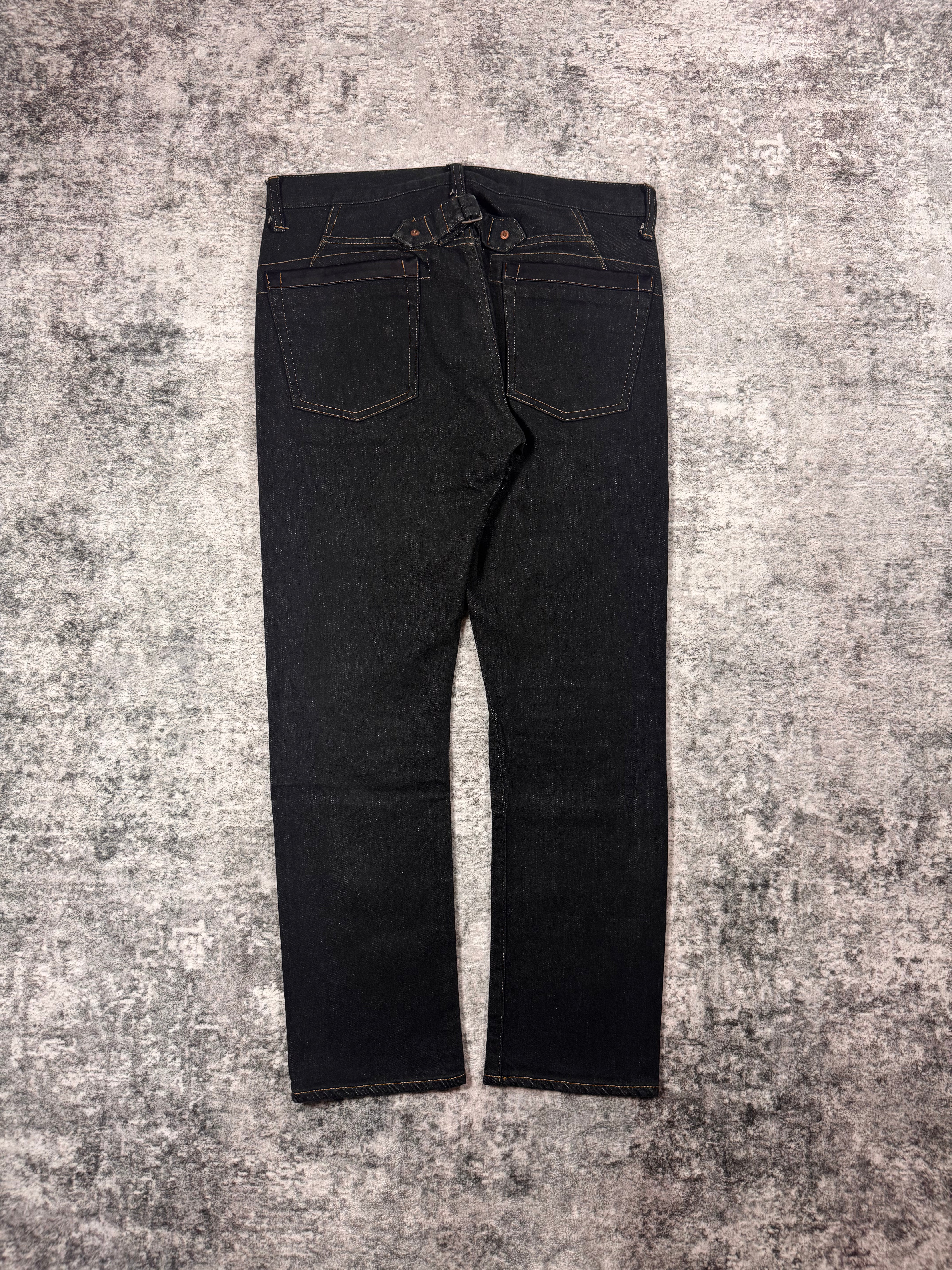 Included in the Junya Watanabe MAN line; these simplistic all-black trousers are from the Fall/Winter 2016 collection. Classic clack straight leg silhouette denim with poly trim on front and rear pockets. Cinch fastening on the rear below the waist. In good condition with no major flaws or damages