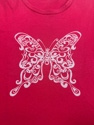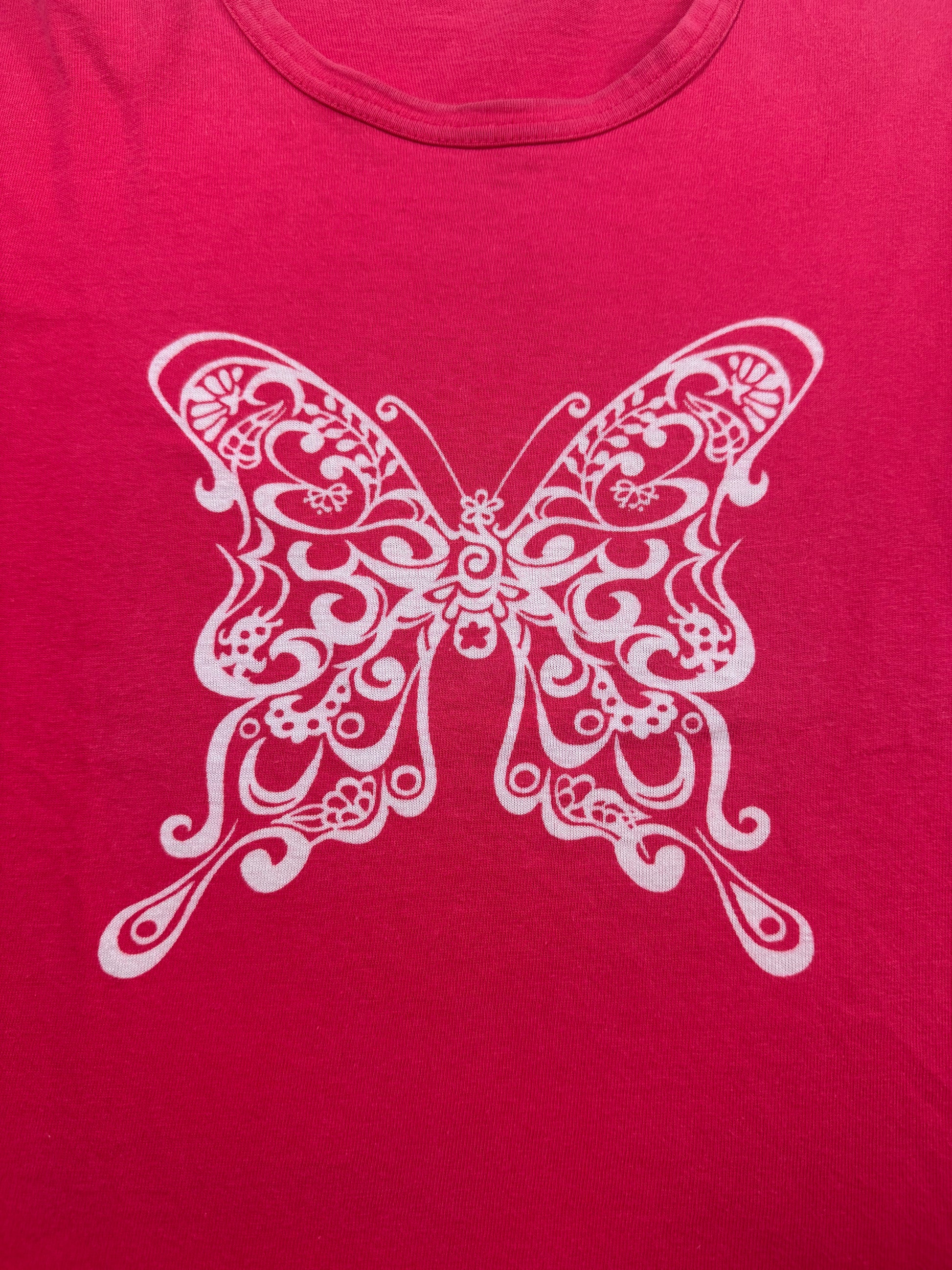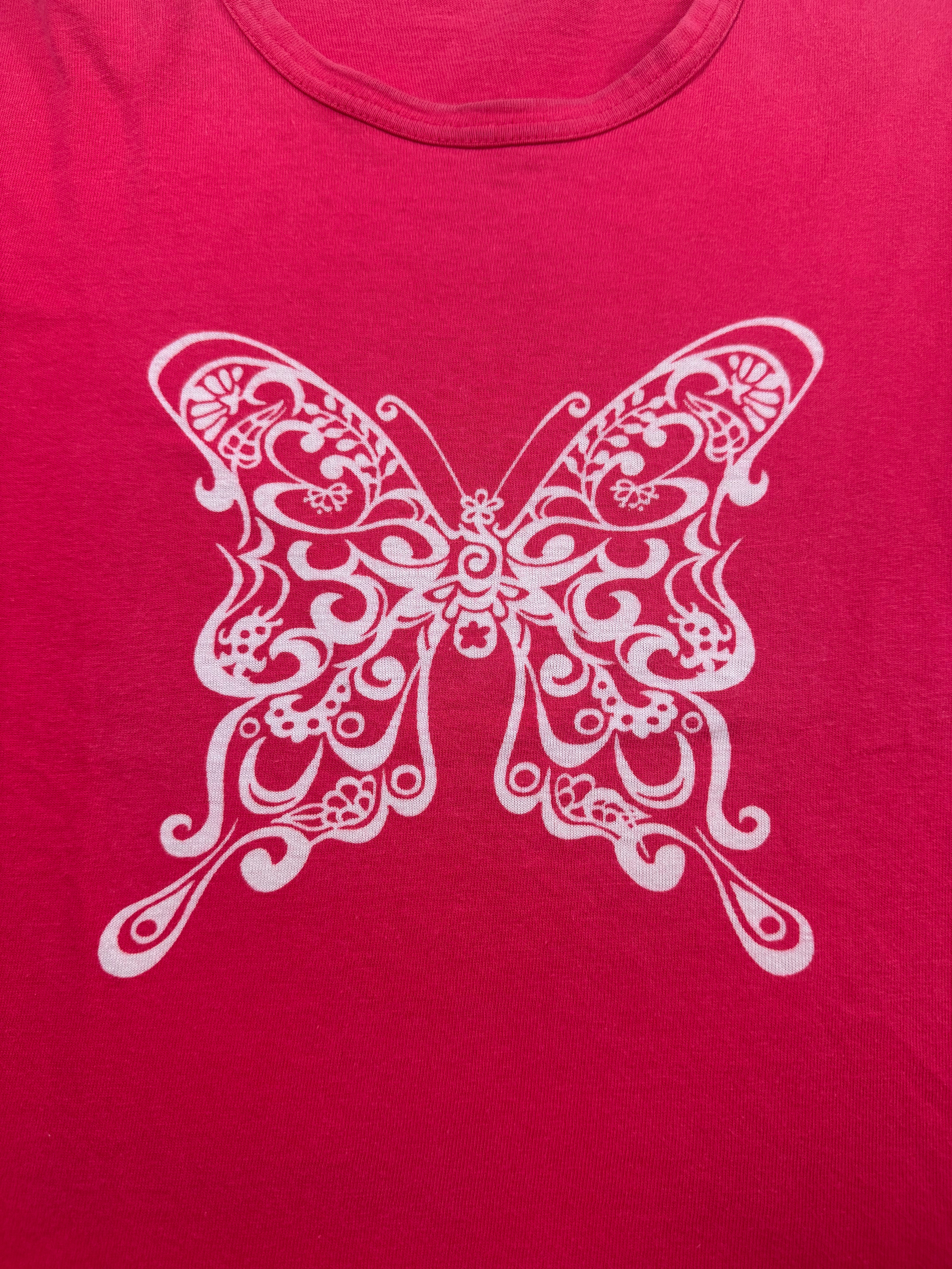 Hot pink women's mainline t shirt from the Spring/Summer 2001 collection, featuring a gorgeous butterfly logo on the front side. In good condition with no flaws or damages