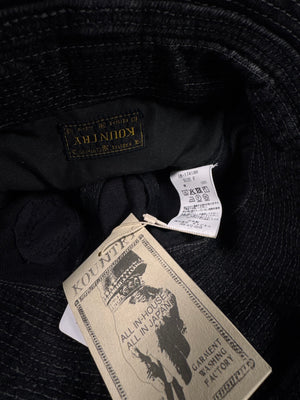 This stunning Kapital Kountry bucket hat in the striking black color way features rows of stitching that duly act as reinforcement and decoration. This color way is a new variation that was released in 2024. The stitching detail fills all sides of the brim and more than half of the crown. Buckle strap detailing on the top of the hat. Brand new condition with original tags from purchase, sourced from the Kapital Tokyo store
