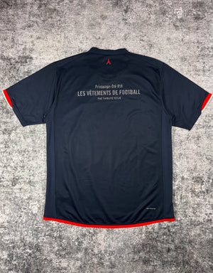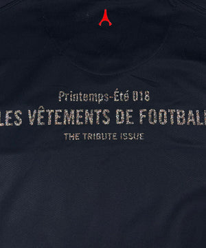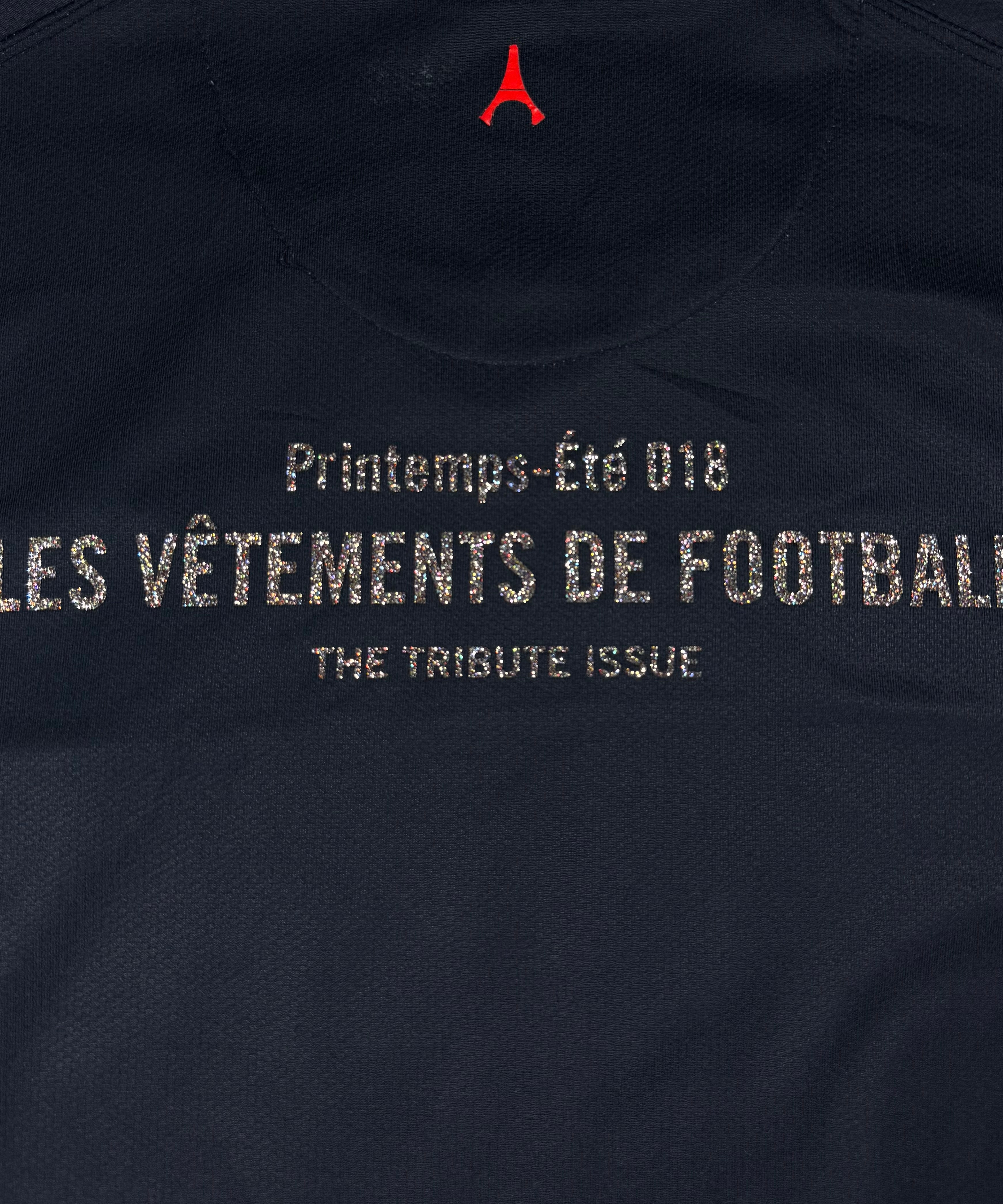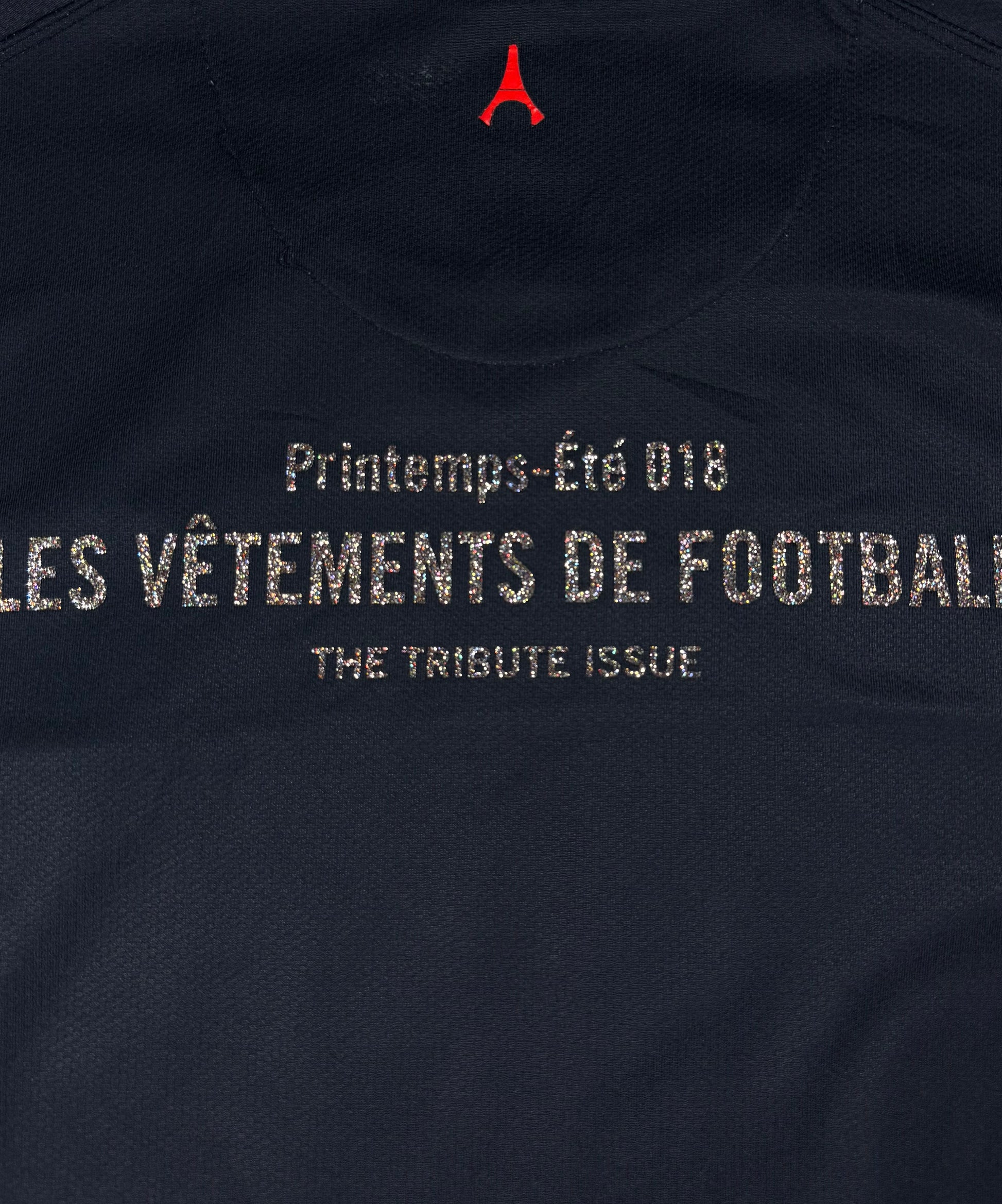 Les Vêtements de Football is a brand from Milan-based magazine NSS. Les Vêtements de Football re-interpreted the idea behind football jerseys by mixing it with iconic fashion brands, such as Balenciaga, Vetements, Jean Paul Gaultier, etc. by relating the name of the brand to a football term — in this case for the stunning Paris Saint Germain home jersey from 2006, the ‘Comme Des Football’ glitter text is featured below the sponsorship. The ‘2017-Les Vêtements de Football’ glitter print is featured on the rear of the jersey. Extremely rare jersey kept in fantastic condition