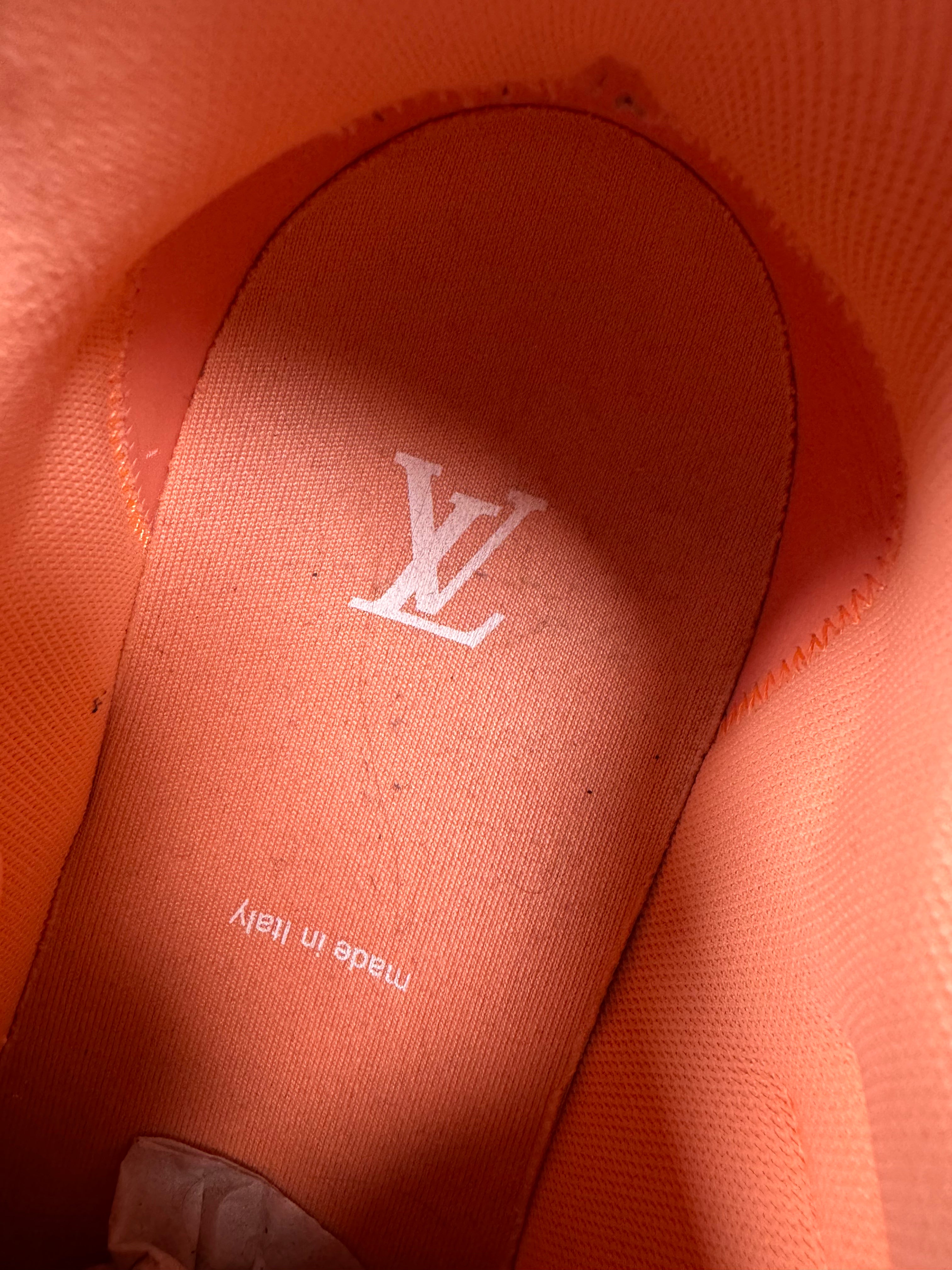 Designed by Virgil Abloh, this vibrant pair is crafted in Italy using a mix of premium materials including calf leather, mesh, and suede, and features Monogram motifs subtly embossed throughout the upper. The bold “Solar Orange” colorway brings high-energy contrast to the classic basketball-inspired silhouette. Signature LV branding throughout and a heavily cushioned sole. In basically brand new condition with no flaws or damages