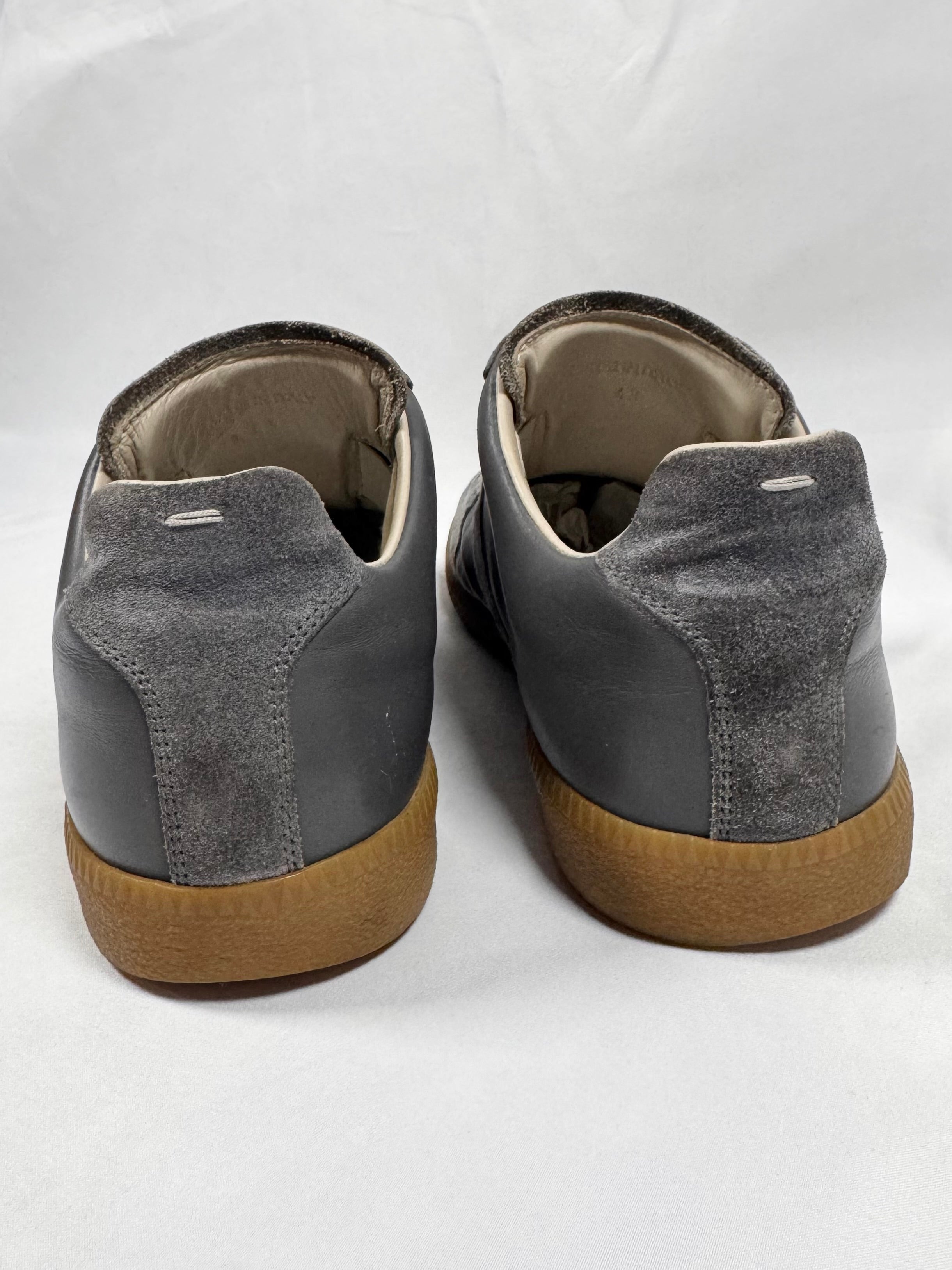 Signature pair of sneakers by Maison Margiela denoted as “replica”, as they are modeled after the German Army Trainers (GAT) and the silhouette roots extend back to the 1970s. This stunning pair of Maison Margiela GAT Replicas feature two different tones of beautiful charcoal/grey on the upper with a rubber sole. Features the iconic Maison Margiela number labeling on the tongue in suede. In amazing condition with no flaws or damages, very minor heel drag