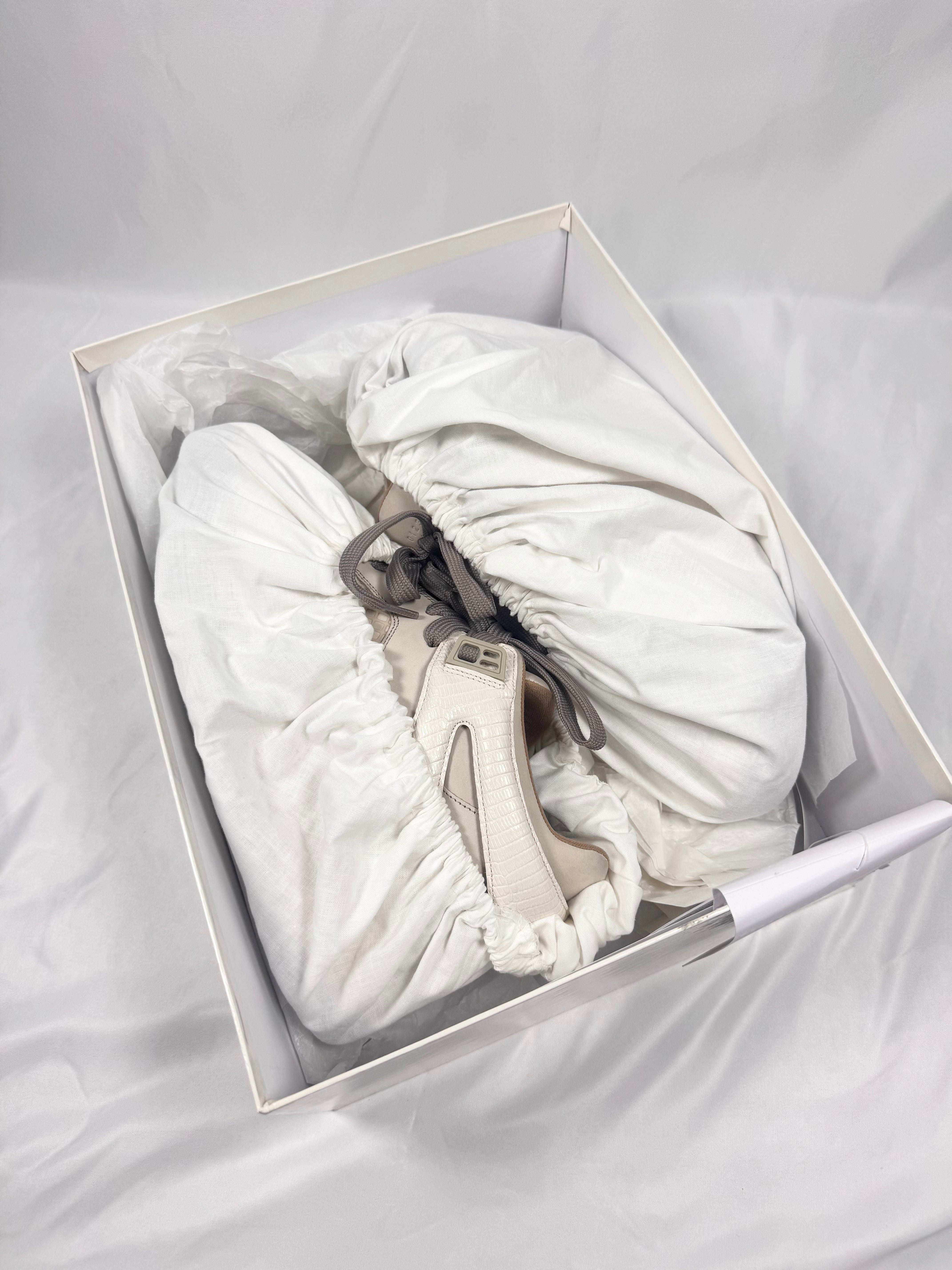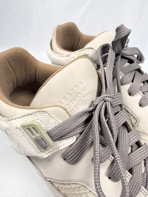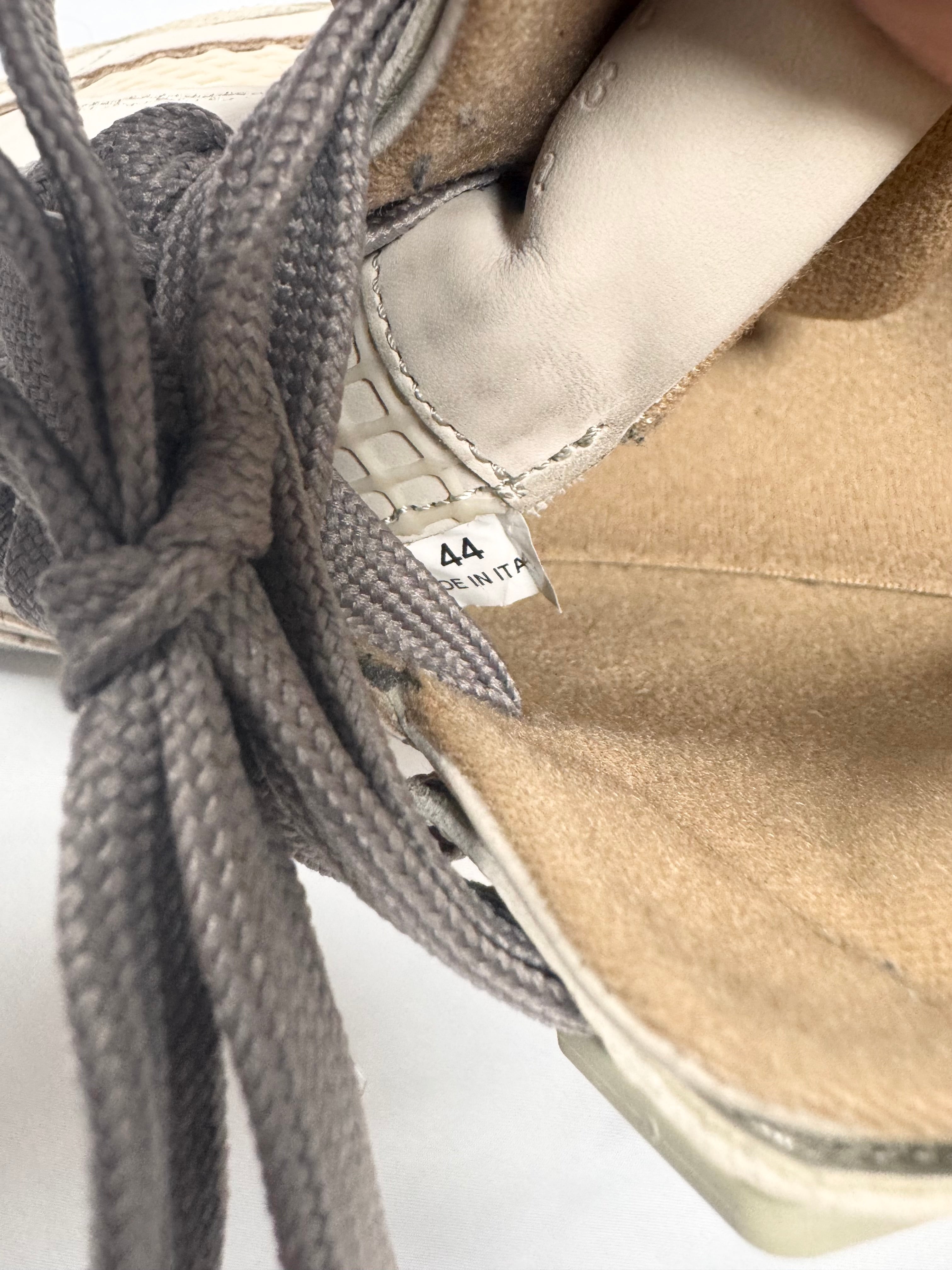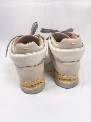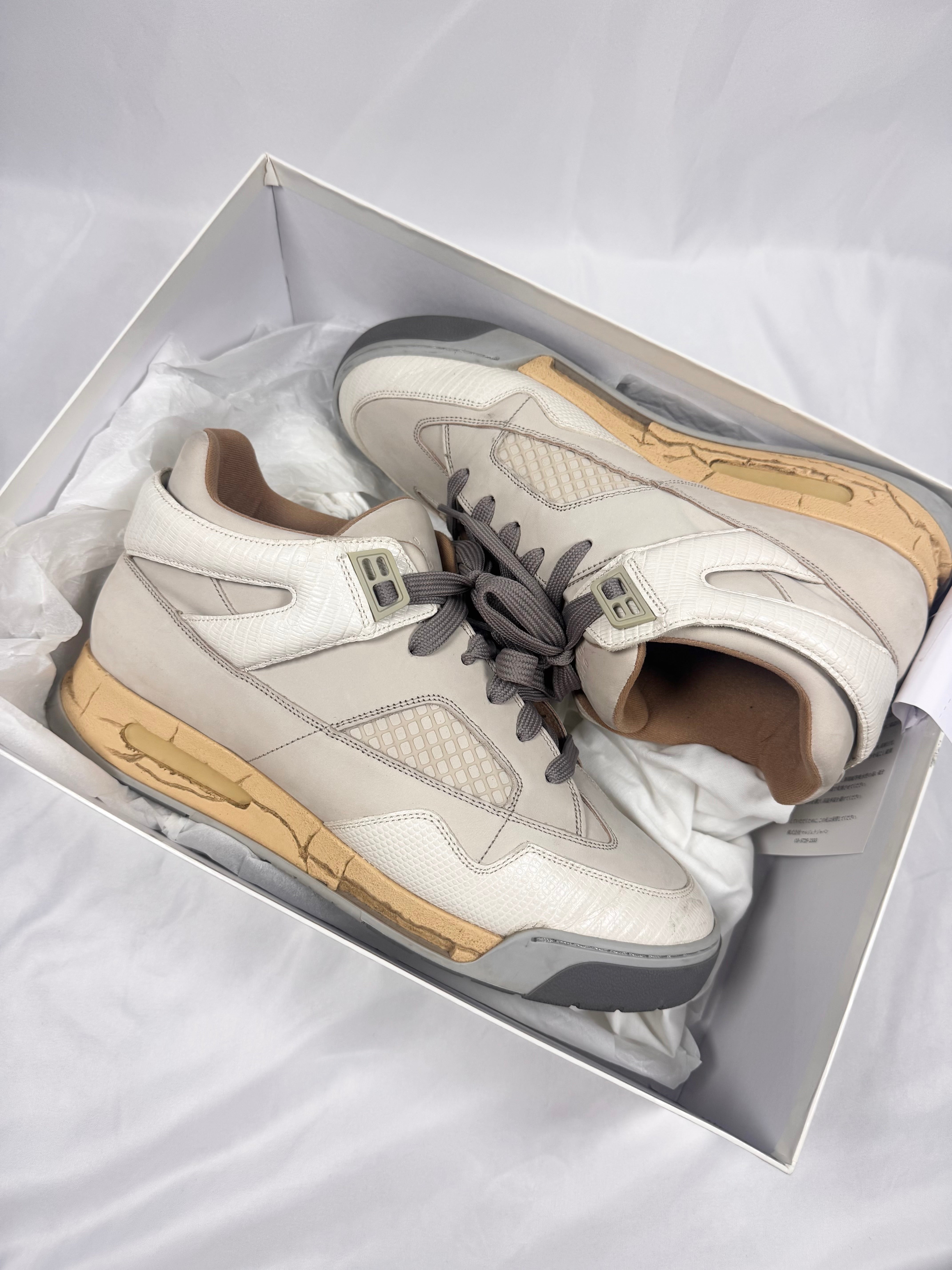 This gorgeous pair of Maison Margiela DDSTCK sneakes feature a deconstructed design inspired by vintage basketball silhouettes, blending luxury with a distressed aesthetic. Crafted from premium suede, coming in beige. The signature aged and cracked midsole enhances their worn-in appeal. Mesh and textured leather details add depth and contrast. In very good condition with no major flaws; comes with original box from purchase with dust bags