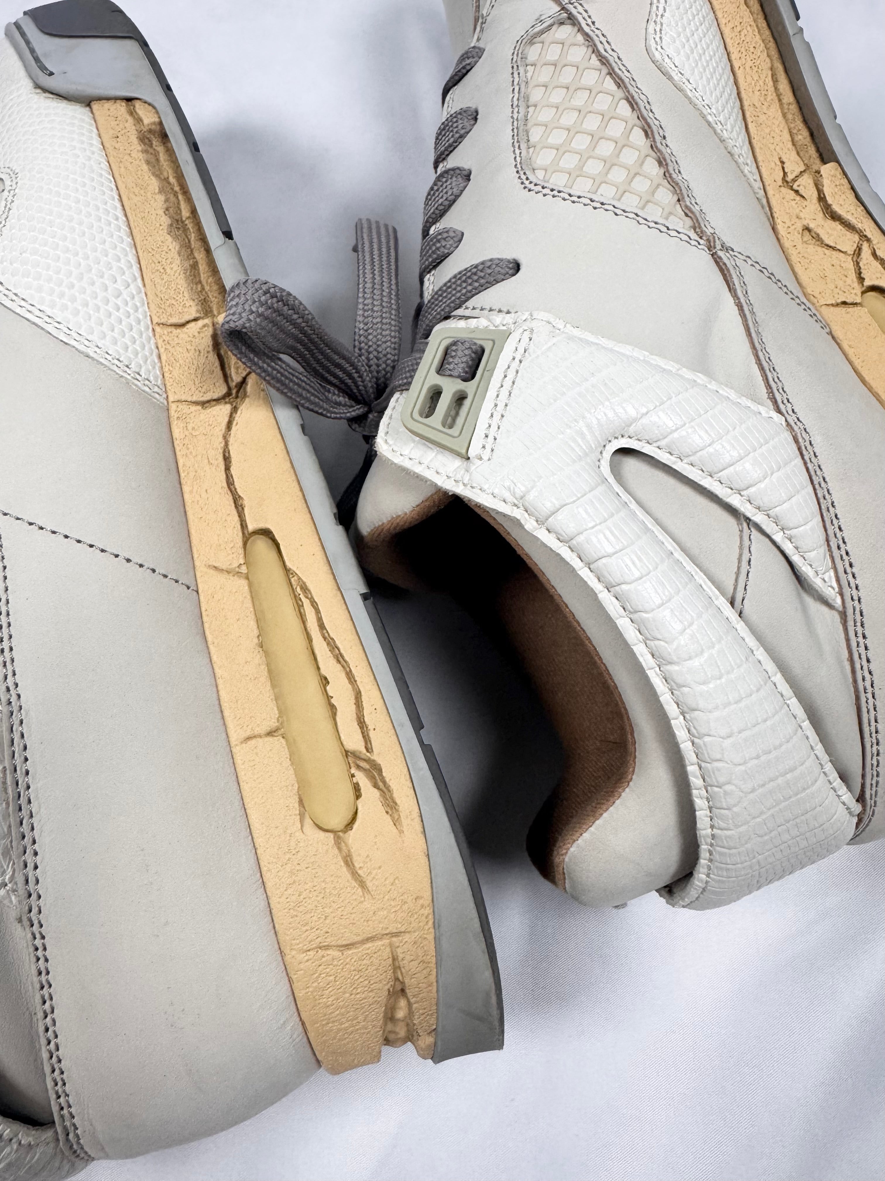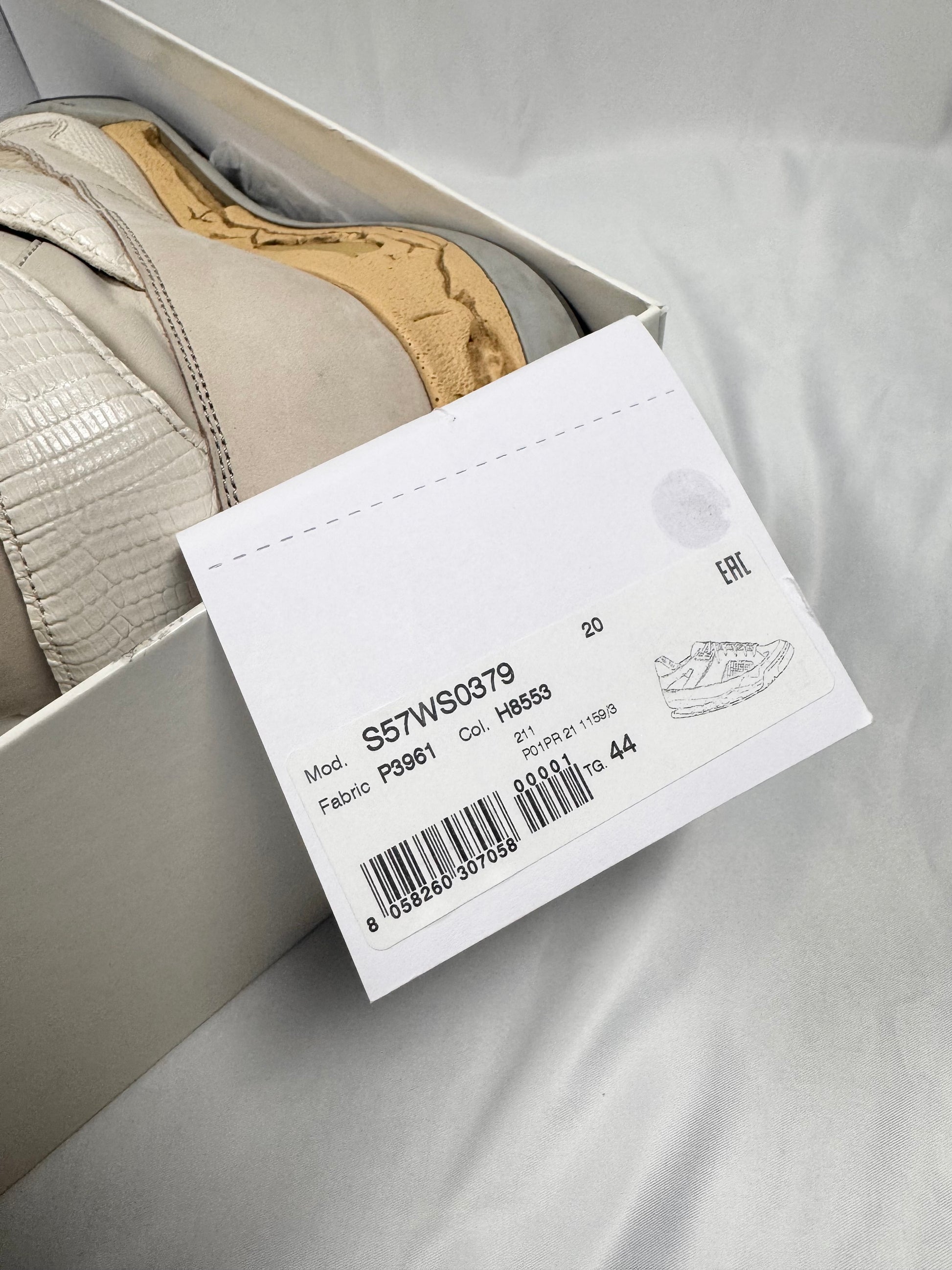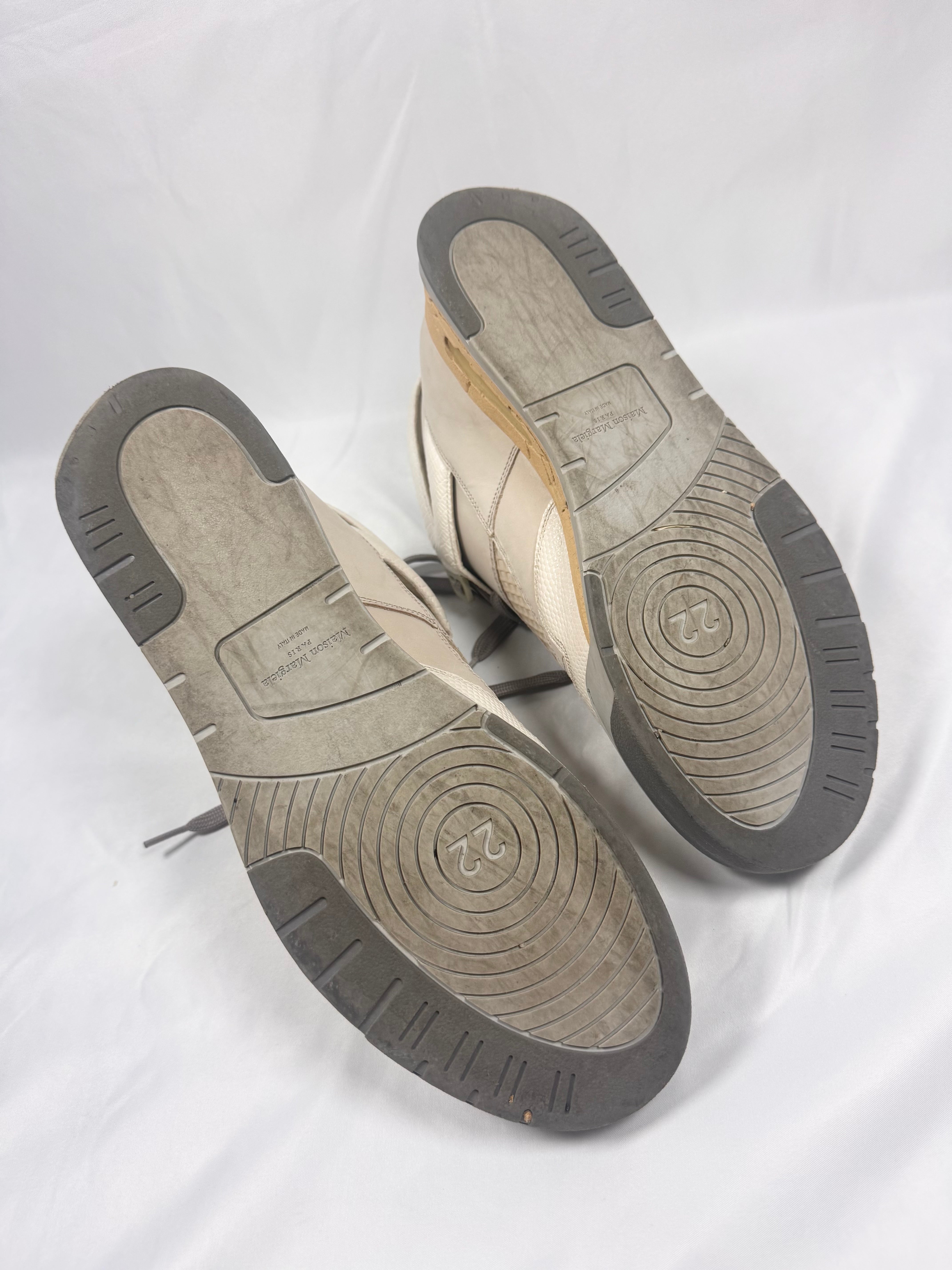 This gorgeous pair of Maison Margiela DDSTCK sneakes feature a deconstructed design inspired by vintage basketball silhouettes, blending luxury with a distressed aesthetic. Crafted from premium suede, coming in beige. The signature aged and cracked midsole enhances their worn-in appeal. Mesh and textured leather details add depth and contrast. In very good condition with no major flaws; comes with original box from purchase with dust bags